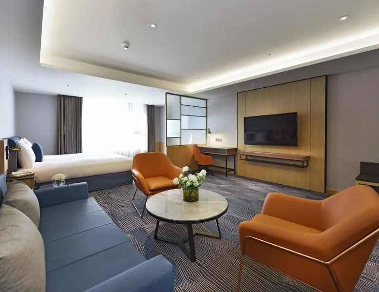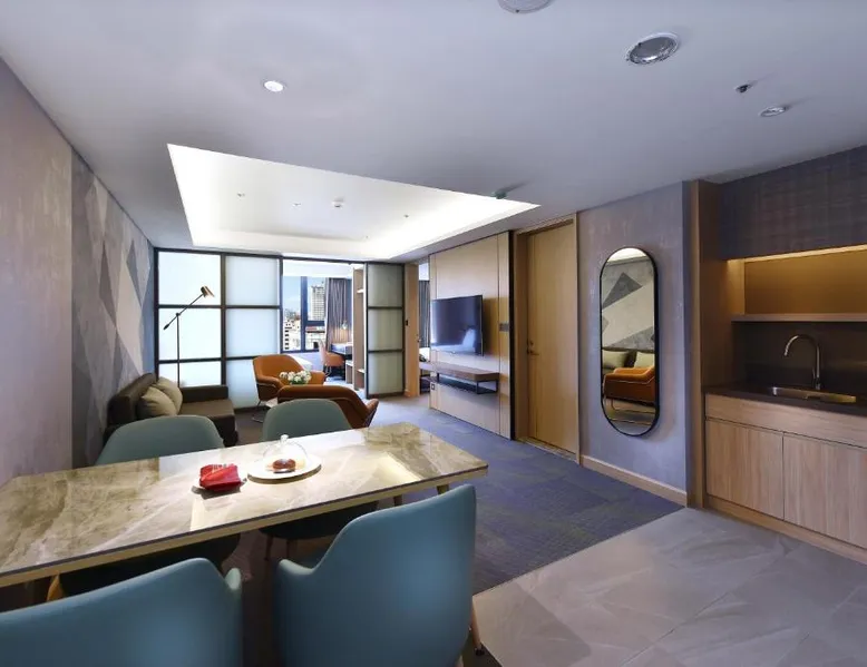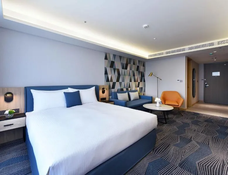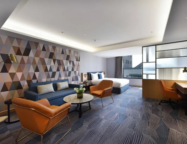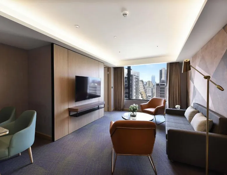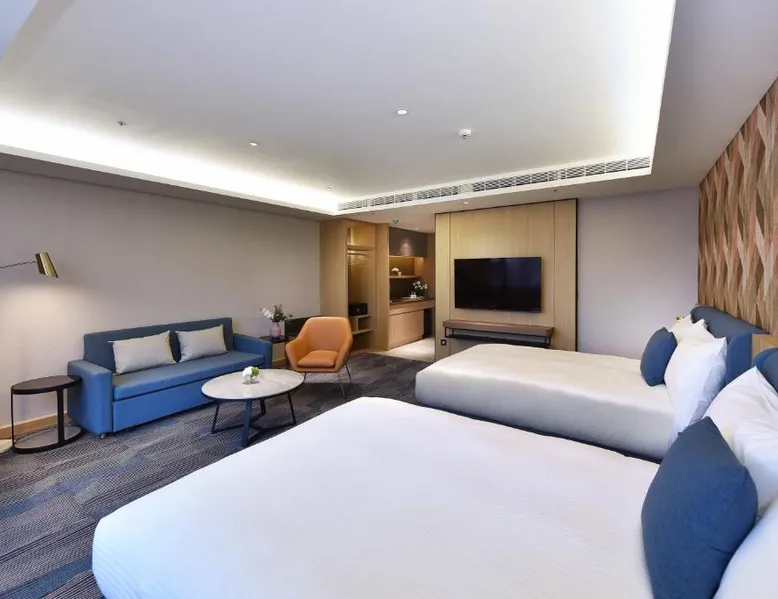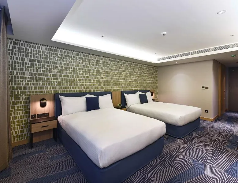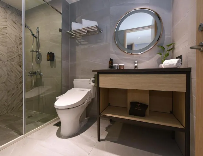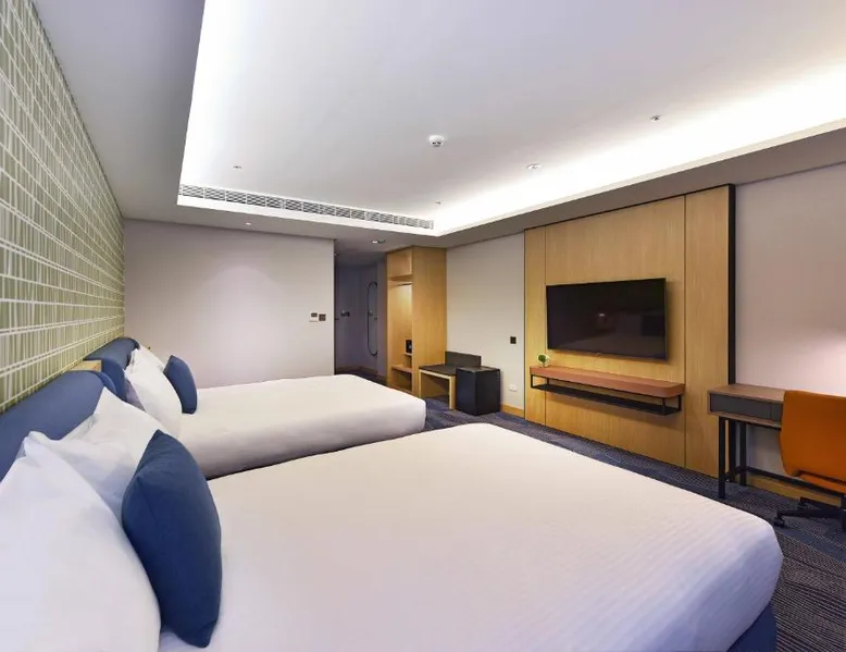Comfortable Accommodations: Fullon Poshtel - Kaohsiung in Kaohsiung offers spacious rooms with air-conditioning, private bathrooms, and modern amenities. Guests appreciate the room size and comfort. Dining Experience: The modern restaurant serves a buffet breakfast with vegetarian, vegan, halal, and Asian options. Additional dining options include a lounge and room service. Facilities and Services: The hotel features a fitness center, free WiFi, lounge, and concierge service. Free on-site private parking is available, along with a tour desk and luggage storage. Prime Location: Located 4.3 mi from Kaohsiung International Airport, the hotel is near attractions such as Formosa Boulevard Station (less than 0.6 mi) and Kaohsiung Museum of History (11-minute walk). Hiking trails are in the surroundings. The quadruple room features a wardrobe, a safe deposit box, as well as a private bathroom boasting a shower and a hairdryer. The spacious quadruple room offers air conditioning, soundproof walls, a mini-bar, a seating area, as well as a flat-screen TV with streaming services. The unit has 2 beds.