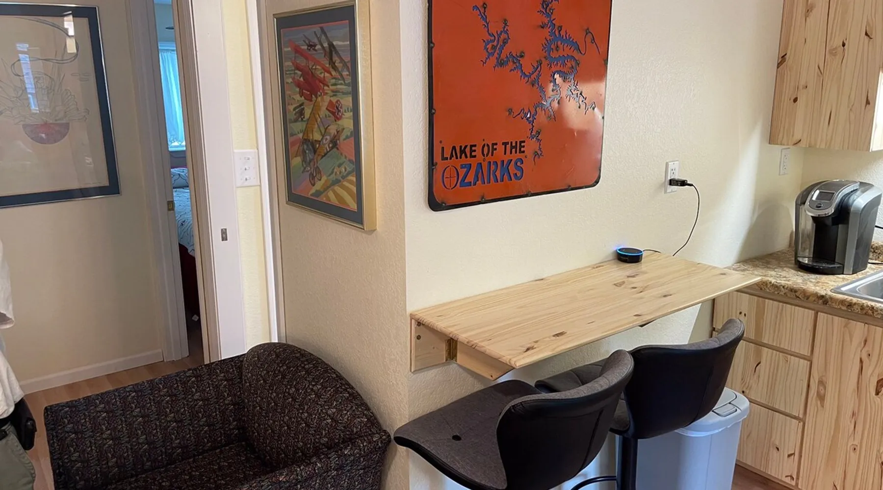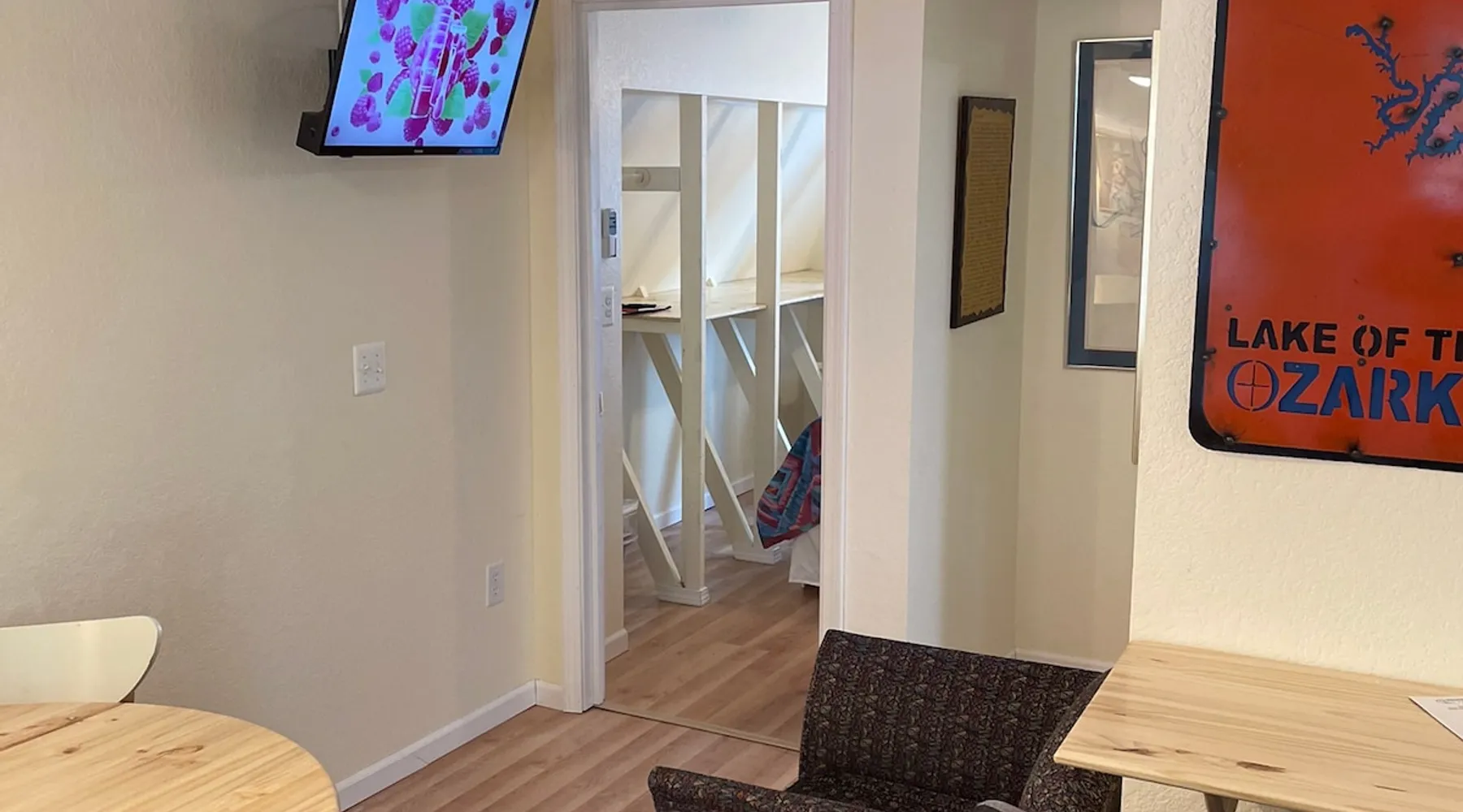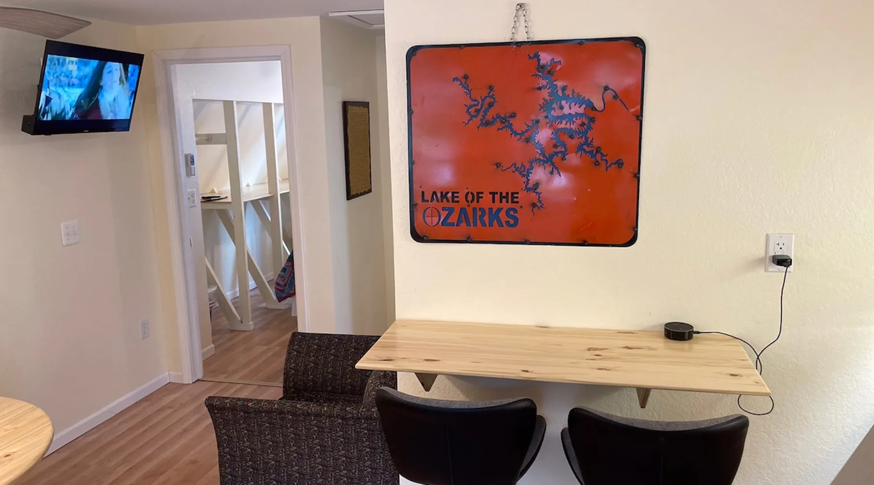 Private loft above the garage. Loft has everything guests need for nice getaway vacation . Everything is new and the owner craftsmanship shows. Pet friendly, Very nice 2 queen bedrooms, cute vacationloft. Full bathroom, kitchenette with sink refrigerator, dishes, cooking utilities, pans, and gas grill. Nice kitchen table, wifi smart Tv, sofa, and chair. Each bedroom has a nice view of the Lake. Guests have a firepit, dock area on the side of the dock for your boat . Pet fee is not included. The space Guests are welcome to explore the property, go for hikes in the area, the dock has a table and chairs for you to relax with a book or fish off the dock. Guests have a firepit, dock area on the side of the dock for your boat. Gentle yard down to the dock. Keyless entry, fast wifi, 23 steps to the loft. The owners live in front homes due on site if you have questions. Otherwise, they respect your privacy. Guest access Does not have a washer or dryer. In town is a laundromat. Other things to note Pet fee is $100 during your stay. Per pet.
