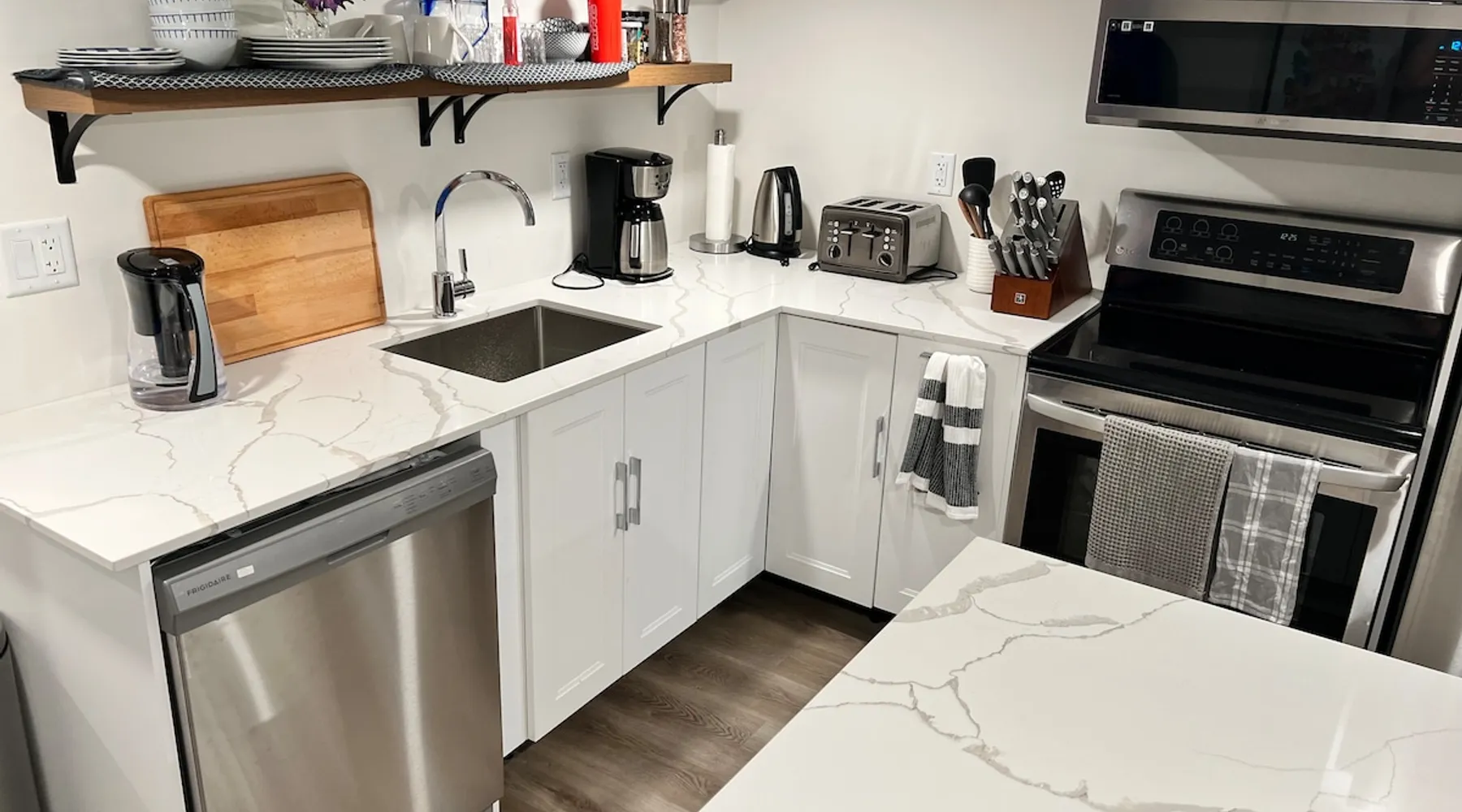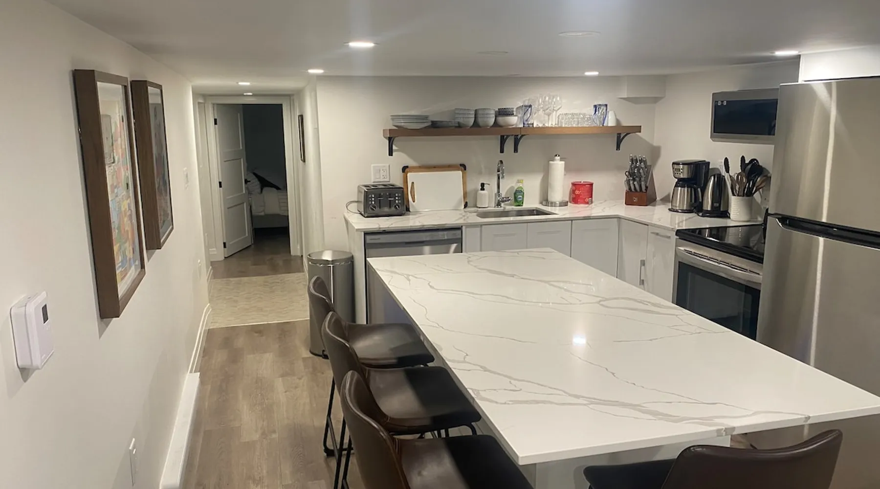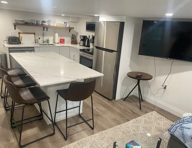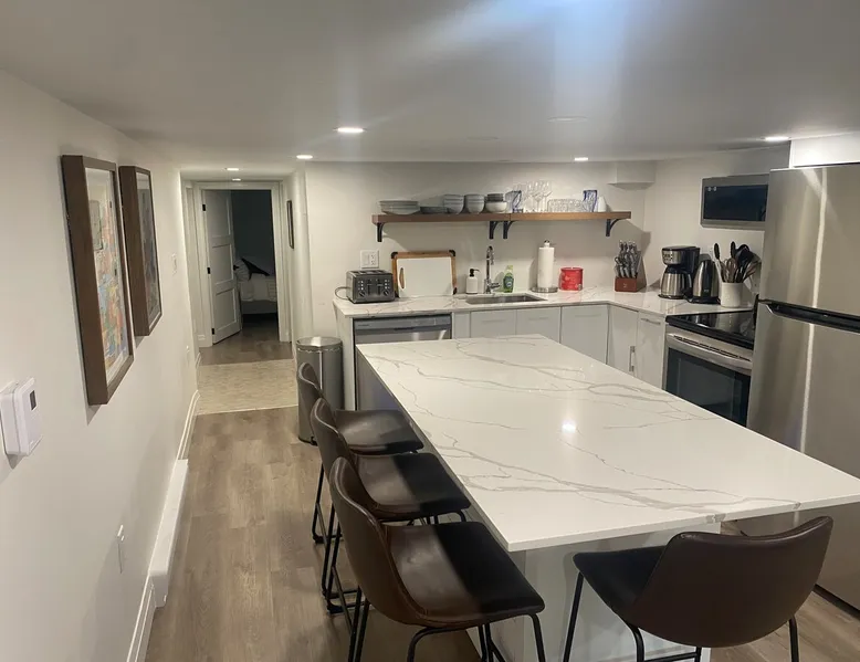 Enjoy a stylish experience at this centrally located place. The space Please note that the apartment has lower height in living/dining so anyone over 5foot 10 inches would have to bend in the two rooms due to heating vents/ bedrooms are normal height.