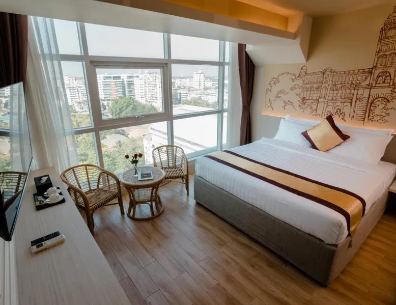 Comfortable Accommodations: The Rangoon Hotel in Yangon offers comfortable rooms with air-conditioning, private bathrooms, and city or river views. Each room includes a work desk, mini-bar, and TV, ensuring a pleasant stay. Exceptional Facilities: Guests can relax on the terrace or enjoy a drink at the bar. Free WiFi is available throughout the property, and the hotel provides a elevator, 24-hour front desk, and free on-site parking. Dining Options: A variety of breakfast options are available, including vegetarian, gluten-free, and Asian selections. The outdoor seating area and room service cater to diverse dietary needs. Prime Location: Located 9.9 mi from Yangon International Airport, the hotel is a short walk from Yangon University and the National Museum. Nearby attractions include Sule Pagoda and Shwedagon Pagoda. The twin room includes a private bathroom fitted with a shower, a hairdryer and slippers. The air-conditioned twin room features a flat-screen TV with satellite channels, a mini-bar, a safe deposit box, an electric kettle as well as city views. The unit has 2 beds.