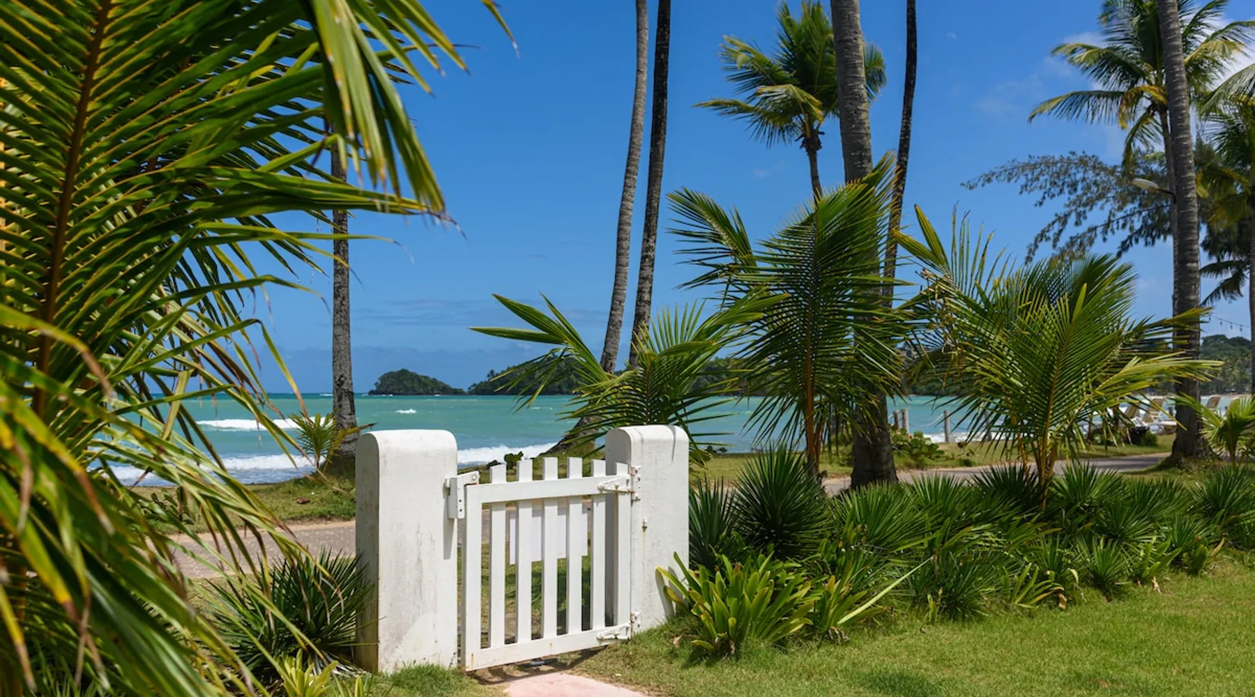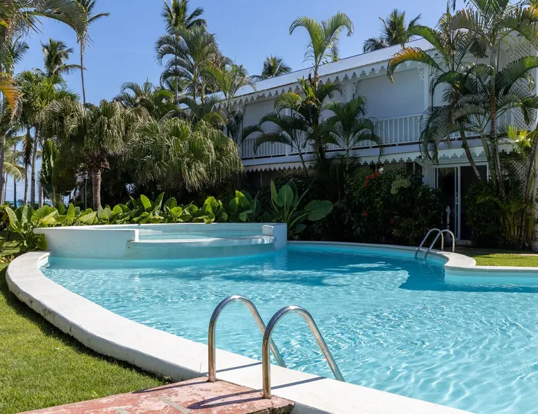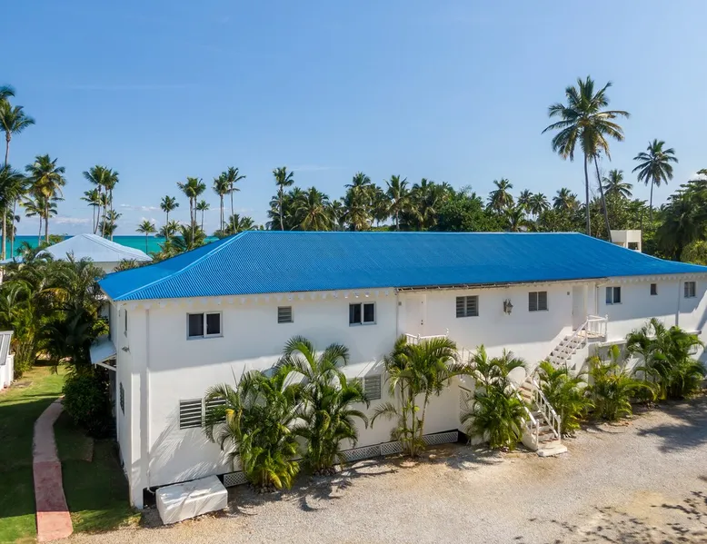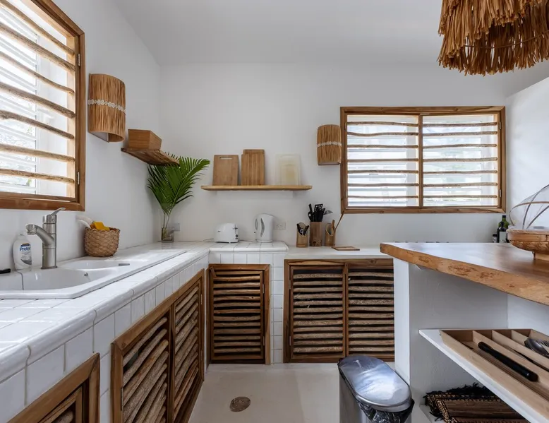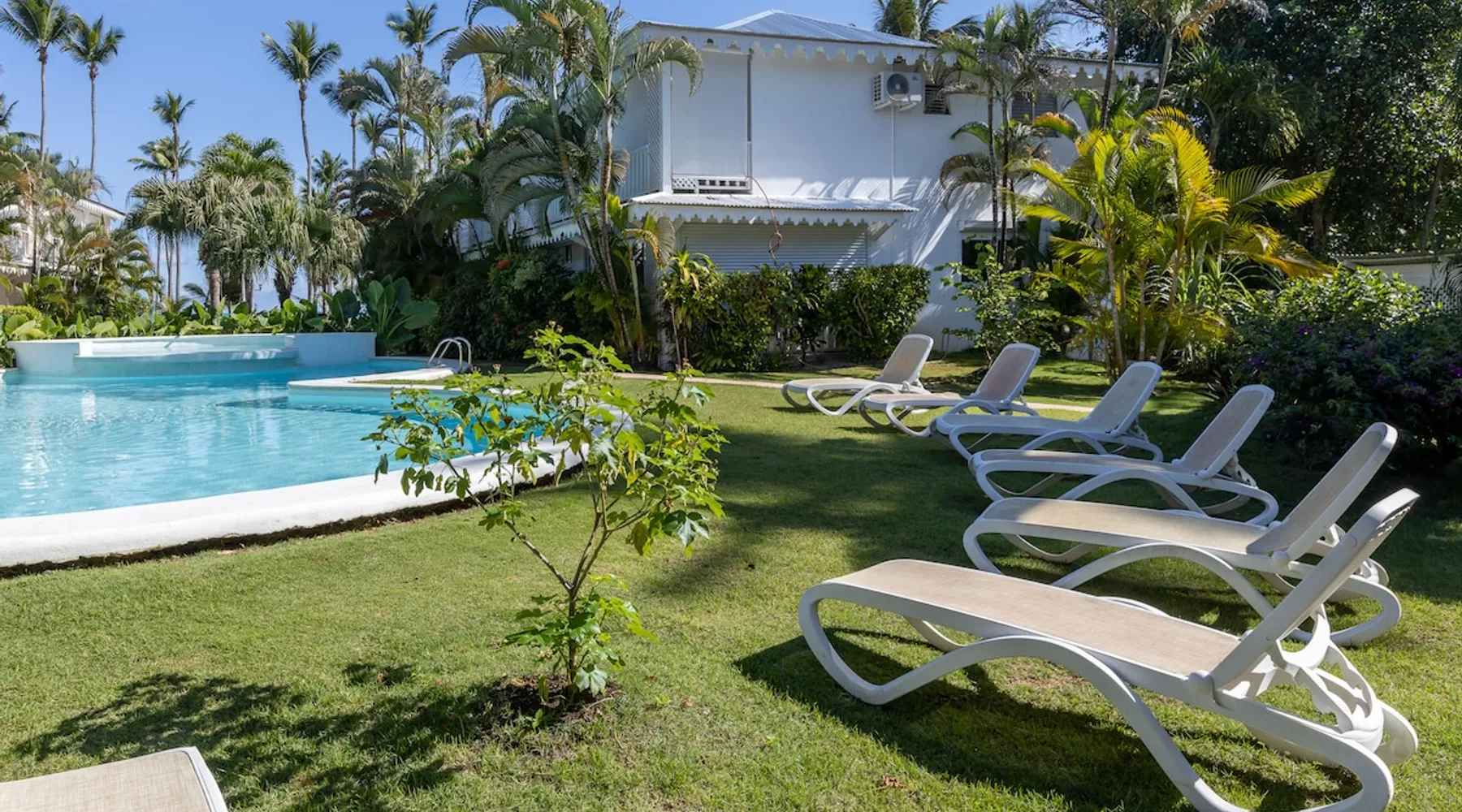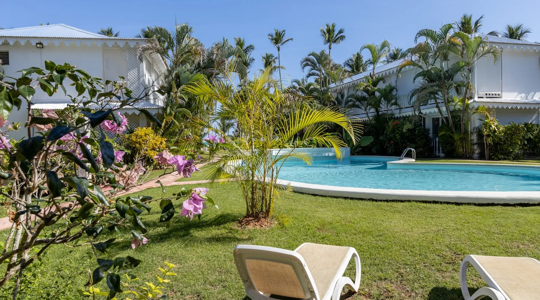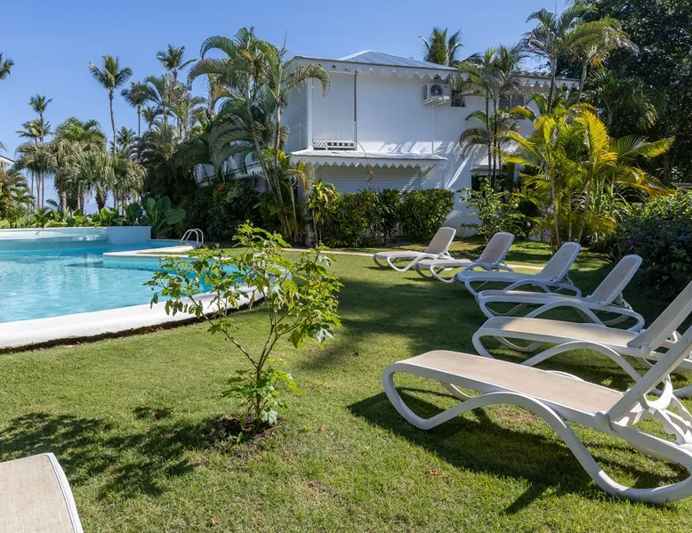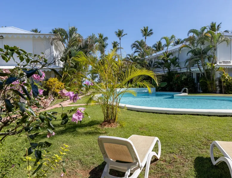 A charming 2 double bedroom apartment on the first floor of a typical Creole-style building, set in beautiful gardens with a swimming pool and 70 meters from the sea. This apartment is located in Las Gaviotas Residences in Las Terrenas, on Playa Bonita, one of the most beautiful beaches on the island and one of the few sites with direct access to the sea with no roads to cross. Fiber-optic Internet installed November 2023! The space ENTIRELY RENOVATED SPRING 2023 This ground level boho-chic apartment in a 15 unit quaint beachfront complex consists of a sitting area, a dining area seating 6 people, a fully equipped large kitchen with an island, a guest WC, a master bedroom with ensuite shower room with WC, a second bedroom with ensuite shower room. Plenty of cupboards, wardrobes and storage throughout. The kitchen is well equipped with full amenities including new appliances. Fiber optic internet was recently installed (November 2023) The apartment is fitted with plantation shutters lined with mosquito fabric. Air conditioning in both bedrooms and ceiling fans in all rooms. The master bedroom which faces the sea is furnished with a double bed 150cm wide from which you can be lulled to sleep by the sound of the waves. The second bedroom is furnished by 2 large single beds 100cm. A selection of pillows is available. Sheets are cotton. Both bedrooms have good reading lights and spacious wardrobes. Other things to note Electricity consumption is included in our prices. Fiber optic internet installed.