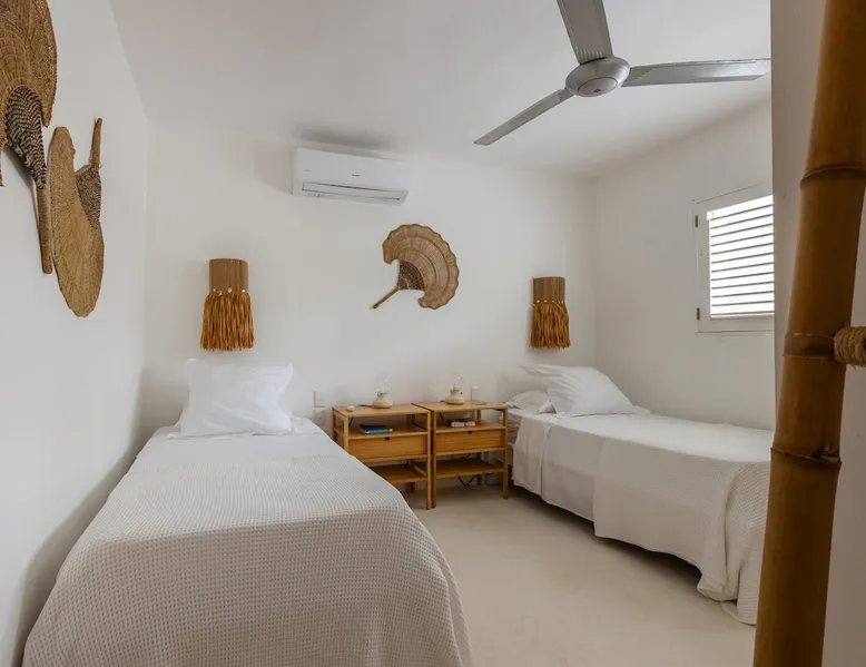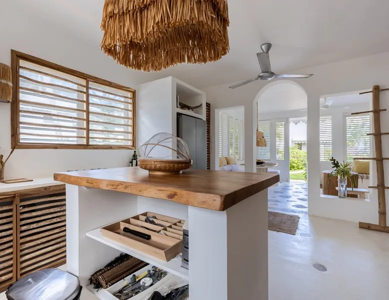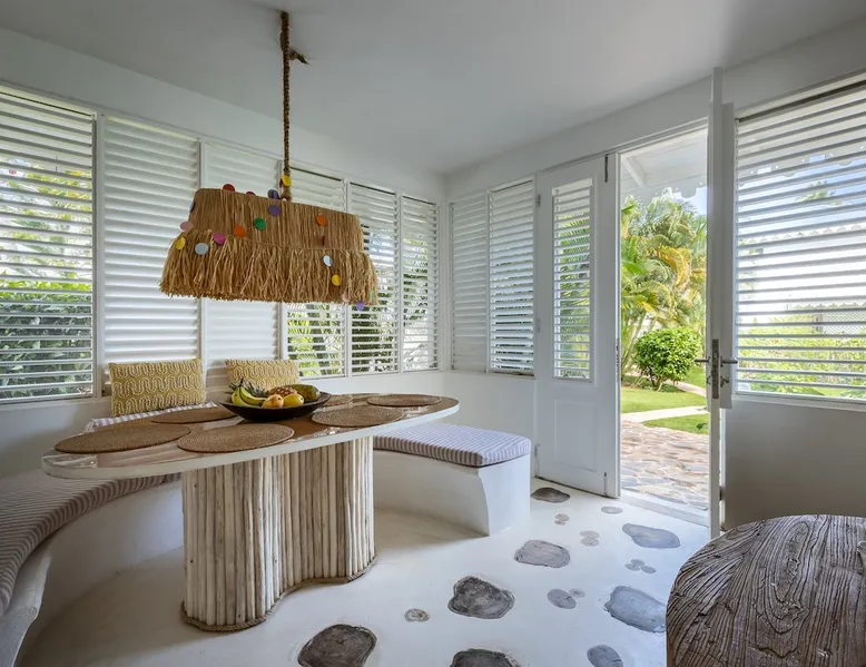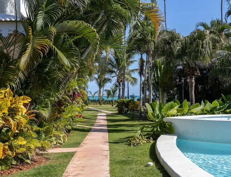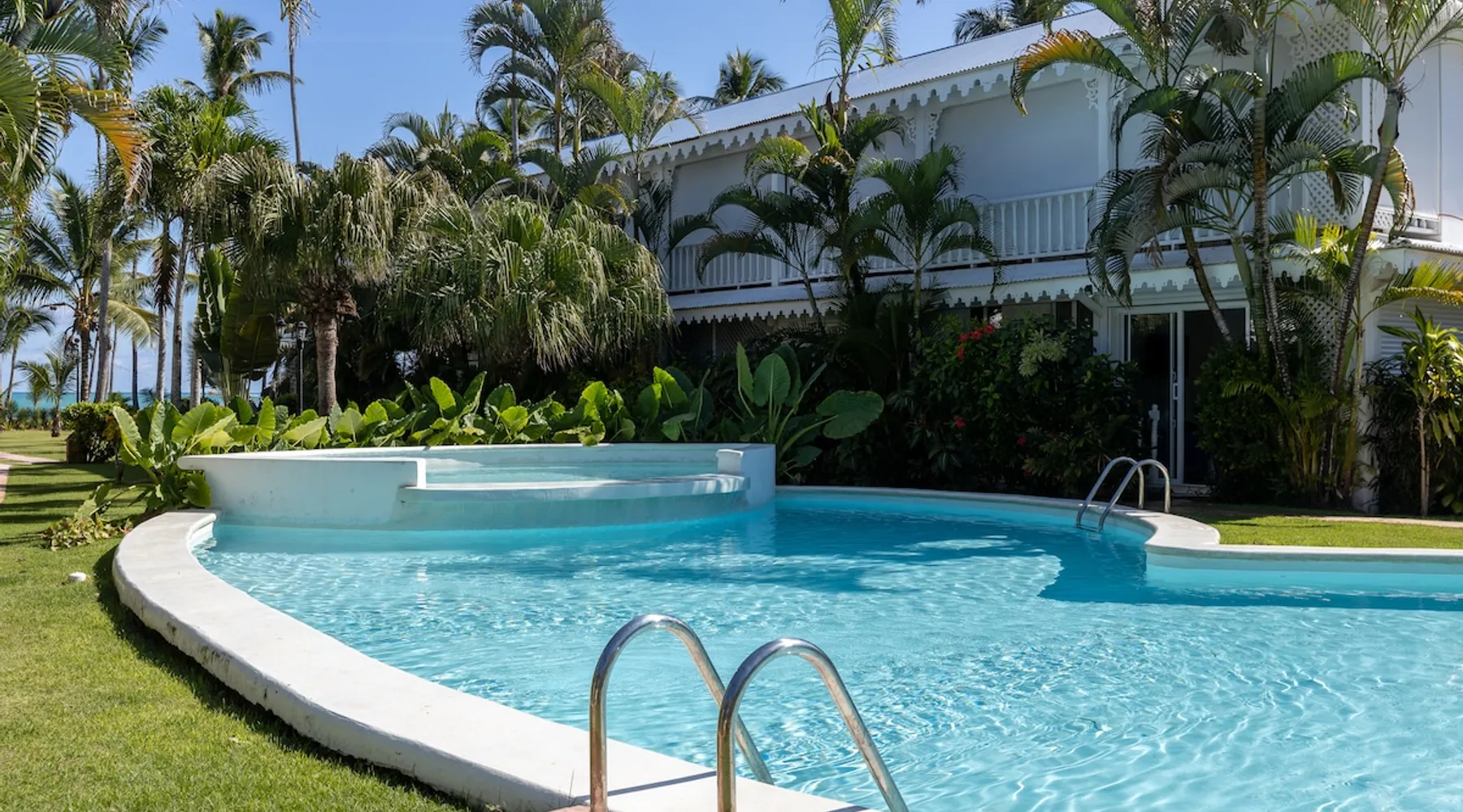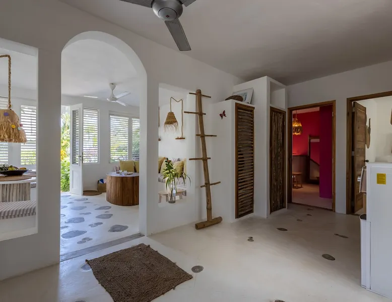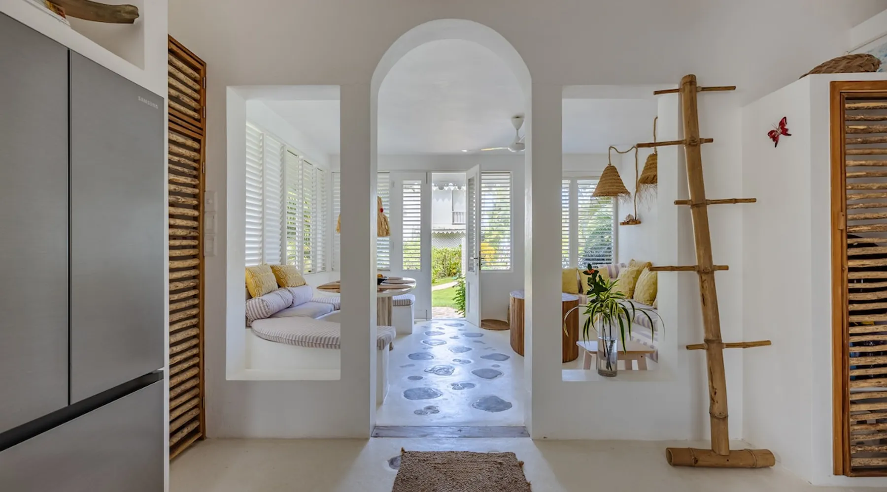 A charming 2 double bedroom apartment on the first floor of a typical Creole-style building, set in beautiful gardens with a swimming pool and 70 meters from the sea. This apartment is located in Las Gaviotas Residences in Las Terrenas, on Playa Bonita, one of the most beautiful beaches on the island and one of the few sites with direct access to the sea with no roads to cross. Fiber-optic Internet installed November 2023! The space ENTIRELY RENOVATED SPRING 2023 This ground level boho-chic apartment in a 15 unit quaint beachfront complex consists of a sitting area, a dining area seating 6 people, a fully equipped large kitchen with an island, a guest WC, a master bedroom with ensuite shower room with WC, a second bedroom with ensuite shower room. Plenty of cupboards, wardrobes and storage throughout. The kitchen is well equipped with full amenities including new appliances. Fiber optic internet was recently installed (November 2023) The apartment is fitted with plantation shutters lined with mosquito fabric. Air conditioning in both bedrooms and ceiling fans in all rooms. The master bedroom which faces the sea is furnished with a double bed 150cm wide from which you can be lulled to sleep by the sound of the waves. The second bedroom is furnished by 2 large single beds 100cm. A selection of pillows is available. Sheets are cotton. Both bedrooms have good reading lights and spacious wardrobes. Other things to note Electricity consumption is included in our prices. Fiber optic internet installed.