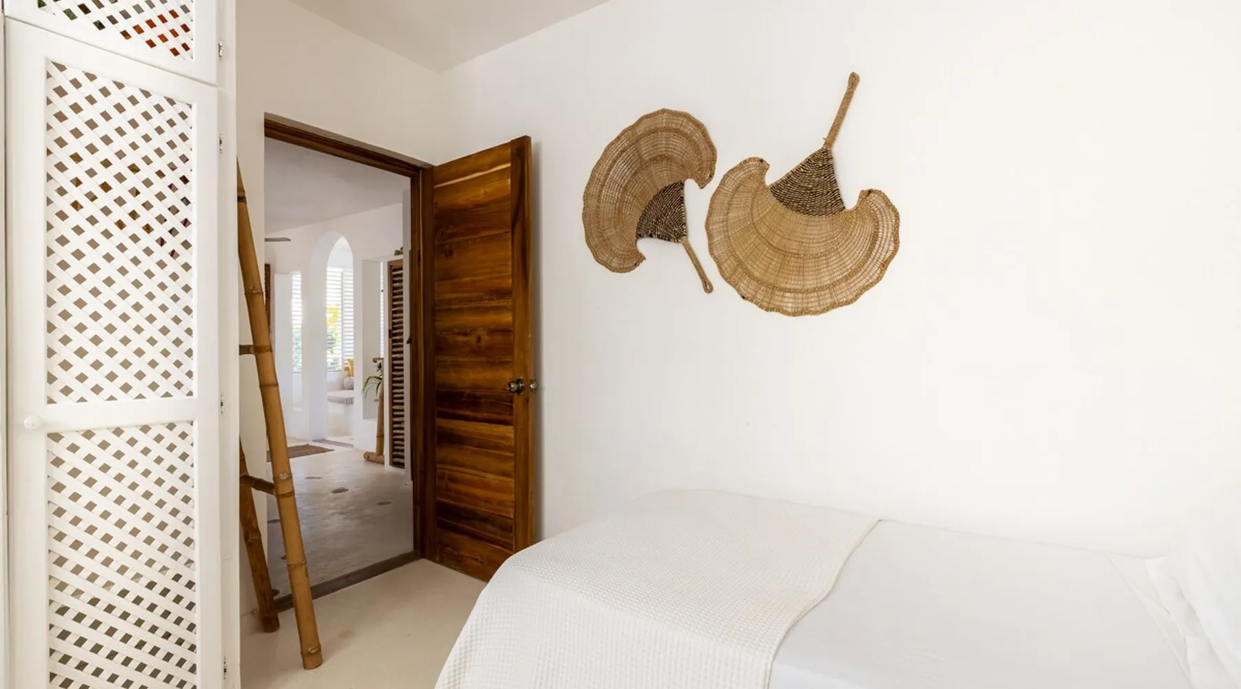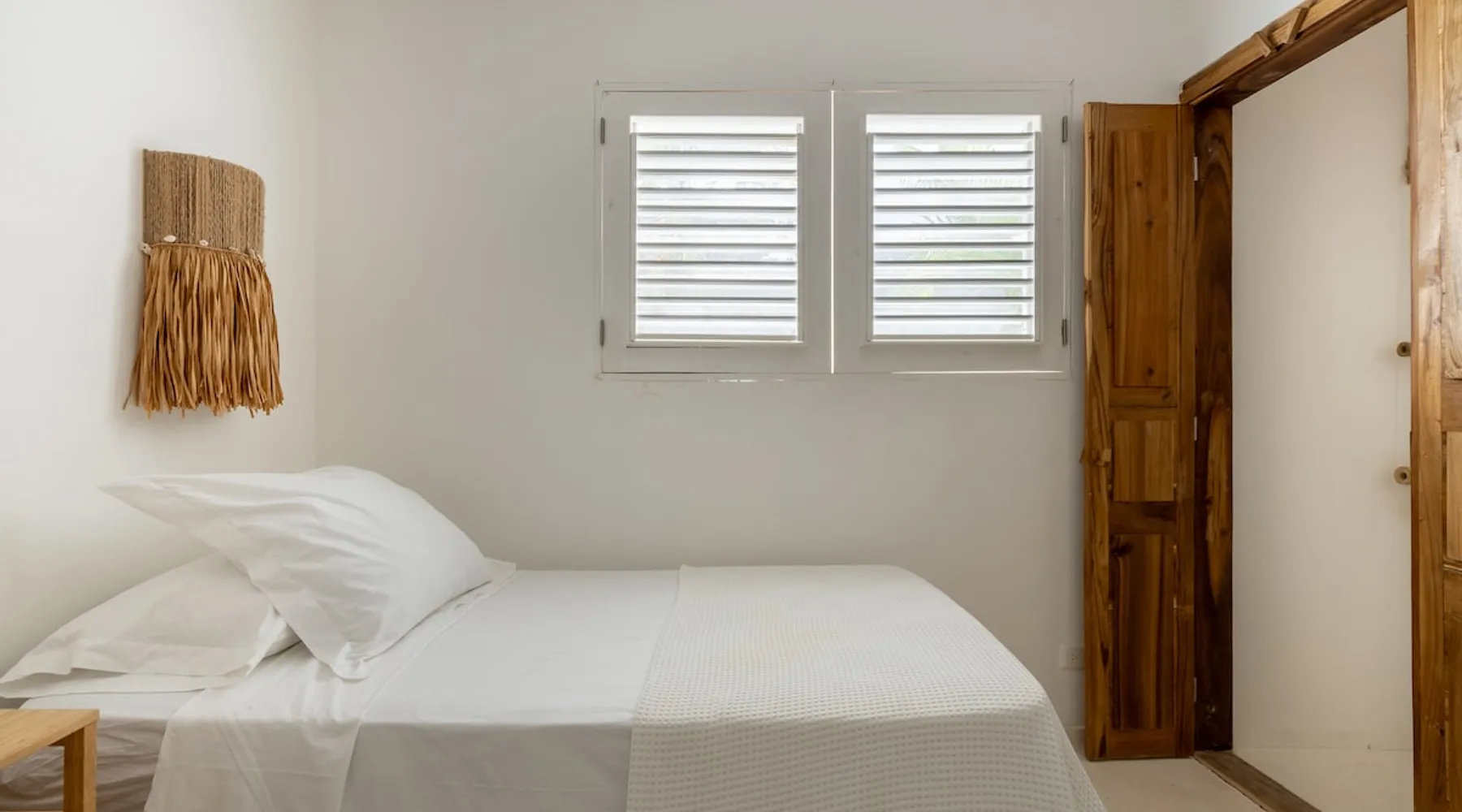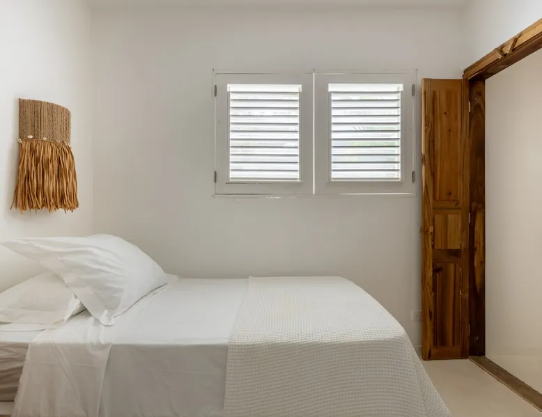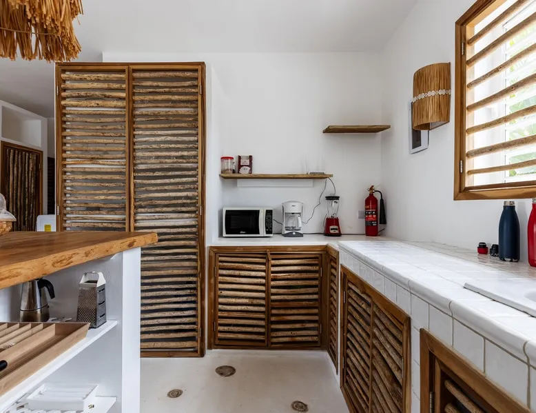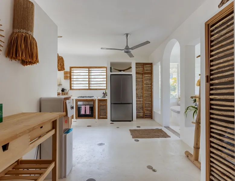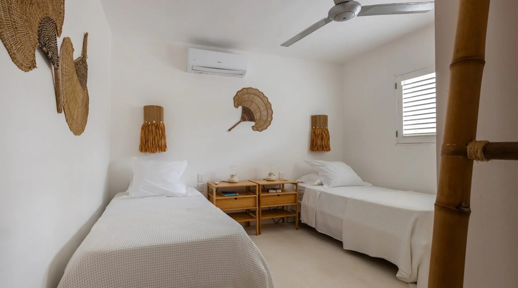 A charming 2 double bedroom apartment on the first floor of a typical Creole-style building, set in beautiful gardens with a swimming pool and 70 meters from the sea. This apartment is located in Las Gaviotas Residences in Las Terrenas, on Playa Bonita, one of the most beautiful beaches on the island and one of the few sites with direct access to the sea with no roads to cross. Fiber-optic Internet installed November 2023! The space ENTIRELY RENOVATED SPRING 2023 This ground level boho-chic apartment in a 15 unit quaint beachfront complex consists of a sitting area, a dining area seating 6 people, a fully equipped large kitchen with an island, a guest WC, a master bedroom with ensuite shower room with WC, a second bedroom with ensuite shower room. Plenty of cupboards, wardrobes and storage throughout. The kitchen is well equipped with full amenities including new appliances. Fiber optic internet was recently installed (November 2023) The apartment is fitted with plantation shutters lined with mosquito fabric. Air conditioning in both bedrooms and ceiling fans in all rooms. The master bedroom which faces the sea is furnished with a double bed 150cm wide from which you can be lulled to sleep by the sound of the waves. The second bedroom is furnished by 2 large single beds 100cm. A selection of pillows is available. Sheets are cotton. Both bedrooms have good reading lights and spacious wardrobes. Other things to note Electricity consumption is included in our prices. Fiber optic internet installed.
