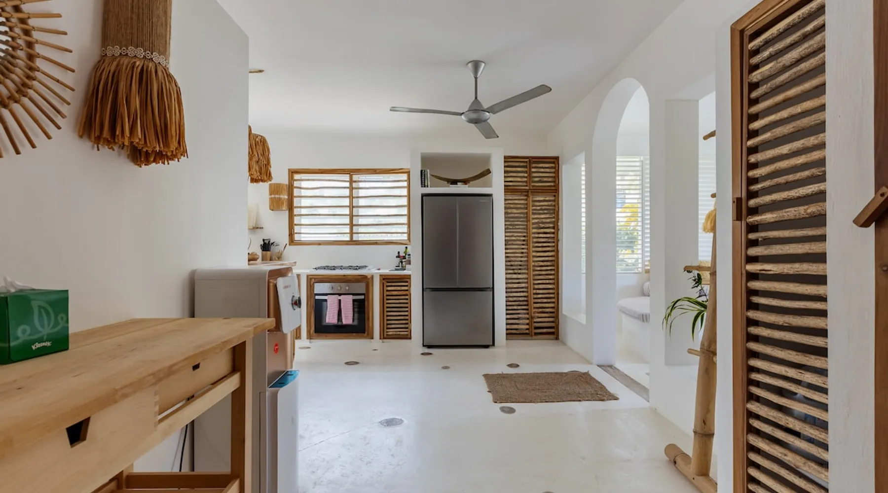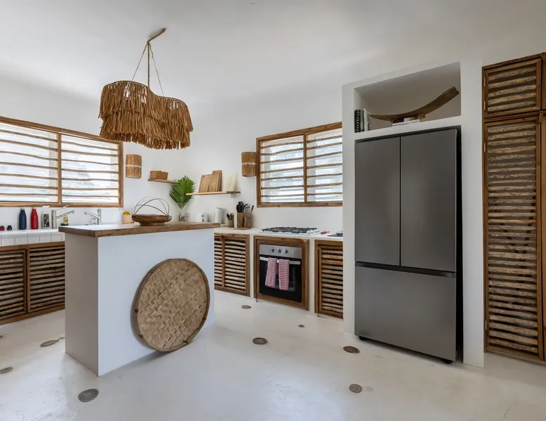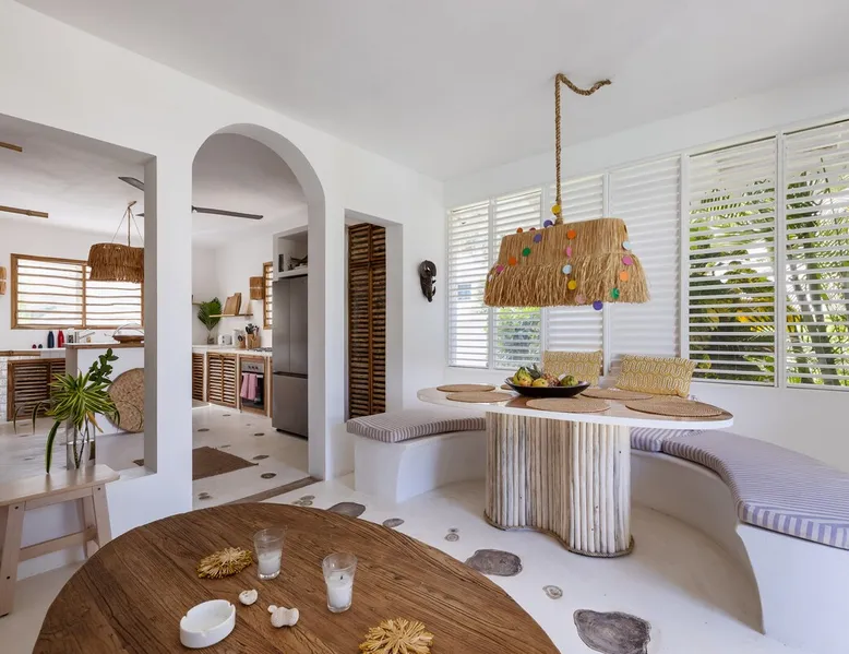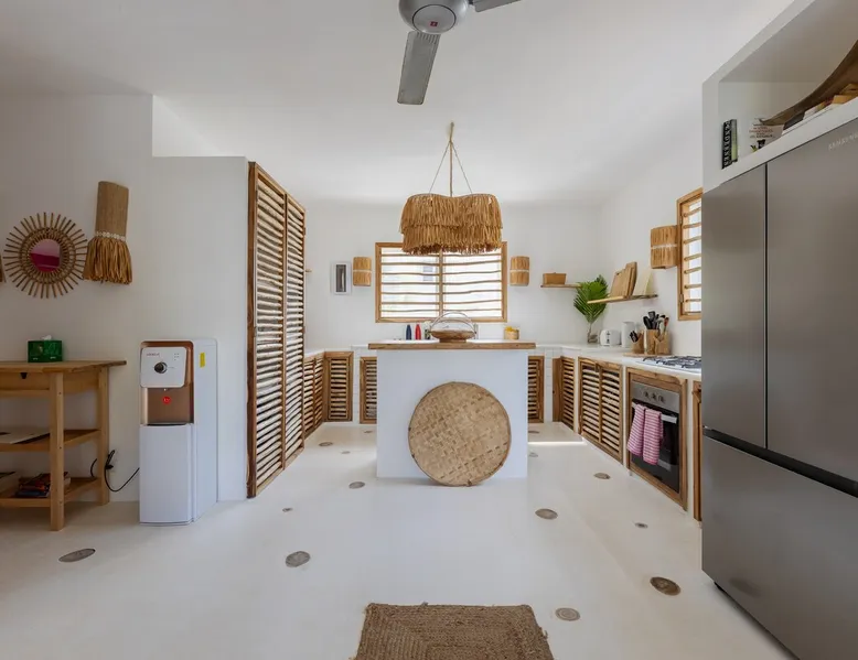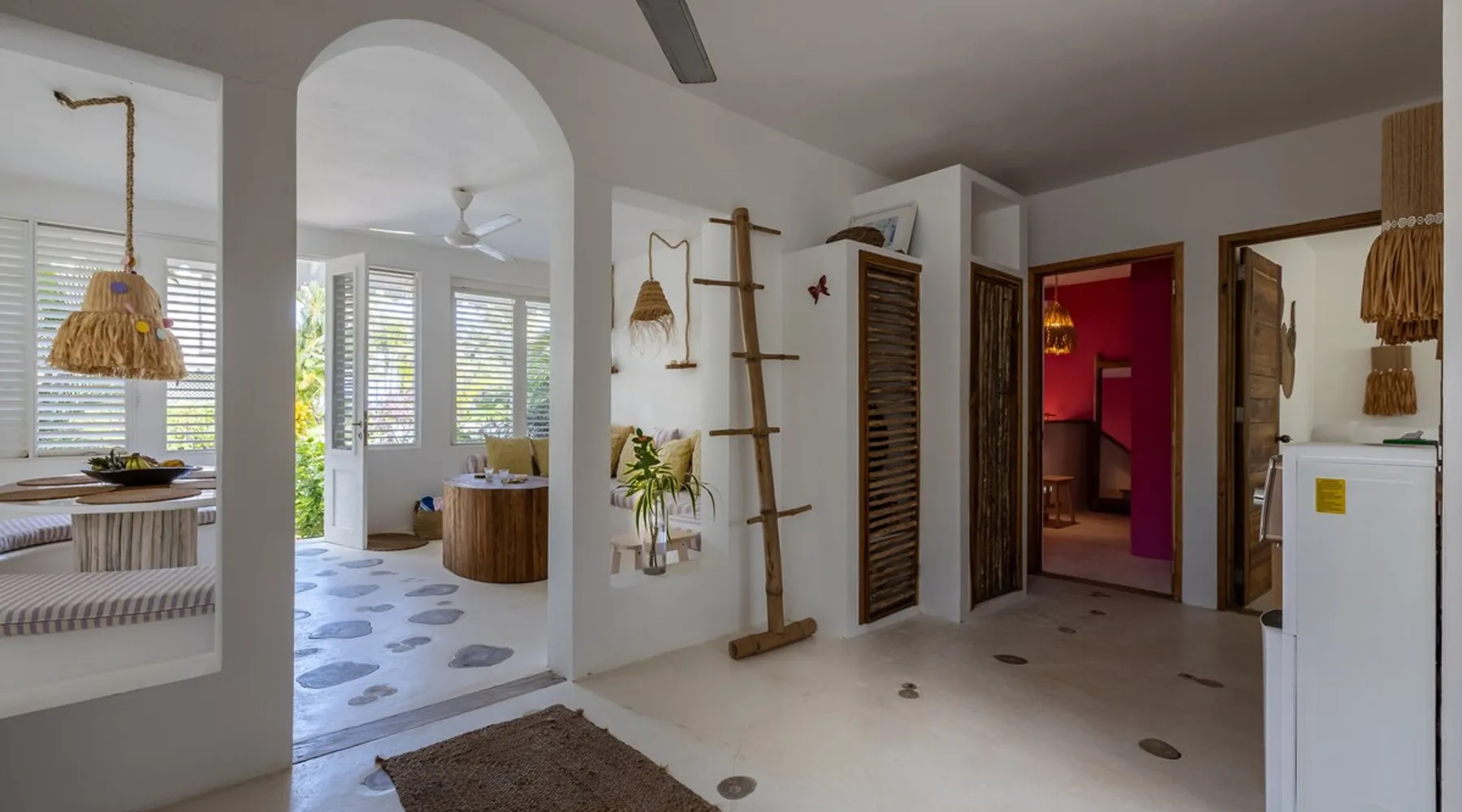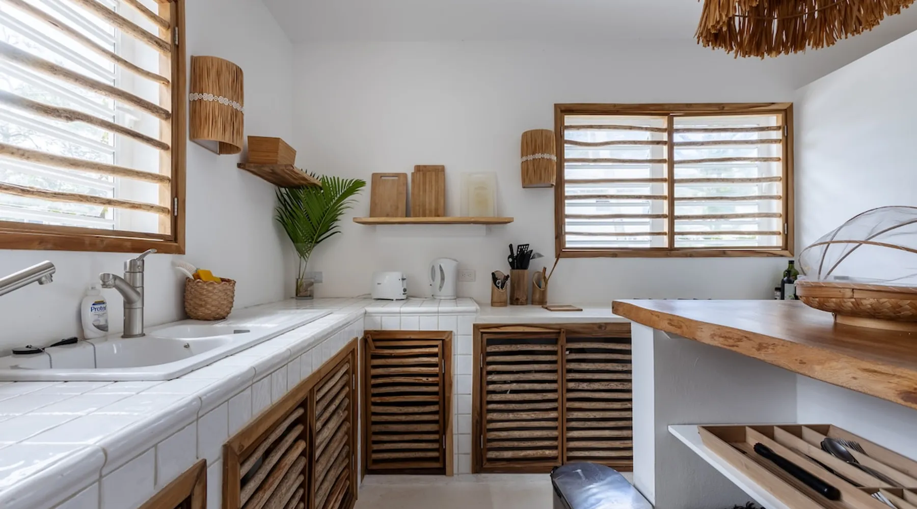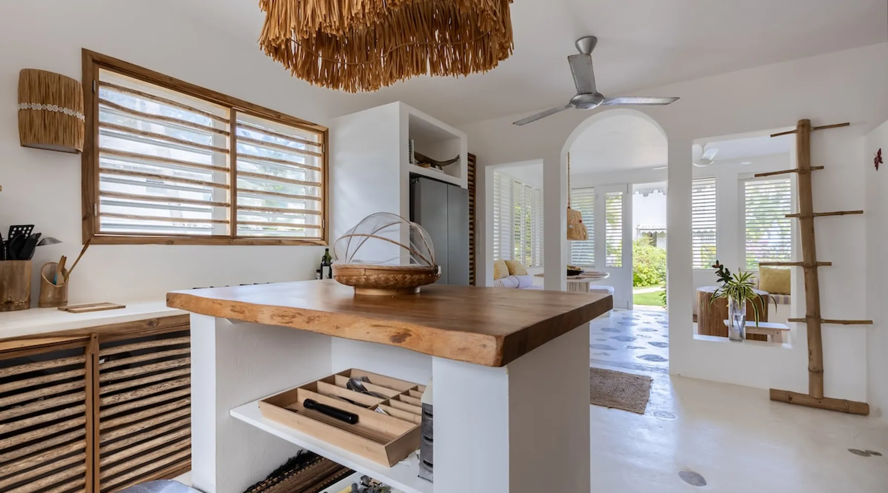 A charming 2 double bedroom apartment on the first floor of a typical Creole-style building, set in beautiful gardens with a swimming pool and 70 meters from the sea. This apartment is located in Las Gaviotas Residences in Las Terrenas, on Playa Bonita, one of the most beautiful beaches on the island and one of the few sites with direct access to the sea with no roads to cross. Fiber-optic Internet installed November 2023! The space ENTIRELY RENOVATED SPRING 2023 This ground level boho-chic apartment in a 15 unit quaint beachfront complex consists of a sitting area, a dining area seating 6 people, a fully equipped large kitchen with an island, a guest WC, a master bedroom with ensuite shower room with WC, a second bedroom with ensuite shower room. Plenty of cupboards, wardrobes and storage throughout. The kitchen is well equipped with full amenities including new appliances. Fiber optic internet was recently installed (November 2023) The apartment is fitted with plantation shutters lined with mosquito fabric. Air conditioning in both bedrooms and ceiling fans in all rooms. The master bedroom which faces the sea is furnished with a double bed 150cm wide from which you can be lulled to sleep by the sound of the waves. The second bedroom is furnished by 2 large single beds 100cm. A selection of pillows is available. Sheets are cotton. Both bedrooms have good reading lights and spacious wardrobes. Other things to note Electricity consumption is included in our prices. Fiber optic internet installed.
