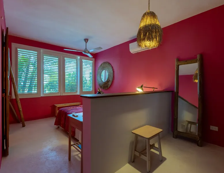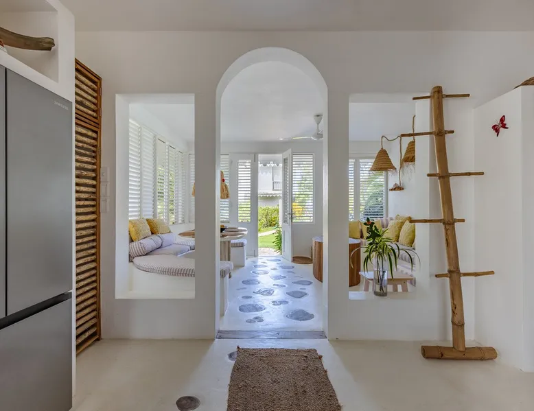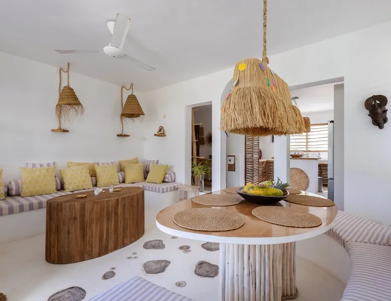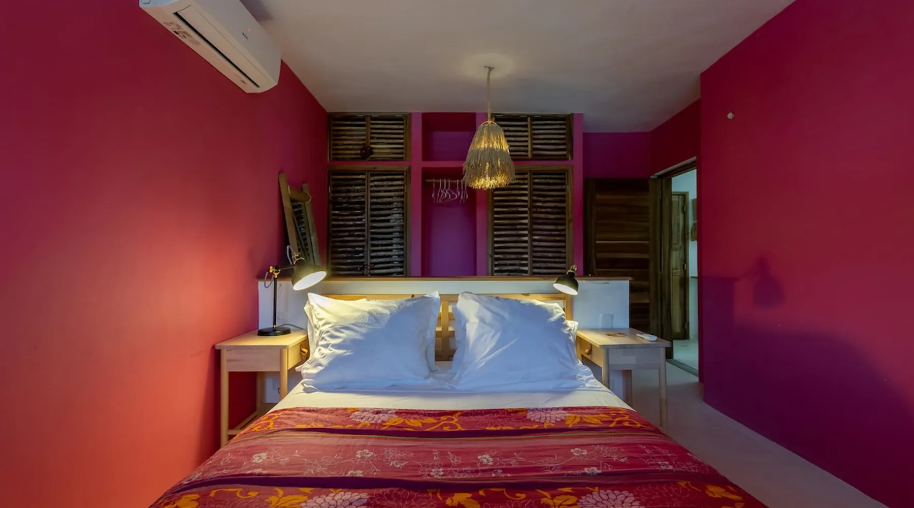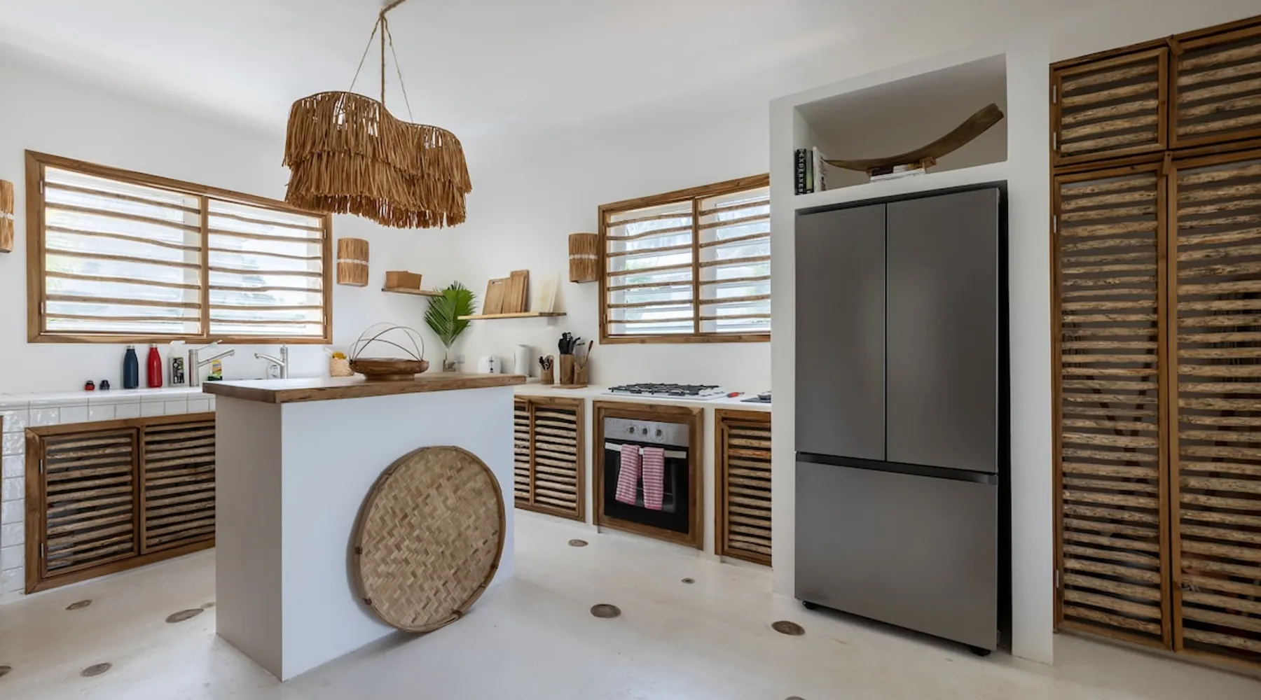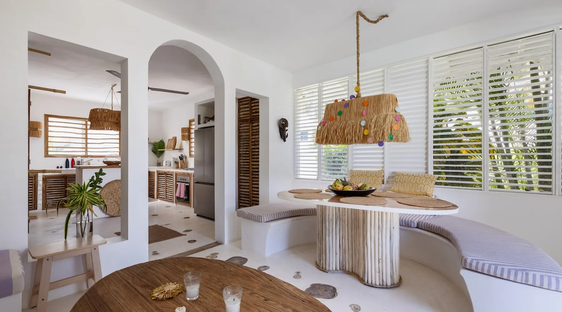 A charming 2 double bedroom apartment on the first floor of a typical Creole-style building, set in beautiful gardens with a swimming pool and 70 meters from the sea. This apartment is located in Las Gaviotas Residences in Las Terrenas, on Playa Bonita, one of the most beautiful beaches on the island and one of the few sites with direct access to the sea with no roads to cross. Fiber-optic Internet installed November 2023! The space ENTIRELY RENOVATED SPRING 2023 This ground level boho-chic apartment in a 15 unit quaint beachfront complex consists of a sitting area, a dining area seating 6 people, a fully equipped large kitchen with an island, a guest WC, a master bedroom with ensuite shower room with WC, a second bedroom with ensuite shower room. Plenty of cupboards, wardrobes and storage throughout. The kitchen is well equipped with full amenities including new appliances. Fiber optic internet was recently installed (November 2023) The apartment is fitted with plantation shutters lined with mosquito fabric. Air conditioning in both bedrooms and ceiling fans in all rooms. The master bedroom which faces the sea is furnished with a double bed 150cm wide from which you can be lulled to sleep by the sound of the waves. The second bedroom is furnished by 2 large single beds 100cm. A selection of pillows is available. Sheets are cotton. Both bedrooms have good reading lights and spacious wardrobes. Other things to note Electricity consumption is included in our prices. Fiber optic internet installed.