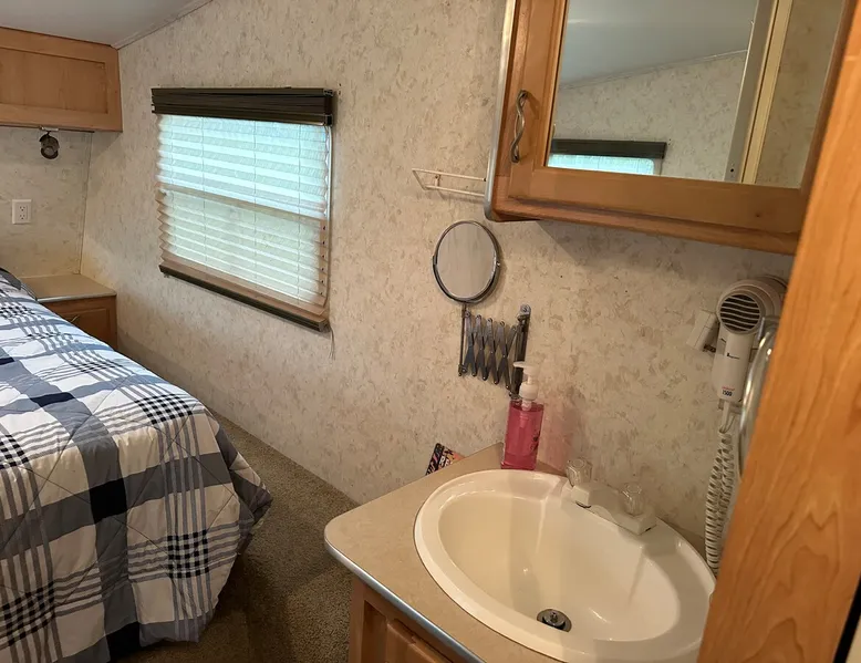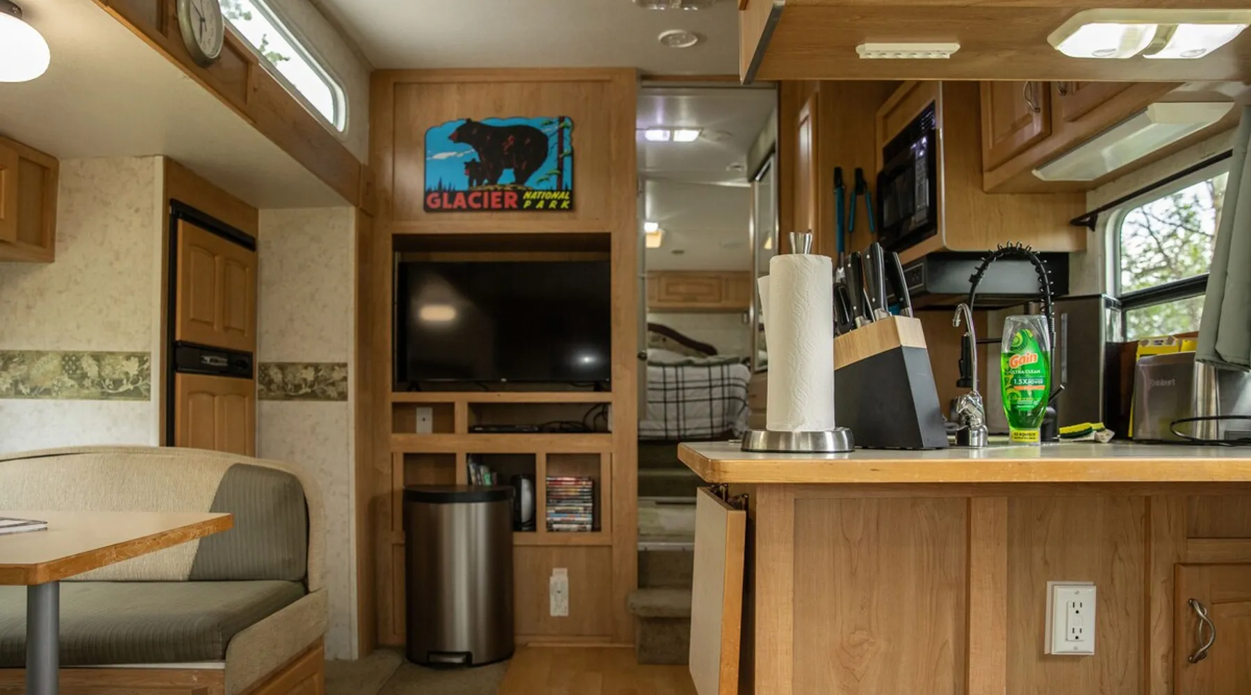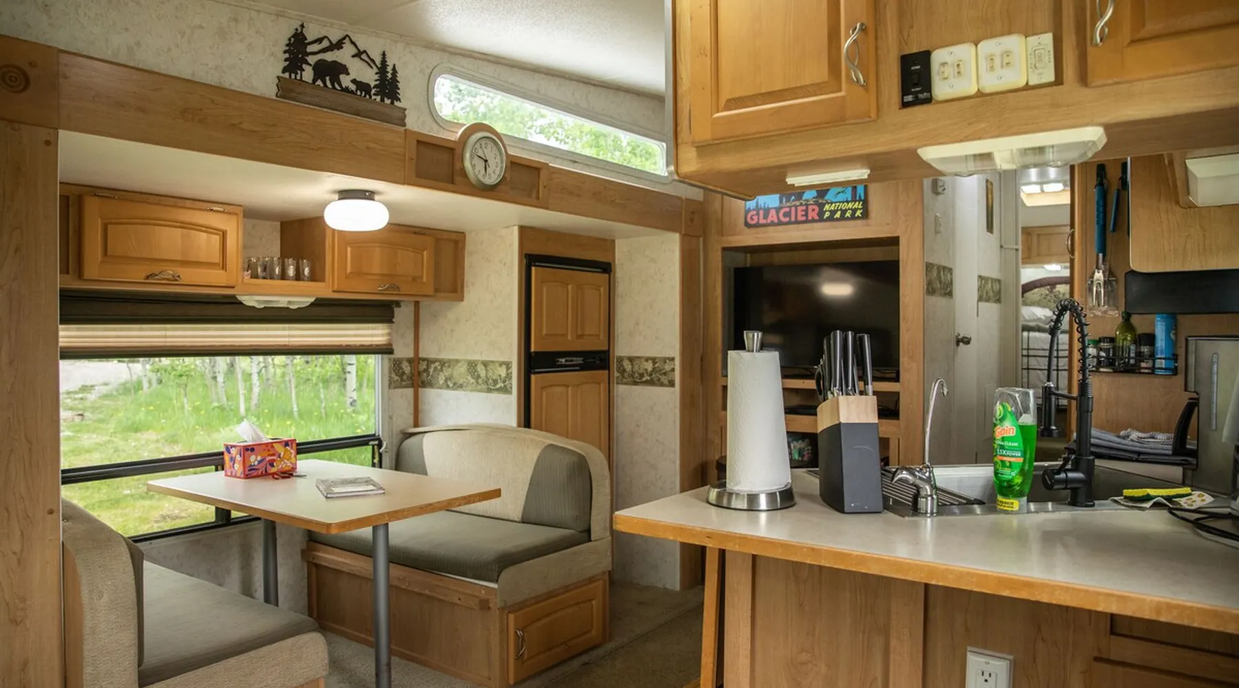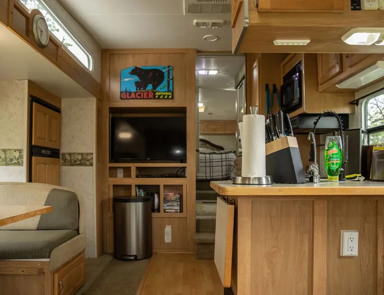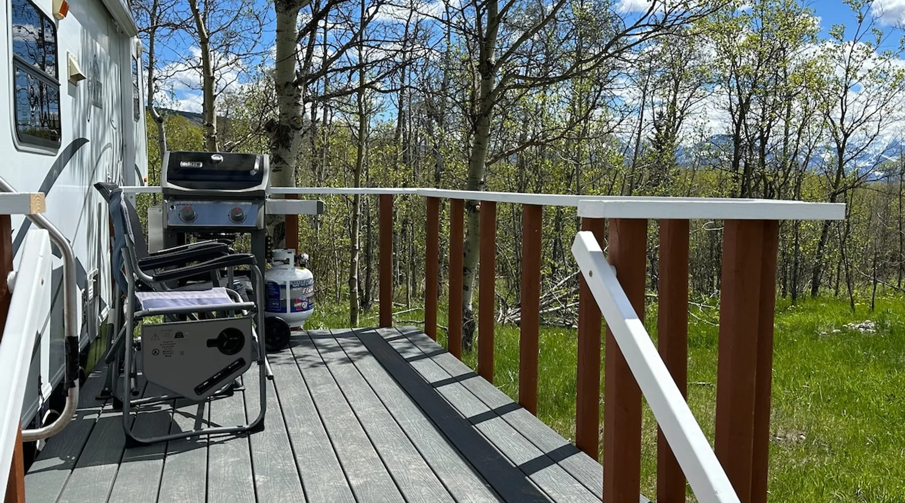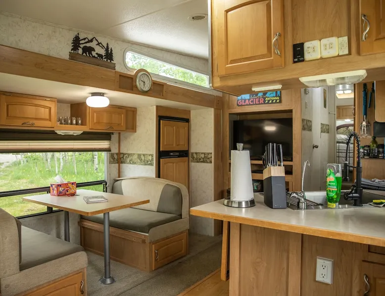 Glacier Borealis is a 27’ Glamping Trailer is located in a secluded clearing in a forest. As a guest of the Borealis you have access to a shared washer/dryer in an adjacent new wash house. There is a Weber grill. The Borealis is located 10 miles from both St Mary and Many Glacier Park Entrances near Babb, MT. This is a great budget option for 2 adults and a child. There is a common fire pit area with fire wood supplied. There is wildlife on the property and trails in the surrounding forest. The space The trailer has a queen size matress bedroom with privacy folding door and a pull out cushion bed with a size best described as slightly wider than a twin. The trailer has a full compact bathroom with shower. There are spices and condiments in the fridge. The Borealis is located on a secluded area of a private acreage called Glacier Springs. There is a beautiful open area in front of the Borealis for parking, campfires and exploration. Guest access The guest access to the trailer is via a key supplied at check in. Other things to note Hot, cold and filtered water are supplied.