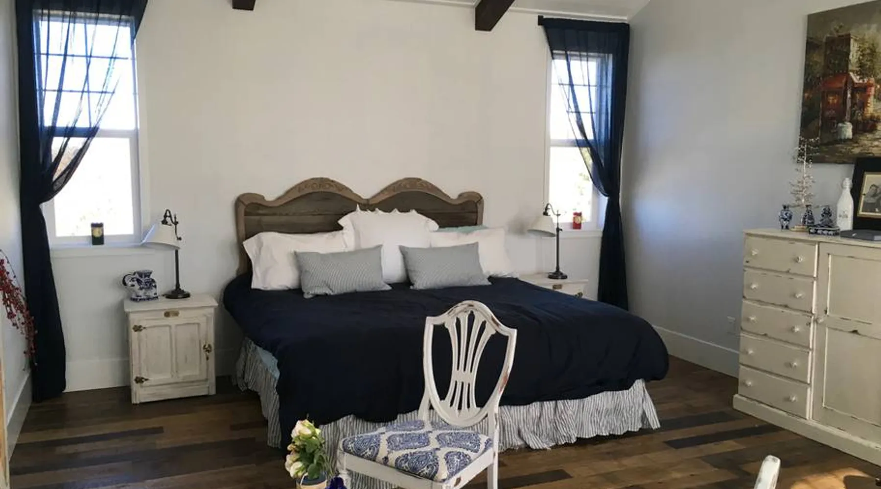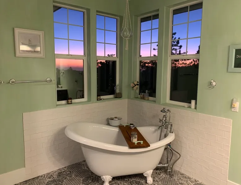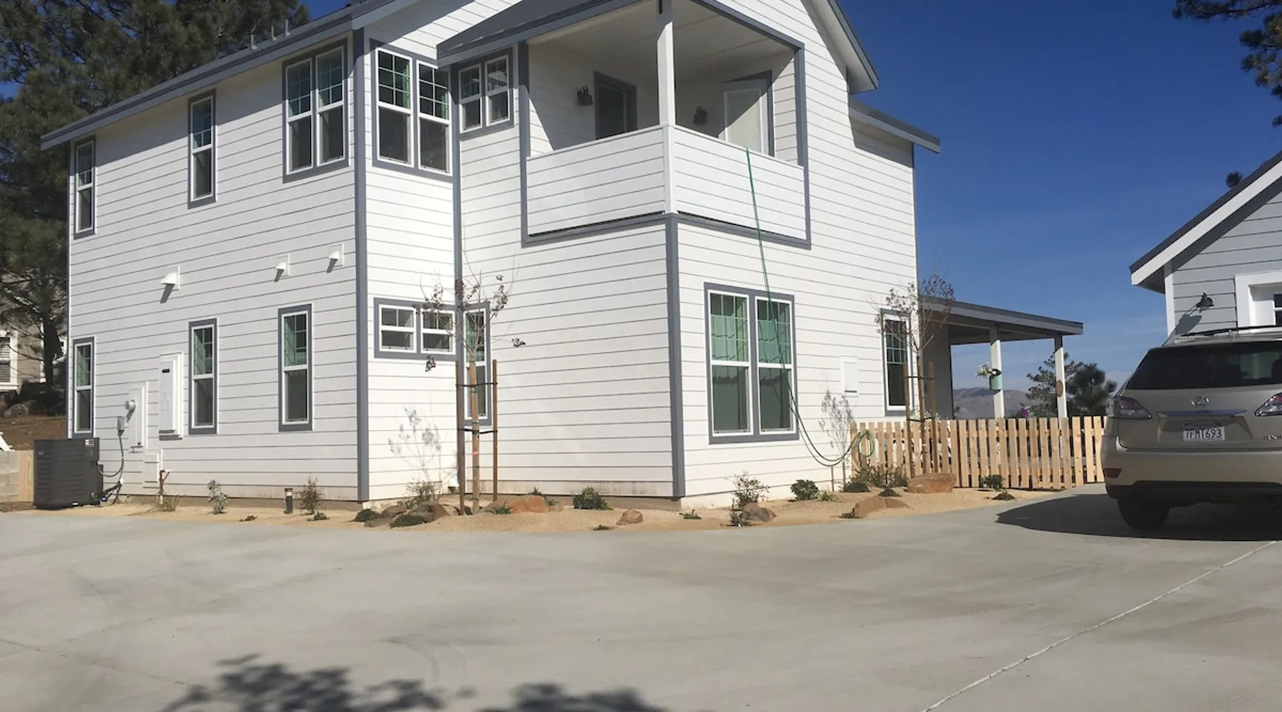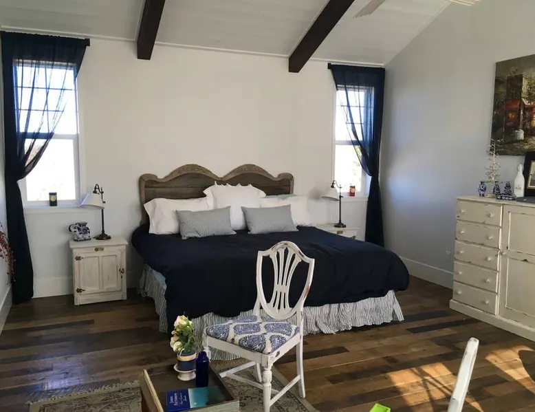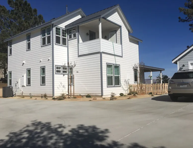 See our home featured in February 2018 San Diego Magazine. Search internet with quotes: "Inside an Idyllic Julian Farmhouse" (AirBnB doesn't allow the link). The Crooked Pine Farmhouse is a peaceful escape only 3 blocks from Main St, but atop a steep hill with amazing views and isolation from the crowds of downtown Julian. Perfectly positioned with beautiful mountain/desert views from the front, and ocean views from the 2nd floor deck (on a clear day)! Built in 2017, this property sleeps 6-8. The space The Crooked Pine Farmhouse is a peaceful escape only 3 blocks from town, but atop a steep hill with amazing views and isolation from the crowds of downtown Julian. The acre of land is perfectly positioned with beautiful mountain views from the front, and actual ocean sunset views from the 2nd floor deck (on a clear day)! It is a charming farmhouse style home, 2000 square feet with reclaimed barnwood floors from Pennsylvania, porcelain tile floors from France, vaulted ceilings, and shiplap walls. It has three beautifully furnished bedrooms, two full bathrooms(both with showers and tubs), kitchen with all brand new appliances, rustic and inviting dining room, living room with large screen TV (internet enabled for your Netflix account) and cable, mudroom, small reading nook (with hundreds of books to borrow) and upstairs deck. The wraparound porch is equipped with Adirondack chairs and a porch swing from which to enjoy the amazing sunrise or nighttime star gazing. We have plenty of both outdoor and indoor games to enjoy in the evenings when the town shuts down including a hand shuffleboard table and big jenga! The acre of land provides plenty of space and trees. The area surrounding the house has been tastefully landscaped with terrain, stone, and plants that are native to Julian in order to maintain its authenticity. The secluded upstairs master bedroom is an escape in itself. Very spacious room with a King bed, and with a large antique desk to work (if you must), a window seat to relax with beautiful mountain and sunrise views. There is a gas fireplace with seating area as well. Also plenty of extra room to do yoga with a view. The reclaimed barn wood sliding door leads to a a private bath with claw foot tub and separate shower room and double marble sink. The house is furnished with antiques and modern farmhouse style decor, as well as high end finishes, mattresses, linens, bedding, etc. It is equipped with heat (from both heater and wood burning stove), AC, Wireless Internet, Cable TV, full kitchen appliances and all of the details you would need to cook, bake pies, play games, read, picnic, hike, yoga, wireless speakers, etc. High end amenities, coffee, and cooking essentials also provided. This is truly a special place, we have worked very hard over the last 2 years building and designing and decorating what we believe is the utmost escape. The serenity and seclusion and silent evenings and mornings are amazing, but being able to walk just a couple of blocks for shopping, coffee, dining, wine and beer tasting, etc. is extremely convenient. Due to previous damage, please seek approval for small children prior to booking. Please check our San Diego listing for more reviews. You can search “cozy cottage steps to beach and bay.” Look for our Farmhouse and our story in the February 2018 issue of San Diego Magazine! Please note that there are security cameras on premises. There are no cameras inside! Other things to note It is regret that we feel like we have to say this: due to prior disrespectful guests and damage, if you show up with any pets without prior authorization from us, you will be asked to leave immediately without any refund.