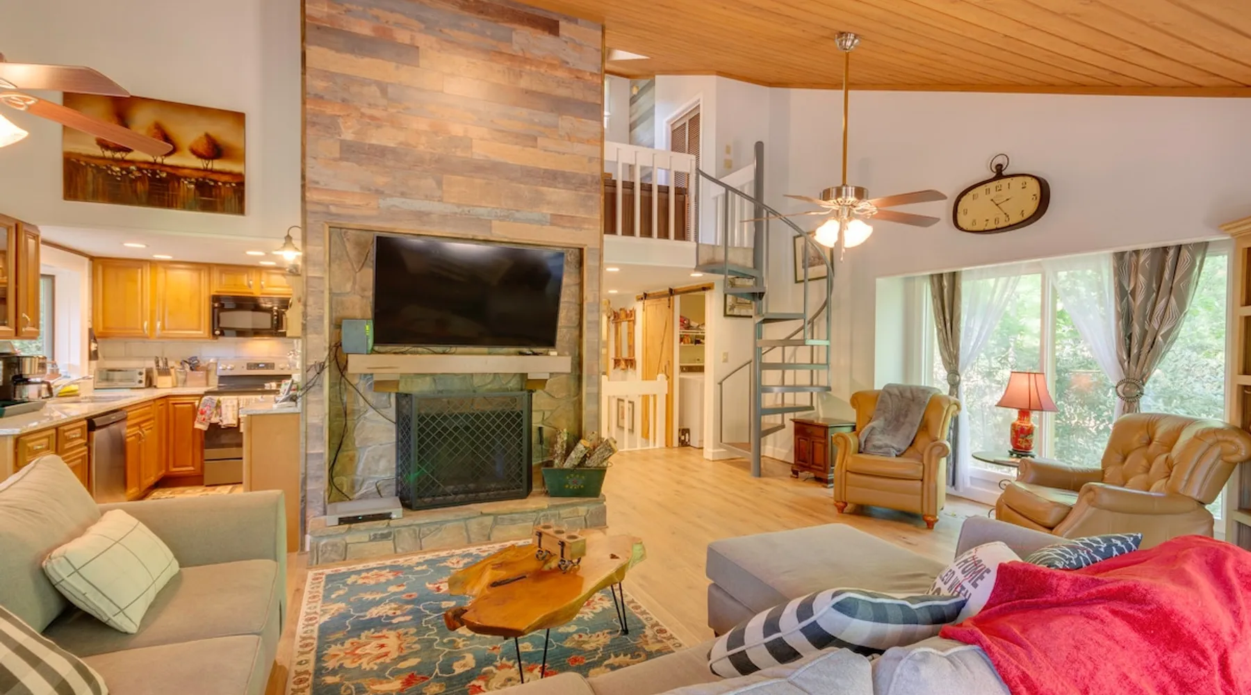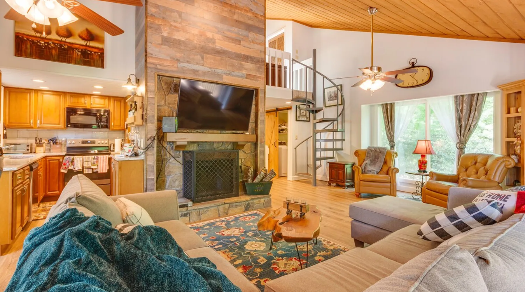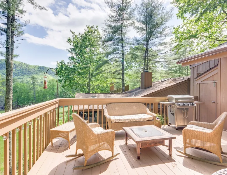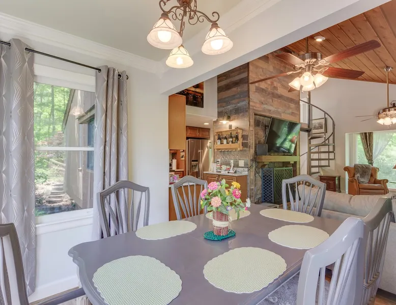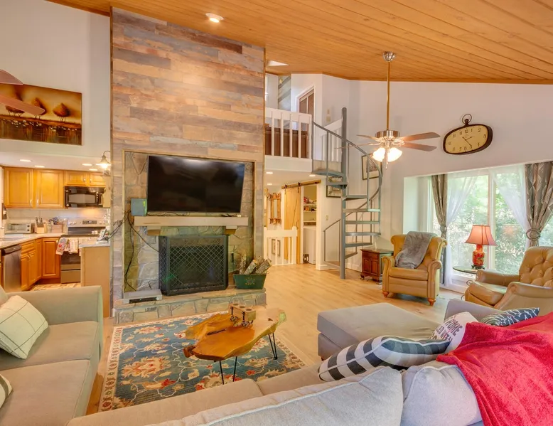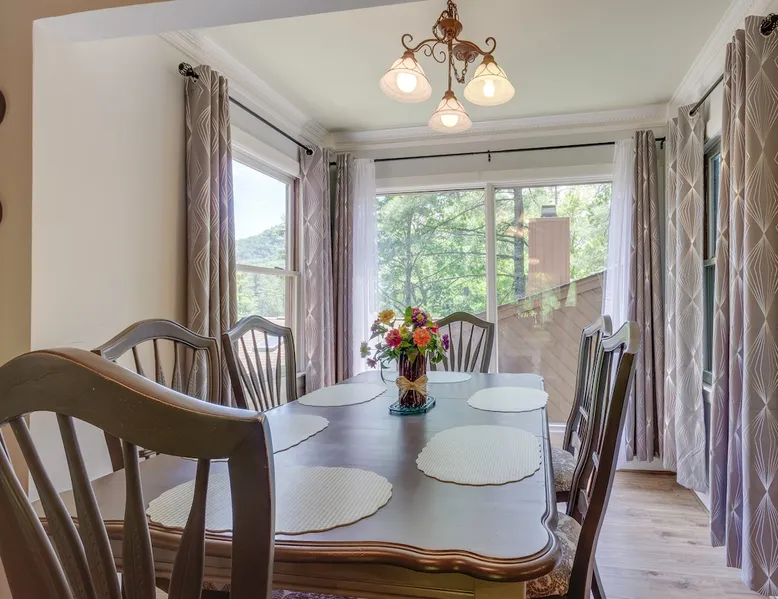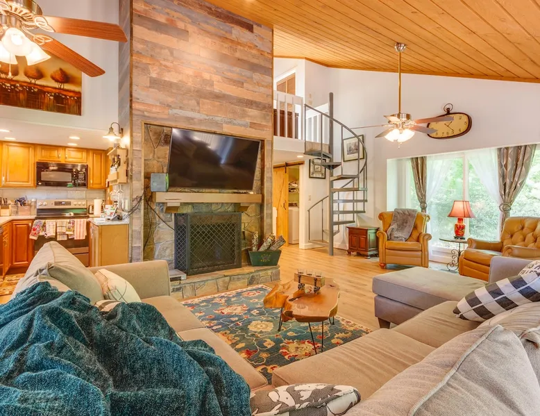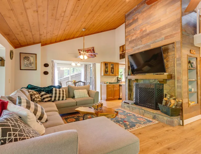 Mountain Villa #6 is located in a resort area, with great amenities like golf course, ski resort, club house with covered heated pool and playing area featuring arcades, pool table, and mini golf. The beach at the lake it’s just a short walk and you can enjoy the nature or kayak your way through the lake. We fell in love with this area when we spend our own vacations. We decided to buy a house not only for our enjoyment but also to give other people and their families the same opportunity. The space The house offers a big living room area with a wooden fire place, and a 65” tv, comfortable sectional and two recliner chairs. In this main floor you will also find a washer and dryer. The kitchen, fully renovated has everything it’s needed if you wish to cook, there is also a grill available for any grill lovers out there. Dining room is big and spacious for any big family to enjoy time gathered together. This home features a master bedroom that can accommodate a couple, downstairs bedroom with a queen size and a bunk bed that can accommodate a family of 4. This room features also a beautiful spa bath tub, shower and separate bathroom/powder room. There is also a stackable washer and dryer for your washing needs in one of the closets. The 3rd floor is a loft area where it can accommodate three adults or four children, A half bathroom. You can also find a lot of games so that your little ones can spend time playing and bonding with their siblings or their cousins. Every bedroom features a TV that you can enjoy in the evenings. you can enjoy a cup of coffee/tea/wine in the porch overlooking the golf course and the mountains that offer a beautiful and magnificent view no matter what season.