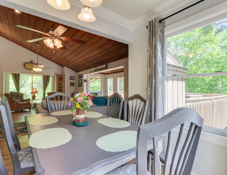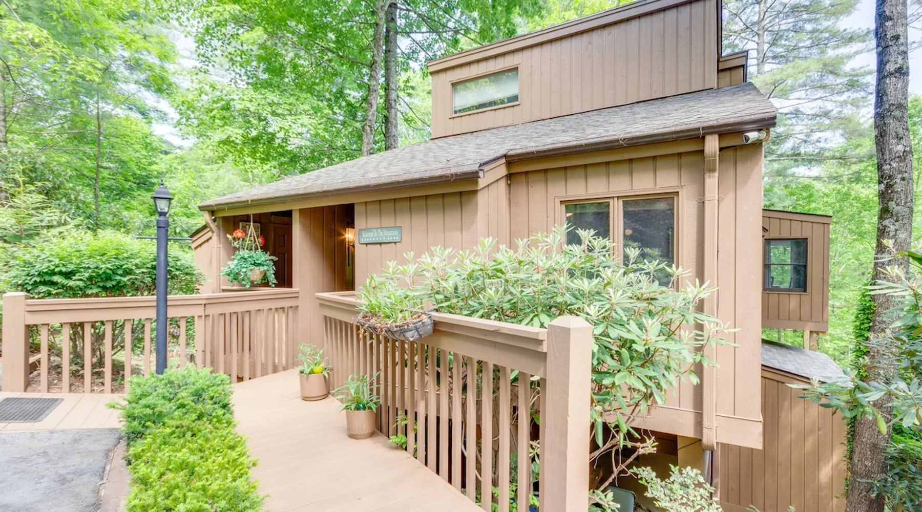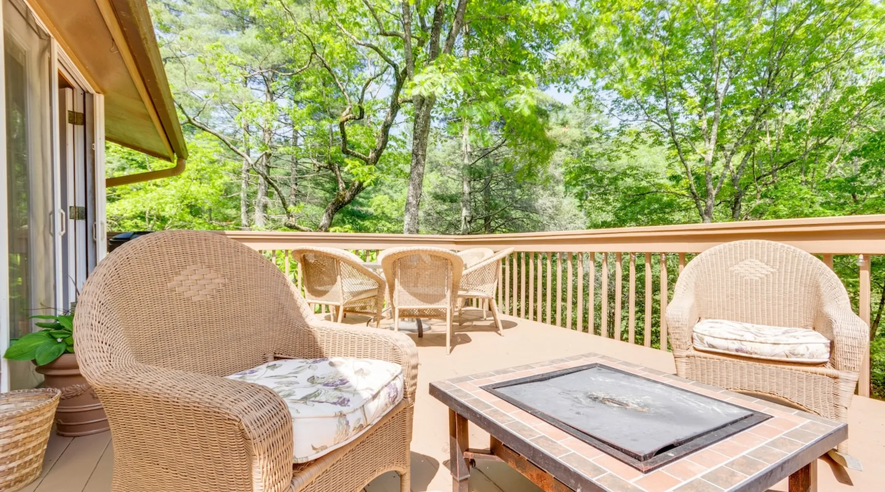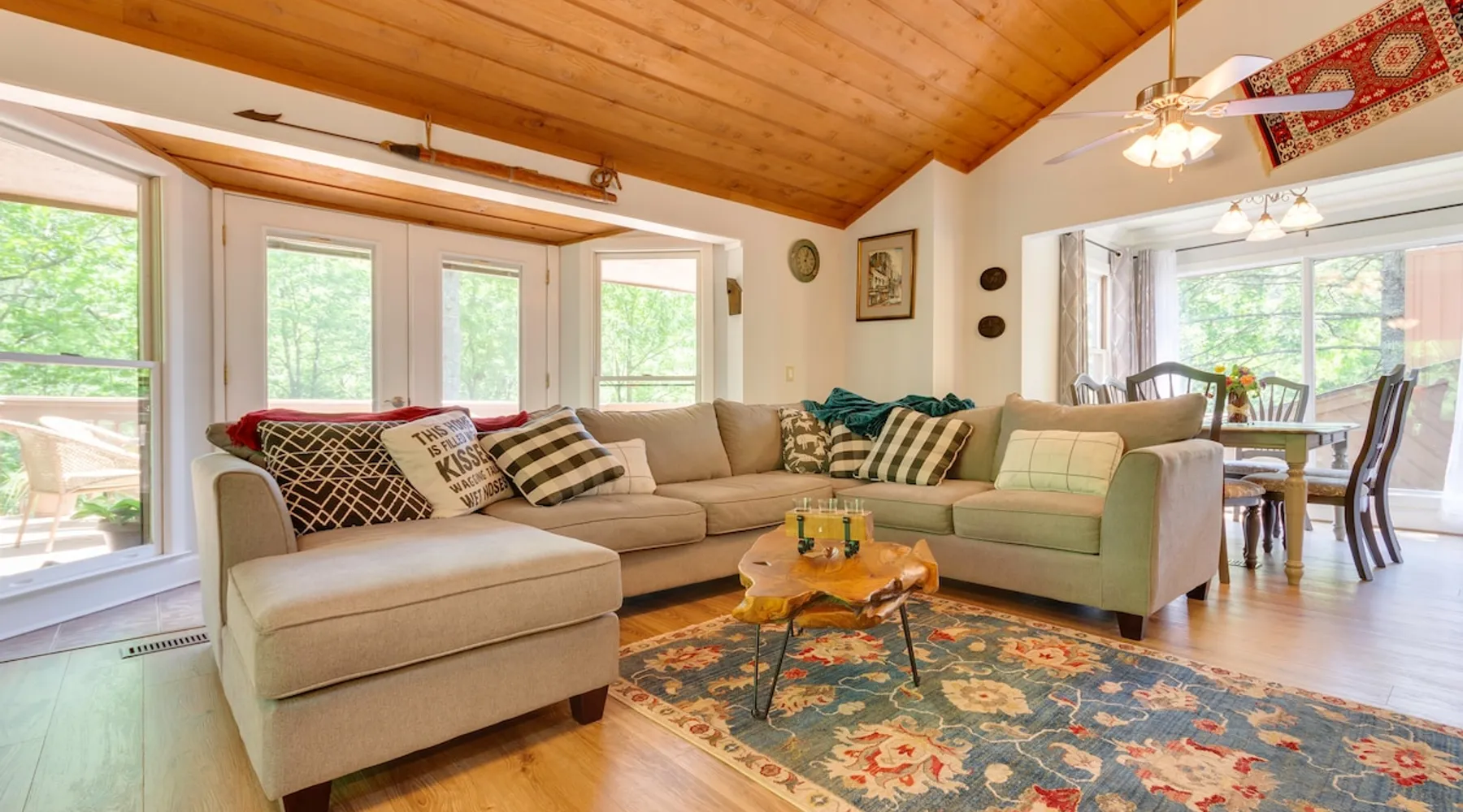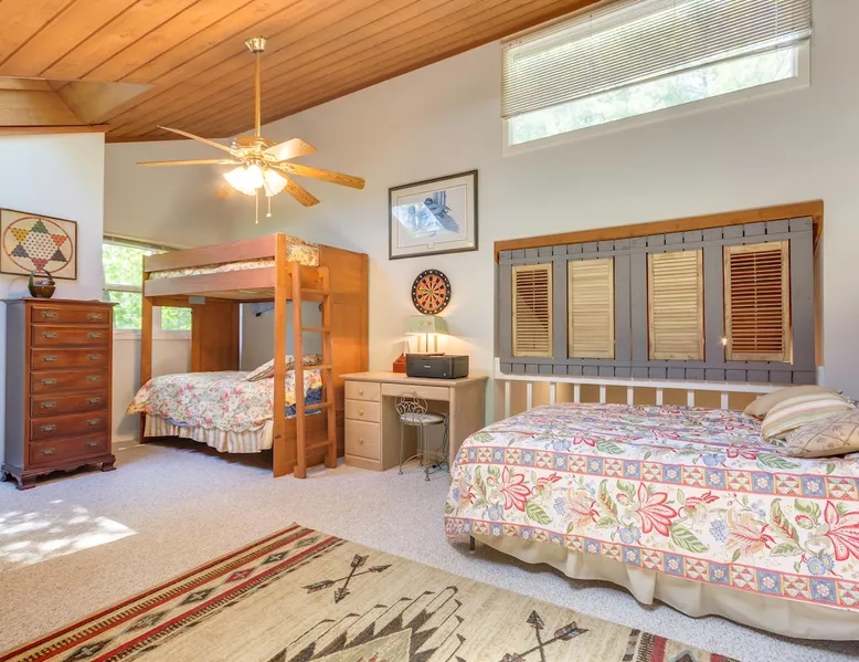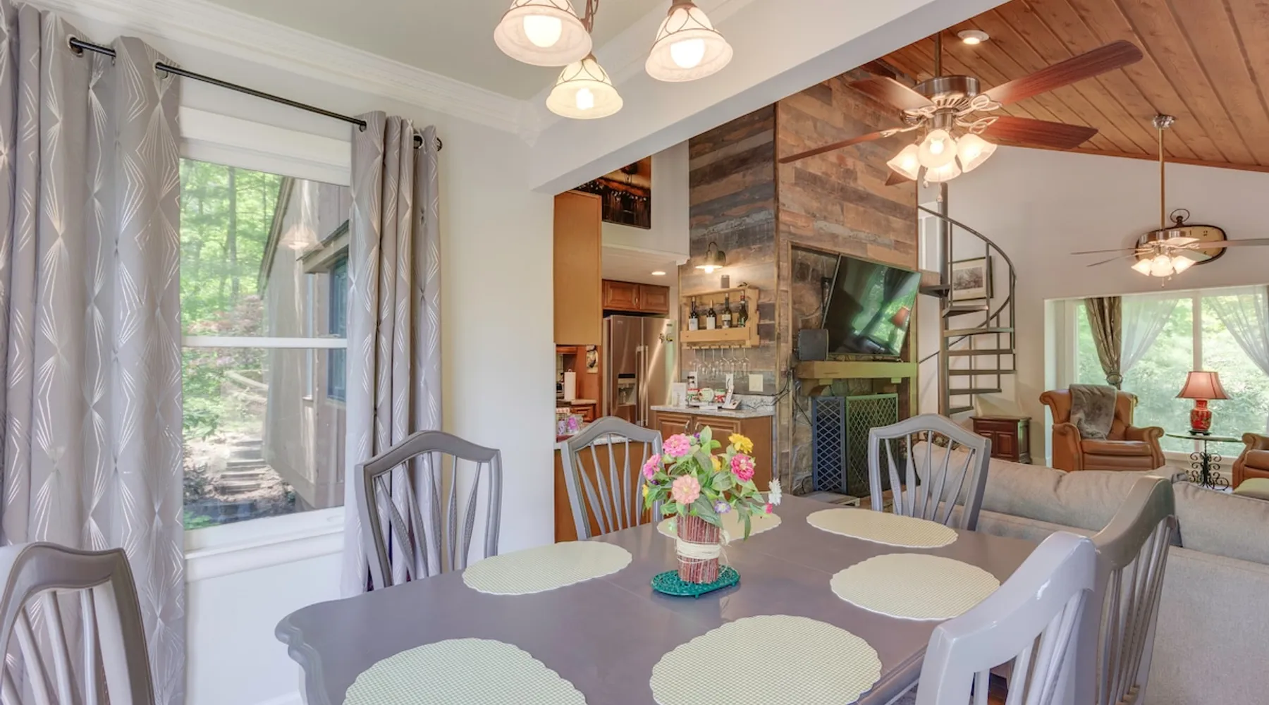 Mountain Villa #6 is located in a resort area, with great amenities like golf course, ski resort, club house with covered heated pool and playing area featuring arcades, pool table, and mini golf. The beach at the lake it’s just a short walk and you can enjoy the nature or kayak your way through the lake. We fell in love with this area when we spend our own vacations. We decided to buy a house not only for our enjoyment but also to give other people and their families the same opportunity. The space The house offers a big living room area with a wooden fire place, and a 65” tv, comfortable sectional and two recliner chairs. In this main floor you will also find a washer and dryer. The kitchen, fully renovated has everything it’s needed if you wish to cook, there is also a grill available for any grill lovers out there. Dining room is big and spacious for any big family to enjoy time gathered together. This home features a master bedroom that can accommodate a couple, downstairs bedroom with a queen size and a bunk bed that can accommodate a family of 4. This room features also a beautiful spa bath tub, shower and separate bathroom/powder room. There is also a stackable washer and dryer for your washing needs in one of the closets. The 3rd floor is a loft area where it can accommodate three adults or four children, A half bathroom. You can also find a lot of games so that your little ones can spend time playing and bonding with their siblings or their cousins. Every bedroom features a TV that you can enjoy in the evenings. you can enjoy a cup of coffee/tea/wine in the porch overlooking the golf course and the mountains that offer a beautiful and magnificent view no matter what season.