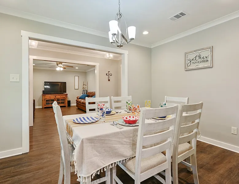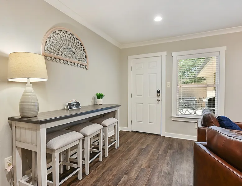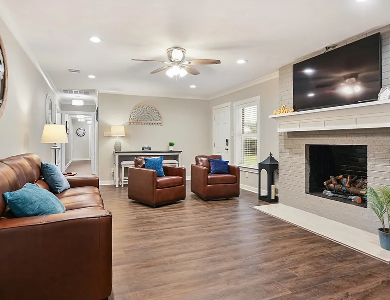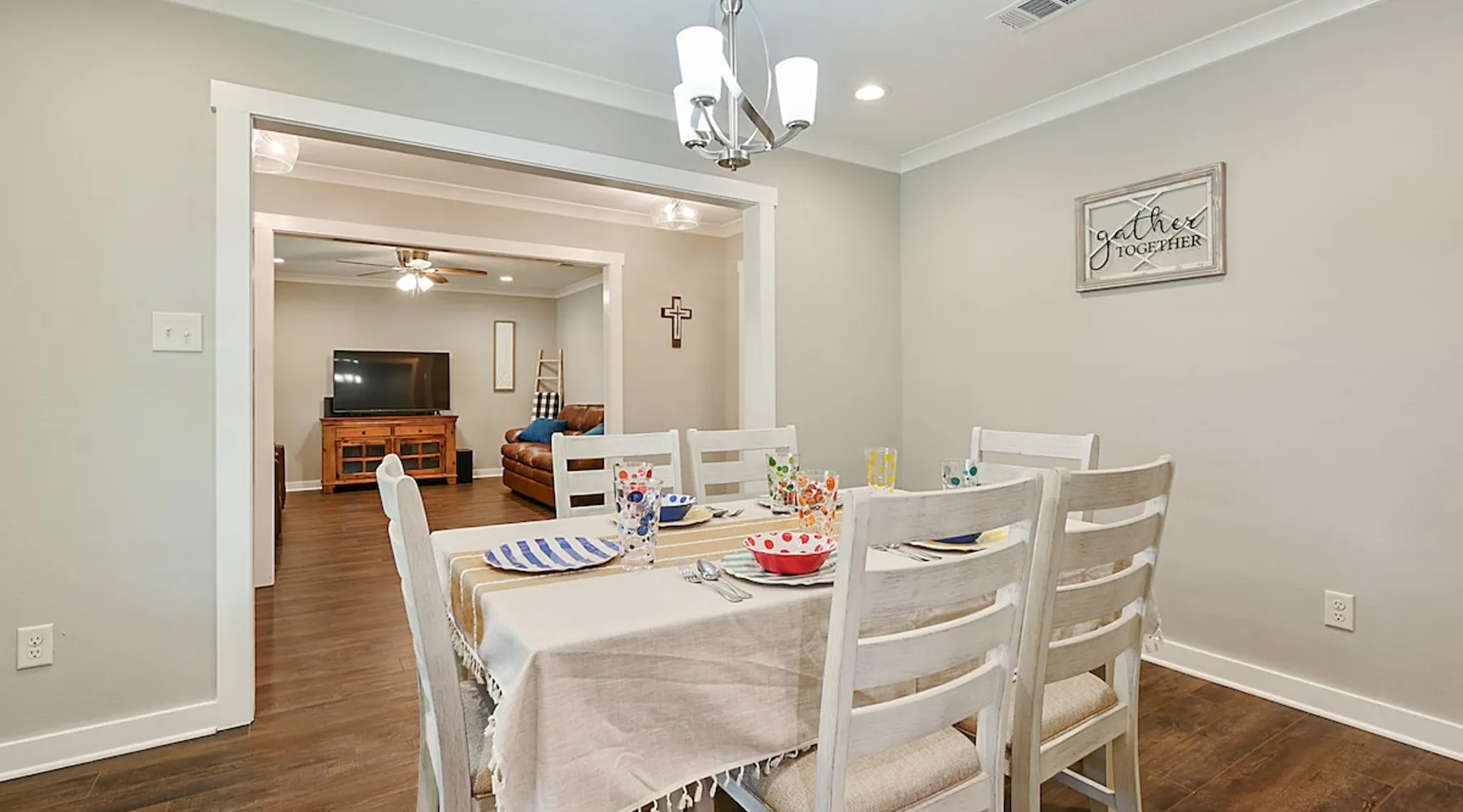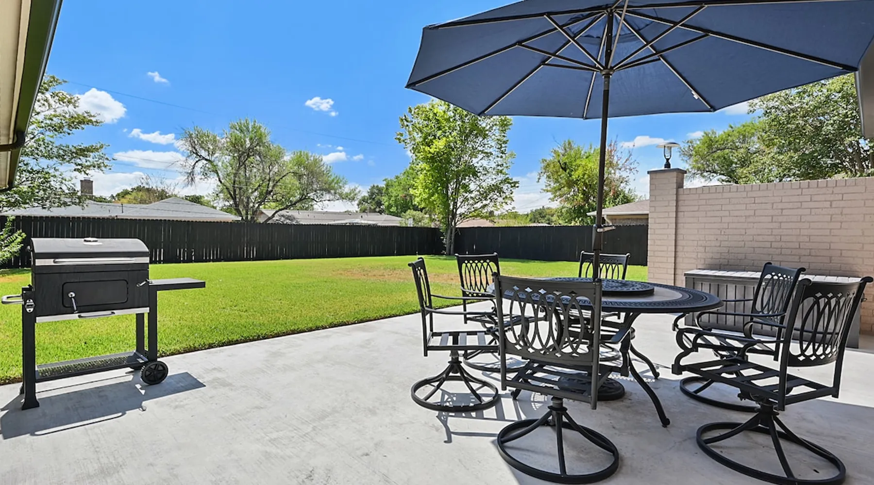 Welcome to Three Oaks Estate Your elegant Aggieland retreat — just 13–14 minutes from Kyle Field and the heart of Texas A&M University! Perfect for families, game-day gatherings, or extended getaways, this charming home combines comfort, style, and convenience. The space ✨ Why You’ll Love It Spacious & Inviting – Ranch-style floor plan with two living areas, plenty of seating, and smart TVs, perfect for game days, movie nights, or family fun. Chef’s Kitchen – Bright, airy kitchen with generous counter space, a coffee bar, and a serving buffet for effortless cooking and entertaining. Comfortable Bedrooms – Five thoughtfully designed bedrooms sleep up to 10 guests: Primary Bedroom: Queen bed, en-suite bathroom, walk-in closet Bedroom 2 & 3: Full beds Bedroom 4 & 5: Twin beds Hallway bathroom with full amenities for convenience Indoor & Outdoor Entertaining – Two dining spaces, including a formal dining area and breakfast nook. Step outside to the spacious, fenced-in backyard with a patio, charcoal grill, and plenty of room for kids and pets to play. 🌳 Outdoor Spaces Fenced backyard perfect for tailgating or relaxing Charcoal grill for outdoor meals Expansive patio shaded by three majestic live oaks 📍 Nearby Highlights Kyle Field & Texas A&M University: 13–14 minutes Downtown Bryan: Shops, restaurants, and local attractions Dining Nearby: Shipwreck Grill, The Station on 29th Street, Sweet Relish Parking – Large driveway, two-car garage, and ample street parking for 4–6 vehicles Guest access Keypad code Other things to note Aggieland Vacation Rentals requires guests to be a minimum of 25 years or older to sign the booking agreement and be responsible for all guests in the party. As a locally owned and operated company, your reservation is always safe, secure, and in good hands! The property may have one or more actively recording cameras overlooking the entrance, driveway, and backyard areas, which record audio and video. All devices are on the exterior. Full access to the entire house except the detached garage.