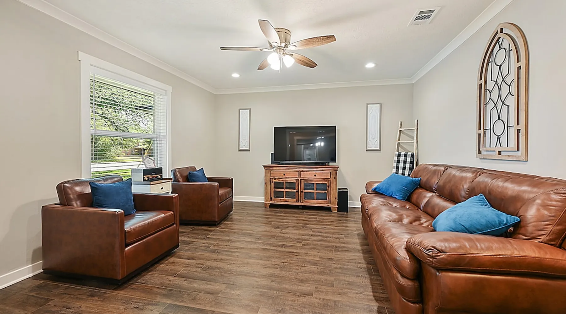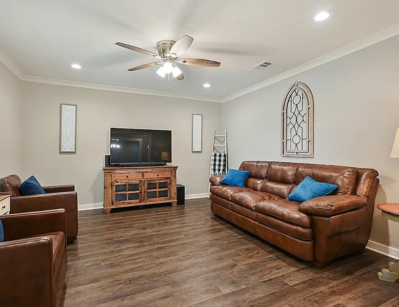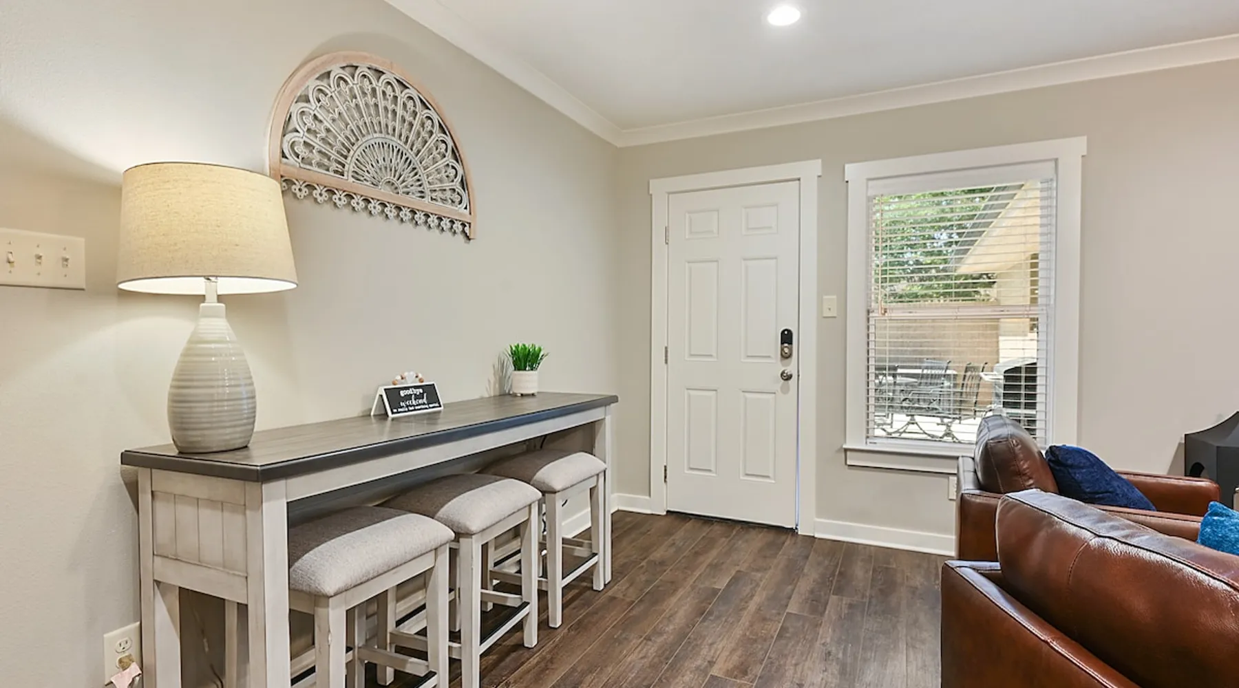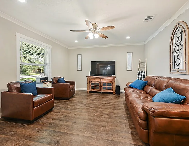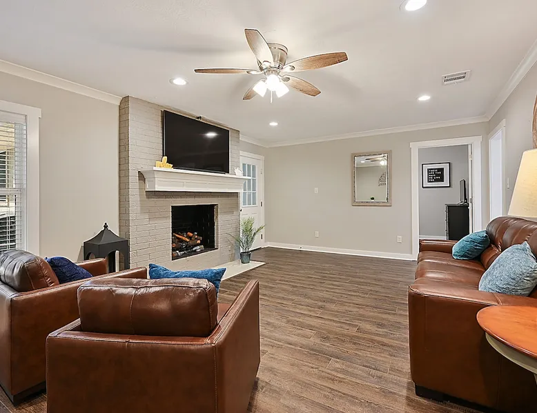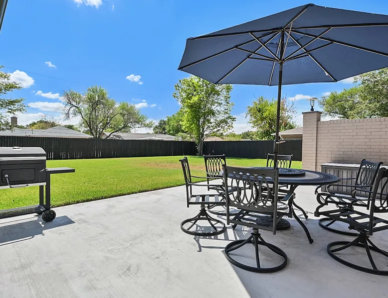 Welcome to Three Oaks Estate Your elegant Aggieland retreat — just 13–14 minutes from Kyle Field and the heart of Texas A&M University! Perfect for families, game-day gatherings, or extended getaways, this charming home combines comfort, style, and convenience. The space ✨ Why You’ll Love It Spacious & Inviting – Ranch-style floor plan with two living areas, plenty of seating, and smart TVs, perfect for game days, movie nights, or family fun. Chef’s Kitchen – Bright, airy kitchen with generous counter space, a coffee bar, and a serving buffet for effortless cooking and entertaining. Comfortable Bedrooms – Five thoughtfully designed bedrooms sleep up to 10 guests: Primary Bedroom: Queen bed, en-suite bathroom, walk-in closet Bedroom 2 & 3: Full beds Bedroom 4 & 5: Twin beds Hallway bathroom with full amenities for convenience Indoor & Outdoor Entertaining – Two dining spaces, including a formal dining area and breakfast nook. Step outside to the spacious, fenced-in backyard with a patio, charcoal grill, and plenty of room for kids and pets to play. 🌳 Outdoor Spaces Fenced backyard perfect for tailgating or relaxing Charcoal grill for outdoor meals Expansive patio shaded by three majestic live oaks 📍 Nearby Highlights Kyle Field & Texas A&M University: 13–14 minutes Downtown Bryan: Shops, restaurants, and local attractions Dining Nearby: Shipwreck Grill, The Station on 29th Street, Sweet Relish Parking – Large driveway, two-car garage, and ample street parking for 4–6 vehicles Guest access Keypad code Other things to note Aggieland Vacation Rentals requires guests to be a minimum of 25 years or older to sign the booking agreement and be responsible for all guests in the party. As a locally owned and operated company, your reservation is always safe, secure, and in good hands! The property may have one or more actively recording cameras overlooking the entrance, driveway, and backyard areas, which record audio and video. All devices are on the exterior. Full access to the entire house except the detached garage.