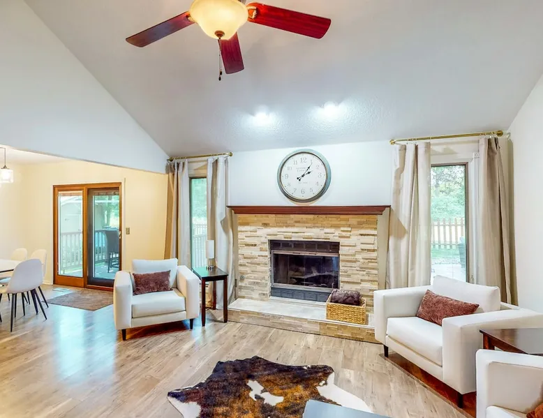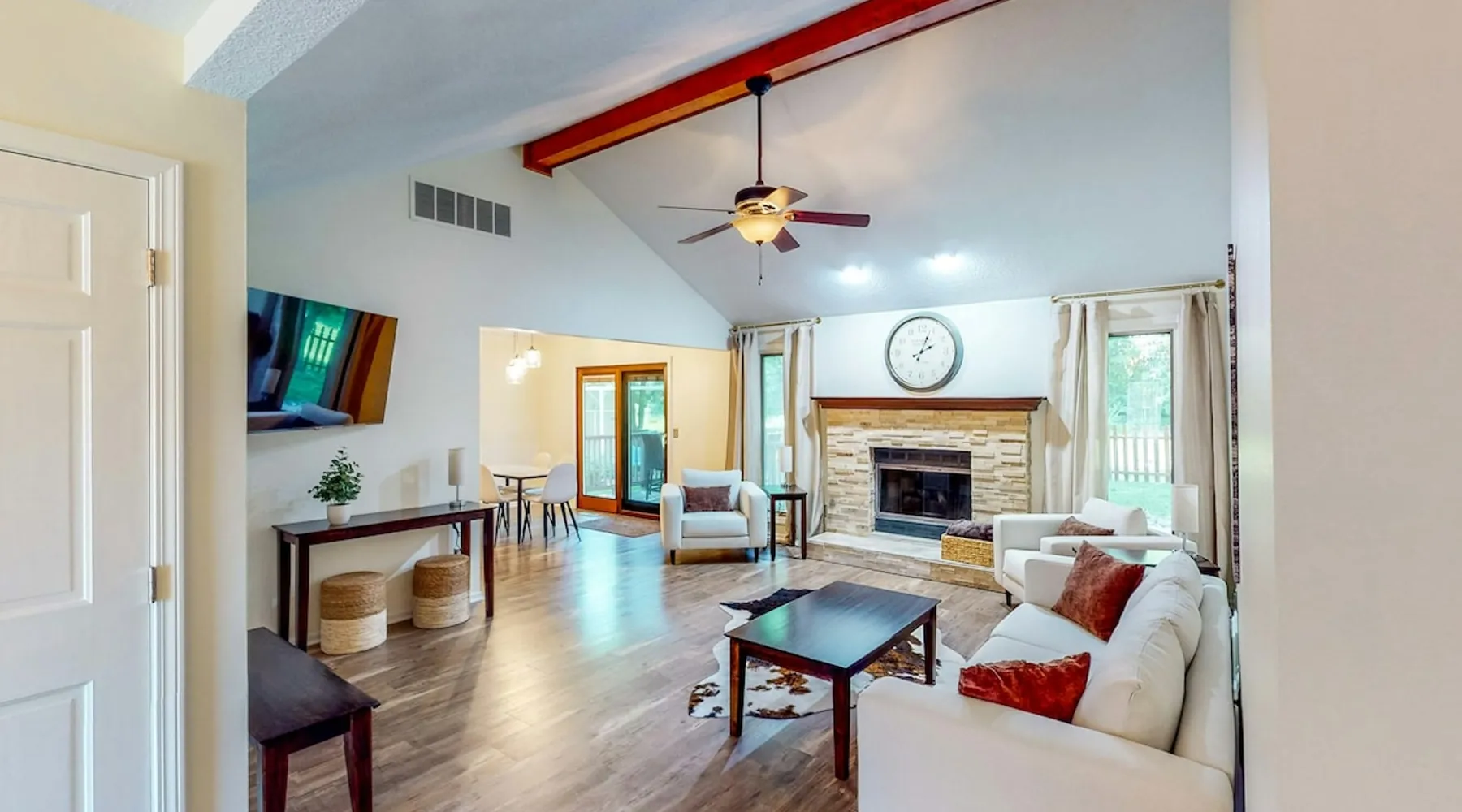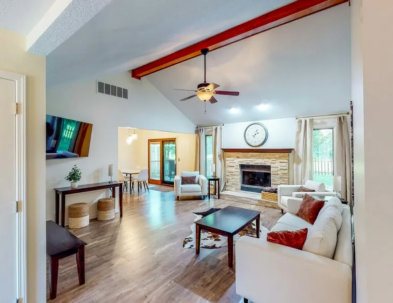 The space Calera Court A tranquil getaway awaits when you book this fantastic vacation rental in Fort Wayne's northern suburbs. It is within quick driving distance of the Parkview and Lutheran hospitals, Spiece Fitness, Memorial Coliseum, and downtown Fort Wayne. With a beautiful yard for yard games, a firepit for stargazing, and a wooden swing for kids, you'll surely have a memorable time at this property. Upon entry, you'll be met with a bright interior and a cozy atmosphere throughout the well-appointed living area. Relax and make yourself at home by resting on the plush furniture, indulging in a favorite movie on the large TV, or curling up with a good book in front of the fireplace. Prepare grand meals and picnic snacks in the sophisticated kitchen, equipped with stainless steel appliances, a breakfast bar, and a formal dining table. Comfortable beds in spacious bedrooms ensure everyone receives a wonderful night's rest from the day's adventures. Things to Know Please note that from November through March, the patio and grill are not for use. 250 lbs max for the bunk beds. This Vacasa Guestworks vacation rental is operated and managed locally by an independent host. Prior to your arrival, you will receive local host contact information, who will manage your guest reservation. Your local host will provide in-stay support, secure entry, and arrange pre- and post-stay housekeeping services. If you need anything during your stay, the home’s independent local host is ready to help 24/7! Guestworks is a service offering of Vacasa that allows homeowners to smoothly and efficiently manage their own properties. 2 dog(s) are welcome in this home. No other animals are allowed without specific Vacasa approval. Parking notes: There is free parking available for 3 vehicles. Due to local laws or HOA requirements, guests must be at least 21 years of age to book. Guests under 21 must be accompanied by a parent or legal guardian for the duration of the reservation.