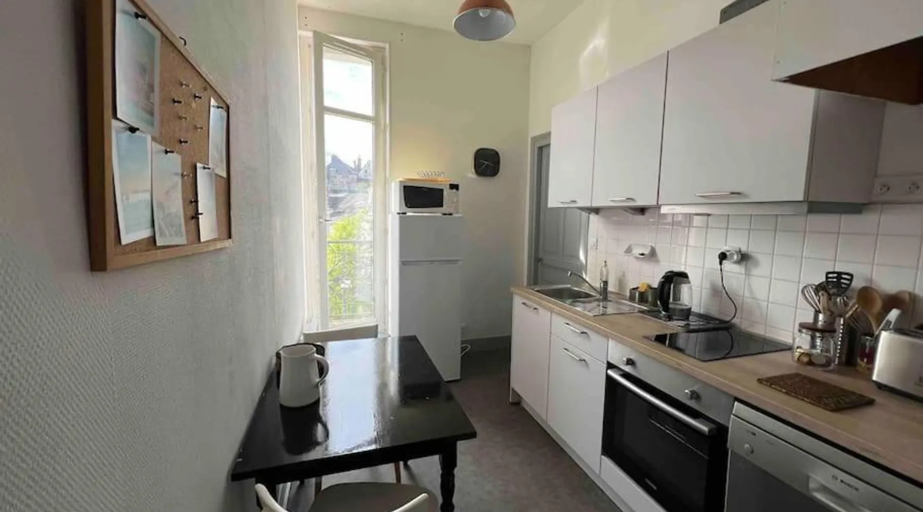 Comfortable Living Space: ~Rosa Bonheur~hyper center in Blois offers a one-bedroom apartment with a living room. The property includes a balcony, kitchen, dining area, and a sofa bed. Modern Amenities: Guests enjoy free WiFi, a tea and coffee maker, hairdryer, coffee machine, refrigerator, work desk, microwave, dishwasher, shower, TV, and dining area. Prime Location: Located 37 mi from Tours Val de Loire Airport, the apartment is a 4-minute walk from the Cathedral of St. Louis, 2297 feet from Blois Train Station, and a 5-minute walk to Blois Castle. Nearby attractions include Beauregard Castle (5 mi) and Château de Chambord (11 mi). Guest Favorites: Guests appreciate the convenient location and proximity to key points of interest. The well-fitted kitchen features a refrigerator, a dishwasher, an oven and a microwave. This apartment has a tea and coffee maker, a seating area, a flat-screen TV and a balcony. The unit offers 2 beds.