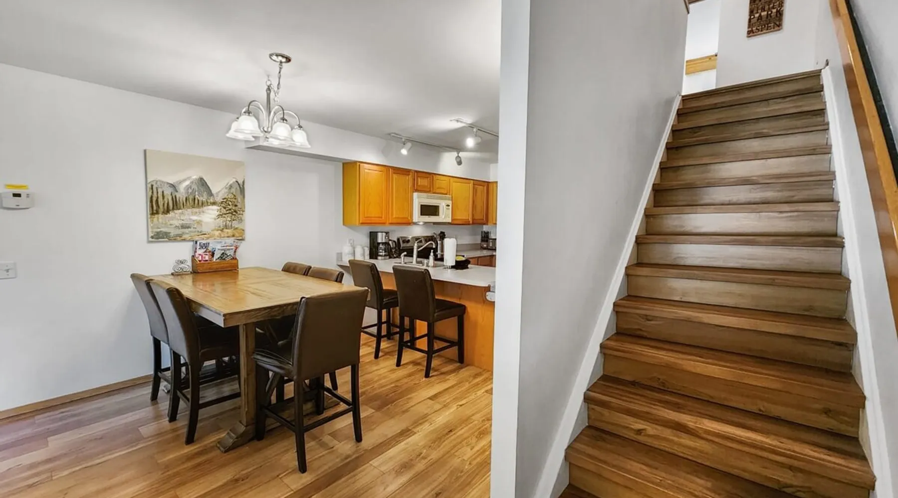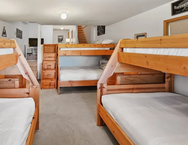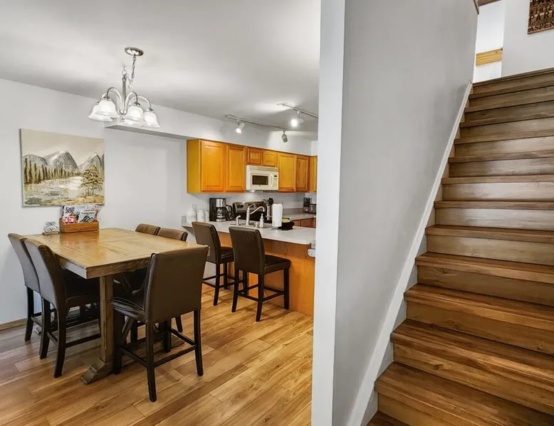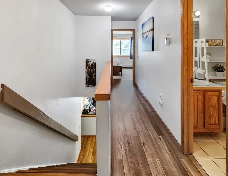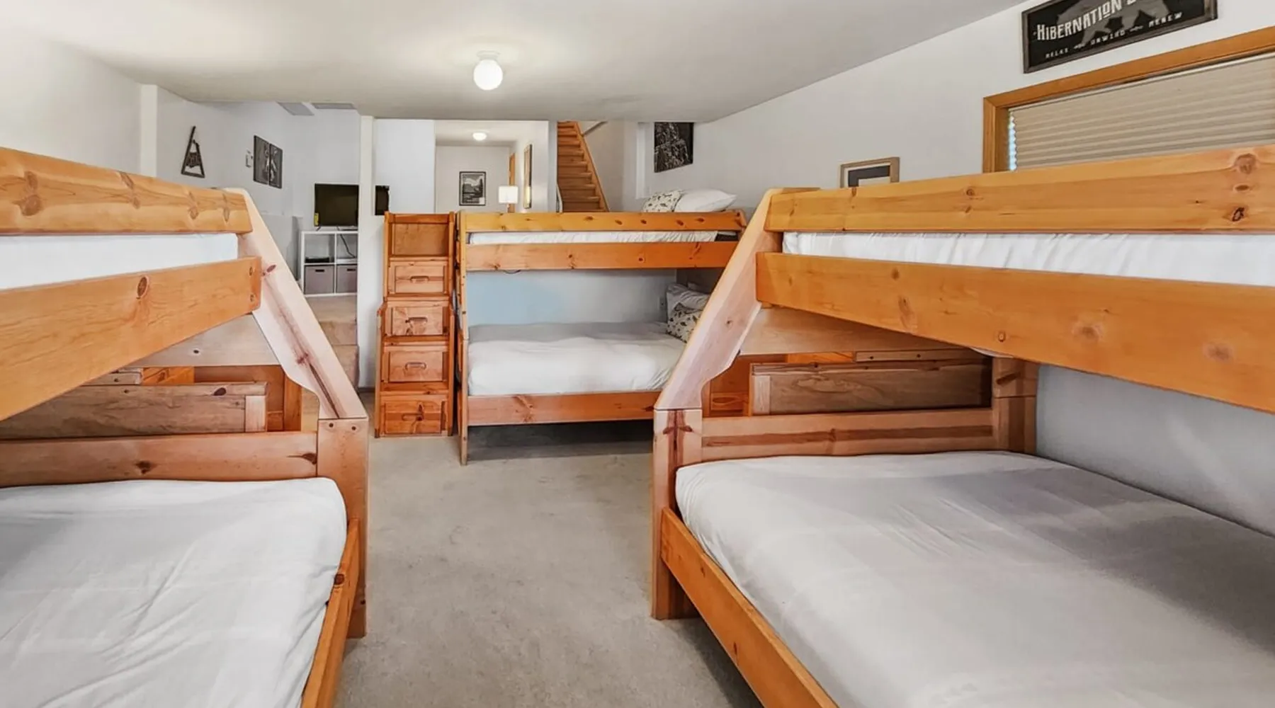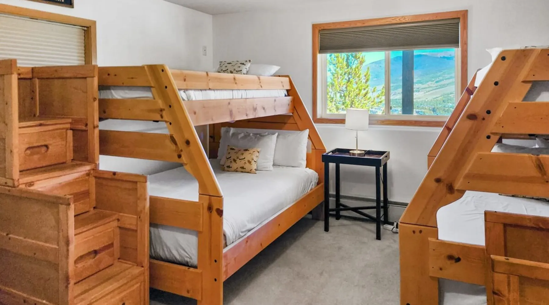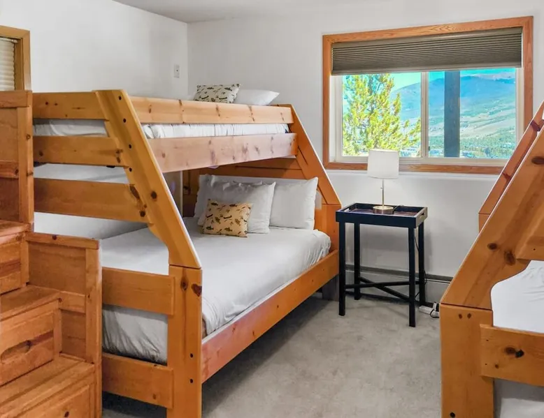 Looking to escape the city life for a mountain retreat? This home is for you! This family-friendly 4-bedroom townhome is the perfect launching pad for endless adventures, placing you near several hiking trails & minutes from a FREE bus stop connecting you to Breck & surrounding areas. After a busy day of adventures, relax & recharge in this inviting home where you will find comfortable bedrooms, an open layout perfect for groups, and a deck boasting impressive mountain views. The space This 4-bedroom, 2.5-bathroom, townhome is the perfect welcoming escape after a busy day on the mountain. With three levels of living space, the family-friendly home has enough space for up to 14 to spread out for a comfortable stay. Enjoy the peaceful surroundings from this home, which is an end unit with a private deck tucked next to the surrounding trees. You are going to love stepping out here and taking in the impressive mountain views! When you arrive at the home, you will be greeted by an entryway that includes coat hooks for storing your outdoor gear, a half-bathroom, and access to the attached garage. The entryway opens up to the main living space, where you will find an open kitchen/dining room/living room, providing an ideal space to stay connected with your group. You will first come to the fully equipped kitchen, where you will find everything you need to prepare delicious meals. The kitchen includes stainless steel appliances, a full range of basic cookware, and a kitchen bar with two bar stools providing a cozy place to grab a snack or keep the chef company. On the other side of the kitchen bar is the dining room, where you will find a large table with seating for 10. The flow of this space makes it easy to bring hot dishes to the table for family-style meals with your loved ones! A sunken living room is situated just a few steps down from the dining area, this bright space is the perfect hang-out spot for your group! Two large windows and French doors fill the space with natural light and beautiful views over the surrounding trees and mountains. In the living room, you will find a large couch, a love seat, and a corner table with bench seating providing plenty of seating accommodations for your group. Curl up around the gas fireplace and watch a movie on the 65” Smart TV, or just enjoy taking in the views from this room. A dynamic space ideal for entertaining and relaxing! From the living room, you can step out to the deck where you will find a BBQ and two patio chairs, so you can sit back and enjoy the great views of Ptarmigan Mountain and Silverthorne. When you are ready to settle in for the night, you will find three of the four bedrooms located on the upper level of the townhome. Tuck in for a good night’s rest in the first bedroom where you will find a charming space with an exposed wood beam, two large windows overlooking the trees, matching nightstands, and a queen-size bed. Adjacent to the first bedroom is a second bedroom, which also includes a queen-size bed. Down the hall from the first two bedrooms is a full bathroom for shared use and features a single-sink vanity with under-the-sink storage space and a bathtub/shower combo. Rounding out the upper floor is a master suite tucked away at the end of the hallway, providing a private and quiet space for you to get a good night’s rest. This well-decorated room features a comfortable king-size bed with matching nightstands and lamps, 2 standard-size closets, and an ensuite bathroom with a bathtub/shower combo. Brightening up the room is a large north-facing window that boasts beautiful views over Ptarmigan mountain and Silverthorne that you can enjoy right from bed! On the basement level of the home, you will find an open and dynamic fourth bedroom. The room covers the basement level in an open layout and includes a workspace with a desk and a chair and a cozy play area with a Smart TV and board games, kid books, and puzzles. This room is perfect for sharing or for the young travelers in your group! The room boasts ample sleeping space with THREE twin-over-queen bunk beds! Each bunk bed includes drawers for storage space, and the bedroom enjoys views of Ptarmigan Mountain and Silverthorne. A utility room is also located in the basement, in which you will find a washer and dryer, so you can easily keep up with any laundry needs during your stay. STR License number: STR21-01759 Guest access Guests will have access to the entire townhome including a private back deck. Guests will also have access to 4 parking places, there is 1 parking place in the attached garage suitable for a small SUV or car, 1 parking place in front of the garage, and 2 parking places in a shared parking lot located across the street from the home. Other things to note Please note that, like most homes in Breckenridge, this home does not have A/C. Please keep in mind that if you plan to ski, you are responsible for verifying the ski resorts' opening and closing dates. Registration number STR21-01759