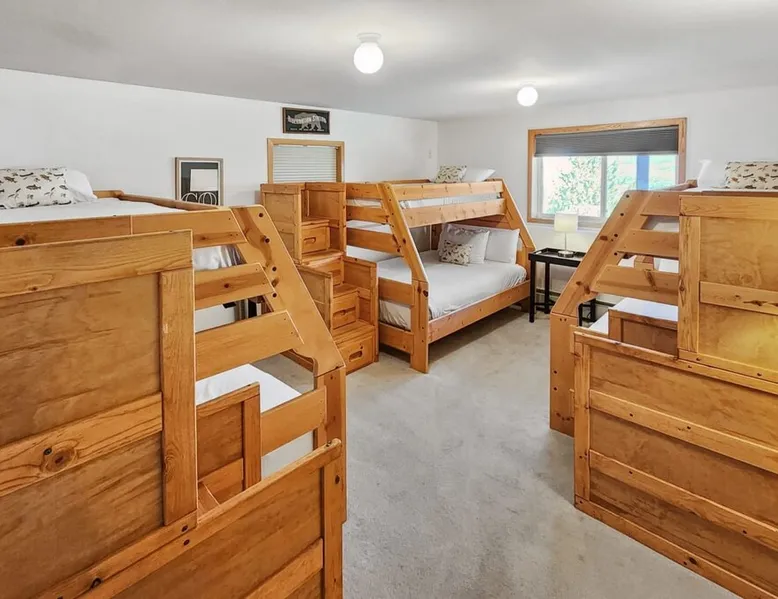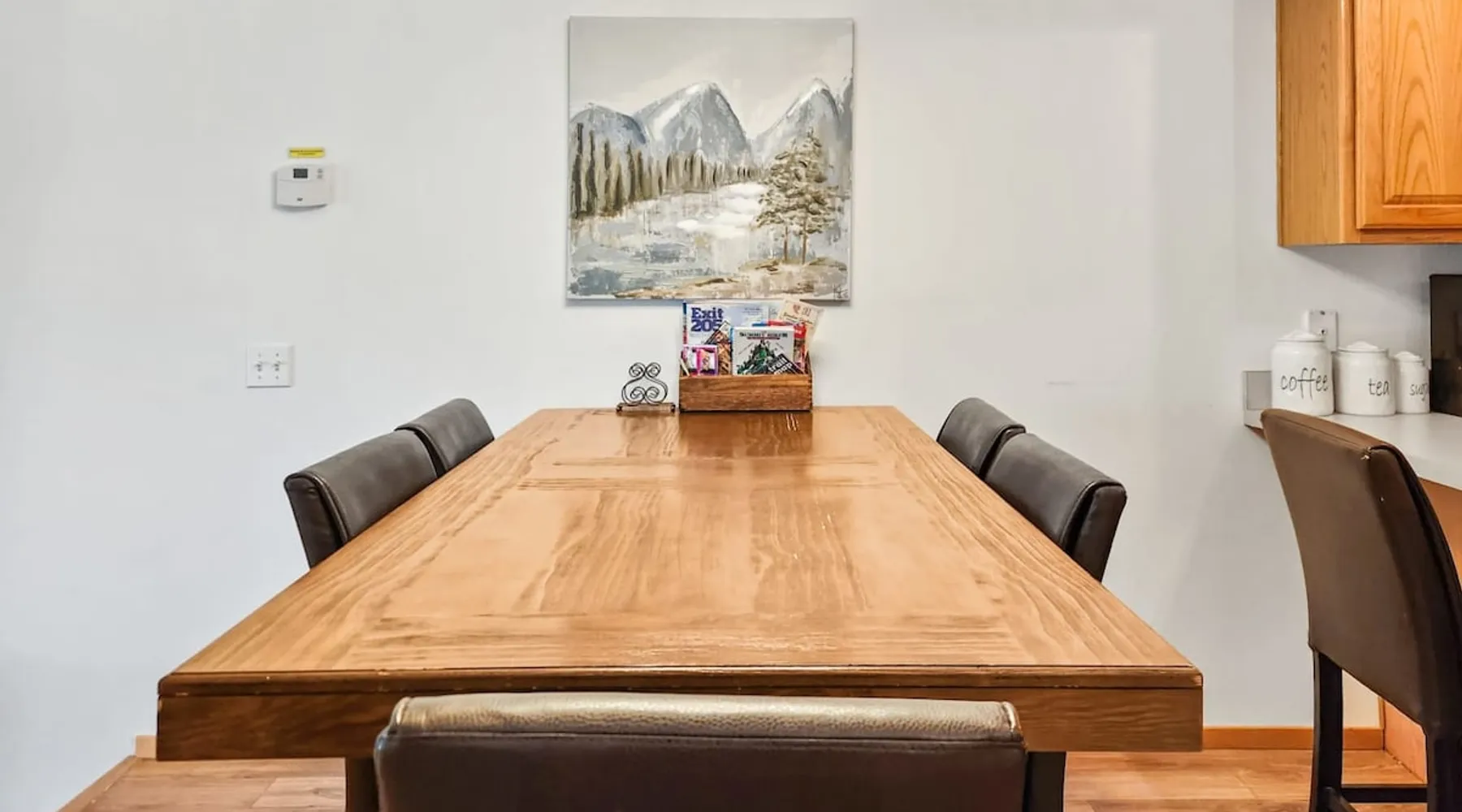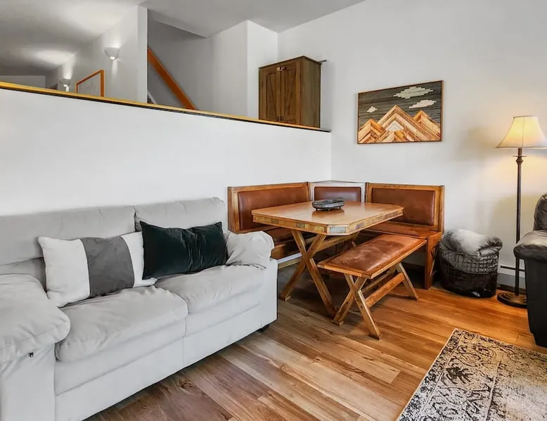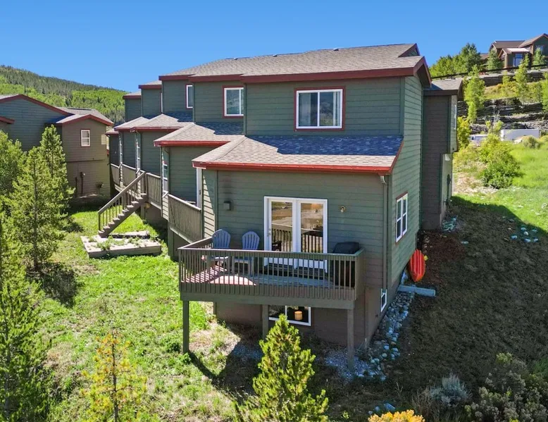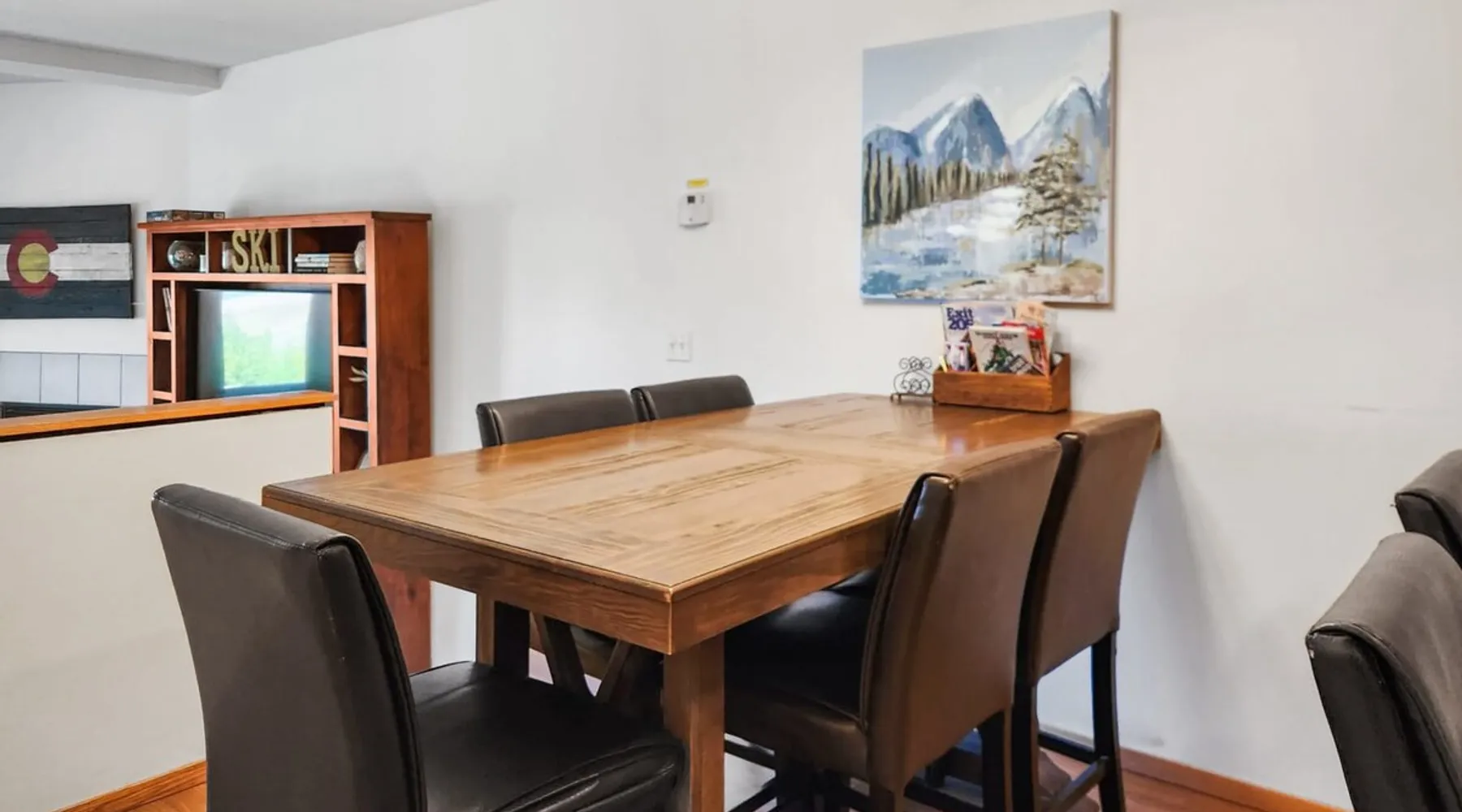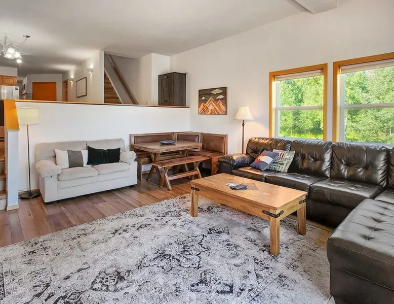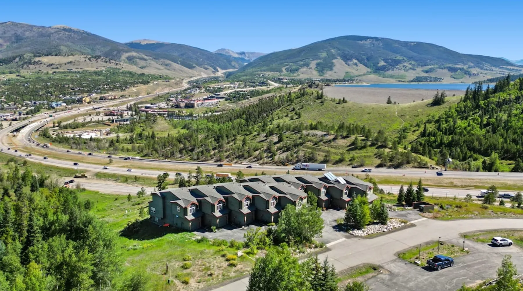 Looking to escape the city life for a mountain retreat? This home is for you! This family-friendly 4-bedroom townhome is the perfect launching pad for endless adventures, placing you near several hiking trails & minutes from a FREE bus stop connecting you to Breck & surrounding areas. After a busy day of adventures, relax & recharge in this inviting home where you will find comfortable bedrooms, an open layout perfect for groups, and a deck boasting impressive mountain views. The space This 4-bedroom, 2.5-bathroom, townhome is the perfect welcoming escape after a busy day on the mountain. With three levels of living space, the family-friendly home has enough space for up to 14 to spread out for a comfortable stay. Enjoy the peaceful surroundings from this home, which is an end unit with a private deck tucked next to the surrounding trees. You are going to love stepping out here and taking in the impressive mountain views! When you arrive at the home, you will be greeted by an entryway that includes coat hooks for storing your outdoor gear, a half-bathroom, and access to the attached garage. The entryway opens up to the main living space, where you will find an open kitchen/dining room/living room, providing an ideal space to stay connected with your group. You will first come to the fully equipped kitchen, where you will find everything you need to prepare delicious meals. The kitchen includes stainless steel appliances, a full range of basic cookware, and a kitchen bar with two bar stools providing a cozy place to grab a snack or keep the chef company. On the other side of the kitchen bar is the dining room, where you will find a large table with seating for 10. The flow of this space makes it easy to bring hot dishes to the table for family-style meals with your loved ones! A sunken living room is situated just a few steps down from the dining area, this bright space is the perfect hang-out spot for your group! Two large windows and French doors fill the space with natural light and beautiful views over the surrounding trees and mountains. In the living room, you will find a large couch, a love seat, and a corner table with bench seating providing plenty of seating accommodations for your group. Curl up around the gas fireplace and watch a movie on the 65” Smart TV, or just enjoy taking in the views from this room. A dynamic space ideal for entertaining and relaxing! From the living room, you can step out to the deck where you will find a BBQ and two patio chairs, so you can sit back and enjoy the great views of Ptarmigan Mountain and Silverthorne. When you are ready to settle in for the night, you will find three of the four bedrooms located on the upper level of the townhome. Tuck in for a good night’s rest in the first bedroom where you will find a charming space with an exposed wood beam, two large windows overlooking the trees, matching nightstands, and a queen-size bed. Adjacent to the first bedroom is a second bedroom, which also includes a queen-size bed. Down the hall from the first two bedrooms is a full bathroom for shared use and features a single-sink vanity with under-the-sink storage space and a bathtub/shower combo. Rounding out the upper floor is a master suite tucked away at the end of the hallway, providing a private and quiet space for you to get a good night’s rest. This well-decorated room features a comfortable king-size bed with matching nightstands and lamps, 2 standard-size closets, and an ensuite bathroom with a bathtub/shower combo. Brightening up the room is a large north-facing window that boasts beautiful views over Ptarmigan mountain and Silverthorne that you can enjoy right from bed! On the basement level of the home, you will find an open and dynamic fourth bedroom. The room covers the basement level in an open layout and includes a workspace with a desk and a chair and a cozy play area with a Smart TV and board games, kid books, and puzzles. This room is perfect for sharing or for the young travelers in your group! The room boasts ample sleeping space with THREE twin-over-queen bunk beds! Each bunk bed includes drawers for storage space, and the bedroom enjoys views of Ptarmigan Mountain and Silverthorne. A utility room is also located in the basement, in which you will find a washer and dryer, so you can easily keep up with any laundry needs during your stay. STR License number: STR21-01759 Guest access Guests will have access to the entire townhome including a private back deck. Guests will also have access to 4 parking places, there is 1 parking place in the attached garage suitable for a small SUV or car, 1 parking place in front of the garage, and 2 parking places in a shared parking lot located across the street from the home. Other things to note Please note that, like most homes in Breckenridge, this home does not have A/C. Please keep in mind that if you plan to ski, you are responsible for verifying the ski resorts' opening and closing dates. Registration number STR21-01759