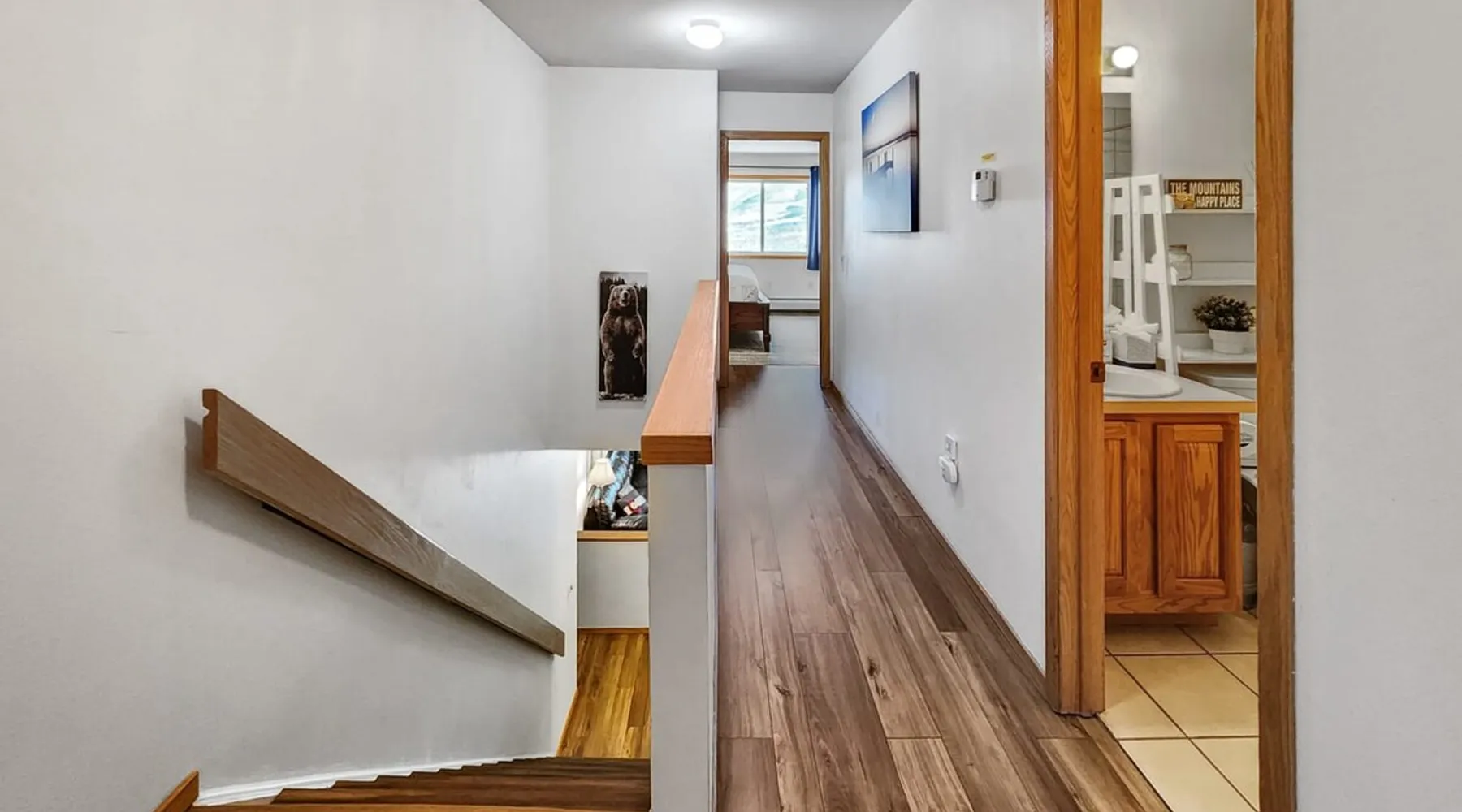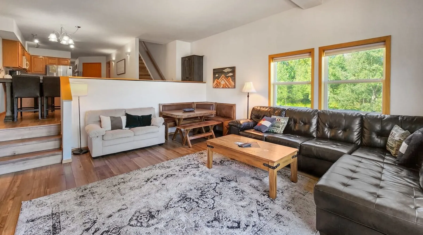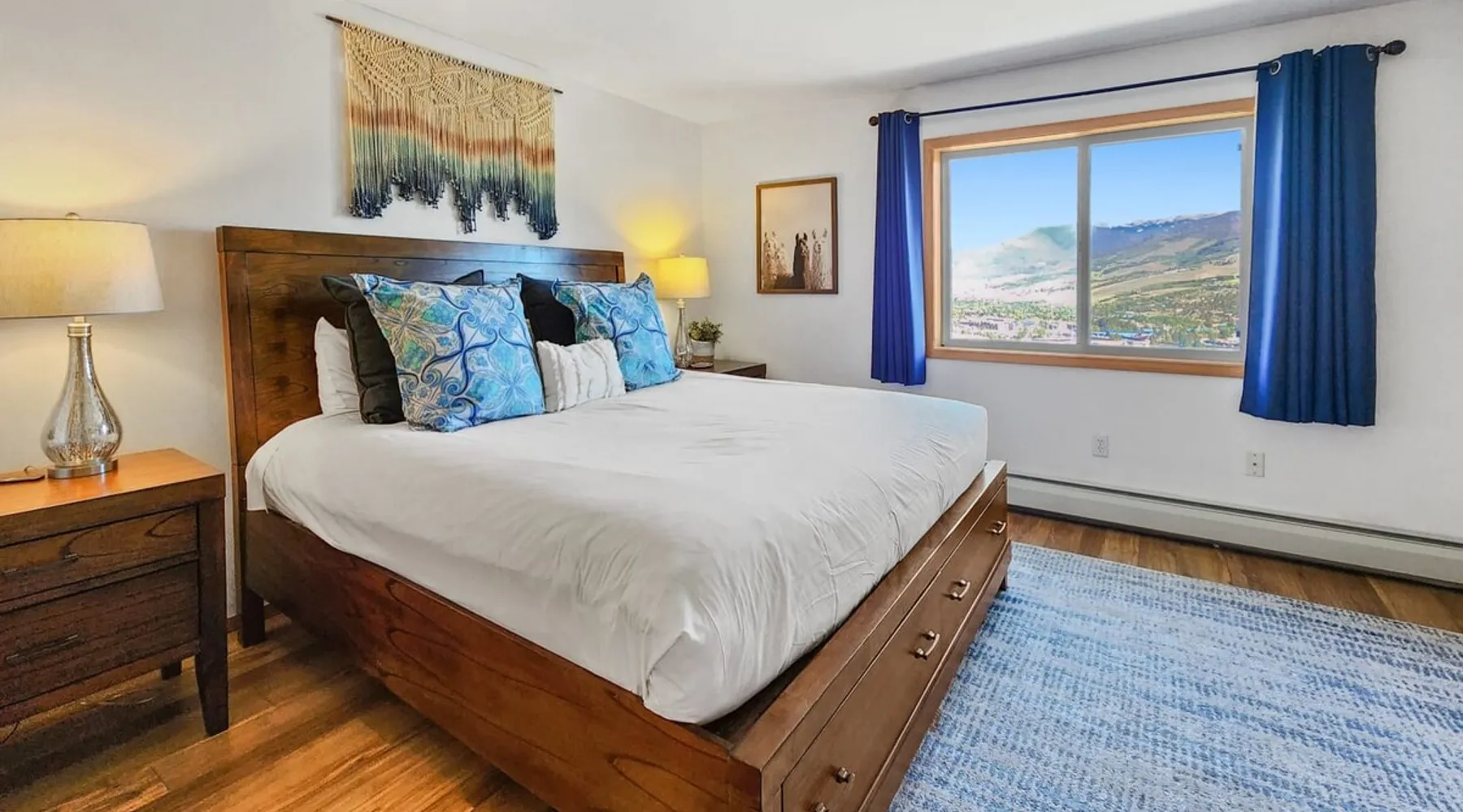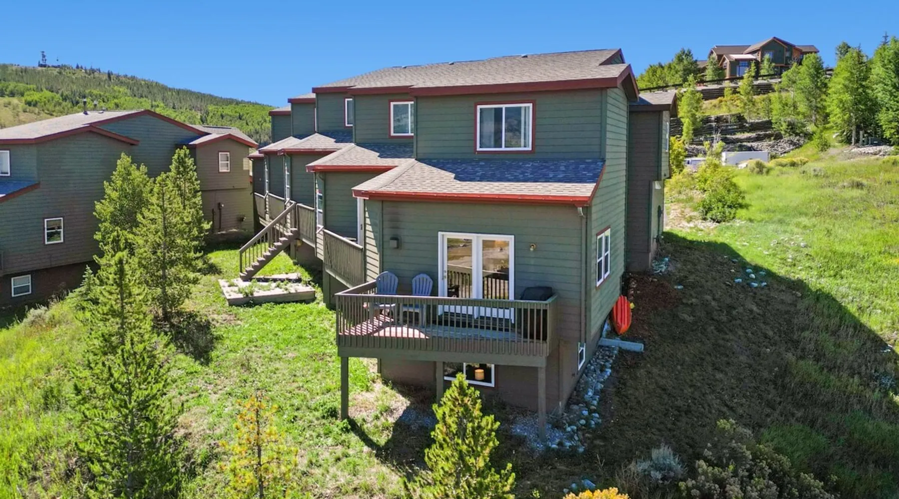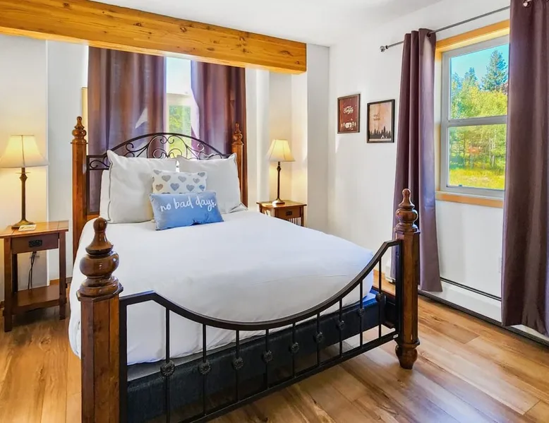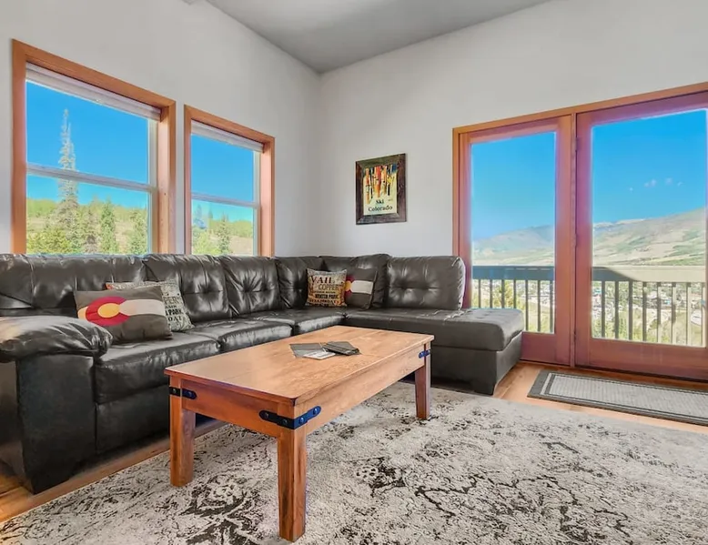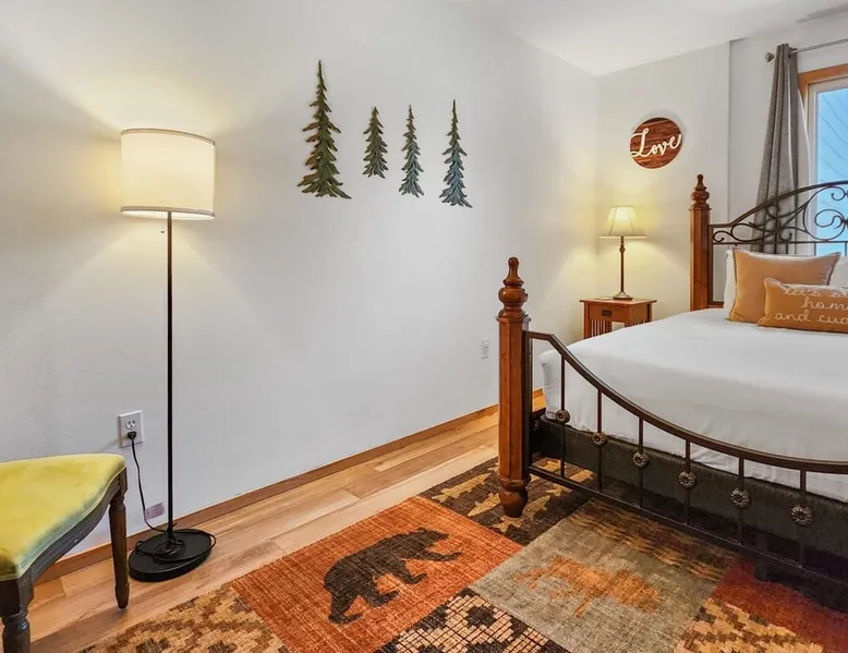 Looking to escape the city life for a mountain retreat? This home is for you! This family-friendly 4-bedroom townhome is the perfect launching pad for endless adventures, placing you near several hiking trails & minutes from a FREE bus stop connecting you to Breck & surrounding areas. After a busy day of adventures, relax & recharge in this inviting home where you will find comfortable bedrooms, an open layout perfect for groups, and a deck boasting impressive mountain views. The space This 4-bedroom, 2.5-bathroom, townhome is the perfect welcoming escape after a busy day on the mountain. With three levels of living space, the family-friendly home has enough space for up to 14 to spread out for a comfortable stay. Enjoy the peaceful surroundings from this home, which is an end unit with a private deck tucked next to the surrounding trees. You are going to love stepping out here and taking in the impressive mountain views! When you arrive at the home, you will be greeted by an entryway that includes coat hooks for storing your outdoor gear, a half-bathroom, and access to the attached garage. The entryway opens up to the main living space, where you will find an open kitchen/dining room/living room, providing an ideal space to stay connected with your group. You will first come to the fully equipped kitchen, where you will find everything you need to prepare delicious meals. The kitchen includes stainless steel appliances, a full range of basic cookware, and a kitchen bar with two bar stools providing a cozy place to grab a snack or keep the chef company. On the other side of the kitchen bar is the dining room, where you will find a large table with seating for 10. The flow of this space makes it easy to bring hot dishes to the table for family-style meals with your loved ones! A sunken living room is situated just a few steps down from the dining area, this bright space is the perfect hang-out spot for your group! Two large windows and French doors fill the space with natural light and beautiful views over the surrounding trees and mountains. In the living room, you will find a large couch, a love seat, and a corner table with bench seating providing plenty of seating accommodations for your group. Curl up around the gas fireplace and watch a movie on the 65” Smart TV, or just enjoy taking in the views from this room. A dynamic space ideal for entertaining and relaxing! From the living room, you can step out to the deck where you will find a BBQ and two patio chairs, so you can sit back and enjoy the great views of Ptarmigan Mountain and Silverthorne. When you are ready to settle in for the night, you will find three of the four bedrooms located on the upper level of the townhome. Tuck in for a good night’s rest in the first bedroom where you will find a charming space with an exposed wood beam, two large windows overlooking the trees, matching nightstands, and a queen-size bed. Adjacent to the first bedroom is a second bedroom, which also includes a queen-size bed. Down the hall from the first two bedrooms is a full bathroom for shared use and features a single-sink vanity with under-the-sink storage space and a bathtub/shower combo. Rounding out the upper floor is a master suite tucked away at the end of the hallway, providing a private and quiet space for you to get a good night’s rest. This well-decorated room features a comfortable king-size bed with matching nightstands and lamps, 2 standard-size closets, and an ensuite bathroom with a bathtub/shower combo. Brightening up the room is a large north-facing window that boasts beautiful views over Ptarmigan mountain and Silverthorne that you can enjoy right from bed! On the basement level of the home, you will find an open and dynamic fourth bedroom. The room covers the basement level in an open layout and includes a workspace with a desk and a chair and a cozy play area with a Smart TV and board games, kid books, and puzzles. This room is perfect for sharing or for the young travelers in your group! The room boasts ample sleeping space with THREE twin-over-queen bunk beds! Each bunk bed includes drawers for storage space, and the bedroom enjoys views of Ptarmigan Mountain and Silverthorne. A utility room is also located in the basement, in which you will find a washer and dryer, so you can easily keep up with any laundry needs during your stay. STR License number: STR21-01759 Guest access Guests will have access to the entire townhome including a private back deck. Guests will also have access to 4 parking places, there is 1 parking place in the attached garage suitable for a small SUV or car, 1 parking place in front of the garage, and 2 parking places in a shared parking lot located across the street from the home. Other things to note Please note that, like most homes in Breckenridge, this home does not have A/C. Please keep in mind that if you plan to ski, you are responsible for verifying the ski resorts' opening and closing dates. Registration number STR21-01759