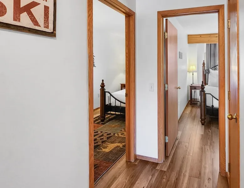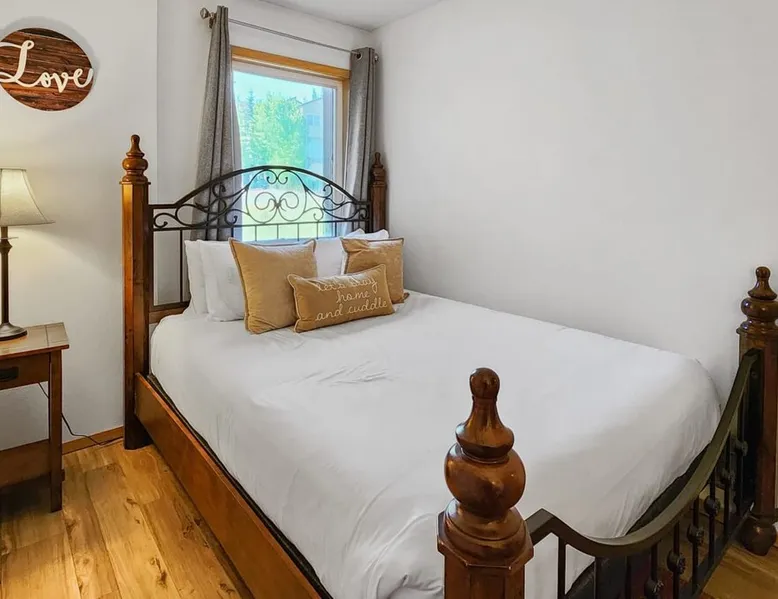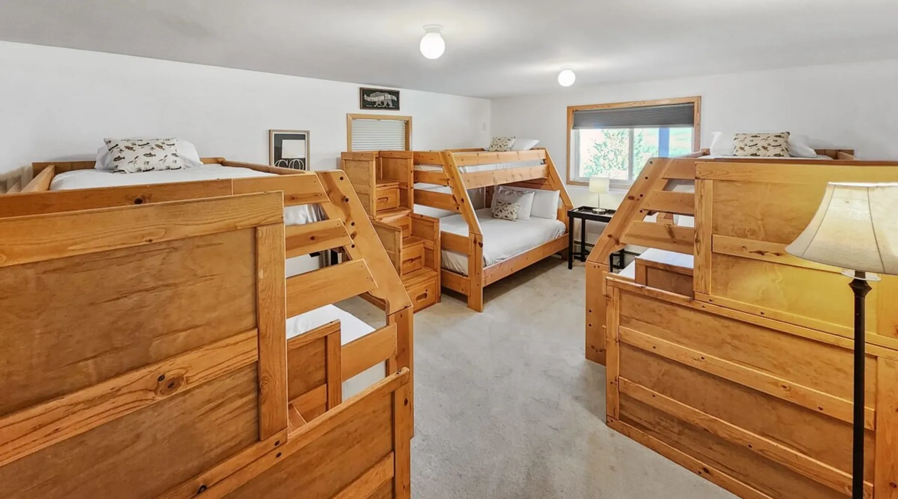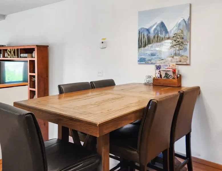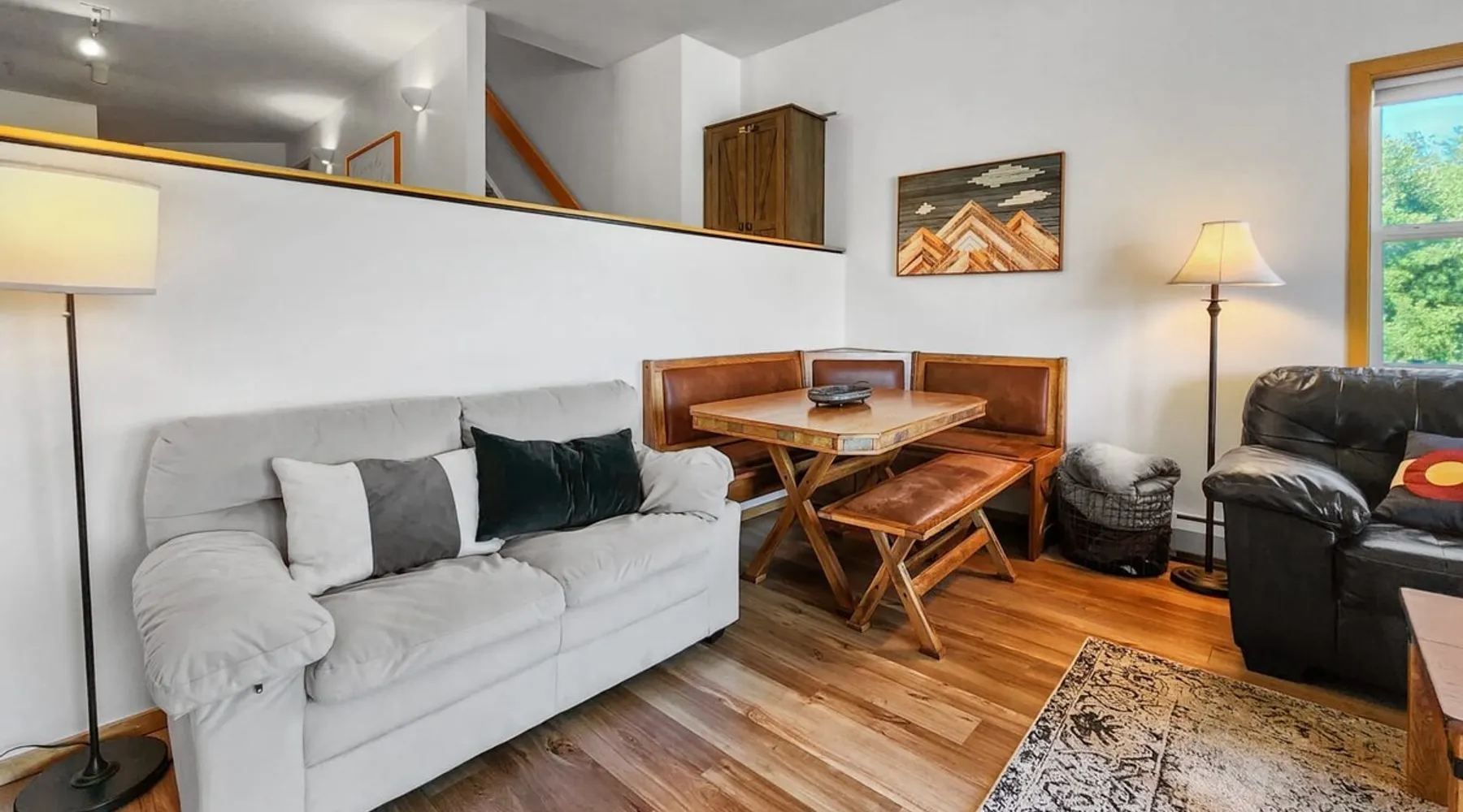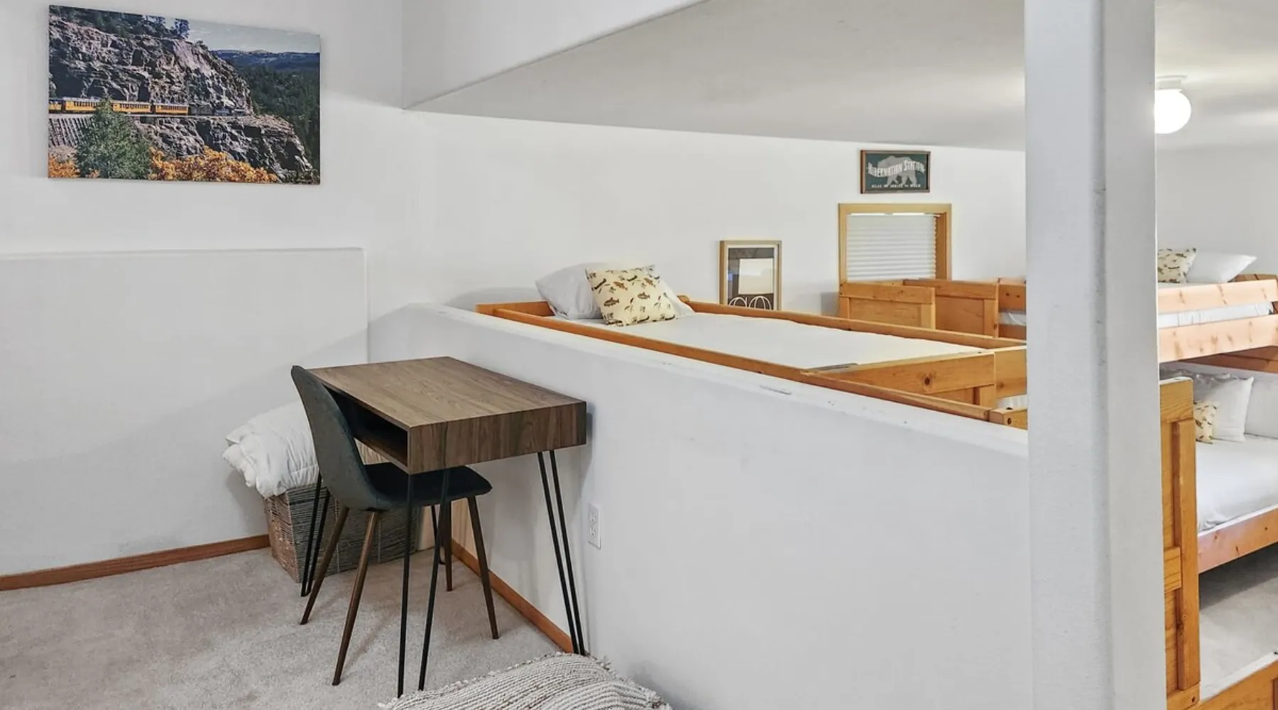Looking to escape the city life for a mountain retreat? This home is for you! This family-friendly 4-bedroom townhome is the perfect launching pad for endless adventures, placing you near several hiking trails & minutes from a FREE bus stop connecting you to Breck & surrounding areas. After a busy day of adventures, relax & recharge in this inviting home where you will find comfortable bedrooms, an open layout perfect for groups, and a deck boasting impressive mountain views. The space This 4-bedroom, 2.5-bathroom, townhome is the perfect welcoming escape after a busy day on the mountain. With three levels of living space, the family-friendly home has enough space for up to 14 to spread out for a comfortable stay. Enjoy the peaceful surroundings from this home, which is an end unit with a private deck tucked next to the surrounding trees. You are going to love stepping out here and taking in the impressive mountain views! When you arrive at the home, you will be greeted by an entryway that includes coat hooks for storing your outdoor gear, a half-bathroom, and access to the attached garage. The entryway opens up to the main living space, where you will find an open kitchen/dining room/living room, providing an ideal space to stay connected with your group. You will first come to the fully equipped kitchen, where you will find everything you need to prepare delicious meals. The kitchen includes stainless steel appliances, a full range of basic cookware, and a kitchen bar with two bar stools providing a cozy place to grab a snack or keep the chef company. On the other side of the kitchen bar is the dining room, where you will find a large table with seating for 10. The flow of this space makes it easy to bring hot dishes to the table for family-style meals with your loved ones! A sunken living room is situated just a few steps down from the dining area, this bright space is the perfect hang-out spot for your group! Two large windows and French doors fill the space with natural light and beautiful views over the surrounding trees and mountains. In the living room, you will find a large couch, a love seat, and a corner table with bench seating providing plenty of seating accommodations for your group. Curl up around the gas fireplace and watch a movie on the 65” Smart TV, or just enjoy taking in the views from this room. A dynamic space ideal for entertaining and relaxing! From the living room, you can step out to the deck where you will find a BBQ and two patio chairs, so you can sit back and enjoy the great views of Ptarmigan Mountain and Silverthorne. When you are ready to settle in for the night, you will find three of the four bedrooms located on the upper level of the townhome. Tuck in for a good night’s rest in the first bedroom where you will find a charming space with an exposed wood beam, two large windows overlooking the trees, matching nightstands, and a queen-size bed. Adjacent to the first bedroom is a second bedroom, which also includes a queen-size bed. Down the hall from the first two bedrooms is a full bathroom for shared use and features a single-sink vanity with under-the-sink storage space and a bathtub/shower combo. Rounding out the upper floor is a master suite tucked away at the end of the hallway, providing a private and quiet space for you to get a good night’s rest. This well-decorated room features a comfortable king-size bed with matching nightstands and lamps, 2 standard-size closets, and an ensuite bathroom with a bathtub/shower combo. Brightening up the room is a large north-facing window that boasts beautiful views over Ptarmigan mountain and Silverthorne that you can enjoy right from bed! On the basement level of the home, you will find an open and dynamic fourth bedroom. The room covers the basement level in an open layout and includes a workspace with a desk and a chair and a cozy play area with a Smart TV and board games, kid books, and puzzles. This room is perfect for sharing or for the young travelers in your group! The room boasts ample sleeping space with THREE twin-over-queen bunk beds! Each bunk bed includes drawers for storage space, and the bedroom enjoys views of Ptarmigan Mountain and Silverthorne. A utility room is also located in the basement, in which you will find a washer and dryer, so you can easily keep up with any laundry needs during your stay. STR License number: STR21-01759 Guest access Guests will have access to the entire townhome including a private back deck. Guests will also have access to 4 parking places, there is 1 parking place in the attached garage suitable for a small SUV or car, 1 parking place in front of the garage, and 2 parking places in a shared parking lot located across the street from the home. Other things to note Please note that, like most homes in Breckenridge, this home does not have A/C. Please keep in mind that if you plan to ski, you are responsible for verifying the ski resorts' opening and closing dates. Registration number STR21-01759