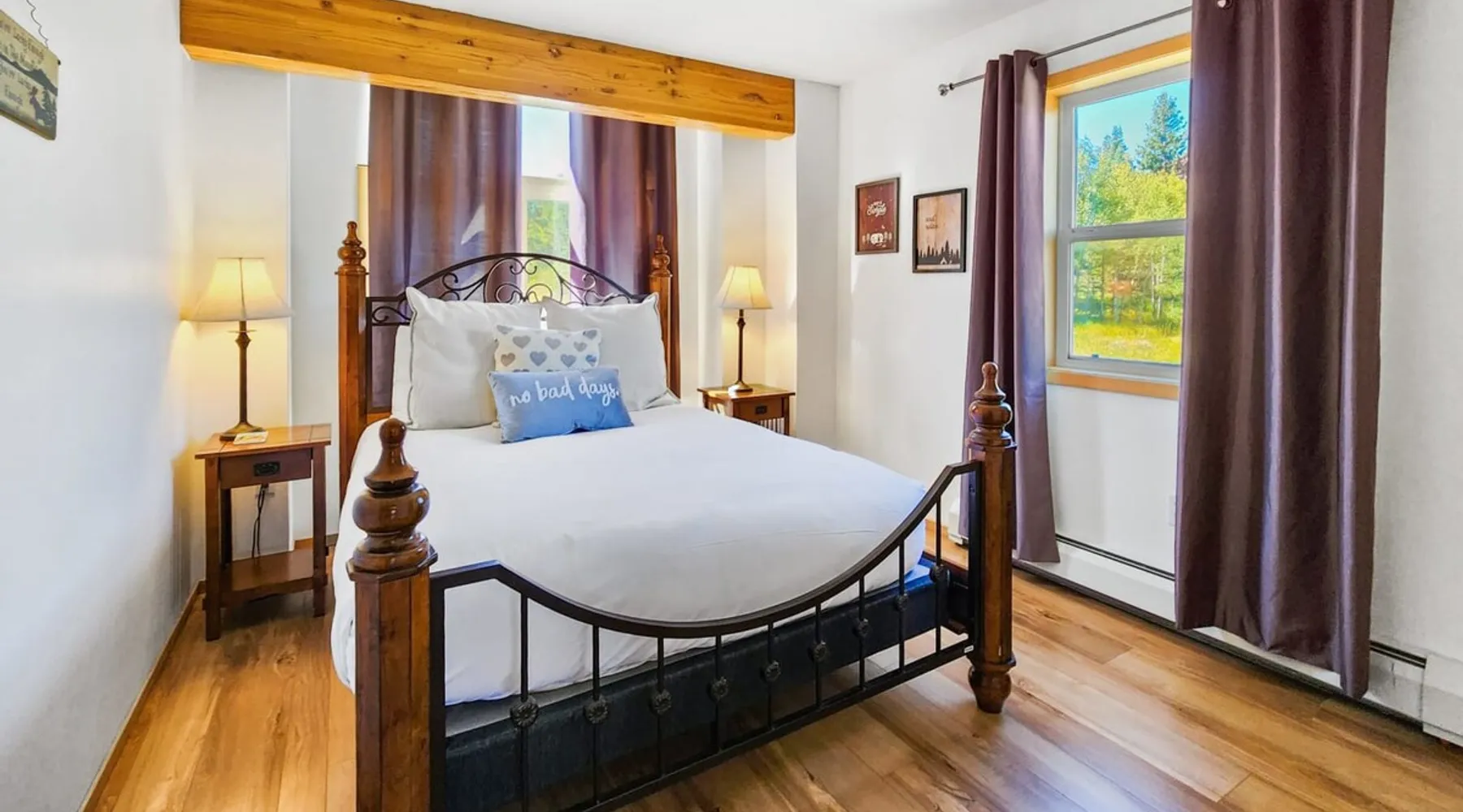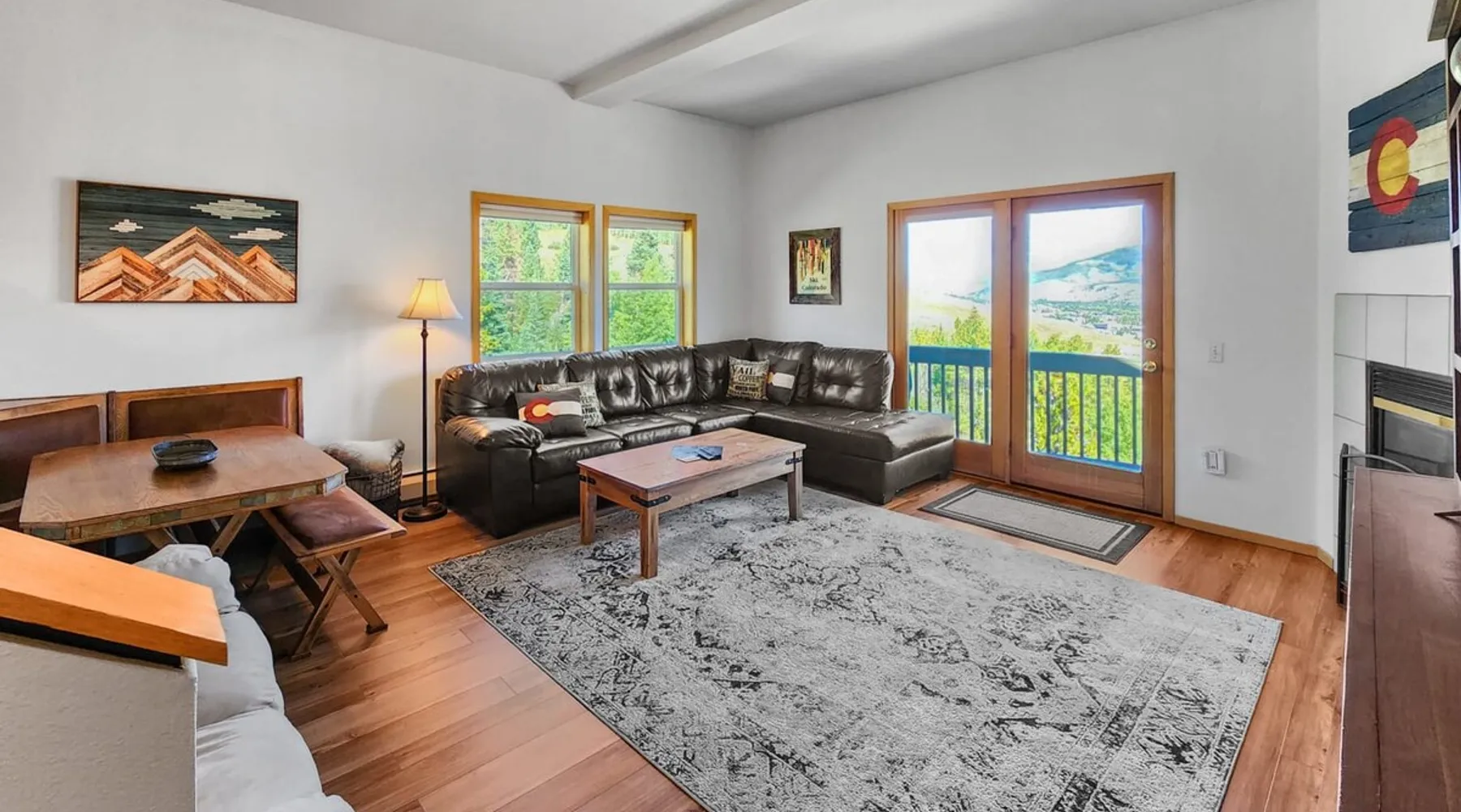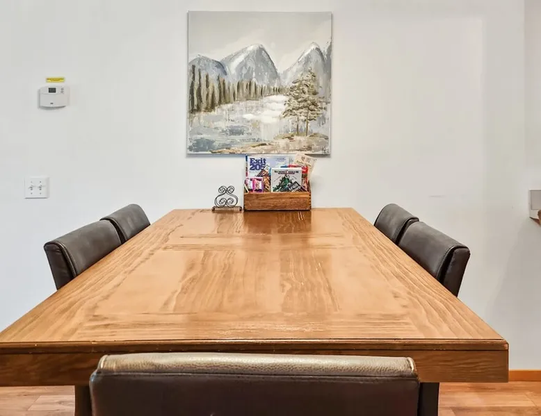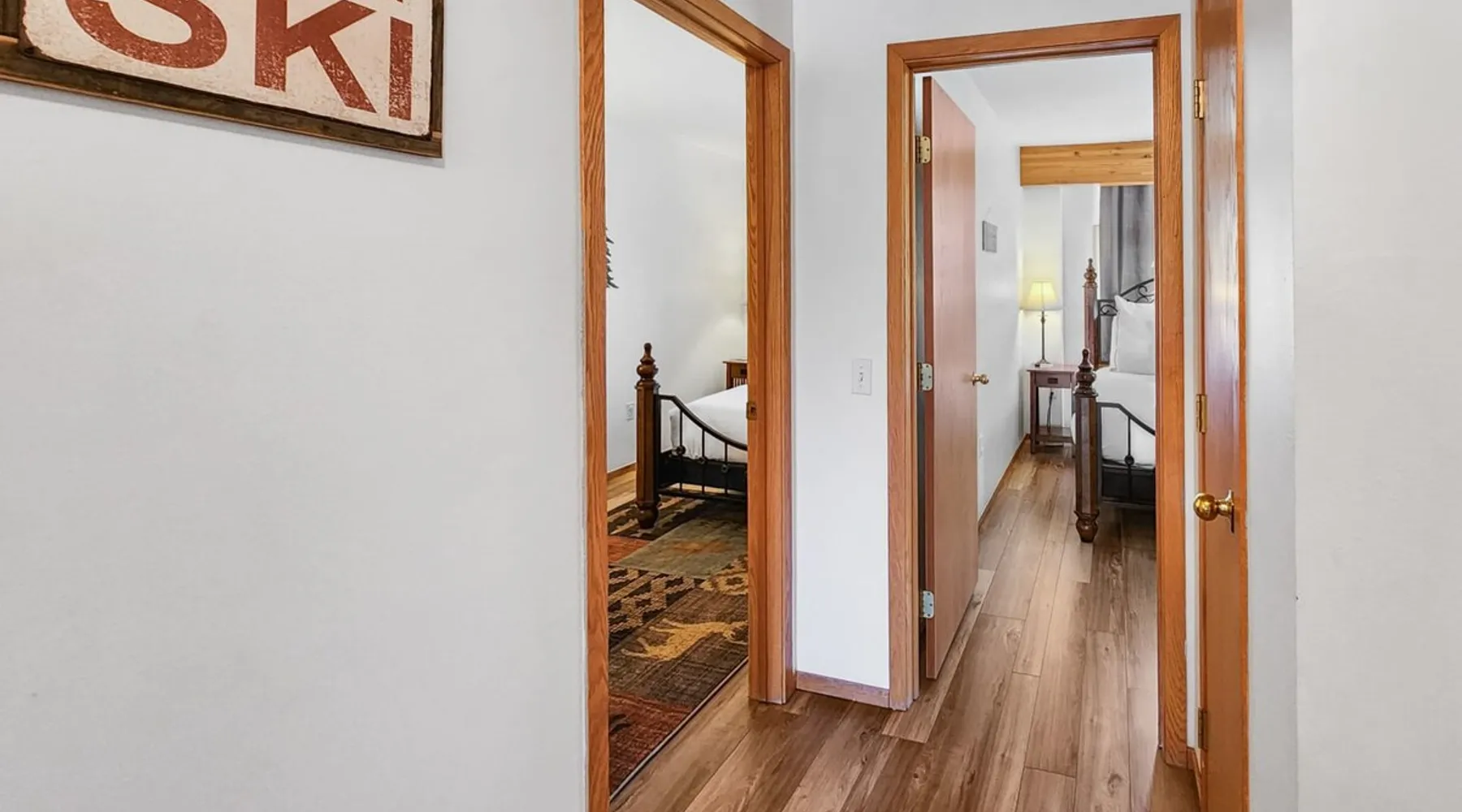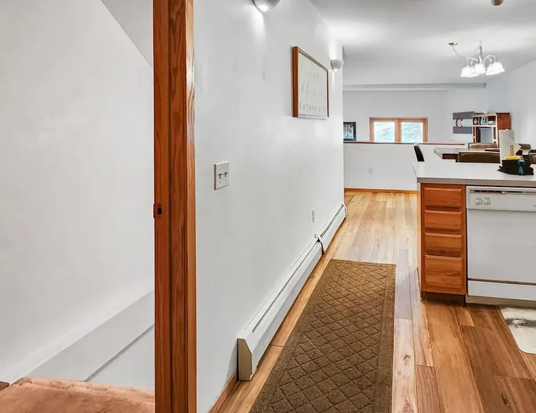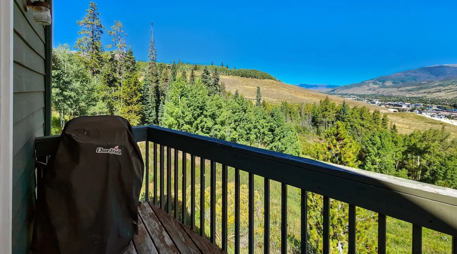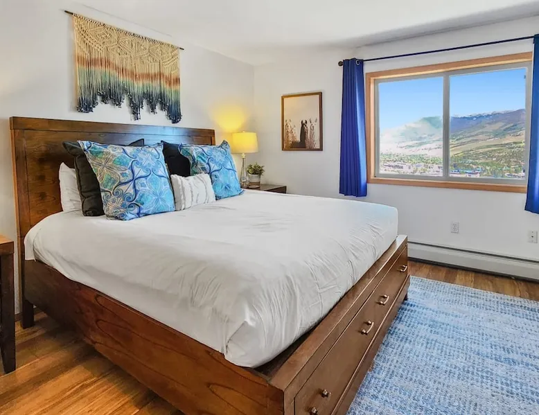 Looking to escape the city life for a mountain retreat? This home is for you! This family-friendly 4-bedroom townhome is the perfect launching pad for endless adventures, placing you near several hiking trails & minutes from a FREE bus stop connecting you to Breck & surrounding areas. After a busy day of adventures, relax & recharge in this inviting home where you will find comfortable bedrooms, an open layout perfect for groups, and a deck boasting impressive mountain views. The space This 4-bedroom, 2.5-bathroom, townhome is the perfect welcoming escape after a busy day on the mountain. With three levels of living space, the family-friendly home has enough space for up to 14 to spread out for a comfortable stay. Enjoy the peaceful surroundings from this home, which is an end unit with a private deck tucked next to the surrounding trees. You are going to love stepping out here and taking in the impressive mountain views! When you arrive at the home, you will be greeted by an entryway that includes coat hooks for storing your outdoor gear, a half-bathroom, and access to the attached garage. The entryway opens up to the main living space, where you will find an open kitchen/dining room/living room, providing an ideal space to stay connected with your group. You will first come to the fully equipped kitchen, where you will find everything you need to prepare delicious meals. The kitchen includes stainless steel appliances, a full range of basic cookware, and a kitchen bar with two bar stools providing a cozy place to grab a snack or keep the chef company. On the other side of the kitchen bar is the dining room, where you will find a large table with seating for 10. The flow of this space makes it easy to bring hot dishes to the table for family-style meals with your loved ones! A sunken living room is situated just a few steps down from the dining area, this bright space is the perfect hang-out spot for your group! Two large windows and French doors fill the space with natural light and beautiful views over the surrounding trees and mountains. In the living room, you will find a large couch, a love seat, and a corner table with bench seating providing plenty of seating accommodations for your group. Curl up around the gas fireplace and watch a movie on the 65” Smart TV, or just enjoy taking in the views from this room. A dynamic space ideal for entertaining and relaxing! From the living room, you can step out to the deck where you will find a BBQ and two patio chairs, so you can sit back and enjoy the great views of Ptarmigan Mountain and Silverthorne. When you are ready to settle in for the night, you will find three of the four bedrooms located on the upper level of the townhome. Tuck in for a good night’s rest in the first bedroom where you will find a charming space with an exposed wood beam, two large windows overlooking the trees, matching nightstands, and a queen-size bed. Adjacent to the first bedroom is a second bedroom, which also includes a queen-size bed. Down the hall from the first two bedrooms is a full bathroom for shared use and features a single-sink vanity with under-the-sink storage space and a bathtub/shower combo. Rounding out the upper floor is a master suite tucked away at the end of the hallway, providing a private and quiet space for you to get a good night’s rest. This well-decorated room features a comfortable king-size bed with matching nightstands and lamps, 2 standard-size closets, and an ensuite bathroom with a bathtub/shower combo. Brightening up the room is a large north-facing window that boasts beautiful views over Ptarmigan mountain and Silverthorne that you can enjoy right from bed! On the basement level of the home, you will find an open and dynamic fourth bedroom. The room covers the basement level in an open layout and includes a workspace with a desk and a chair and a cozy play area with a Smart TV and board games, kid books, and puzzles. This room is perfect for sharing or for the young travelers in your group! The room boasts ample sleeping space with THREE twin-over-queen bunk beds! Each bunk bed includes drawers for storage space, and the bedroom enjoys views of Ptarmigan Mountain and Silverthorne. A utility room is also located in the basement, in which you will find a washer and dryer, so you can easily keep up with any laundry needs during your stay. STR License number: STR21-01759 Guest access Guests will have access to the entire townhome including a private back deck. Guests will also have access to 4 parking places, there is 1 parking place in the attached garage suitable for a small SUV or car, 1 parking place in front of the garage, and 2 parking places in a shared parking lot located across the street from the home. Other things to note Please note that, like most homes in Breckenridge, this home does not have A/C. Please keep in mind that if you plan to ski, you are responsible for verifying the ski resorts' opening and closing dates. Registration number STR21-01759