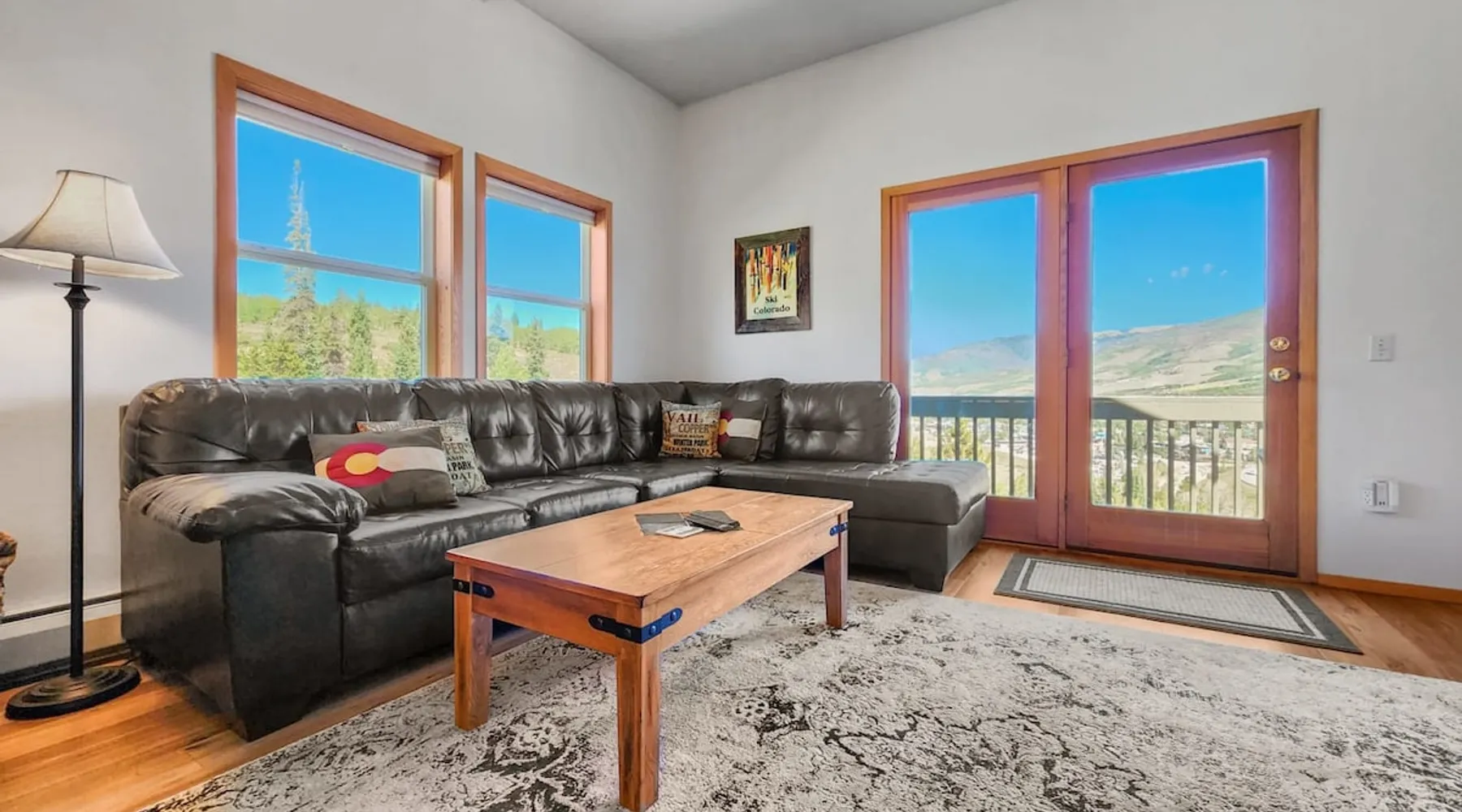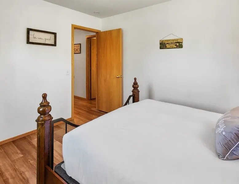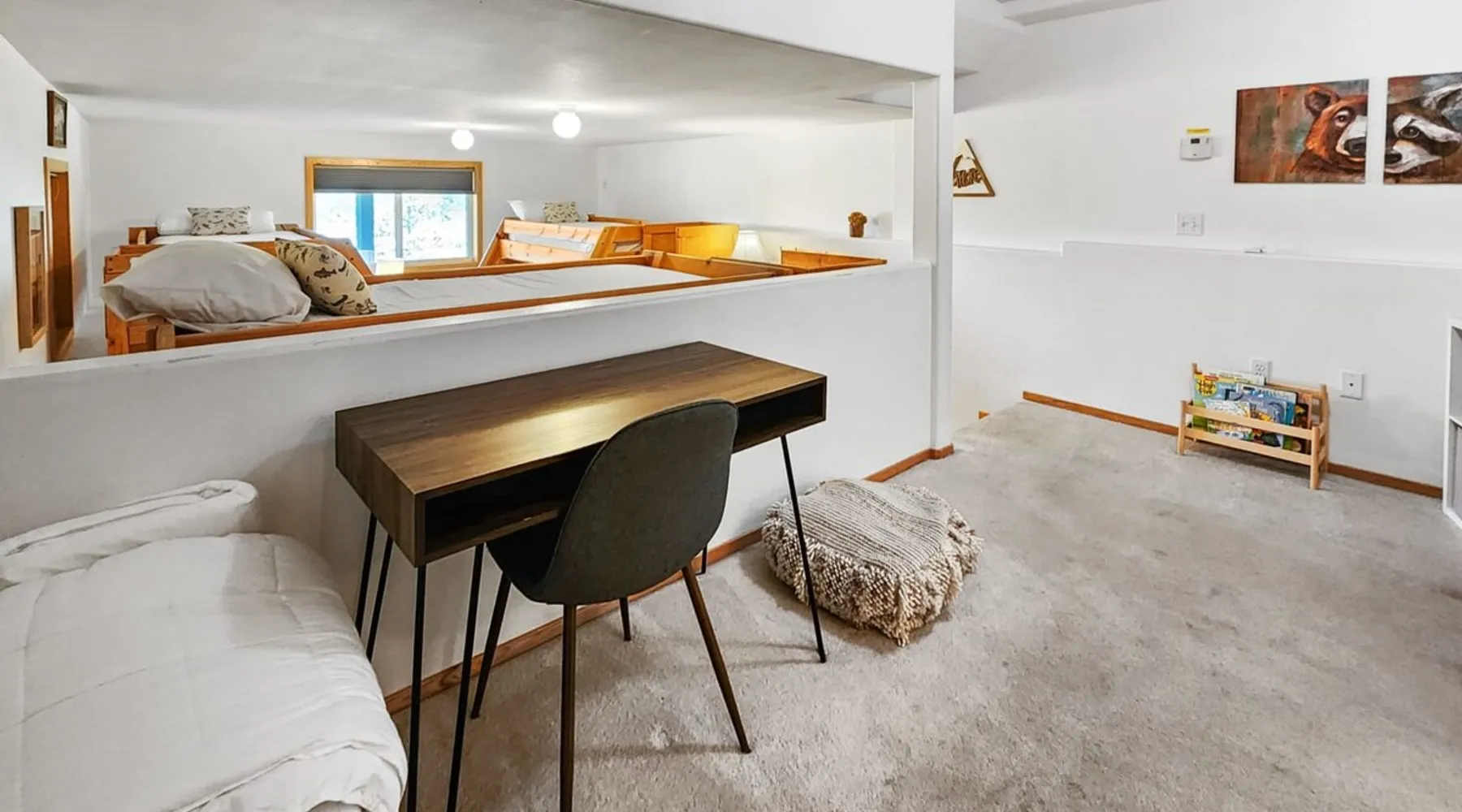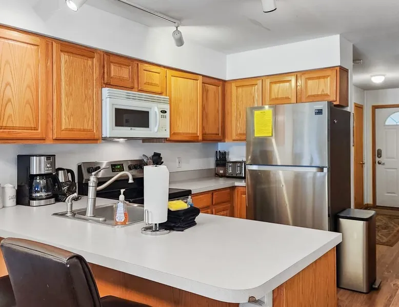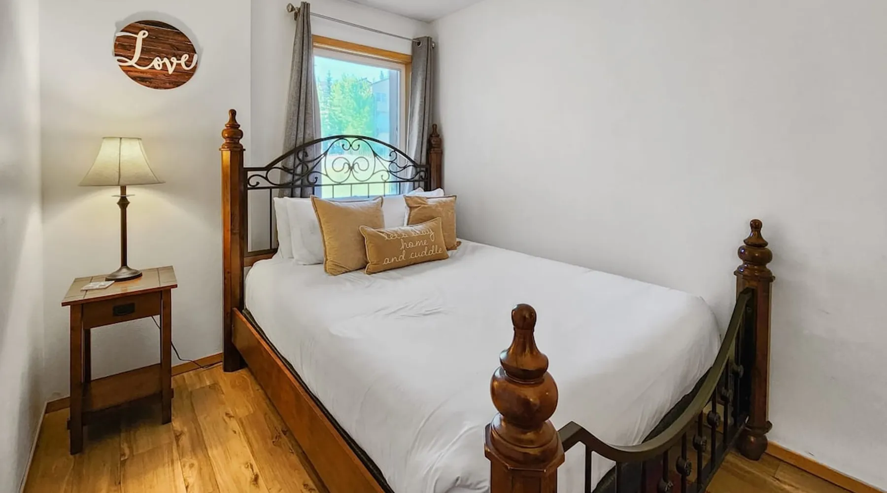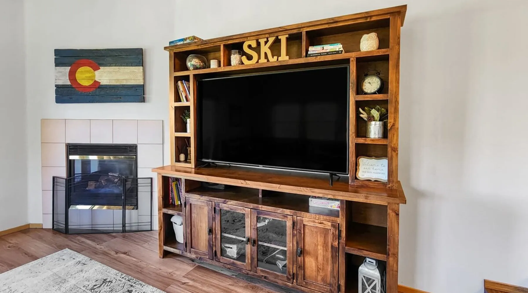 Looking to escape the city life for a mountain retreat? This home is for you! This family-friendly 4-bedroom townhome is the perfect launching pad for endless adventures, placing you near several hiking trails & minutes from a FREE bus stop connecting you to Breck & surrounding areas. After a busy day of adventures, relax & recharge in this inviting home where you will find comfortable bedrooms, an open layout perfect for groups, and a deck boasting impressive mountain views. The space This 4-bedroom, 2.5-bathroom, townhome is the perfect welcoming escape after a busy day on the mountain. With three levels of living space, the family-friendly home has enough space for up to 14 to spread out for a comfortable stay. Enjoy the peaceful surroundings from this home, which is an end unit with a private deck tucked next to the surrounding trees. You are going to love stepping out here and taking in the impressive mountain views! When you arrive at the home, you will be greeted by an entryway that includes coat hooks for storing your outdoor gear, a half-bathroom, and access to the attached garage. The entryway opens up to the main living space, where you will find an open kitchen/dining room/living room, providing an ideal space to stay connected with your group. You will first come to the fully equipped kitchen, where you will find everything you need to prepare delicious meals. The kitchen includes stainless steel appliances, a full range of basic cookware, and a kitchen bar with two bar stools providing a cozy place to grab a snack or keep the chef company. On the other side of the kitchen bar is the dining room, where you will find a large table with seating for 10. The flow of this space makes it easy to bring hot dishes to the table for family-style meals with your loved ones! A sunken living room is situated just a few steps down from the dining area, this bright space is the perfect hang-out spot for your group! Two large windows and French doors fill the space with natural light and beautiful views over the surrounding trees and mountains. In the living room, you will find a large couch, a love seat, and a corner table with bench seating providing plenty of seating accommodations for your group. Curl up around the gas fireplace and watch a movie on the 65” Smart TV, or just enjoy taking in the views from this room. A dynamic space ideal for entertaining and relaxing! From the living room, you can step out to the deck where you will find a BBQ and two patio chairs, so you can sit back and enjoy the great views of Ptarmigan Mountain and Silverthorne. When you are ready to settle in for the night, you will find three of the four bedrooms located on the upper level of the townhome. Tuck in for a good night’s rest in the first bedroom where you will find a charming space with an exposed wood beam, two large windows overlooking the trees, matching nightstands, and a queen-size bed. Adjacent to the first bedroom is a second bedroom, which also includes a queen-size bed. Down the hall from the first two bedrooms is a full bathroom for shared use and features a single-sink vanity with under-the-sink storage space and a bathtub/shower combo. Rounding out the upper floor is a master suite tucked away at the end of the hallway, providing a private and quiet space for you to get a good night’s rest. This well-decorated room features a comfortable king-size bed with matching nightstands and lamps, 2 standard-size closets, and an ensuite bathroom with a bathtub/shower combo. Brightening up the room is a large north-facing window that boasts beautiful views over Ptarmigan mountain and Silverthorne that you can enjoy right from bed! On the basement level of the home, you will find an open and dynamic fourth bedroom. The room covers the basement level in an open layout and includes a workspace with a desk and a chair and a cozy play area with a Smart TV and board games, kid books, and puzzles. This room is perfect for sharing or for the young travelers in your group! The room boasts ample sleeping space with THREE twin-over-queen bunk beds! Each bunk bed includes drawers for storage space, and the bedroom enjoys views of Ptarmigan Mountain and Silverthorne. A utility room is also located in the basement, in which you will find a washer and dryer, so you can easily keep up with any laundry needs during your stay. STR License number: STR21-01759 Guest access Guests will have access to the entire townhome including a private back deck. Guests will also have access to 4 parking places, there is 1 parking place in the attached garage suitable for a small SUV or car, 1 parking place in front of the garage, and 2 parking places in a shared parking lot located across the street from the home. Other things to note Please note that, like most homes in Breckenridge, this home does not have A/C. Please keep in mind that if you plan to ski, you are responsible for verifying the ski resorts' opening and closing dates. Registration number STR21-01759