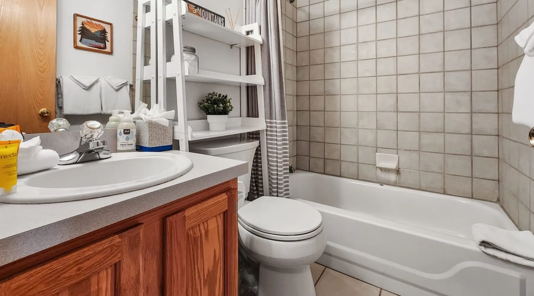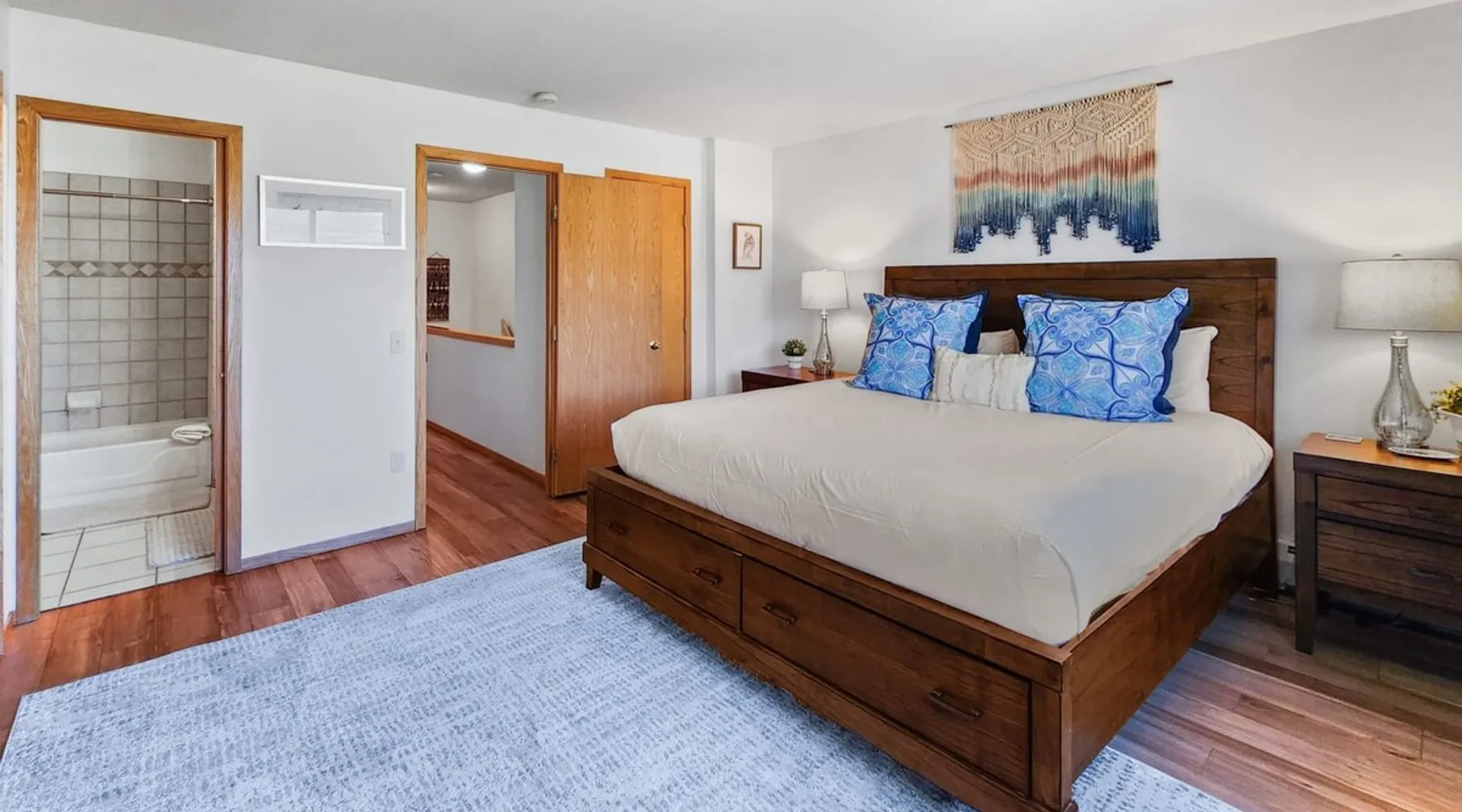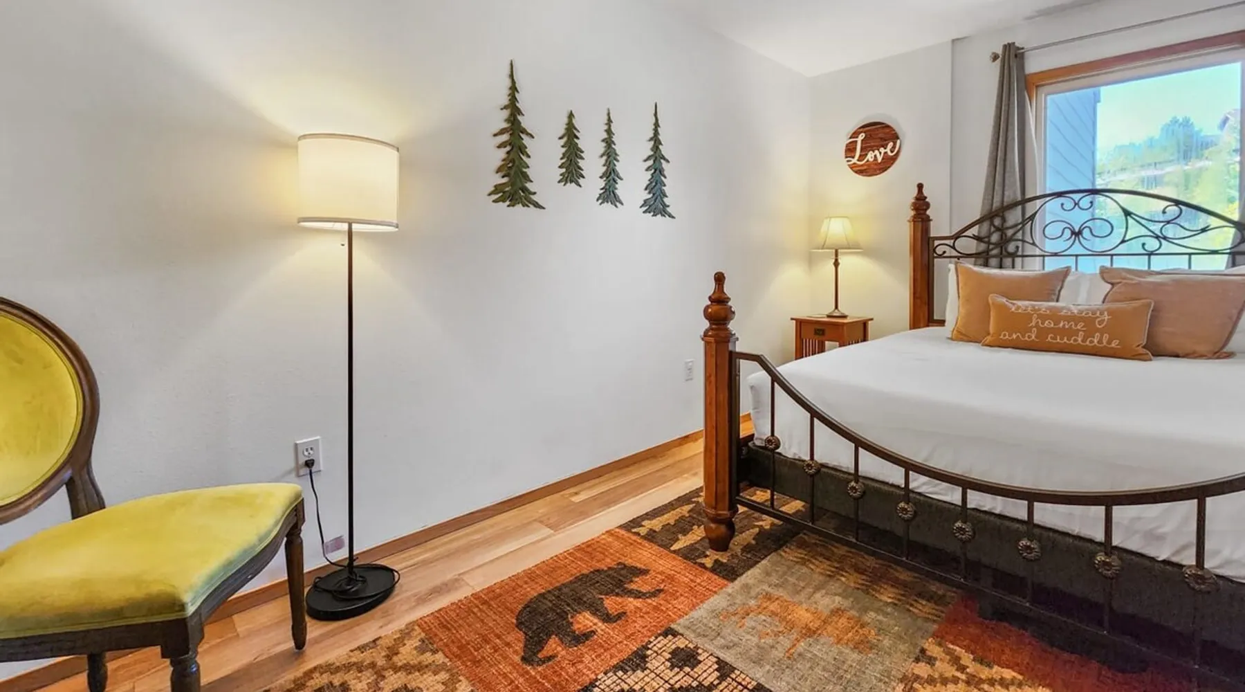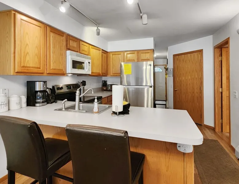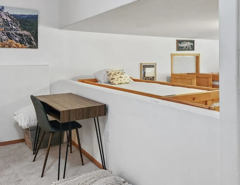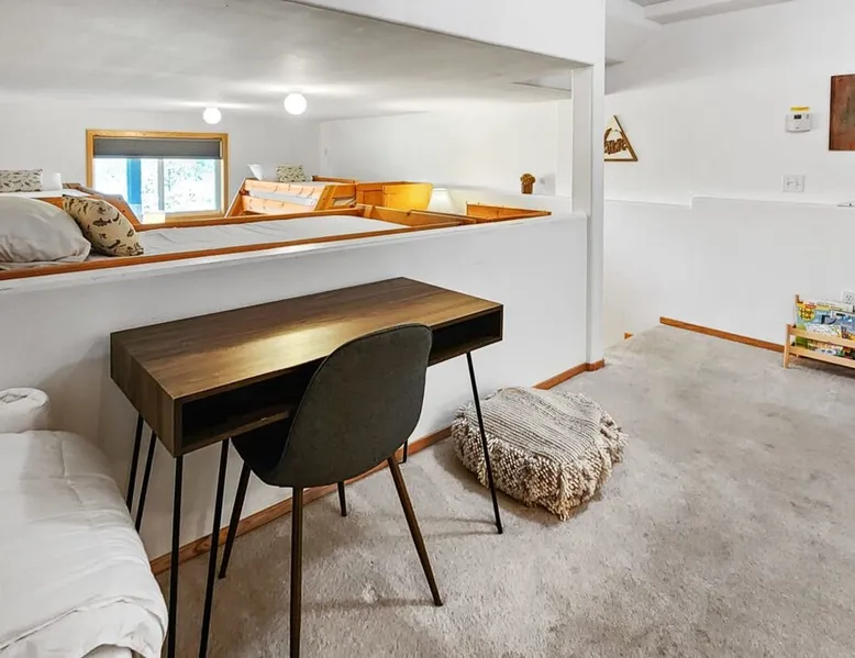 Looking to escape the city life for a mountain retreat? This home is for you! This family-friendly 4-bedroom townhome is the perfect launching pad for endless adventures, placing you near several hiking trails & minutes from a FREE bus stop connecting you to Breck & surrounding areas. After a busy day of adventures, relax & recharge in this inviting home where you will find comfortable bedrooms, an open layout perfect for groups, and a deck boasting impressive mountain views. The space This 4-bedroom, 2.5-bathroom, townhome is the perfect welcoming escape after a busy day on the mountain. With three levels of living space, the family-friendly home has enough space for up to 14 to spread out for a comfortable stay. Enjoy the peaceful surroundings from this home, which is an end unit with a private deck tucked next to the surrounding trees. You are going to love stepping out here and taking in the impressive mountain views! When you arrive at the home, you will be greeted by an entryway that includes coat hooks for storing your outdoor gear, a half-bathroom, and access to the attached garage. The entryway opens up to the main living space, where you will find an open kitchen/dining room/living room, providing an ideal space to stay connected with your group. You will first come to the fully equipped kitchen, where you will find everything you need to prepare delicious meals. The kitchen includes stainless steel appliances, a full range of basic cookware, and a kitchen bar with two bar stools providing a cozy place to grab a snack or keep the chef company. On the other side of the kitchen bar is the dining room, where you will find a large table with seating for 10. The flow of this space makes it easy to bring hot dishes to the table for family-style meals with your loved ones! A sunken living room is situated just a few steps down from the dining area, this bright space is the perfect hang-out spot for your group! Two large windows and French doors fill the space with natural light and beautiful views over the surrounding trees and mountains. In the living room, you will find a large couch, a love seat, and a corner table with bench seating providing plenty of seating accommodations for your group. Curl up around the gas fireplace and watch a movie on the 65” Smart TV, or just enjoy taking in the views from this room. A dynamic space ideal for entertaining and relaxing! From the living room, you can step out to the deck where you will find a BBQ and two patio chairs, so you can sit back and enjoy the great views of Ptarmigan Mountain and Silverthorne. When you are ready to settle in for the night, you will find three of the four bedrooms located on the upper level of the townhome. Tuck in for a good night’s rest in the first bedroom where you will find a charming space with an exposed wood beam, two large windows overlooking the trees, matching nightstands, and a queen-size bed. Adjacent to the first bedroom is a second bedroom, which also includes a queen-size bed. Down the hall from the first two bedrooms is a full bathroom for shared use and features a single-sink vanity with under-the-sink storage space and a bathtub/shower combo. Rounding out the upper floor is a master suite tucked away at the end of the hallway, providing a private and quiet space for you to get a good night’s rest. This well-decorated room features a comfortable king-size bed with matching nightstands and lamps, 2 standard-size closets, and an ensuite bathroom with a bathtub/shower combo. Brightening up the room is a large north-facing window that boasts beautiful views over Ptarmigan mountain and Silverthorne that you can enjoy right from bed! On the basement level of the home, you will find an open and dynamic fourth bedroom. The room covers the basement level in an open layout and includes a workspace with a desk and a chair and a cozy play area with a Smart TV and board games, kid books, and puzzles. This room is perfect for sharing or for the young travelers in your group! The room boasts ample sleeping space with THREE twin-over-queen bunk beds! Each bunk bed includes drawers for storage space, and the bedroom enjoys views of Ptarmigan Mountain and Silverthorne. A utility room is also located in the basement, in which you will find a washer and dryer, so you can easily keep up with any laundry needs during your stay. STR License number: STR21-01759 Guest access Guests will have access to the entire townhome including a private back deck. Guests will also have access to 4 parking places, there is 1 parking place in the attached garage suitable for a small SUV or car, 1 parking place in front of the garage, and 2 parking places in a shared parking lot located across the street from the home. Other things to note Please note that, like most homes in Breckenridge, this home does not have A/C. Please keep in mind that if you plan to ski, you are responsible for verifying the ski resorts' opening and closing dates. Registration number STR21-01759