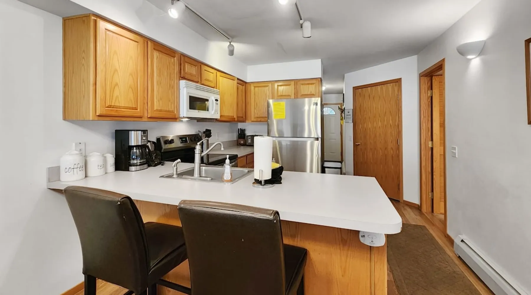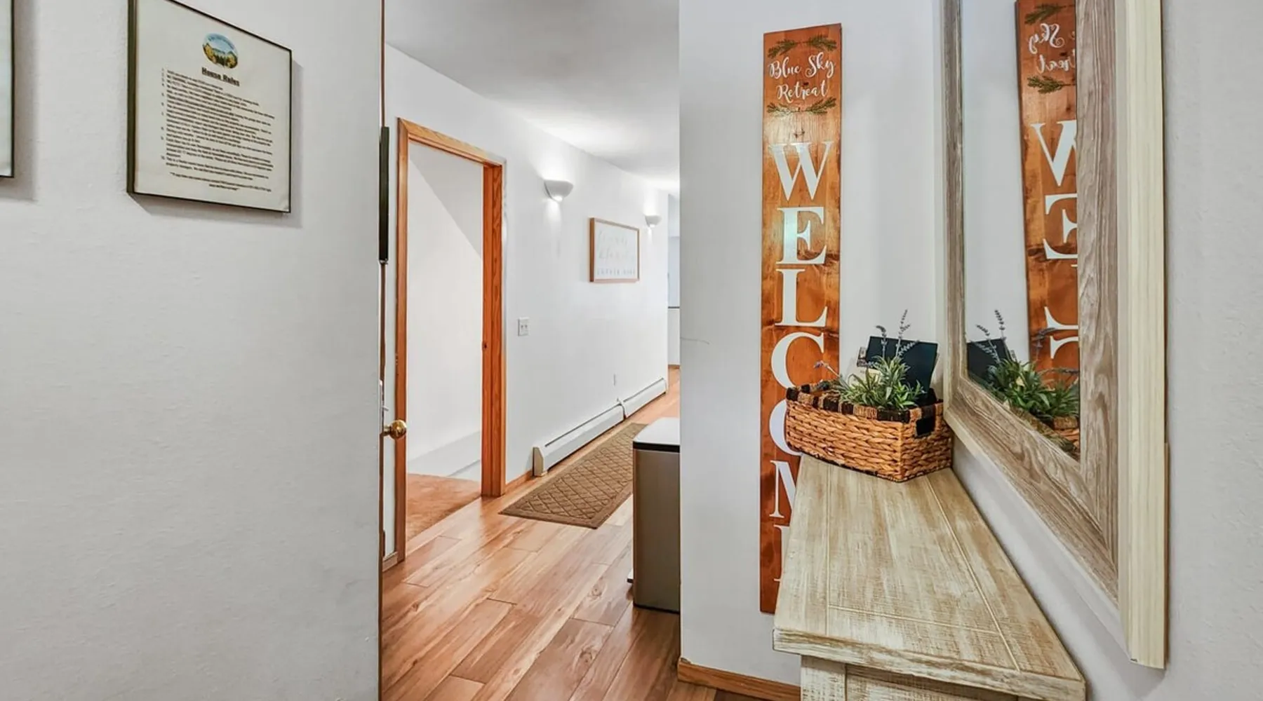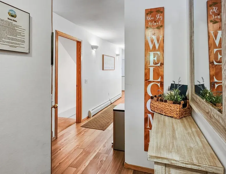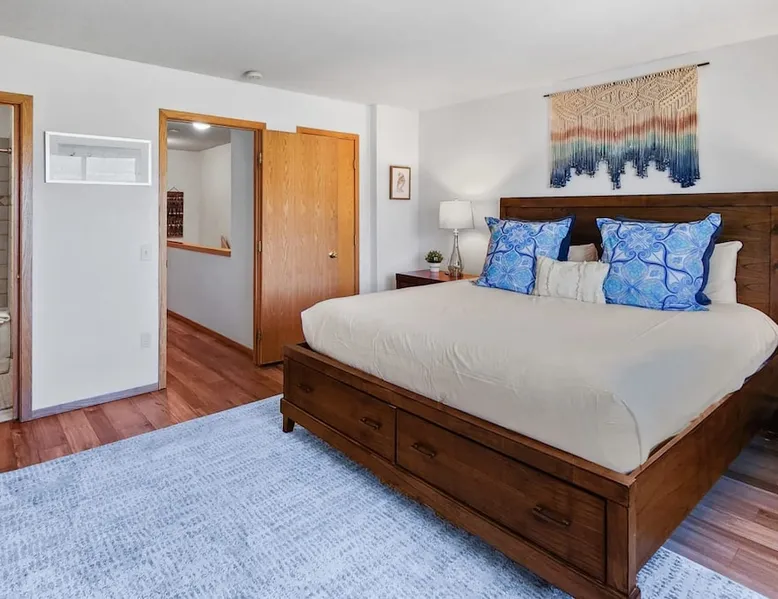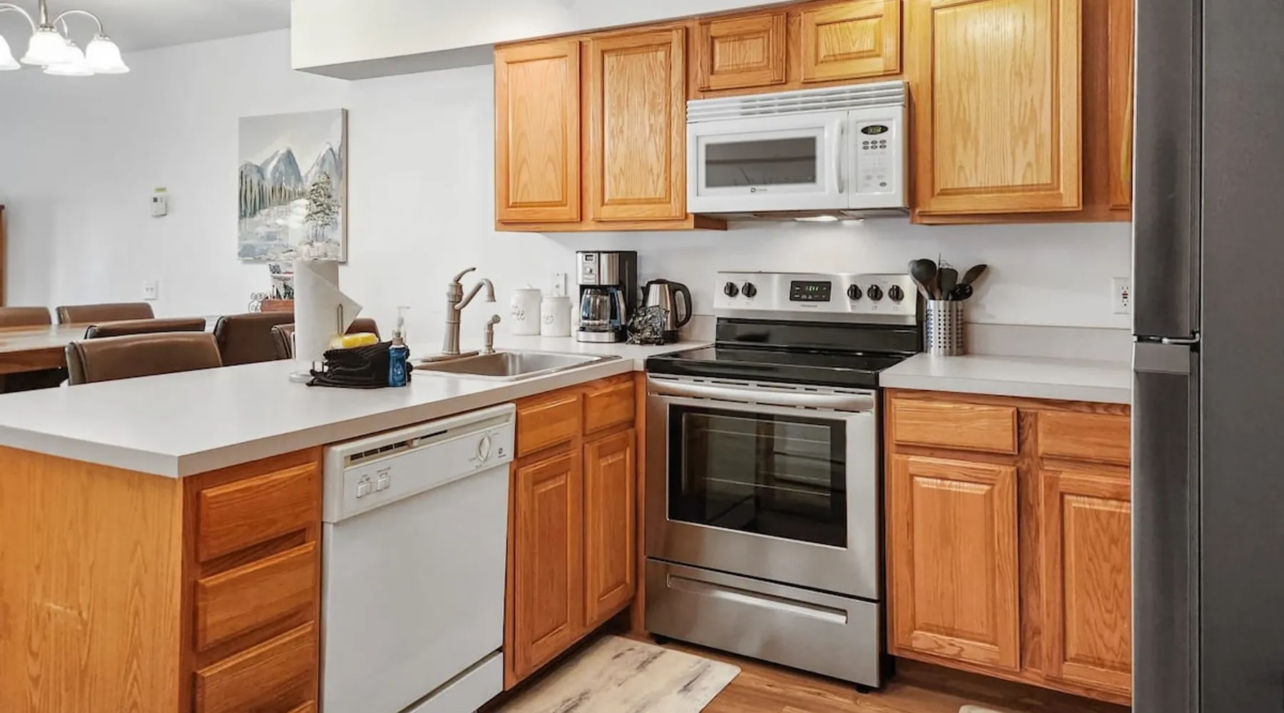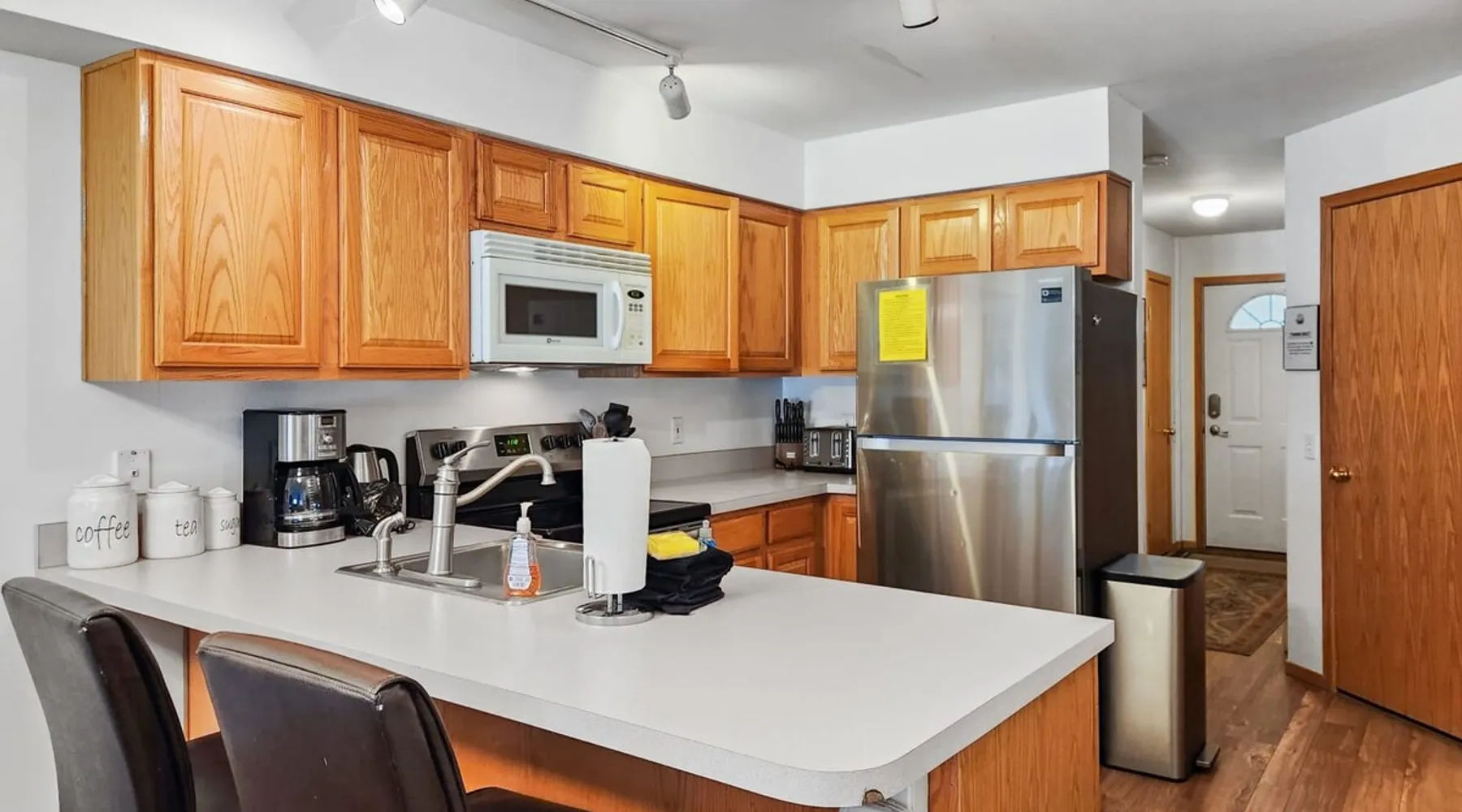 Looking to escape the city life for a mountain retreat? This home is for you! This family-friendly 4-bedroom townhome is the perfect launching pad for endless adventures, placing you near several hiking trails & minutes from a FREE bus stop connecting you to Breck & surrounding areas. After a busy day of adventures, relax & recharge in this inviting home where you will find comfortable bedrooms, an open layout perfect for groups, and a deck boasting impressive mountain views. The space This 4-bedroom, 2.5-bathroom, townhome is the perfect welcoming escape after a busy day on the mountain. With three levels of living space, the family-friendly home has enough space for up to 14 to spread out for a comfortable stay. Enjoy the peaceful surroundings from this home, which is an end unit with a private deck tucked next to the surrounding trees. You are going to love stepping out here and taking in the impressive mountain views! When you arrive at the home, you will be greeted by an entryway that includes coat hooks for storing your outdoor gear, a half-bathroom, and access to the attached garage. The entryway opens up to the main living space, where you will find an open kitchen/dining room/living room, providing an ideal space to stay connected with your group. You will first come to the fully equipped kitchen, where you will find everything you need to prepare delicious meals. The kitchen includes stainless steel appliances, a full range of basic cookware, and a kitchen bar with two bar stools providing a cozy place to grab a snack or keep the chef company. On the other side of the kitchen bar is the dining room, where you will find a large table with seating for 10. The flow of this space makes it easy to bring hot dishes to the table for family-style meals with your loved ones! A sunken living room is situated just a few steps down from the dining area, this bright space is the perfect hang-out spot for your group! Two large windows and French doors fill the space with natural light and beautiful views over the surrounding trees and mountains. In the living room, you will find a large couch, a love seat, and a corner table with bench seating providing plenty of seating accommodations for your group. Curl up around the gas fireplace and watch a movie on the 65” Smart TV, or just enjoy taking in the views from this room. A dynamic space ideal for entertaining and relaxing! From the living room, you can step out to the deck where you will find a BBQ and two patio chairs, so you can sit back and enjoy the great views of Ptarmigan Mountain and Silverthorne. When you are ready to settle in for the night, you will find three of the four bedrooms located on the upper level of the townhome. Tuck in for a good night’s rest in the first bedroom where you will find a charming space with an exposed wood beam, two large windows overlooking the trees, matching nightstands, and a queen-size bed. Adjacent to the first bedroom is a second bedroom, which also includes a queen-size bed. Down the hall from the first two bedrooms is a full bathroom for shared use and features a single-sink vanity with under-the-sink storage space and a bathtub/shower combo. Rounding out the upper floor is a master suite tucked away at the end of the hallway, providing a private and quiet space for you to get a good night’s rest. This well-decorated room features a comfortable king-size bed with matching nightstands and lamps, 2 standard-size closets, and an ensuite bathroom with a bathtub/shower combo. Brightening up the room is a large north-facing window that boasts beautiful views over Ptarmigan mountain and Silverthorne that you can enjoy right from bed! On the basement level of the home, you will find an open and dynamic fourth bedroom. The room covers the basement level in an open layout and includes a workspace with a desk and a chair and a cozy play area with a Smart TV and board games, kid books, and puzzles. This room is perfect for sharing or for the young travelers in your group! The room boasts ample sleeping space with THREE twin-over-queen bunk beds! Each bunk bed includes drawers for storage space, and the bedroom enjoys views of Ptarmigan Mountain and Silverthorne. A utility room is also located in the basement, in which you will find a washer and dryer, so you can easily keep up with any laundry needs during your stay. STR License number: STR21-01759 Guest access Guests will have access to the entire townhome including a private back deck. Guests will also have access to 4 parking places, there is 1 parking place in the attached garage suitable for a small SUV or car, 1 parking place in front of the garage, and 2 parking places in a shared parking lot located across the street from the home. Other things to note Please note that, like most homes in Breckenridge, this home does not have A/C. Please keep in mind that if you plan to ski, you are responsible for verifying the ski resorts' opening and closing dates. Registration number STR21-01759