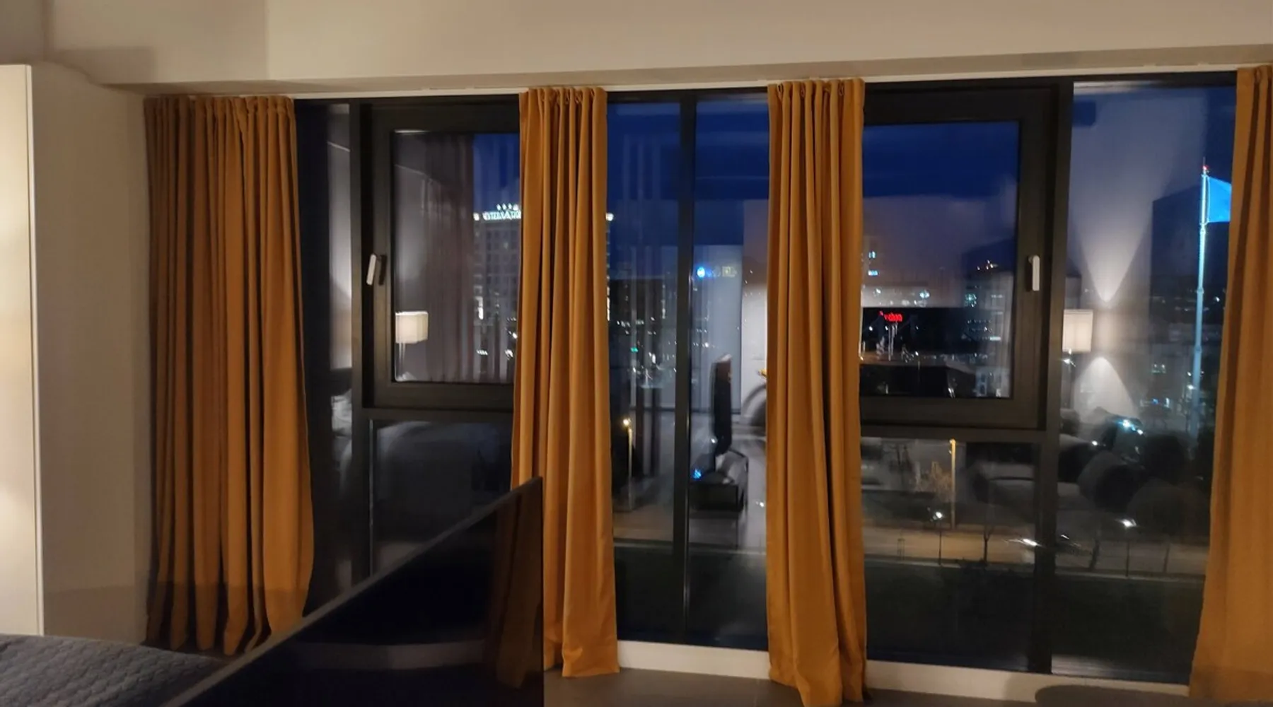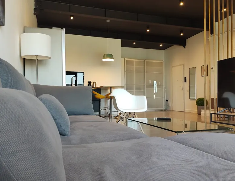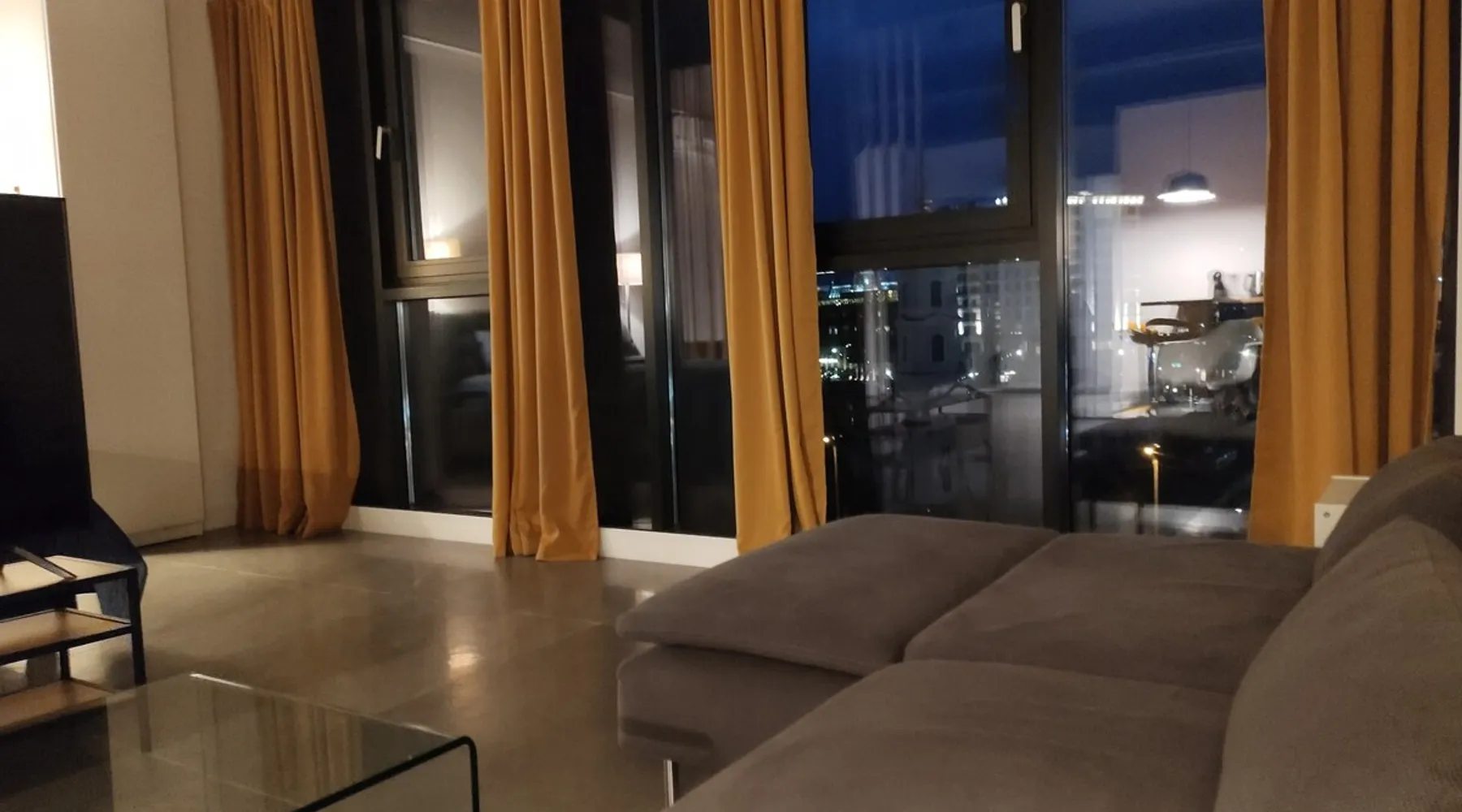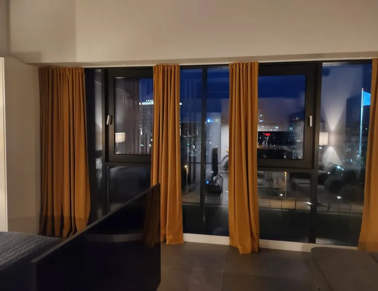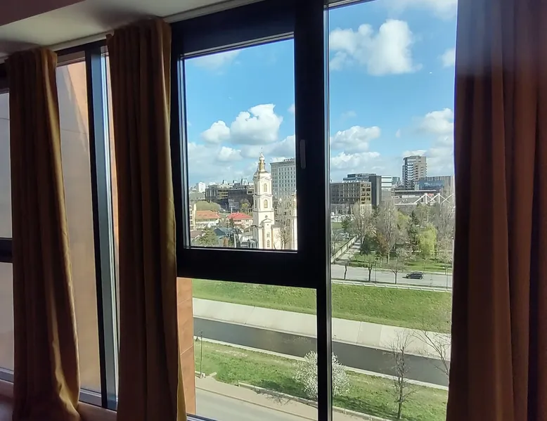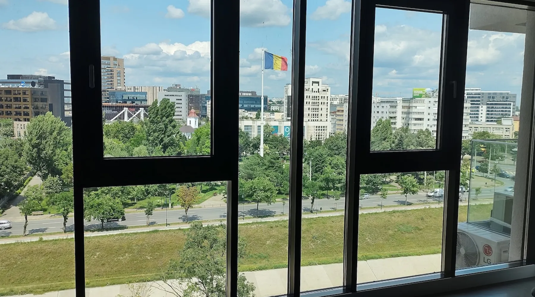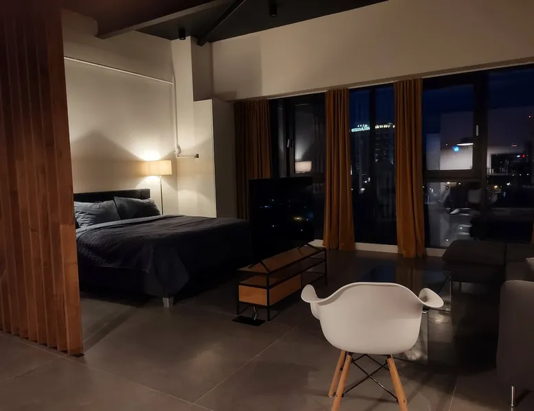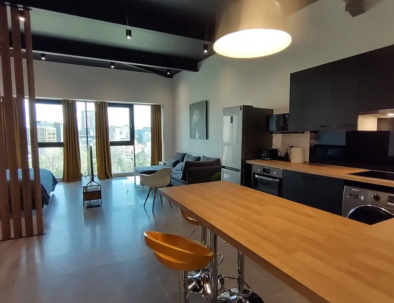 Indulge in the comfort of this spacious and unique home across the street from the Palas ensemble! An entire glass wall opens the amazing view of the entire city center of Iasi. The apartment at the top floor with a very high ceiling features a stylish open plan with loft-style design and is extremely comfortable, equipped with whatever it takes for a couple's dream vacation. The space The 60 sqm loft-style apartment with very high ceiling is located in an ultramodern new building on the 6th floor with two elevators and is open space type with a panoramic glass wall, which integrates in the same space the living area with comfortable desk, modern fully equipped kitchen, sleeping area with a very comfortable king size bed and a wardrobe. The apartment is suitable for working from home. Kitchen facilities include: electric oven, microwave, water kettle, coffee machine with capsules, induction hob, refrigerator and freezer, dining place. Guests can choose between several varieties of coffee and tea, still and mineral water offered from the house. The apartment is equipped with washing machine with dryer, air conditioning, Smart TV 55'', cable TV, high speed internet. In the bathroom are provided shower gels and certified bio shampoo, quality towels, a hairdryer, toilet paper. The sheets are made of cotton, the pillows and the duvets are made of fluff. No smoking is permitted except for e-cigarettes. Guest access Private parking on secure premises provided upon request. Supermarket, pharmacy, bank - on the ground floor. Public transportation hub near the building The Palas district is a 5-minute walk away. Great parks in walking distance. Other things to note The apartment was designed specifically for professionals arriving in Iasi for work, especially for remote work and offers a cozy desk with fast wired internet connection as well as a sofa for relaxation. The building where the apartment is located is located is located in a short walking distance of most of the office buildings in the city.