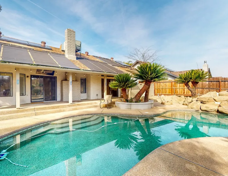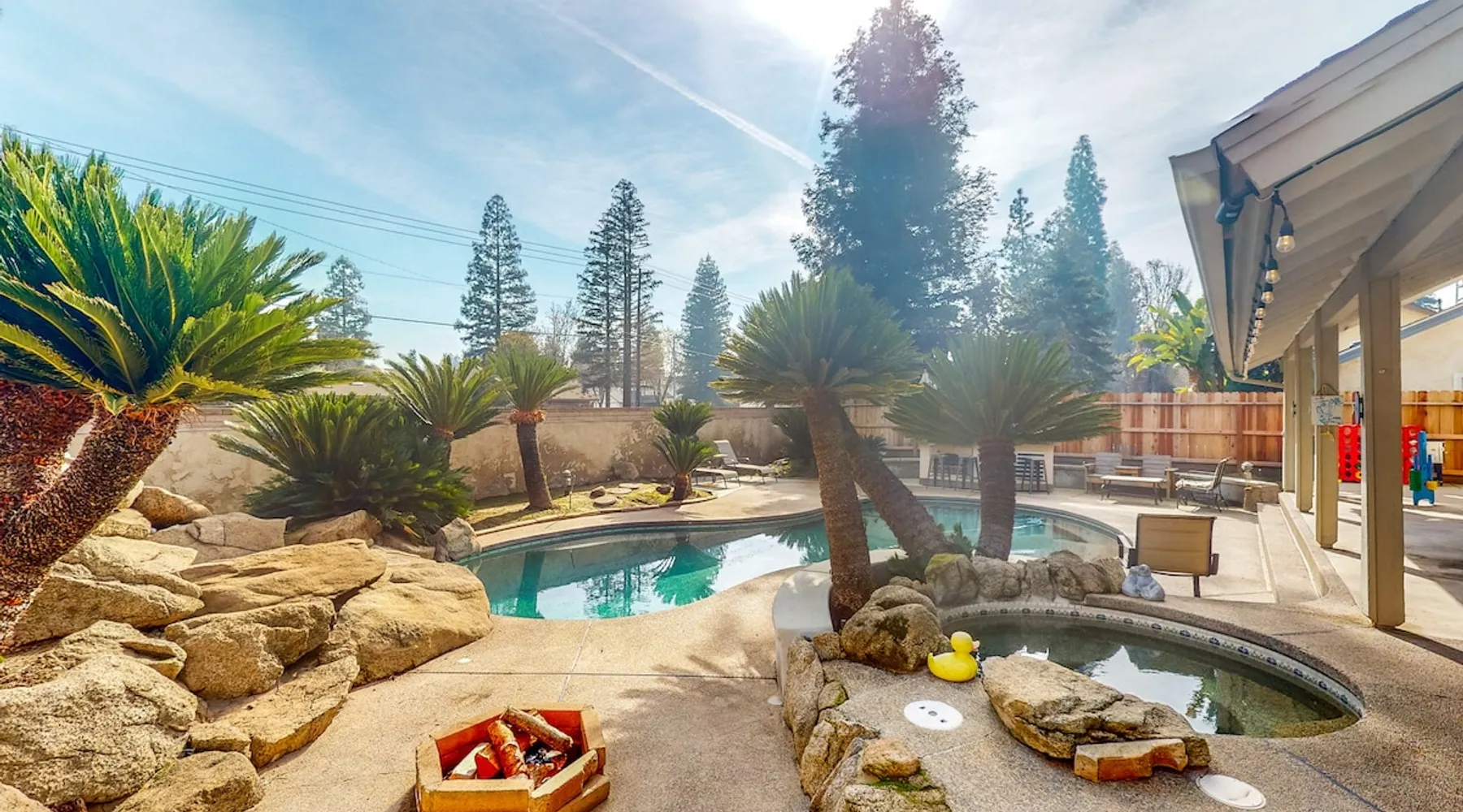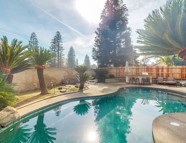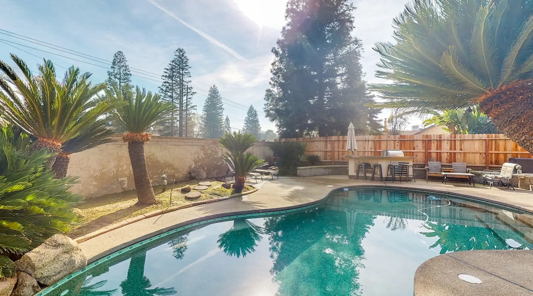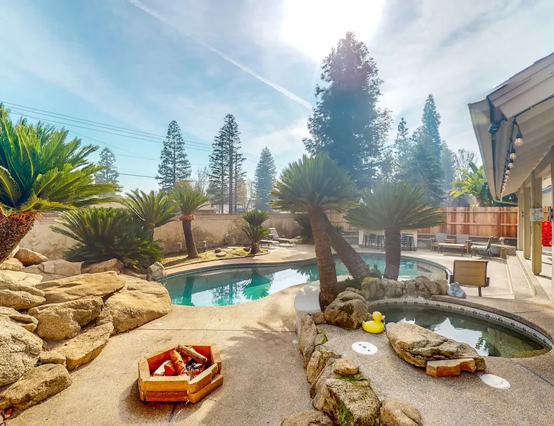 Conveniently located and beautifully designed, this Fresno home boasts easy access to the Fresno Yosemite International Airport and California State University. Live like a local and get out on the town before coming back to your sweet digs to relax in the private backyard oasis where a pool and hot tub wait. The space 456069 Inside your retreat, lounge in one of the two spacious living rooms where the seating is soft and the TVs are large. Or, find yourself cooking amongst the stainless steel appliances and ample meal prep space in the full kitchen. Enjoy your culinary creations at the formal dining table or alfresco in the enclosed backyard where Sago Palm Trees grow freely. The custom barbecue can be utilized when you want to enhance your cooking, and tasty drinks can be whipped up at the minibar. Golfers will love the putting green, located right in the front yard! And after plenty of fun in the sun, wash your swimsuits in the private washer/dryer. The bedrooms, equally spacious and bright, are sure to keep your loved ones content and comfortable. Tune the central air-conditioning to your liking each night and dive into your vacation read before dreaming sweetly about the days ahead. Guest access Guests will have access to the entire property Other things to note - No smoking - Pet friendly w/ $200 fee (+ fees & taxes) - No events, parties, or large gatherings - Additional fees and taxes may apply - Photo ID may be required upon check-in - Quiet hours are from 10:00 PM to 8:00 AM.