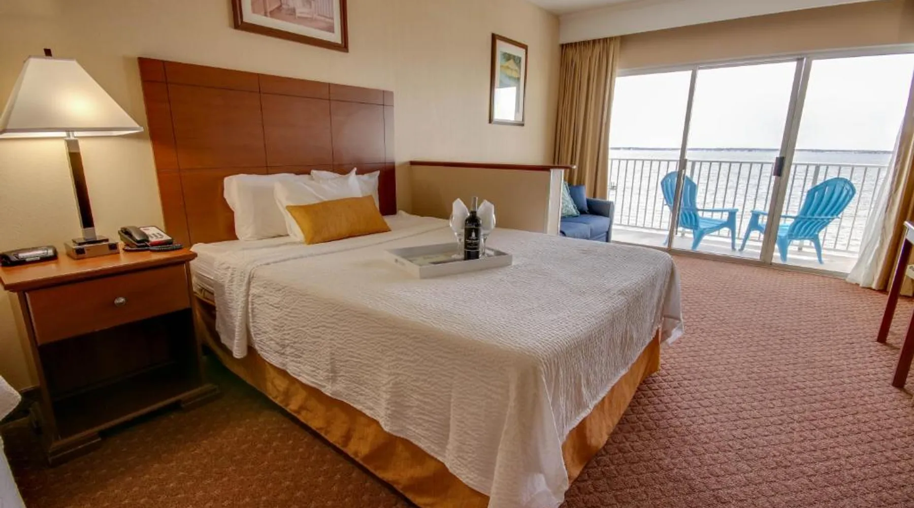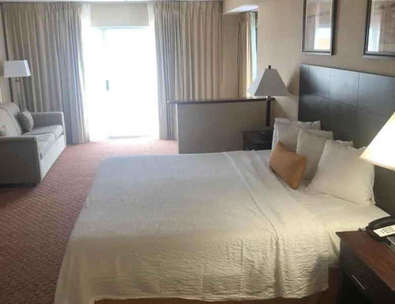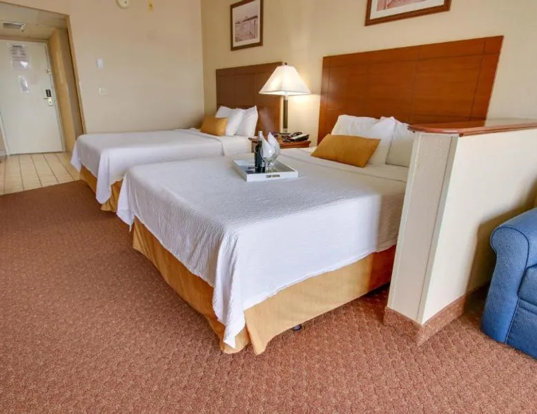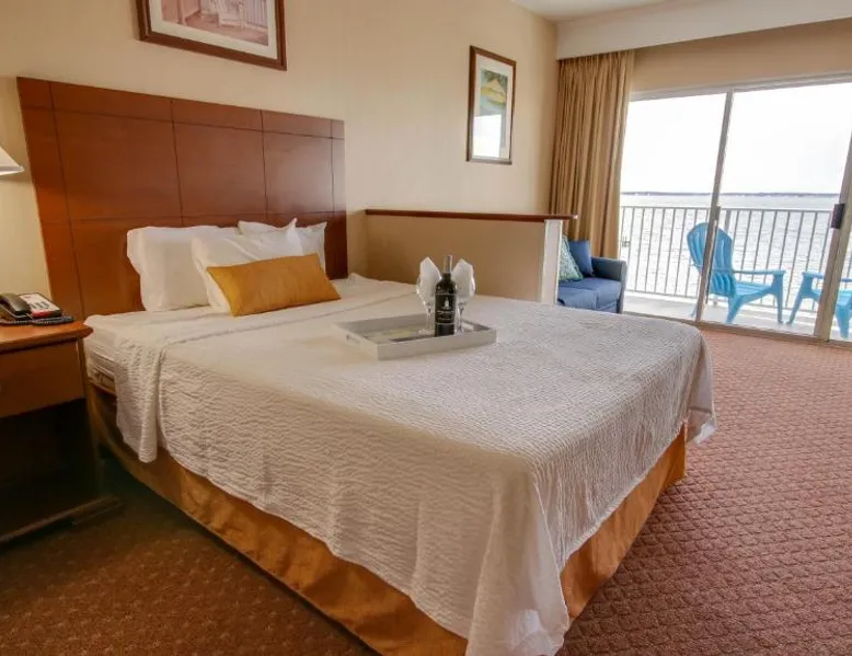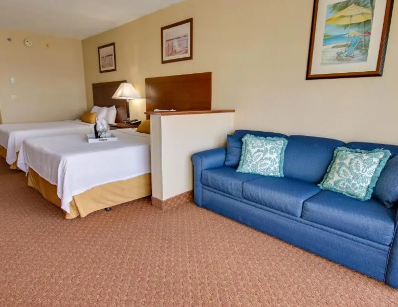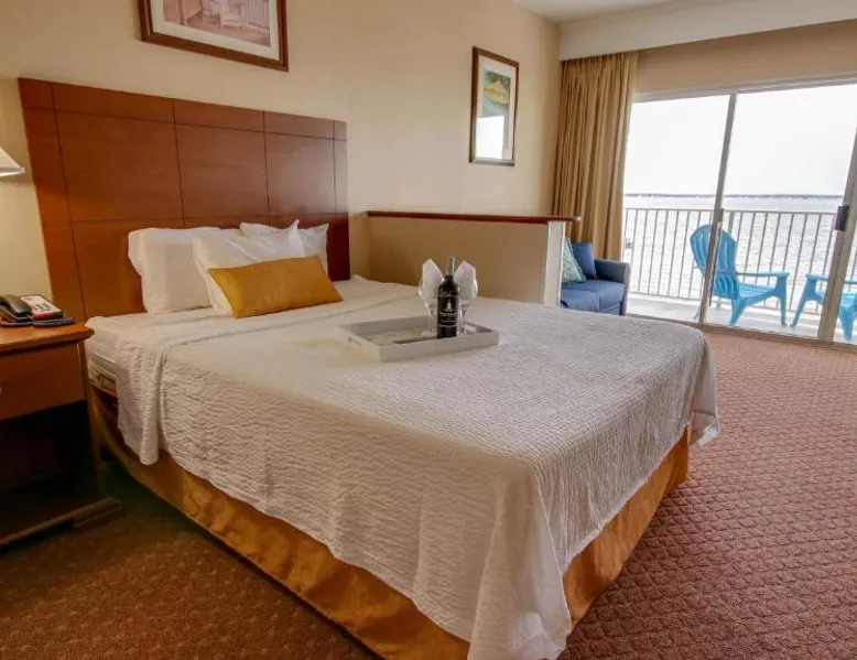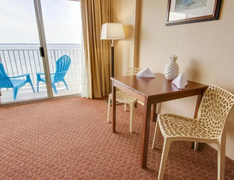 This bayfront hotel is just 2 minutes’ walk to the beach and features both indoor and outdoor pools. The Ocean City Boardwalk is 3 miles away. The comfortably decorated rooms at the Princess Bayside Beach Hotel all feature a cable TV, microwave, and refrigerator. Select rooms have a balcony with views of the bay. The Bayside Princess Beach Hotel has on-site water sports facility as well as a private bayfront beach area. and a poolside bar. Jolly Roger Amusement Park is 6 minutes drive from the hotel. Right next door to Seacrets Club (Lively waterfront nightspot with several dance floors, tropical cocktails & Caribbean-inspired eats.) Onsite parking available for 1 vehicle per room. No additional parking available for secondary vehicles. This room features a private terrace with bay views, sofa bed, and kitchen. Please note that the room rate is based on 2 guests. Maximum occupancy is 6 guests (see Hotel Policies).
