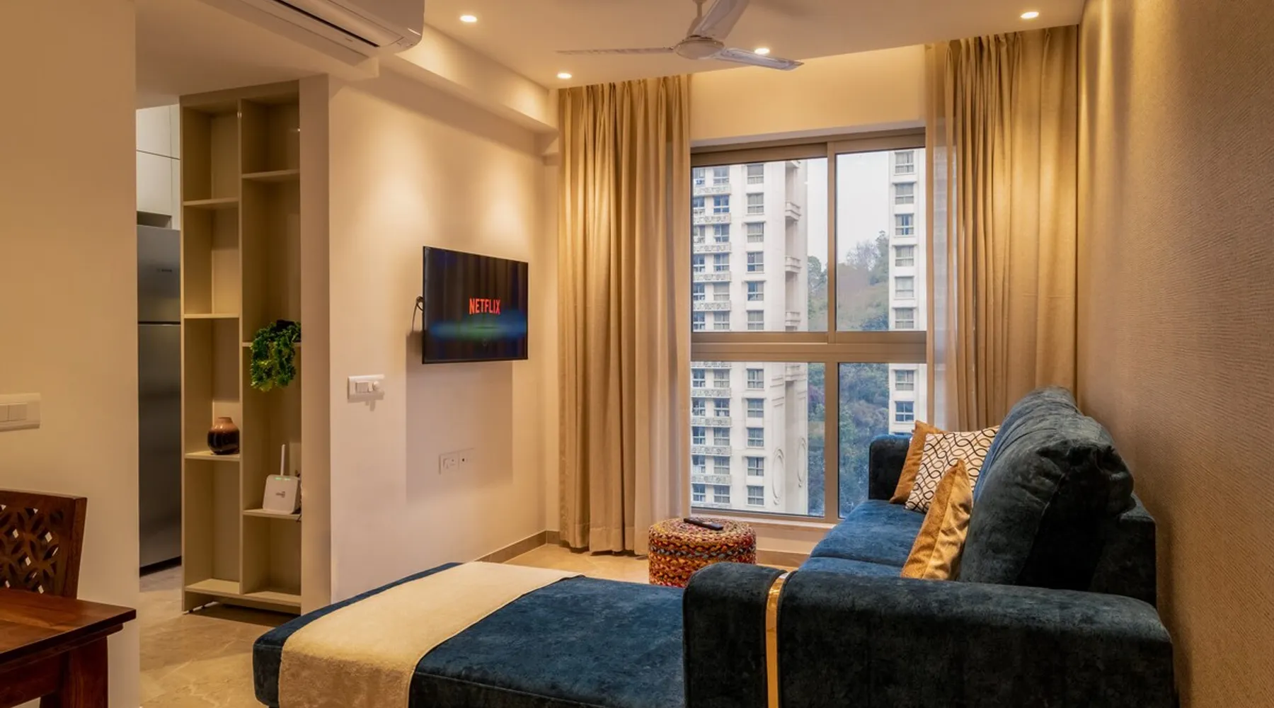 Welcome to Zenia at Hiranandani Regent Hill, a luxurious serviced apartment in the vibrant neighborhood of Hiranandani Powai. Indulge in comfort and style as you relax in the cozy seating area, enjoy meals in the dining space, and unwind in the plush bedrooms. With a fully equipped kitchen and complimentary Wi-Fi, your every need is taken care of. Explore the diverse dining options, upscale shopping, and picturesque parks in the area. Convenient transportation options ensure easy access. The space Welcome to our cozy 1-bedroom apartment in Hiranandani Powai. This thoughtfully designed space offers a comfortable and convenient stay for guests visiting Mumbai. The bedroom features a queen bed and a wardrobe, providing ample storage space for your belongings. The attached main bathroom includes both a shower and a toilet, ensuring convenience and privacy. The fully equipped kitchen has all the basic utensils you need to prepare meals during your stay, allowing you to dine in and enjoy home-cooked meals. In the living room, you'll find a sofa, additionally there will be mattress type sofa cum bed which can be provided to accommodate additional guests. It serves as a cozy seating area during the day. There is also a dining table/study table in the living room/dining area, providing a versatile space for dining, working, or studying. In addition to the main bathroom, there is a separate bathroom connected to the living room. This bathroom features a toilet and a wash basin, providing convenience for guests staying in the living room area. The apartment offers approximately 550 square feet of carpet area, providing a comfortable and spacious living environment for your stay in Hiranandani Powai. We strive to ensure that your stay is enjoyable, comfortable, and convenient. Should you have any further questions or require additional information about the space, please feel Guest access Guests at Zenia will have access to various amenities during their stay. The apartment complex offers a play area, allowing guests to relax and enjoy recreational activities. Additionally, there is a well-equipped gymnasium available for guests to use, which helps them maintain their fitness routine. To access the gymnasium, guests can request a gym card from the apartment managers upon arrival. This will grant them entry and the opportunity to take advantage of the fitness facilities. Guests can also enjoy access to a swimming pool, which can be arranged by our team members. However, please note that availability may be subject to the society rules and maintenance regulations in place at the time of your stay. Our team will help coordinate this access based on the current circumstances. Furthermore, the apartment is equipped with a washing machine and dryer, making it convenient for guests to do their laundry during their stay. The full kitchen is equipped with essential appliances including a microwave and kettle, along with cutlery and utensils. There is a dining cum study table for guests to comfortably enjoy their meals or work if needed. For entertainment, a TV is also provided in the apartment. At Zenia, we strive to provide our guests with a comfortable and enjoyable experience, giving them access to various amenities and facilities. If there are any specific inquiries or requests, our team will be more than happy to assist during your stay. Other things to note To maintain a peaceful and pleasant environment for all residents and neighbors, we kindly request that guests refrain from hosting parties, events, or playing loud music, especially during late hours. We prioritize the comfort and well-being of everyone in the vicinity and aim to avoid any disruption or inconvenience caused by excessive noise. We kindly ask our guests to be considerate of the residential nature of the building and respect the peace and privacy of the surrounding community. By adhering to these guidelines, you can help us maintain a harmonious atmosphere for all. We appreciate your understanding and cooperation in ensuring a peaceful and enjoyable stay for everyone at Zenia. Should you have any questions or concerns about this policy, please feel free to reach out to our office staff, who will be more than happy to assist you.