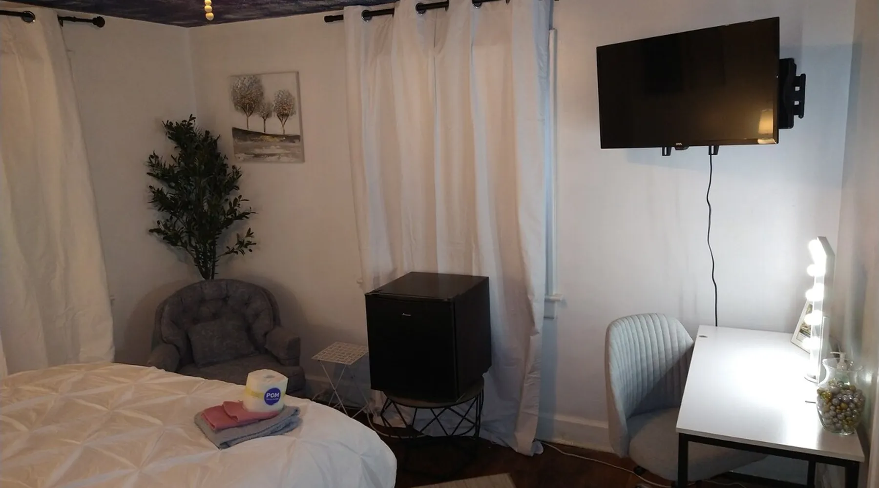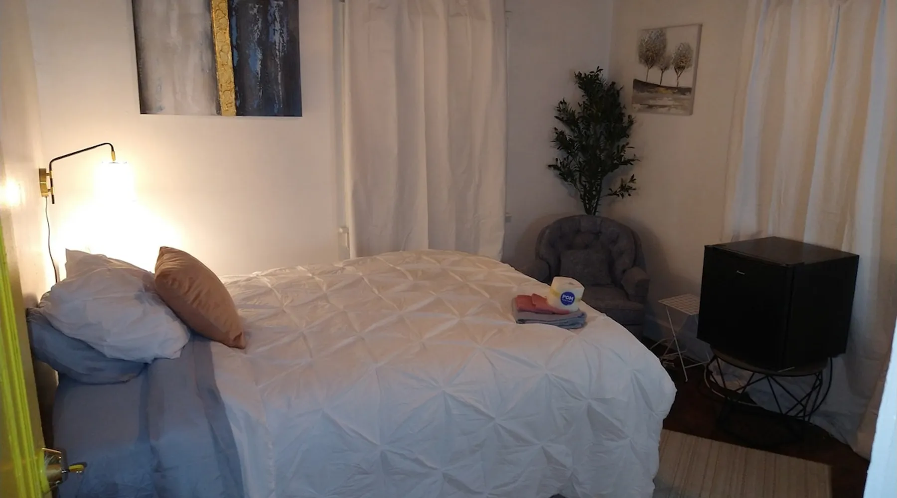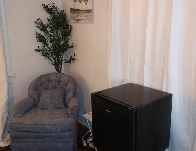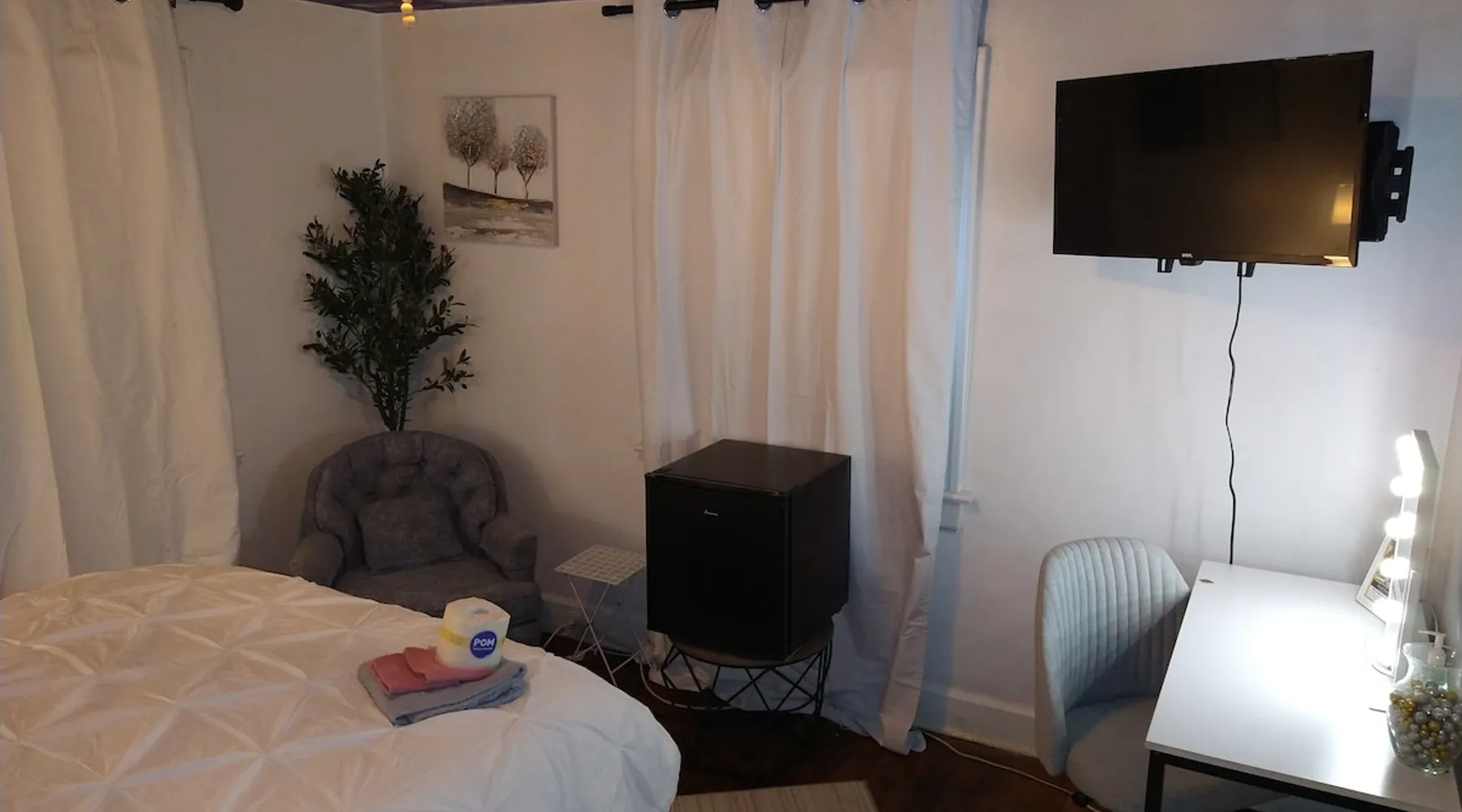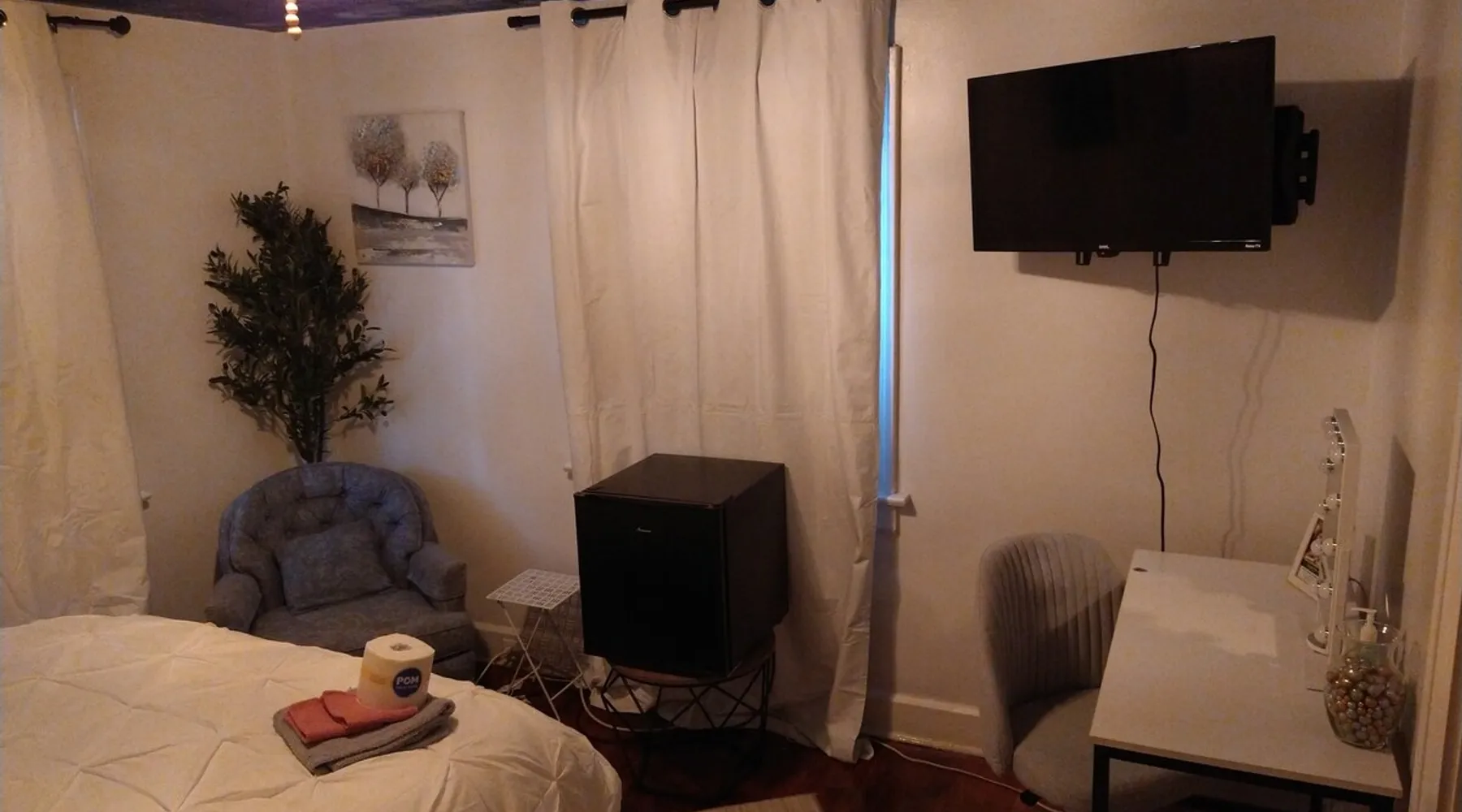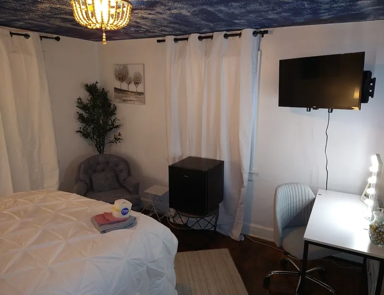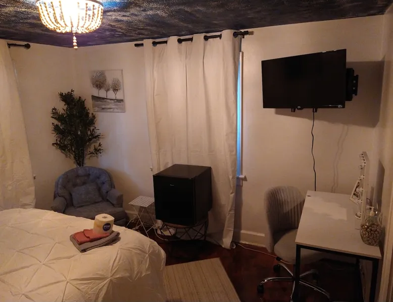 shared living. private room with lock. wifi/ cable/ laundry on premises. room has queen bed. desk with lighted mirror. mini fridge on the room. light for reading . sitting area with swivel tv for added comfortability