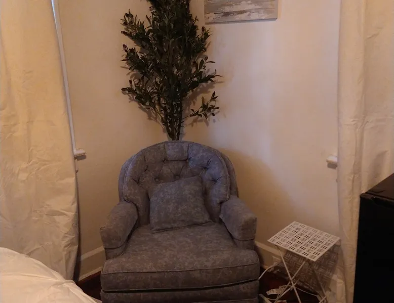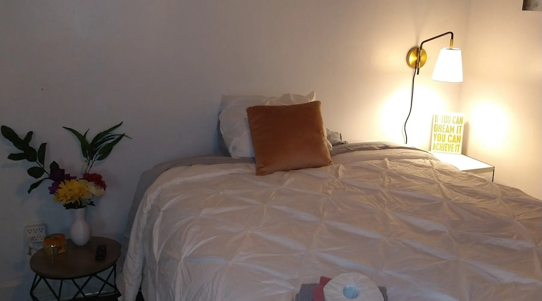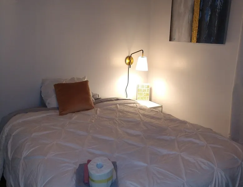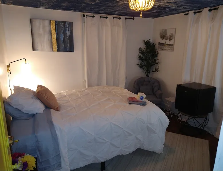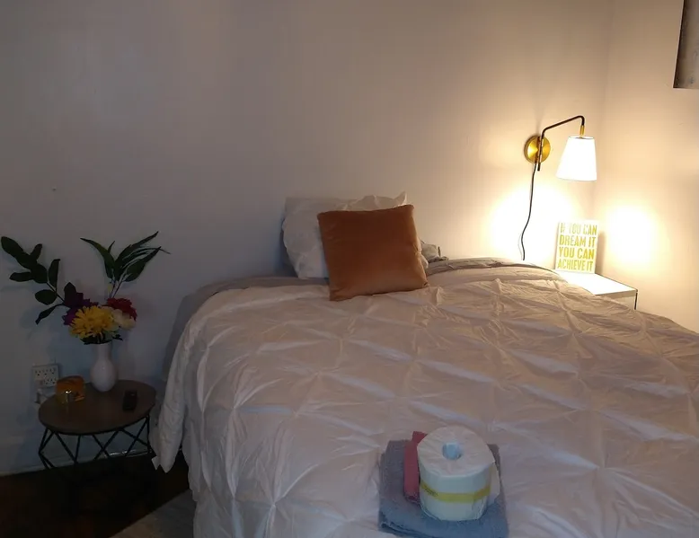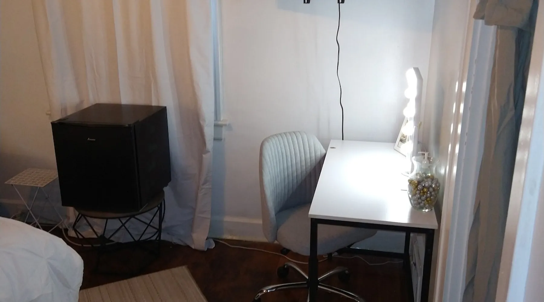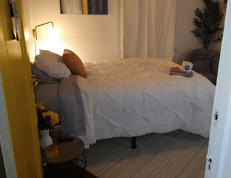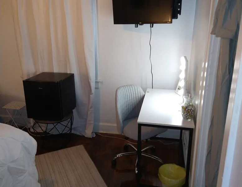 shared living. private room with lock. wifi/ cable/ laundry on premises. room has queen bed. desk with lighted mirror. mini fridge on the room. light for reading . sitting area with swivel tv for added comfortability