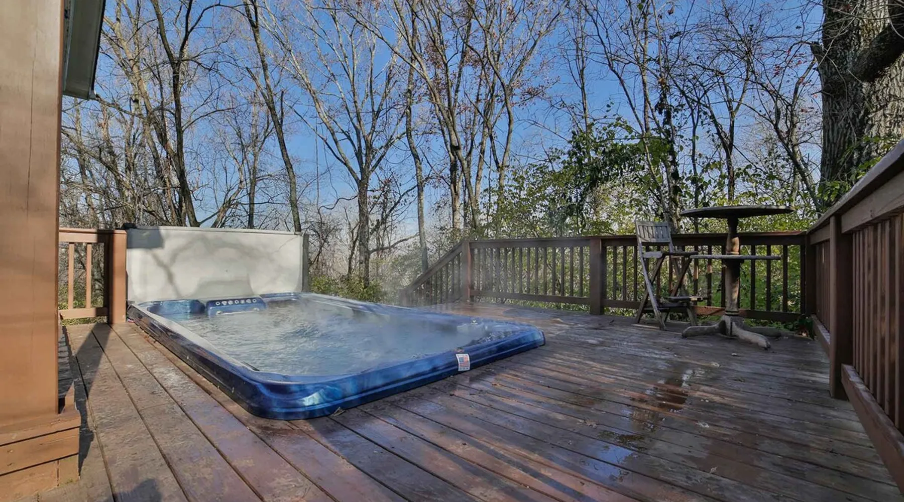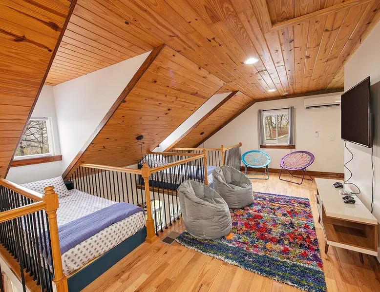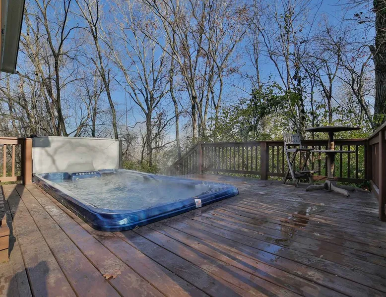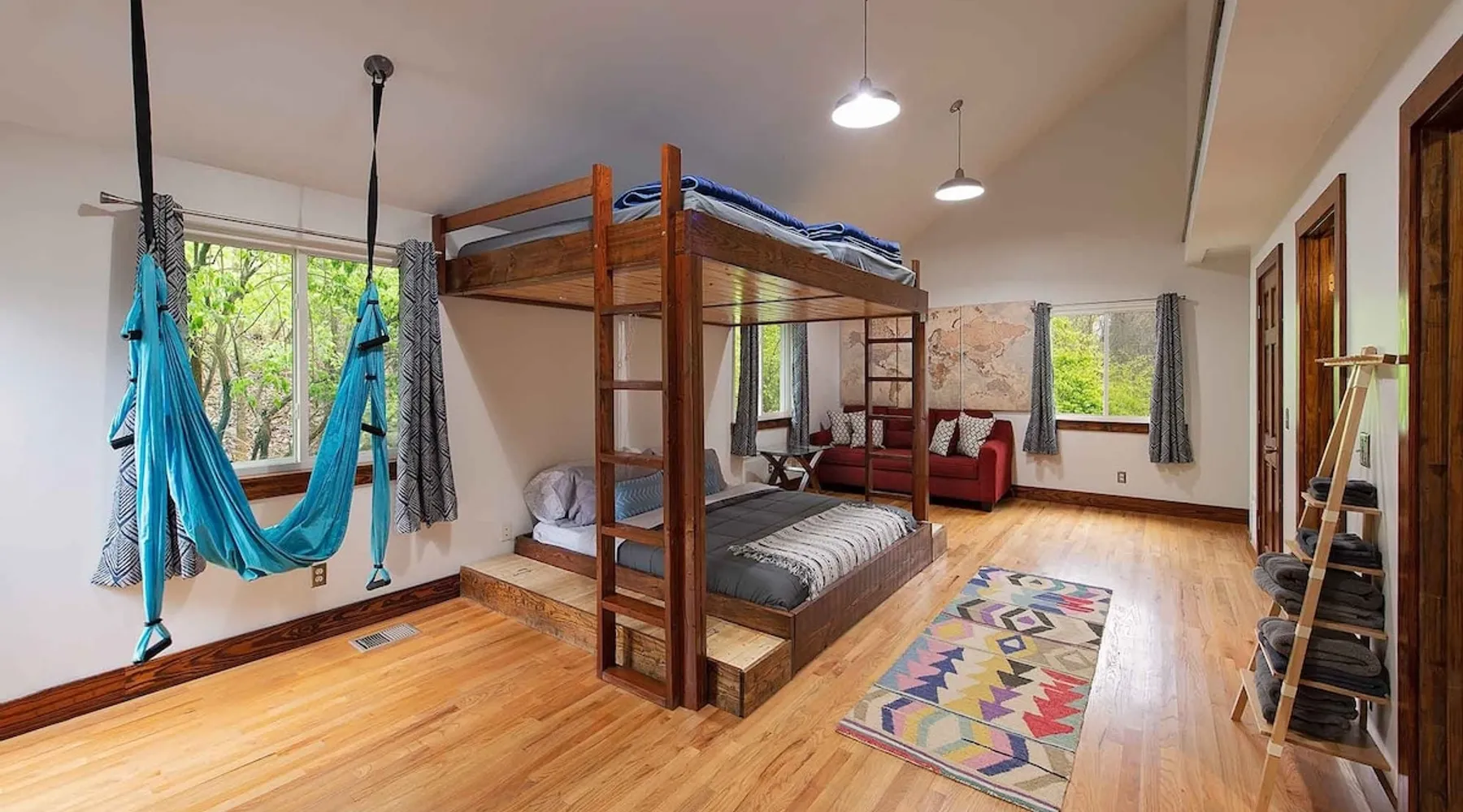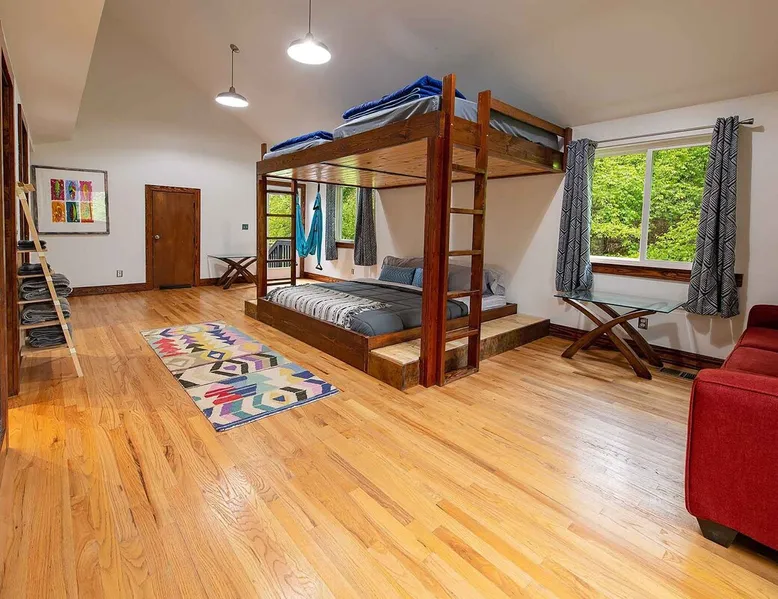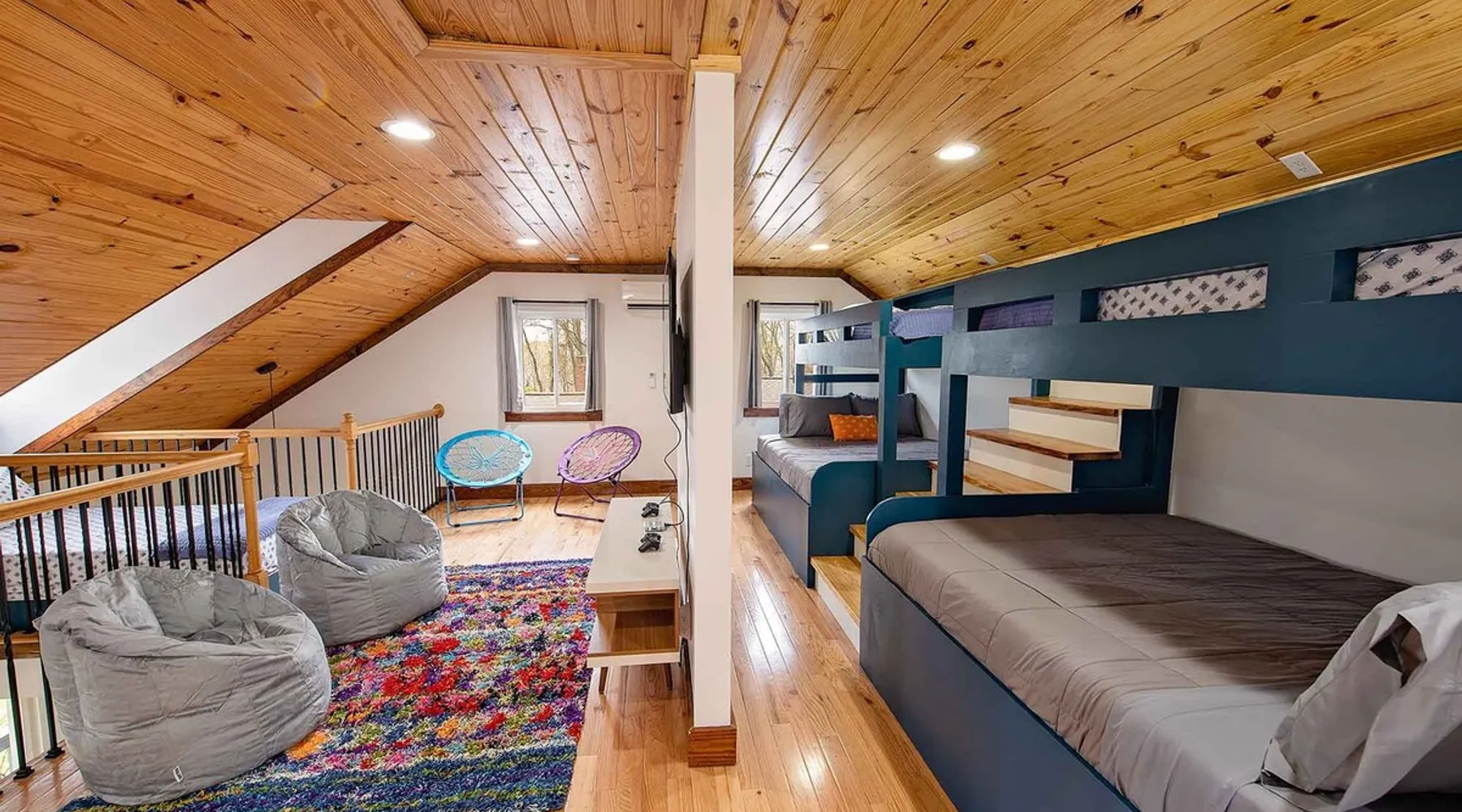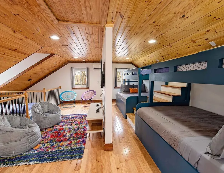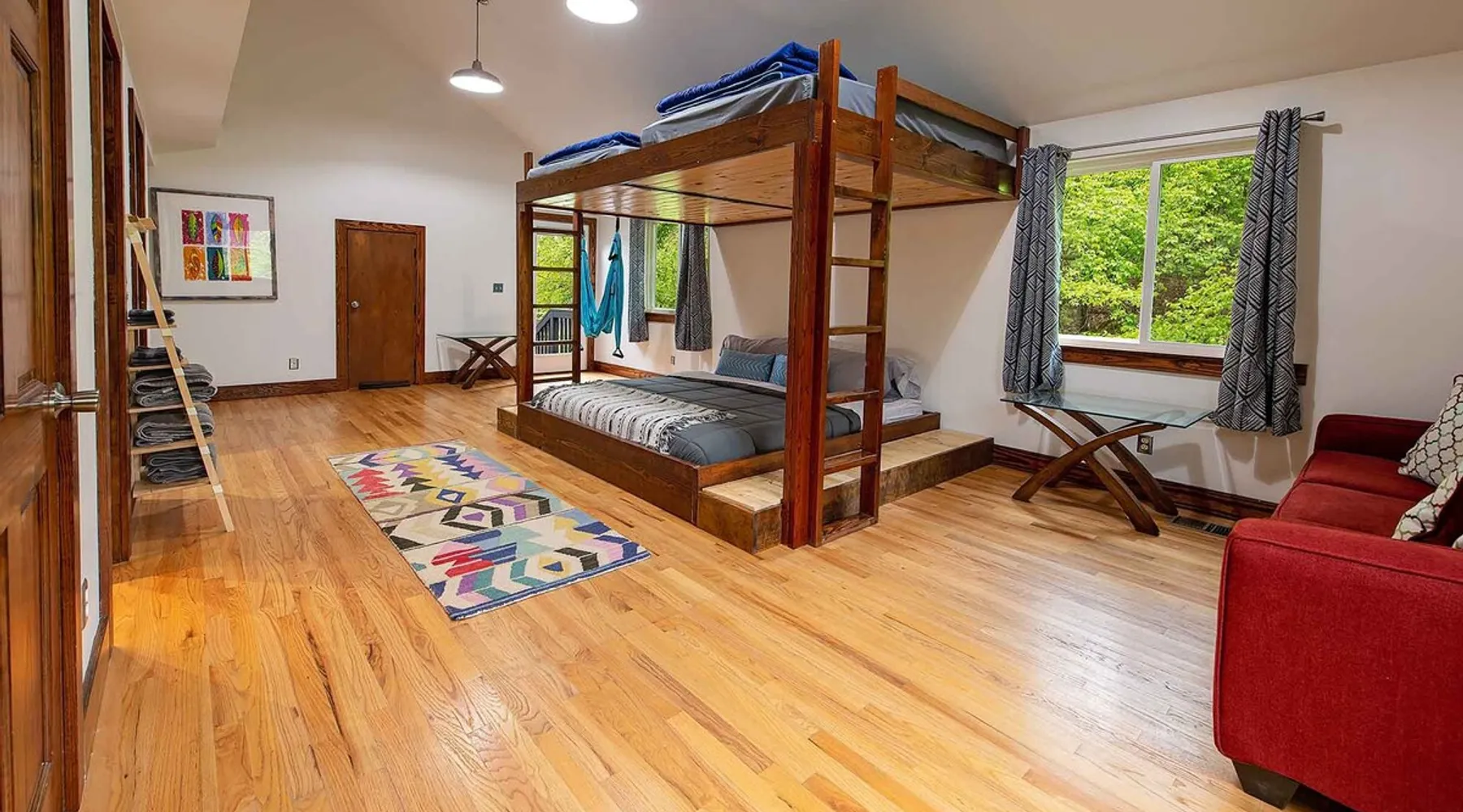This 6,500 sq. ft. home on forested land at Lookout Mountain features a heated pool, private swim spa, sauna, fire pit, trailheads, 4 suites, large kitchen, game room, deck with hanging bed, outdoor kitchen, and more. Accommodates up to 14 guests. Pool is shared, no parties. The space Pets are not allowed at this property. Please ask about our pet-friendly properties if you want to travel with a pet. The May Family Home is part of Wauhatchie Woodlands, a collection of quaint, tiny-home, rustic-comfort log cabins on a 14-acre wooded property surrounded by National Park land. The property is owned and operated by Timberroot, a small, family-owned business that specializes in creating rustic spaces that allow you to relax, recharge, and reconnect with nature. Once the personal home of Frank, Nicole, and their children, the May Family Home is the largest and most well-equipped accommodation offered at Wauhatchie Woodlands. This vacation dream home is flanked by National Park land and dense forest, with quick access to downtown Chattanooga, Ruby Falls, Lookout Mountain, and the surrounding area. The kitchen is open to dining, a dining bar, a living room with a wood burning fireplace, and directly adjacent to the massive stunning sunroom with vaulted ceilings. You will love the real wood craftsmanship, contrast in stains and colors, and a combination of rustic and contemporary style. The sunroom exits to a spacious back deck with a swinging bed, outdoor dining, and direct access to the private 14′ swim spa. On the same living level, there is a beautiful bathroom shared by a queen bedroom and the kid’s room with a lofted queen bed and built-in slide. The slide room sleeps two small people up top and has a single bed below. Across the hall is a beautiful queen bedroom larger than many master bedrooms and a stunning newly renovated bathroom. This large queen room has a TV, a small work desk, and seating for TV watching out of bed. Down the hall are the two massive loft rooms. The river-facing loft room has a private deck, picture windows, separate shower & toilet rooms, a closet, and a spacious TV den. Up in the loft are two full/twin bunks that can sleep up to six. The back loft room features two lofted full beds over a king. Also on this level are a sofa, separate shower & toilet rooms, and closet. Upstairs is the workspace with two desks and a daybed with Smart TV. Downstairs is the massive main suite with a luxurious king bed, modern armoires, a wood-burning stove, and the media area with a large sectional sofa and a 65″ curved TV. The main suite also has a large bathroom with two vanities, a walk-in shower, a deep bathing tub, and a small cedar sauna. Also on the lower living level is the fully loaded game room with a full-size pool table, ping pon top, foosball, air hockey, Smart TV, and a comfy sofa. The space also included a small fridge and freezer to keep your drinks cold while you play. Just off the game room is the laundry room with your private washer/dryer. The May Family Home is in a compound with two other homes, the Blue House and Skyuka Chalet. The homes share a stunning, heated resort-style pool with an expansive flagstone patio. On the patio, you'll find lounge seating, an outdoor fireplace, and an outdoor kitchen with a covered dining pavilion (guests must provide their own propane and firewood). Please note that the pool is closed during winter, typically from October to March. Chattanooga is a city known for its railroads. There are active train tracks that border the property to the north and I-24 is about half a mile away. Please note that light sleepers may be affected by the ambient city and train noise. The ground floor of the Chalet serves as the poolhouse for all three properties. Guests have access to the workout room, poolside showers, and toilets. The May Family Home is more than just a house; it's a true forested resort just a tiny hop from downtown Chattanooga. Pack' n Play Travel cribs are available upon request. To make sure your stay at the May Family Home is perfect, our locally based Guest Services representatives are on-call from 8 am to 11 pm, seven days a week. Guest access You'll have the entire home to yourself during your stay. The pool area and amenities are shared with two other properties, the Blue House and the Skyuka Chalet. The ground floor of the Chalet serves as the poolhouse and also shared. The May Family Home is located on the edge of Wauhatchie Woodlands, a 14-acre property surrounded by National Forest. Guests have access to trails around the grounds, as well as shared pavilions, community fire pits, and playground. Please be respectful of other guests during your stay. Other things to note Pool: The pool complex is currently open fro the summer 2023 season. Please note the pool is closed during the winter months, Typically from mid-October until April. The pool area and amenities are shared with two other properties, the Blue House and the Skyuka Chalet. The ground floor of the Chalet serves as the poolhouse and also shared. Pet Policy: Pets are not allowed at this property. If you want to travel with a pet please ask about our pet-friendly properties. Any evidence of a pet being on this property during your stay will result in a minimum $100 fine. Deposits: Please note that guests under 21 or guests residing in the Greater Chattanooga Metropolitan Area will be charged a $500 refundable deposit subsequent to receiving their booking confirmation. Please review our policy forbidding parties, events and unregistered guests to ensure your stay abides with this policy and does not jeopardize your deposit. No Smoking: Smoking, vaping, and the use of e-cigarettes is prohibited inside Timberroot properties. Refer to the rental agreement to see these policies and the additional fees that occur if you fail to follow them. Trains & Noise: Chattanooga is a city known for its railroads. There are active train tracks that border the property to 