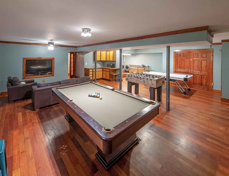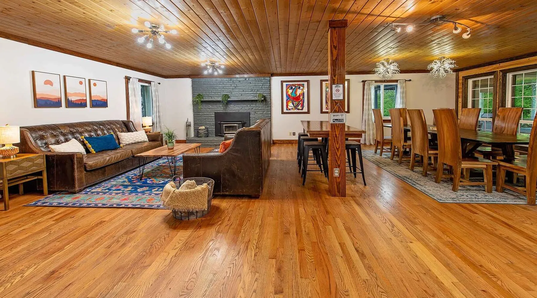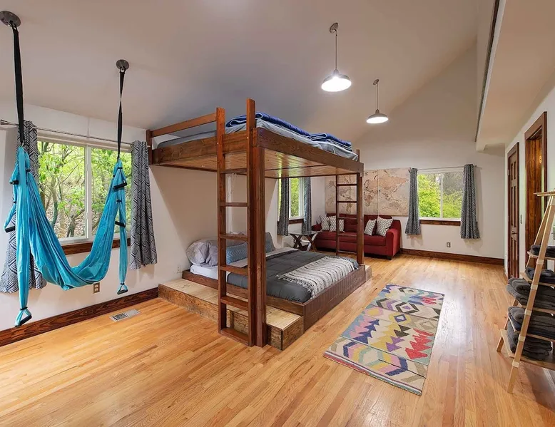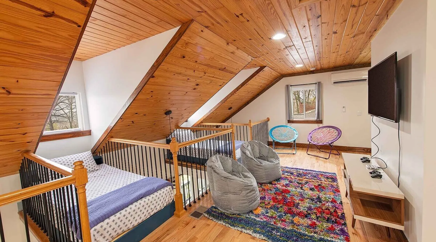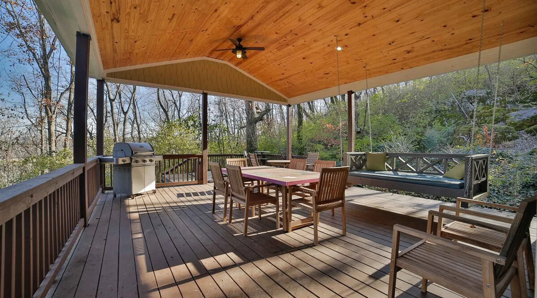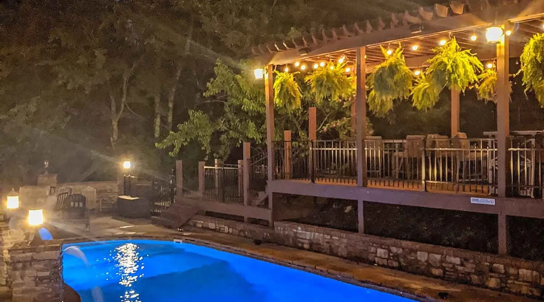 This 6,500 sq. ft. home on forested land at Lookout Mountain features a heated pool, private swim spa, sauna, fire pit, trailheads, 4 suites, large kitchen, game room, deck with hanging bed, outdoor kitchen, and more. Accommodates up to 14 guests. Pool is shared, no parties. The space Pets are not allowed at this property. Please ask about our pet-friendly properties if you want to travel with a pet. The May Family Home is part of Wauhatchie Woodlands, a collection of quaint, tiny-home, rustic-comfort log cabins on a 14-acre wooded property surrounded by National Park land. The property is owned and operated by Timberroot, a small, family-owned business that specializes in creating rustic spaces that allow you to relax, recharge, and reconnect with nature. Once the personal home of Frank, Nicole, and their children, the May Family Home is the largest and most well-equipped accommodation offered at Wauhatchie Woodlands. This vacation dream home is flanked by National Park land and dense forest, with quick access to downtown Chattanooga, Ruby Falls, Lookout Mountain, and the surrounding area. The kitchen is open to dining, a dining bar, a living room with a wood burning fireplace, and directly adjacent to the massive stunning sunroom with vaulted ceilings. You will love the real wood craftsmanship, contrast in stains and colors, and a combination of rustic and contemporary style. The sunroom exits to a spacious back deck with a swinging bed, outdoor dining, and direct access to the private 14′ swim spa. On the same living level, there is a beautiful bathroom shared by a queen bedroom and the kid’s room with a lofted queen bed and built-in slide. The slide room sleeps two small people up top and has a single bed below. Across the hall is a beautiful queen bedroom larger than many master bedrooms and a stunning newly renovated bathroom. This large queen room has a TV, a small work desk, and seating for TV watching out of bed. Down the hall are the two massive loft rooms. The river-facing loft room has a private deck, picture windows, separate shower & toilet rooms, a closet, and a spacious TV den. Up in the loft are two full/twin bunks that can sleep up to six. The back loft room features two lofted full beds over a king. Also on this level are a sofa, separate shower & toilet rooms, and closet. Upstairs is the workspace with two desks and a daybed with Smart TV. Downstairs is the massive main suite with a luxurious king bed, modern armoires, a wood-burning stove, and the media area with a large sectional sofa and a 65″ curved TV. The main suite also has a large bathroom with two vanities, a walk-in shower, a deep bathing tub, and a small cedar sauna. Also on the lower living level is the fully loaded game room with a full-size pool table, ping pon top, foosball, air hockey, Smart TV, and a comfy sofa. The space also included a small fridge and freezer to keep your drinks cold while you play. Just off the game room is the laundry room with your private washer/dryer. The May Family Home is in a compound with two other homes, the Blue House and Skyuka Chalet. The homes share a stunning, heated resort-style pool with an expansive flagstone patio. On the patio, you'll find lounge seating, an outdoor fireplace, and an outdoor kitchen with a covered dining pavilion (guests must provide their own propane and firewood). Please note that the pool is closed during winter, typically from October to March. Chattanooga is a city known for its railroads. There are active train tracks that border the property to the north and I-24 is about half a mile away. Please note that light sleepers may be affected by the ambient city and train noise. The ground floor of the Chalet serves as the poolhouse for all three properties. Guests have access to the workout room, poolside showers, and toilets. The May Family Home is more than just a house; it's a true forested resort just a tiny hop from downtown Chattanooga. Pack' n Play Travel cribs are available upon request. To make sure your stay at the May Family Home is perfect, our locally based Guest Services representatives are on-call from 8 am to 11 pm, seven days a week. Guest access You'll have the entire home to yourself during your stay. The pool area and amenities are shared with two other properties, the Blue House and the Skyuka Chalet. The ground floor of the Chalet serves as the poolhouse and also shared. The May Family Home is located on the edge of Wauhatchie Woodlands, a 14-acre property surrounded by National Forest. Guests have access to trails around the grounds, as well as shared pavilions, community fire pits, and playground. Please be respectful of other guests during your stay. Other things to note Pool: The pool complex is currently open fro the summer 2023 season. Please note the pool is closed during the winter months, Typically from mid-October until April. The pool area and amenities are shared with two other properties, the Blue House and the Skyuka Chalet. The ground floor of the Chalet serves as the poolhouse and also shared. Pet Policy: Pets are not allowed at this property. If you want to travel with a pet please ask about our pet-friendly properties. Any evidence of a pet being on this property during your stay will result in a minimum $100 fine. Deposits: Please note that guests under 21 or guests residing in the Greater Chattanooga Metropolitan Area will be charged a $500 refundable deposit subsequent to receiving their booking confirmation. Please review our policy forbidding parties, events and unregistered guests to ensure your stay abides with this policy and does not jeopardize your deposit. No Smoking: Smoking, vaping, and the use of e-cigarettes is prohibited inside Timberroot properties. Refer to the rental agreement to see these policies and the additional fees that occur if you fail to follow them. Trains & Noise: Chattanooga is a city known for its railroads. There are active train tracks that border the property to 