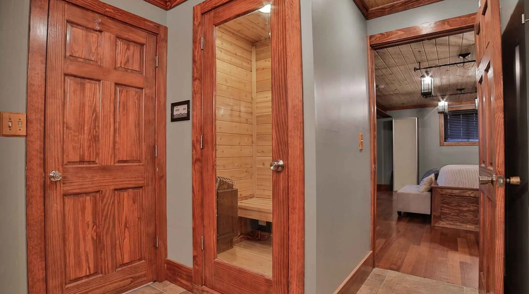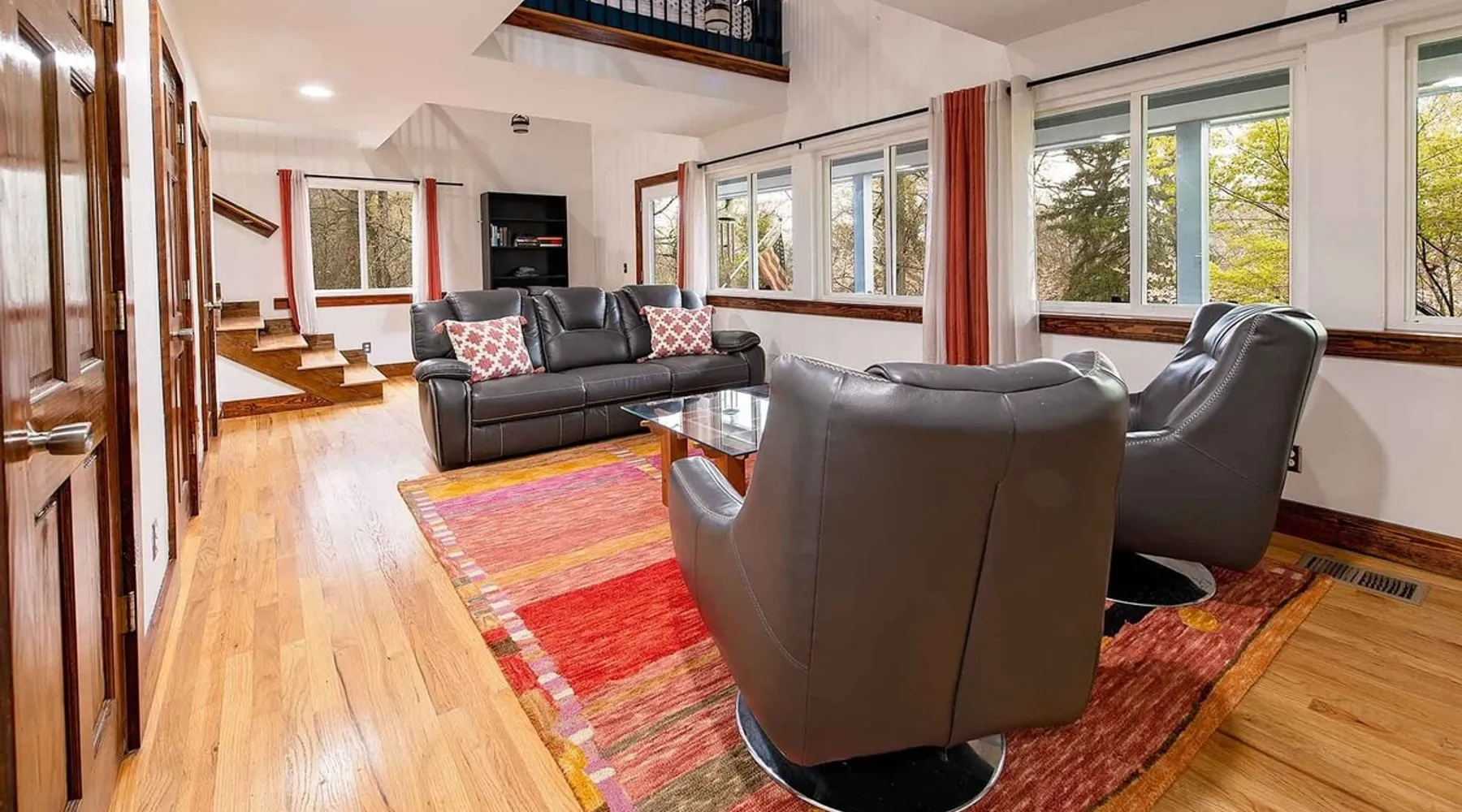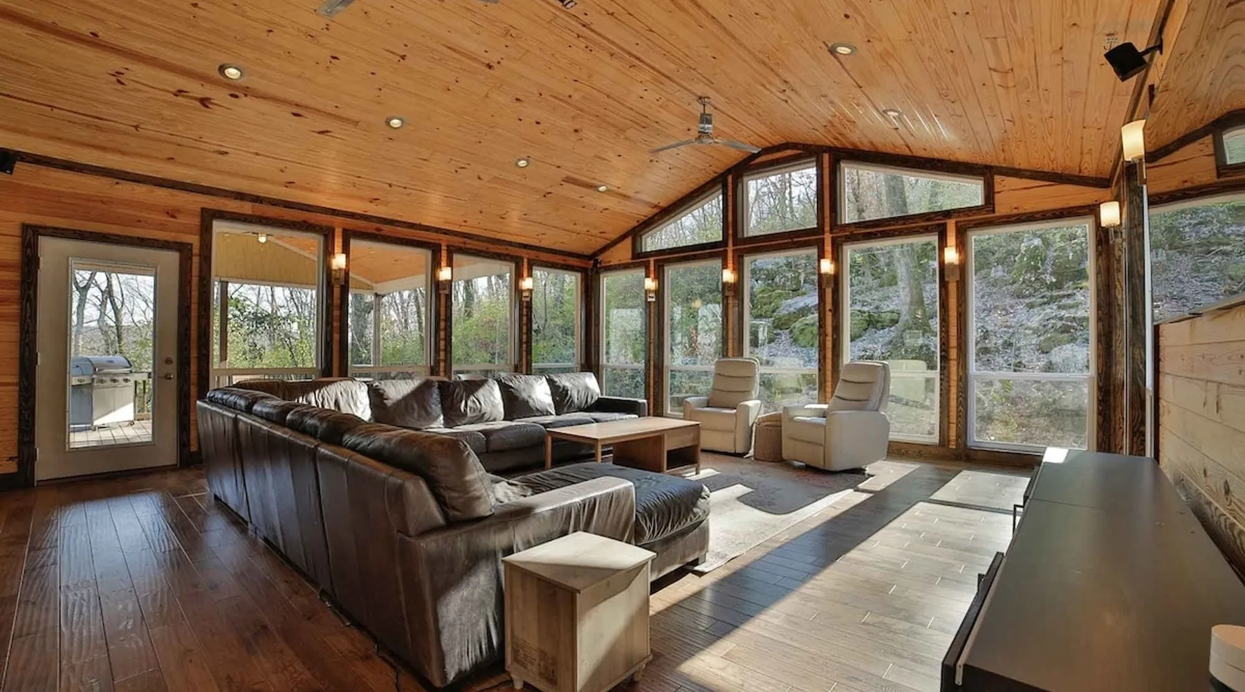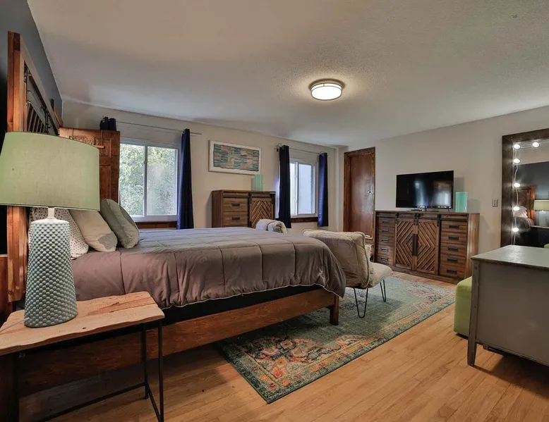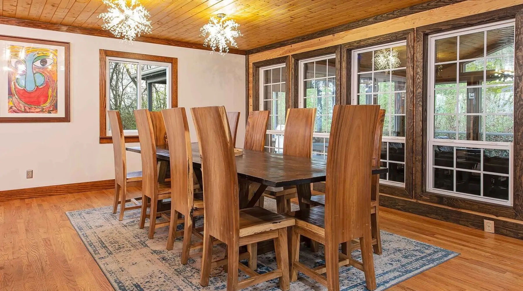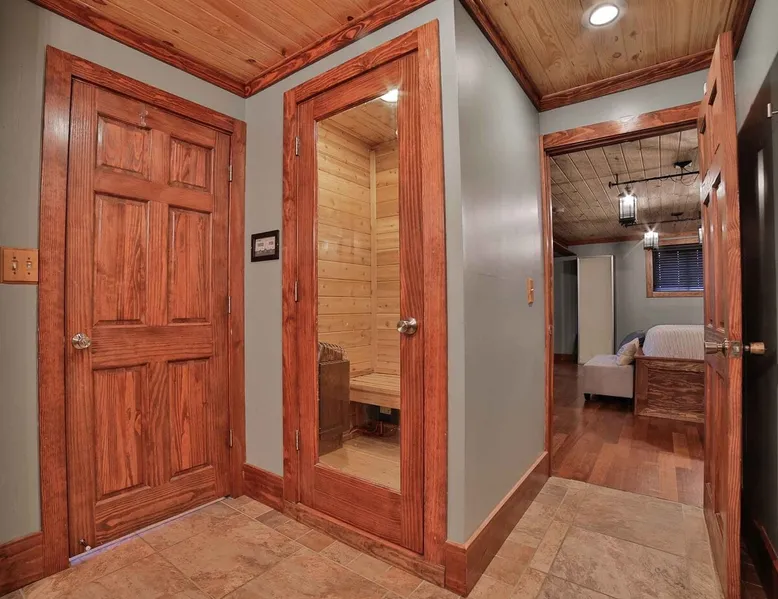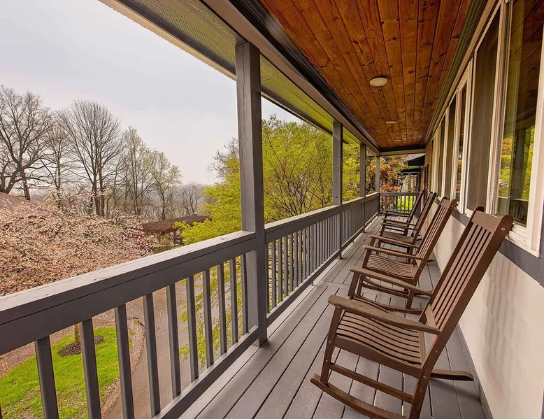 This 6,500 sq. ft. home on forested land at Lookout Mountain features a heated pool, private swim spa, sauna, fire pit, trailheads, 4 suites, large kitchen, game room, deck with hanging bed, outdoor kitchen, and more. Accommodates up to 14 guests. Pool is shared, no parties. The space Pets are not allowed at this property. Please ask about our pet-friendly properties if you want to travel with a pet. The May Family Home is part of Wauhatchie Woodlands, a collection of quaint, tiny-home, rustic-comfort log cabins on a 14-acre wooded property surrounded by National Park land. The property is owned and operated by Timberroot, a small, family-owned business that specializes in creating rustic spaces that allow you to relax, recharge, and reconnect with nature. Once the personal home of Frank, Nicole, and their children, the May Family Home is the largest and most well-equipped accommodation offered at Wauhatchie Woodlands. This vacation dream home is flanked by National Park land and dense forest, with quick access to downtown Chattanooga, Ruby Falls, Lookout Mountain, and the surrounding area. The kitchen is open to dining, a dining bar, a living room with a wood burning fireplace, and directly adjacent to the massive stunning sunroom with vaulted ceilings. You will love the real wood craftsmanship, contrast in stains and colors, and a combination of rustic and contemporary style. The sunroom exits to a spacious back deck with a swinging bed, outdoor dining, and direct access to the private 14′ swim spa. On the same living level, there is a beautiful bathroom shared by a queen bedroom and the kid’s room with a lofted queen bed and built-in slide. The slide room sleeps two small people up top and has a single bed below. Across the hall is a beautiful queen bedroom larger than many master bedrooms and a stunning newly renovated bathroom. This large queen room has a TV, a small work desk, and seating for TV watching out of bed. Down the hall are the two massive loft rooms. The river-facing loft room has a private deck, picture windows, separate shower & toilet rooms, a closet, and a spacious TV den. Up in the loft are two full/twin bunks that can sleep up to six. The back loft room features two lofted full beds over a king. Also on this level are a sofa, separate shower & toilet rooms, and closet. Upstairs is the workspace with two desks and a daybed with Smart TV. Downstairs is the massive main suite with a luxurious king bed, modern armoires, a wood-burning stove, and the media area with a large sectional sofa and a 65″ curved TV. The main suite also has a large bathroom with two vanities, a walk-in shower, a deep bathing tub, and a small cedar sauna. Also on the lower living level is the fully loaded game room with a full-size pool table, ping pon top, foosball, air hockey, Smart TV, and a comfy sofa. The space also included a small fridge and freezer to keep your drinks cold while you play. Just off the game room is the laundry room with your private washer/dryer. The May Family Home is in a compound with two other homes, the Blue House and Skyuka Chalet. The homes share a stunning, heated resort-style pool with an expansive flagstone patio. On the patio, you'll find lounge seating, an outdoor fireplace, and an outdoor kitchen with a covered dining pavilion (guests must provide their own propane and firewood). Please note that the pool is closed during winter, typically from October to March. Chattanooga is a city known for its railroads. There are active train tracks that border the property to the north and I-24 is about half a mile away. Please note that light sleepers may be affected by the ambient city and train noise. The ground floor of the Chalet serves as the poolhouse for all three properties. Guests have access to the workout room, poolside showers, and toilets. The May Family Home is more than just a house; it's a true forested resort just a tiny hop from downtown Chattanooga. Pack' n Play Travel cribs are available upon request. To make sure your stay at the May Family Home is perfect, our locally based Guest Services representatives are on-call from 8 am to 11 pm, seven days a week. Guest access You'll have the entire home to yourself during your stay. The pool area and amenities are shared with two other properties, the Blue House and the Skyuka Chalet. The ground floor of the Chalet serves as the poolhouse and also shared. The May Family Home is located on the edge of Wauhatchie Woodlands, a 14-acre property surrounded by National Forest. Guests have access to trails around the grounds, as well as shared pavilions, community fire pits, and playground. Please be respectful of other guests during your stay. Other things to note Pool: The pool complex is currently open fro the summer 2023 season. Please note the pool is closed during the winter months, Typically from mid-October until April. The pool area and amenities are shared with two other properties, the Blue House and the Skyuka Chalet. The ground floor of the Chalet serves as the poolhouse and also shared. Pet Policy: Pets are not allowed at this property. If you want to travel with a pet please ask about our pet-friendly properties. Any evidence of a pet being on this property during your stay will result in a minimum $100 fine. Deposits: Please note that guests under 21 or guests residing in the Greater Chattanooga Metropolitan Area will be charged a $500 refundable deposit subsequent to receiving their booking confirmation. Please review our policy forbidding parties, events and unregistered guests to ensure your stay abides with this policy and does not jeopardize your deposit. No Smoking: Smoking, vaping, and the use of e-cigarettes is prohibited inside Timberroot properties. Refer to the rental agreement to see these policies and the additional fees that occur if you fail to follow them. Trains & Noise: Chattanooga is a city known for its railroads. There are active train tracks that border the property to 