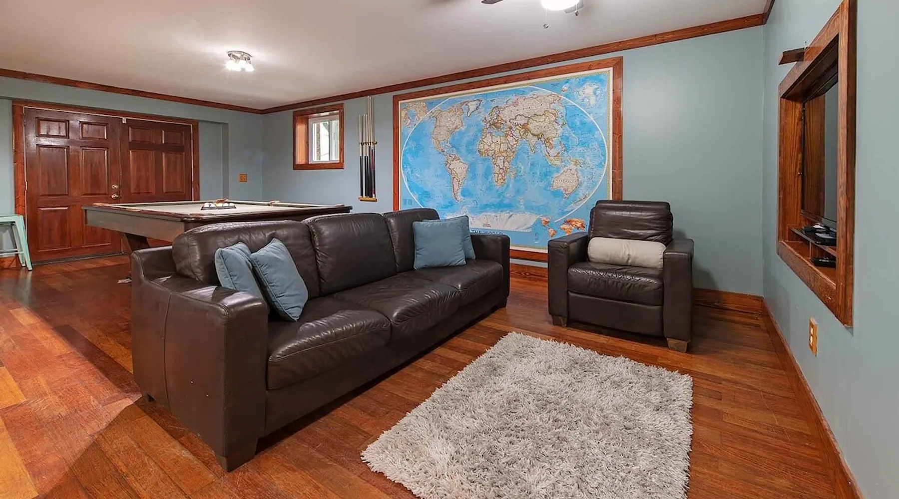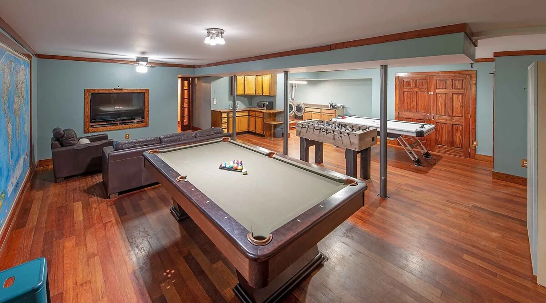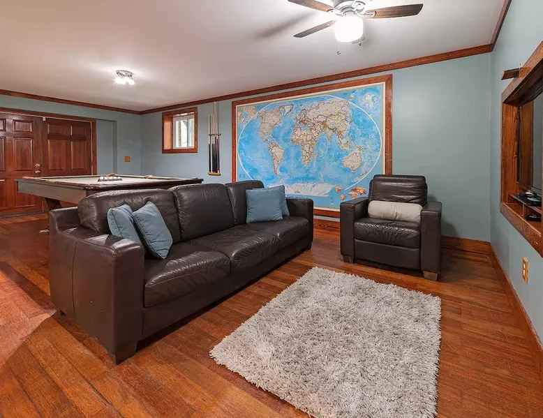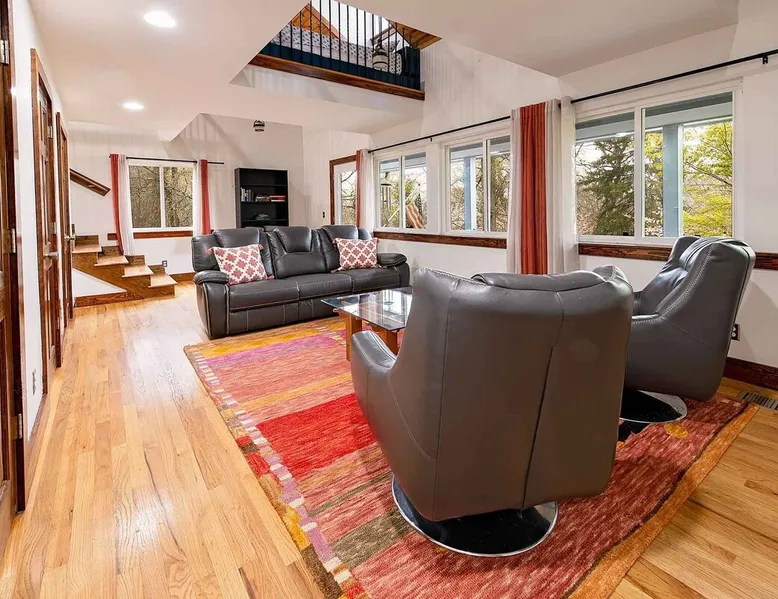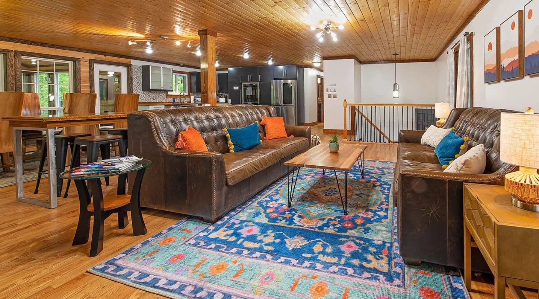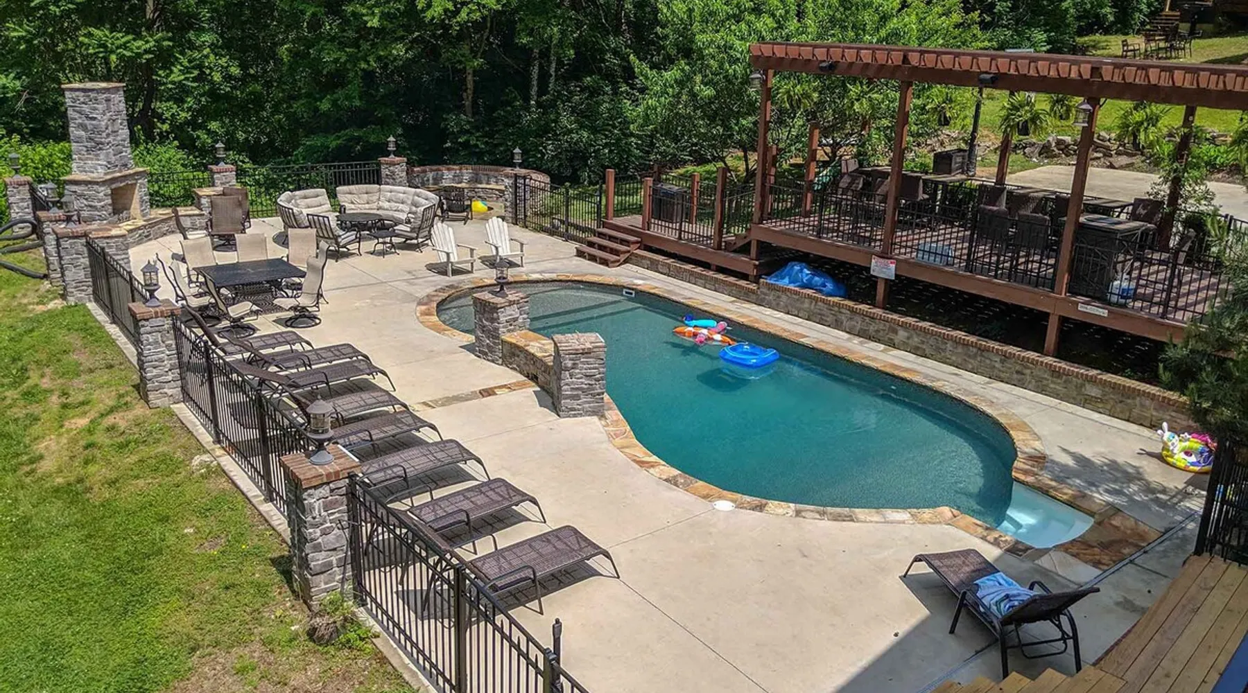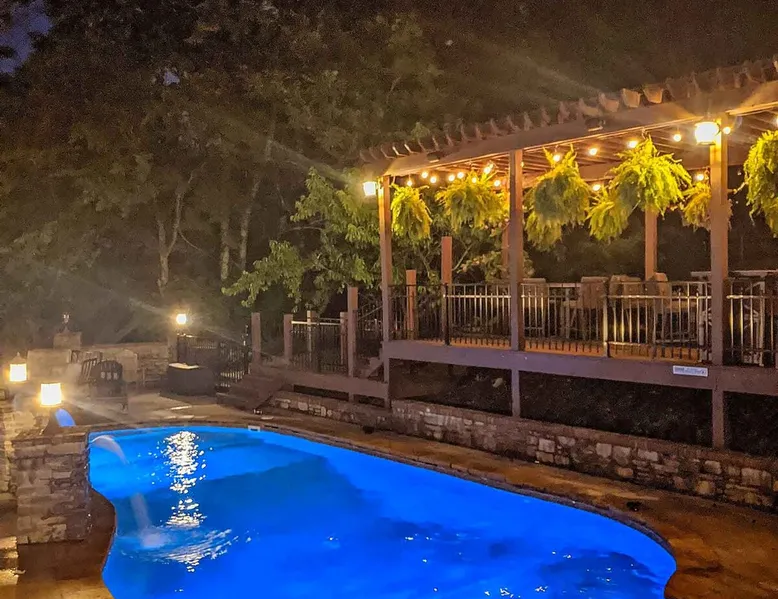 This 6,500 sq. ft. home on forested land at Lookout Mountain features a heated pool, private swim spa, sauna, fire pit, trailheads, 4 suites, large kitchen, game room, deck with hanging bed, outdoor kitchen, and more. Accommodates up to 14 guests. Pool is shared, no parties. The space Pets are not allowed at this property. Please ask about our pet-friendly properties if you want to travel with a pet. The May Family Home is part of Wauhatchie Woodlands, a collection of quaint, tiny-home, rustic-comfort log cabins on a 14-acre wooded property surrounded by National Park land. The property is owned and operated by Timberroot, a small, family-owned business that specializes in creating rustic spaces that allow you to relax, recharge, and reconnect with nature. Once the personal home of Frank, Nicole, and their children, the May Family Home is the largest and most well-equipped accommodation offered at Wauhatchie Woodlands. This vacation dream home is flanked by National Park land and dense forest, with quick access to downtown Chattanooga, Ruby Falls, Lookout Mountain, and the surrounding area. The kitchen is open to dining, a dining bar, a living room with a wood burning fireplace, and directly adjacent to the massive stunning sunroom with vaulted ceilings. You will love the real wood craftsmanship, contrast in stains and colors, and a combination of rustic and contemporary style. The sunroom exits to a spacious back deck with a swinging bed, outdoor dining, and direct access to the private 14′ swim spa. On the same living level, there is a beautiful bathroom shared by a queen bedroom and the kid’s room with a lofted queen bed and built-in slide. The slide room sleeps two small people up top and has a single bed below. Across the hall is a beautiful queen bedroom larger than many master bedrooms and a stunning newly renovated bathroom. This large queen room has a TV, a small work desk, and seating for TV watching out of bed. Down the hall are the two massive loft rooms. The river-facing loft room has a private deck, picture windows, separate shower & toilet rooms, a closet, and a spacious TV den. Up in the loft are two full/twin bunks that can sleep up to six. The back loft room features two lofted full beds over a king. Also on this level are a sofa, separate shower & toilet rooms, and closet. Upstairs is the workspace with two desks and a daybed with Smart TV. Downstairs is the massive main suite with a luxurious king bed, modern armoires, a wood-burning stove, and the media area with a large sectional sofa and a 65″ curved TV. The main suite also has a large bathroom with two vanities, a walk-in shower, a deep bathing tub, and a small cedar sauna. Also on the lower living level is the fully loaded game room with a full-size pool table, ping pon top, foosball, air hockey, Smart TV, and a comfy sofa. The space also included a small fridge and freezer to keep your drinks cold while you play. Just off the game room is the laundry room with your private washer/dryer. The May Family Home is in a compound with two other homes, the Blue House and Skyuka Chalet. The homes share a stunning, heated resort-style pool with an expansive flagstone patio. On the patio, you'll find lounge seating, an outdoor fireplace, and an outdoor kitchen with a covered dining pavilion (guests must provide their own propane and firewood). Please note that the pool is closed during winter, typically from October to March. Chattanooga is a city known for its railroads. There are active train tracks that border the property to the north and I-24 is about half a mile away. Please note that light sleepers may be affected by the ambient city and train noise. The ground floor of the Chalet serves as the poolhouse for all three properties. Guests have access to the workout room, poolside showers, and toilets. The May Family Home is more than just a house; it's a true forested resort just a tiny hop from downtown Chattanooga. Pack' n Play Travel cribs are available upon request. To make sure your stay at the May Family Home is perfect, our locally based Guest Services representatives are on-call from 8 am to 11 pm, seven days a week. Guest access You'll have the entire home to yourself during your stay. The pool area and amenities are shared with two other properties, the Blue House and the Skyuka Chalet. The ground floor of the Chalet serves as the poolhouse and also shared. The May Family Home is located on the edge of Wauhatchie Woodlands, a 14-acre property surrounded by National Forest. Guests have access to trails around the grounds, as well as shared pavilions, community fire pits, and playground. Please be respectful of other guests during your stay. Other things to note Pool: The pool complex is currently open fro the summer 2023 season. Please note the pool is closed during the winter months, Typically from mid-October until April. The pool area and amenities are shared with two other properties, the Blue House and the Skyuka Chalet. The ground floor of the Chalet serves as the poolhouse and also shared. Pet Policy: Pets are not allowed at this property. If you want to travel with a pet please ask about our pet-friendly properties. Any evidence of a pet being on this property during your stay will result in a minimum $100 fine. Deposits: Please note that guests under 21 or guests residing in the Greater Chattanooga Metropolitan Area will be charged a $500 refundable deposit subsequent to receiving their booking confirmation. Please review our policy forbidding parties, events and unregistered guests to ensure your stay abides with this policy and does not jeopardize your deposit. No Smoking: Smoking, vaping, and the use of e-cigarettes is prohibited inside Timberroot properties. Refer to the rental agreement to see these policies and the additional fees that occur if you fail to follow them. Trains & Noise: Chattanooga is a city known for its railroads. There are active train tracks that border the property to 