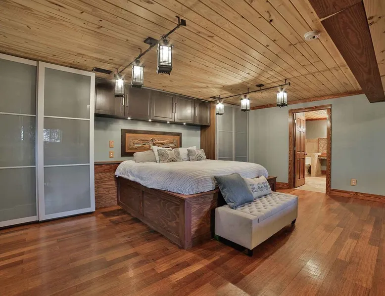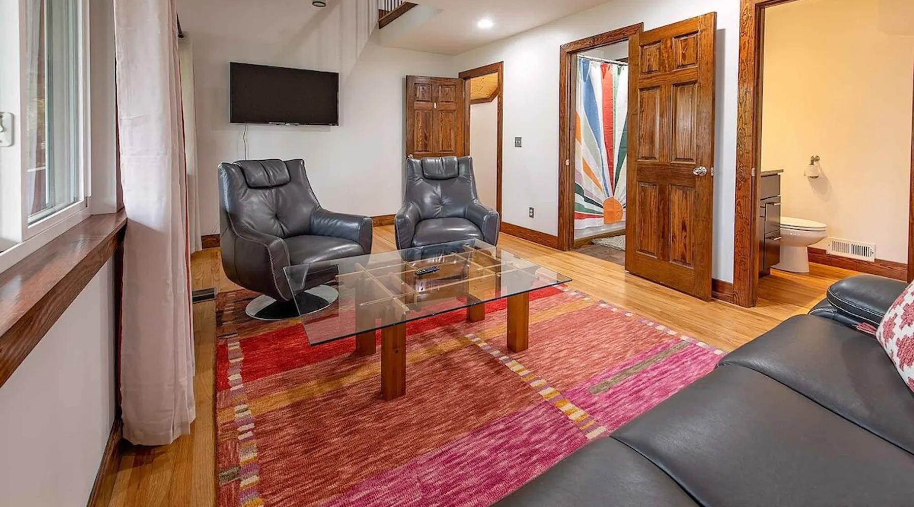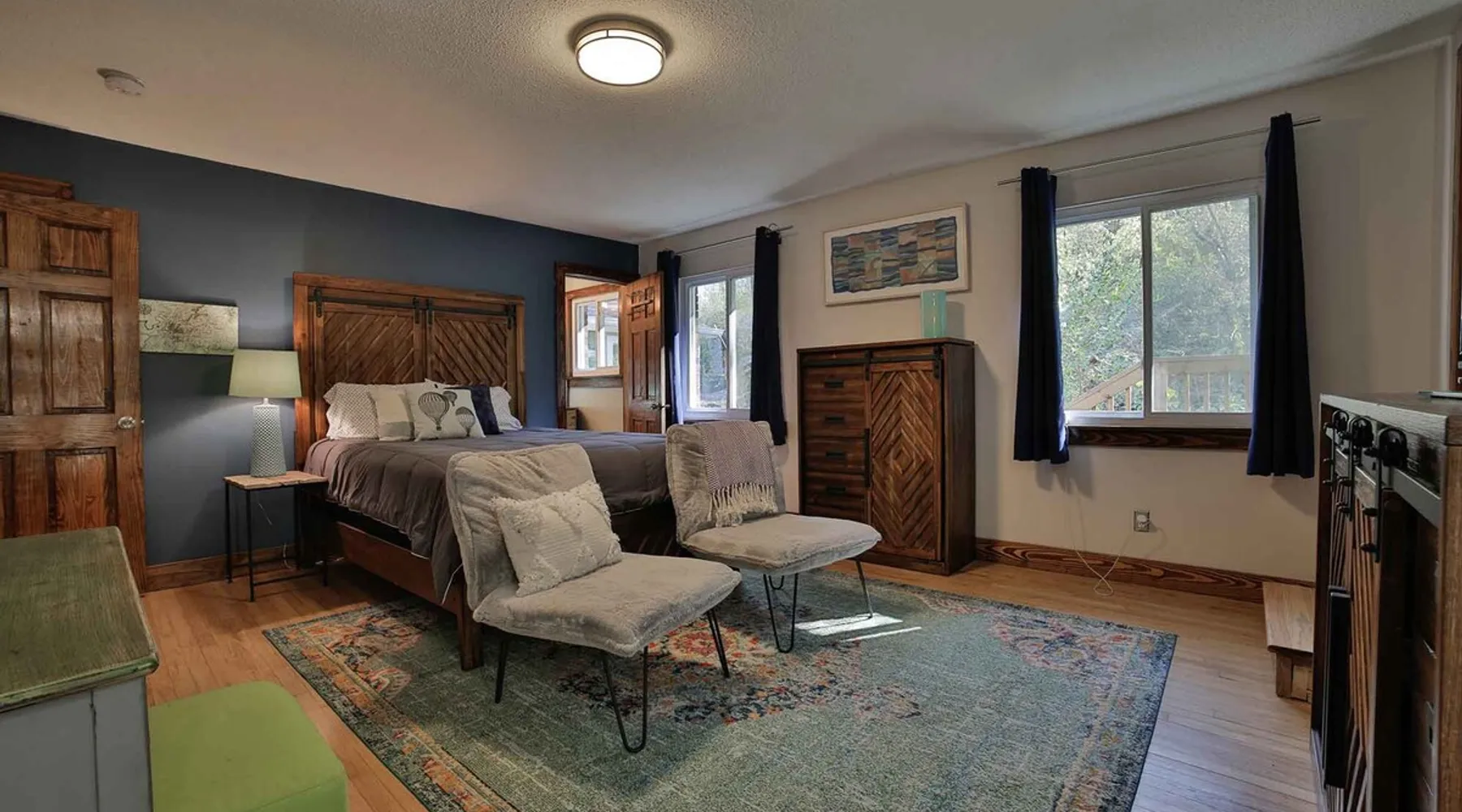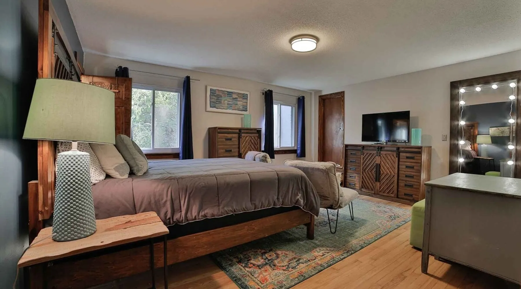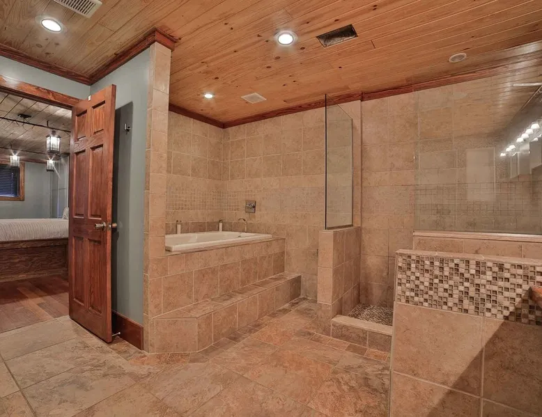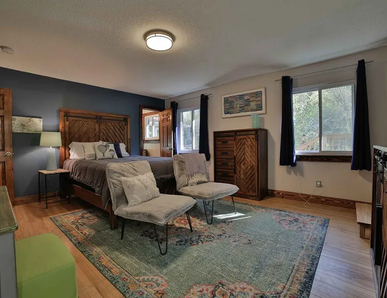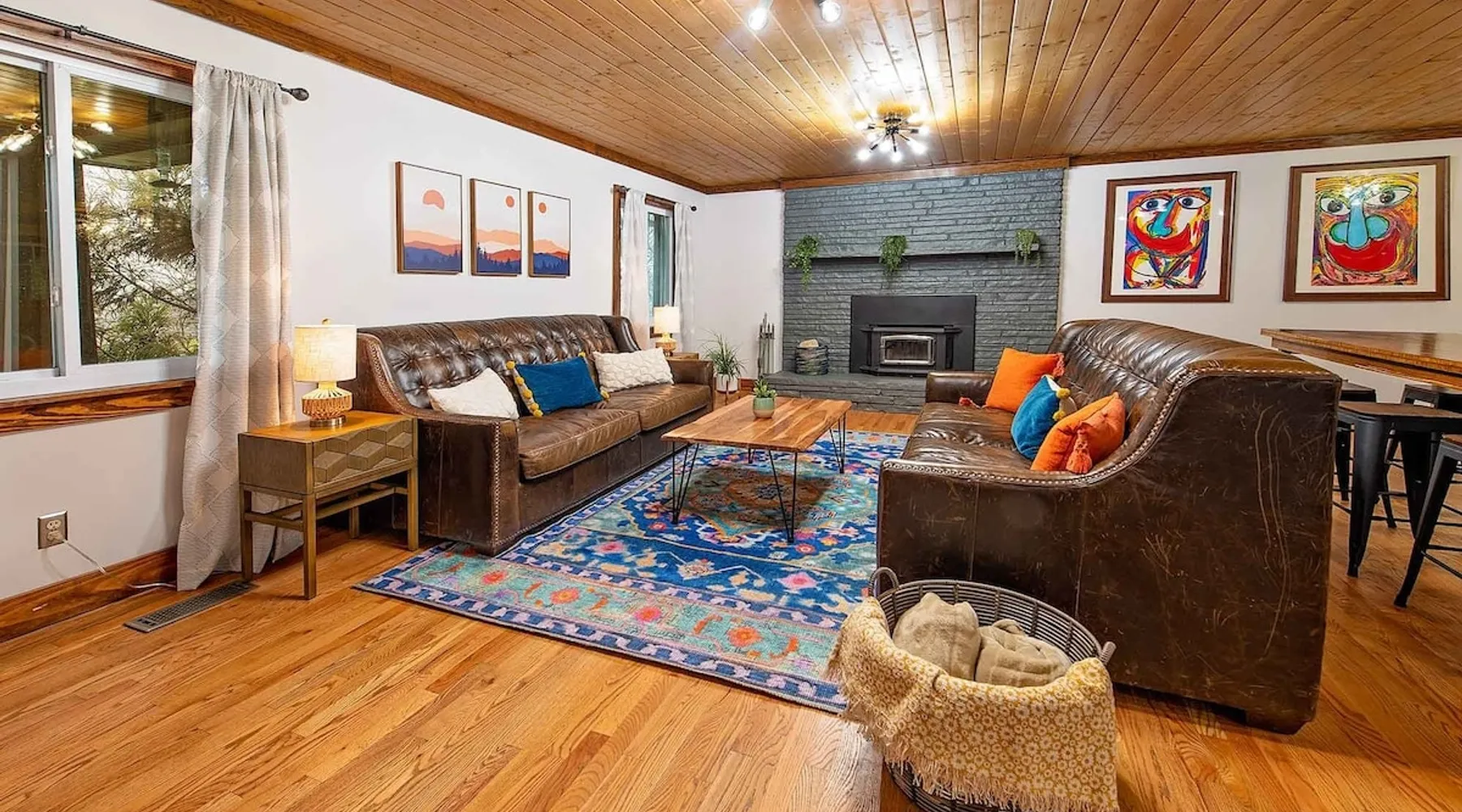 This 6,500 sq. ft. home on forested land at Lookout Mountain features a heated pool, private swim spa, sauna, fire pit, trailheads, 4 suites, large kitchen, game room, deck with hanging bed, outdoor kitchen, and more. Accommodates up to 14 guests. Pool is shared, no parties. The space Pets are not allowed at this property. Please ask about our pet-friendly properties if you want to travel with a pet. The May Family Home is part of Wauhatchie Woodlands, a collection of quaint, tiny-home, rustic-comfort log cabins on a 14-acre wooded property surrounded by National Park land. The property is owned and operated by Timberroot, a small, family-owned business that specializes in creating rustic spaces that allow you to relax, recharge, and reconnect with nature. Once the personal home of Frank, Nicole, and their children, the May Family Home is the largest and most well-equipped accommodation offered at Wauhatchie Woodlands. This vacation dream home is flanked by National Park land and dense forest, with quick access to downtown Chattanooga, Ruby Falls, Lookout Mountain, and the surrounding area. The kitchen is open to dining, a dining bar, a living room with a wood burning fireplace, and directly adjacent to the massive stunning sunroom with vaulted ceilings. You will love the real wood craftsmanship, contrast in stains and colors, and a combination of rustic and contemporary style. The sunroom exits to a spacious back deck with a swinging bed, outdoor dining, and direct access to the private 14′ swim spa. On the same living level, there is a beautiful bathroom shared by a queen bedroom and the kid’s room with a lofted queen bed and built-in slide. The slide room sleeps two small people up top and has a single bed below. Across the hall is a beautiful queen bedroom larger than many master bedrooms and a stunning newly renovated bathroom. This large queen room has a TV, a small work desk, and seating for TV watching out of bed. Down the hall are the two massive loft rooms. The river-facing loft room has a private deck, picture windows, separate shower & toilet rooms, a closet, and a spacious TV den. Up in the loft are two full/twin bunks that can sleep up to six. The back loft room features two lofted full beds over a king. Also on this level are a sofa, separate shower & toilet rooms, and closet. Upstairs is the workspace with two desks and a daybed with Smart TV. Downstairs is the massive main suite with a luxurious king bed, modern armoires, a wood-burning stove, and the media area with a large sectional sofa and a 65″ curved TV. The main suite also has a large bathroom with two vanities, a walk-in shower, a deep bathing tub, and a small cedar sauna. Also on the lower living level is the fully loaded game room with a full-size pool table, ping pon top, foosball, air hockey, Smart TV, and a comfy sofa. The space also included a small fridge and freezer to keep your drinks cold while you play. Just off the game room is the laundry room with your private washer/dryer. The May Family Home is in a compound with two other homes, the Blue House and Skyuka Chalet. The homes share a stunning, heated resort-style pool with an expansive flagstone patio. On the patio, you'll find lounge seating, an outdoor fireplace, and an outdoor kitchen with a covered dining pavilion (guests must provide their own propane and firewood). Please note that the pool is closed during winter, typically from October to March. Chattanooga is a city known for its railroads. There are active train tracks that border the property to the north and I-24 is about half a mile away. Please note that light sleepers may be affected by the ambient city and train noise. The ground floor of the Chalet serves as the poolhouse for all three properties. Guests have access to the workout room, poolside showers, and toilets. The May Family Home is more than just a house; it's a true forested resort just a tiny hop from downtown Chattanooga. Pack' n Play Travel cribs are available upon request. To make sure your stay at the May Family Home is perfect, our locally based Guest Services representatives are on-call from 8 am to 11 pm, seven days a week. Guest access You'll have the entire home to yourself during your stay. The pool area and amenities are shared with two other properties, the Blue House and the Skyuka Chalet. The ground floor of the Chalet serves as the poolhouse and also shared. The May Family Home is located on the edge of Wauhatchie Woodlands, a 14-acre property surrounded by National Forest. Guests have access to trails around the grounds, as well as shared pavilions, community fire pits, and playground. Please be respectful of other guests during your stay. Other things to note Pool: The pool complex is currently open fro the summer 2023 season. Please note the pool is closed during the winter months, Typically from mid-October until April. The pool area and amenities are shared with two other properties, the Blue House and the Skyuka Chalet. The ground floor of the Chalet serves as the poolhouse and also shared. Pet Policy: Pets are not allowed at this property. If you want to travel with a pet please ask about our pet-friendly properties. Any evidence of a pet being on this property during your stay will result in a minimum $100 fine. Deposits: Please note that guests under 21 or guests residing in the Greater Chattanooga Metropolitan Area will be charged a $500 refundable deposit subsequent to receiving their booking confirmation. Please review our policy forbidding parties, events and unregistered guests to ensure your stay abides with this policy and does not jeopardize your deposit. No Smoking: Smoking, vaping, and the use of e-cigarettes is prohibited inside Timberroot properties. Refer to the rental agreement to see these policies and the additional fees that occur if you fail to follow them. Trains & Noise: Chattanooga is a city known for its railroads. There are active train tracks that border the property to 