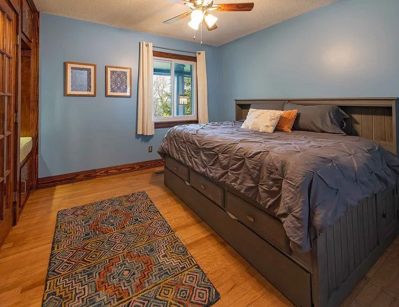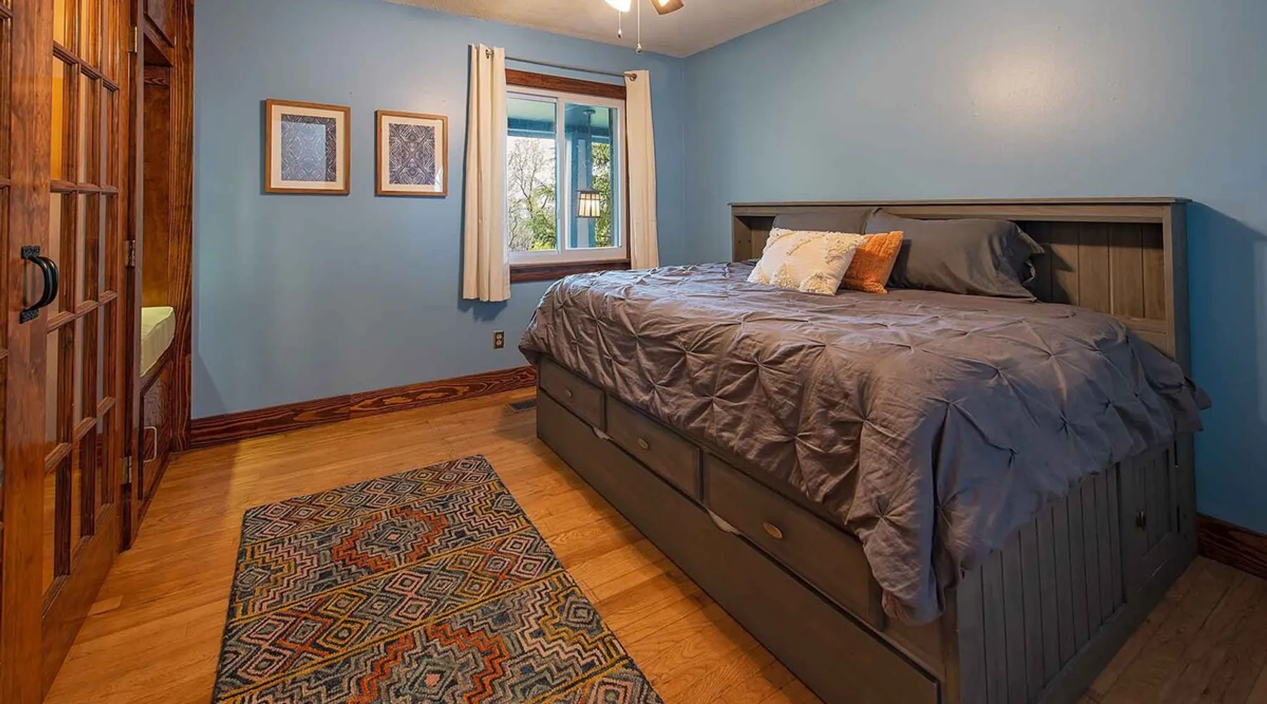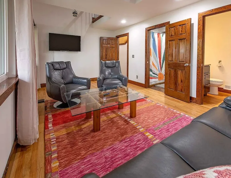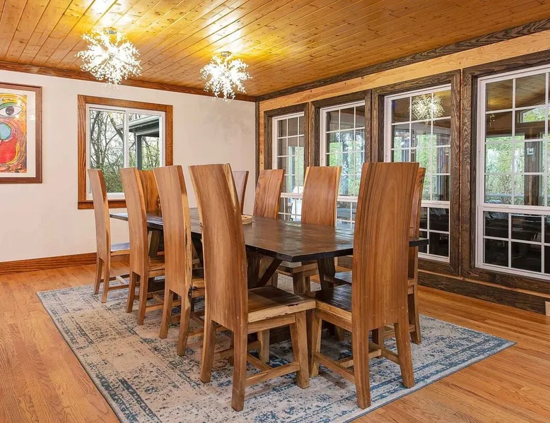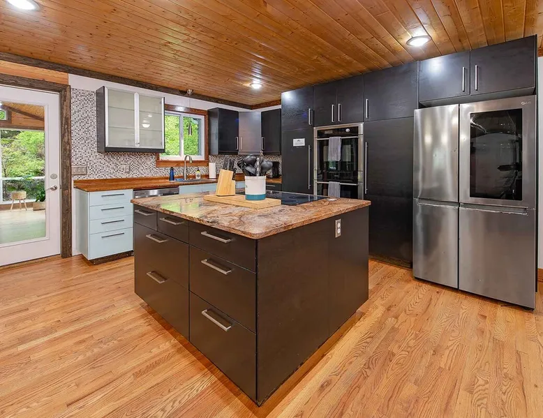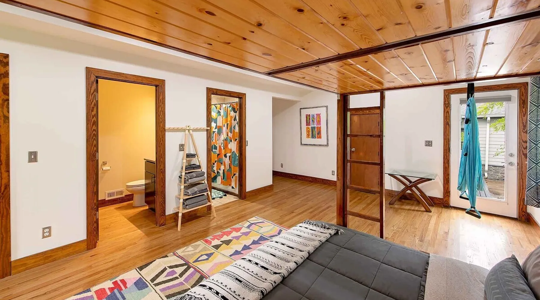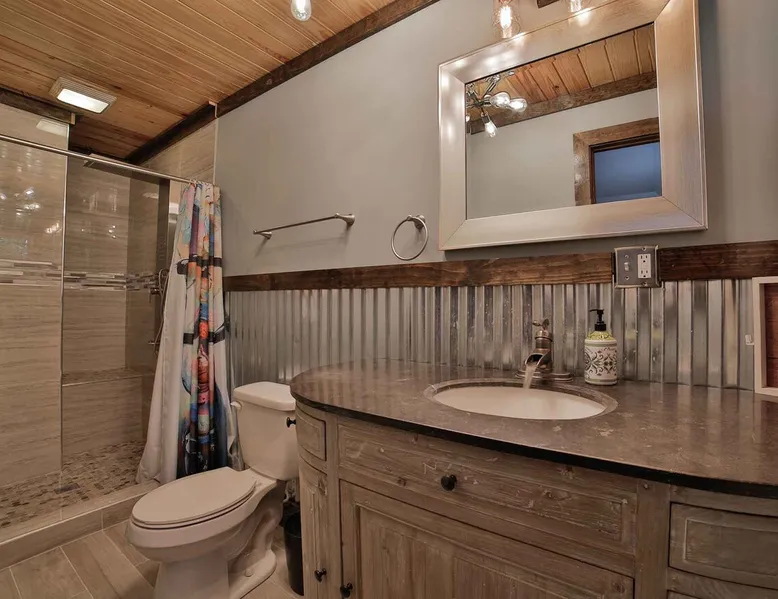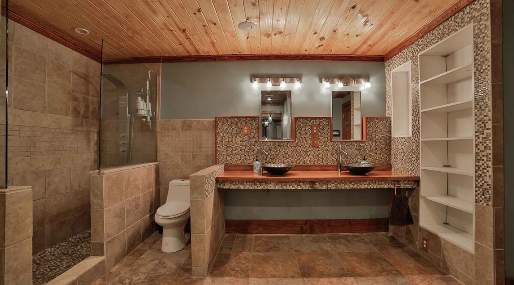 This 6,500 sq. ft. home on forested land at Lookout Mountain features a heated pool, private swim spa, sauna, fire pit, trailheads, 4 suites, large kitchen, game room, deck with hanging bed, outdoor kitchen, and more. Accommodates up to 14 guests. Pool is shared, no parties. The space Pets are not allowed at this property. Please ask about our pet-friendly properties if you want to travel with a pet. The May Family Home is part of Wauhatchie Woodlands, a collection of quaint, tiny-home, rustic-comfort log cabins on a 14-acre wooded property surrounded by National Park land. The property is owned and operated by Timberroot, a small, family-owned business that specializes in creating rustic spaces that allow you to relax, recharge, and reconnect with nature. Once the personal home of Frank, Nicole, and their children, the May Family Home is the largest and most well-equipped accommodation offered at Wauhatchie Woodlands. This vacation dream home is flanked by National Park land and dense forest, with quick access to downtown Chattanooga, Ruby Falls, Lookout Mountain, and the surrounding area. The kitchen is open to dining, a dining bar, a living room with a wood burning fireplace, and directly adjacent to the massive stunning sunroom with vaulted ceilings. You will love the real wood craftsmanship, contrast in stains and colors, and a combination of rustic and contemporary style. The sunroom exits to a spacious back deck with a swinging bed, outdoor dining, and direct access to the private 14′ swim spa. On the same living level, there is a beautiful bathroom shared by a queen bedroom and the kid’s room with a lofted queen bed and built-in slide. The slide room sleeps two small people up top and has a single bed below. Across the hall is a beautiful queen bedroom larger than many master bedrooms and a stunning newly renovated bathroom. This large queen room has a TV, a small work desk, and seating for TV watching out of bed. Down the hall are the two massive loft rooms. The river-facing loft room has a private deck, picture windows, separate shower & toilet rooms, a closet, and a spacious TV den. Up in the loft are two full/twin bunks that can sleep up to six. The back loft room features two lofted full beds over a king. Also on this level are a sofa, separate shower & toilet rooms, and closet. Upstairs is the workspace with two desks and a daybed with Smart TV. Downstairs is the massive main suite with a luxurious king bed, modern armoires, a wood-burning stove, and the media area with a large sectional sofa and a 65″ curved TV. The main suite also has a large bathroom with two vanities, a walk-in shower, a deep bathing tub, and a small cedar sauna. Also on the lower living level is the fully loaded game room with a full-size pool table, ping pon top, foosball, air hockey, Smart TV, and a comfy sofa. The space also included a small fridge and freezer to keep your drinks cold while you play. Just off the game room is the laundry room with your private washer/dryer. The May Family Home is in a compound with two other homes, the Blue House and Skyuka Chalet. The homes share a stunning, heated resort-style pool with an expansive flagstone patio. On the patio, you'll find lounge seating, an outdoor fireplace, and an outdoor kitchen with a covered dining pavilion (guests must provide their own propane and firewood). Please note that the pool is closed during winter, typically from October to March. Chattanooga is a city known for its railroads. There are active train tracks that border the property to the north and I-24 is about half a mile away. Please note that light sleepers may be affected by the ambient city and train noise. The ground floor of the Chalet serves as the poolhouse for all three properties. Guests have access to the workout room, poolside showers, and toilets. The May Family Home is more than just a house; it's a true forested resort just a tiny hop from downtown Chattanooga. Pack' n Play Travel cribs are available upon request. To make sure your stay at the May Family Home is perfect, our locally based Guest Services representatives are on-call from 8 am to 11 pm, seven days a week. Guest access You'll have the entire home to yourself during your stay. The pool area and amenities are shared with two other properties, the Blue House and the Skyuka Chalet. The ground floor of the Chalet serves as the poolhouse and also shared. The May Family Home is located on the edge of Wauhatchie Woodlands, a 14-acre property surrounded by National Forest. Guests have access to trails around the grounds, as well as shared pavilions, community fire pits, and playground. Please be respectful of other guests during your stay. Other things to note Pool: The pool complex is currently open fro the summer 2023 season. Please note the pool is closed during the winter months, Typically from mid-October until April. The pool area and amenities are shared with two other properties, the Blue House and the Skyuka Chalet. The ground floor of the Chalet serves as the poolhouse and also shared. Pet Policy: Pets are not allowed at this property. If you want to travel with a pet please ask about our pet-friendly properties. Any evidence of a pet being on this property during your stay will result in a minimum $100 fine. Deposits: Please note that guests under 21 or guests residing in the Greater Chattanooga Metropolitan Area will be charged a $500 refundable deposit subsequent to receiving their booking confirmation. Please review our policy forbidding parties, events and unregistered guests to ensure your stay abides with this policy and does not jeopardize your deposit. No Smoking: Smoking, vaping, and the use of e-cigarettes is prohibited inside Timberroot properties. Refer to the rental agreement to see these policies and the additional fees that occur if you fail to follow them. Trains & Noise: Chattanooga is a city known for its railroads. There are active train tracks that border the property to 