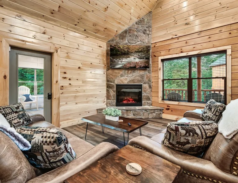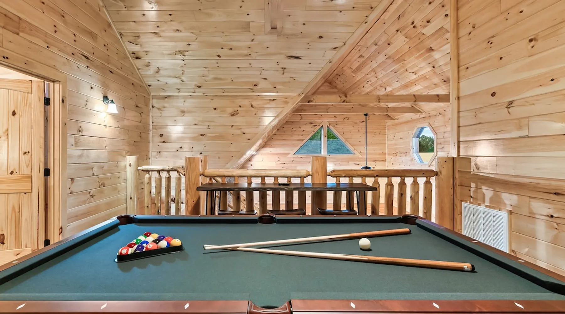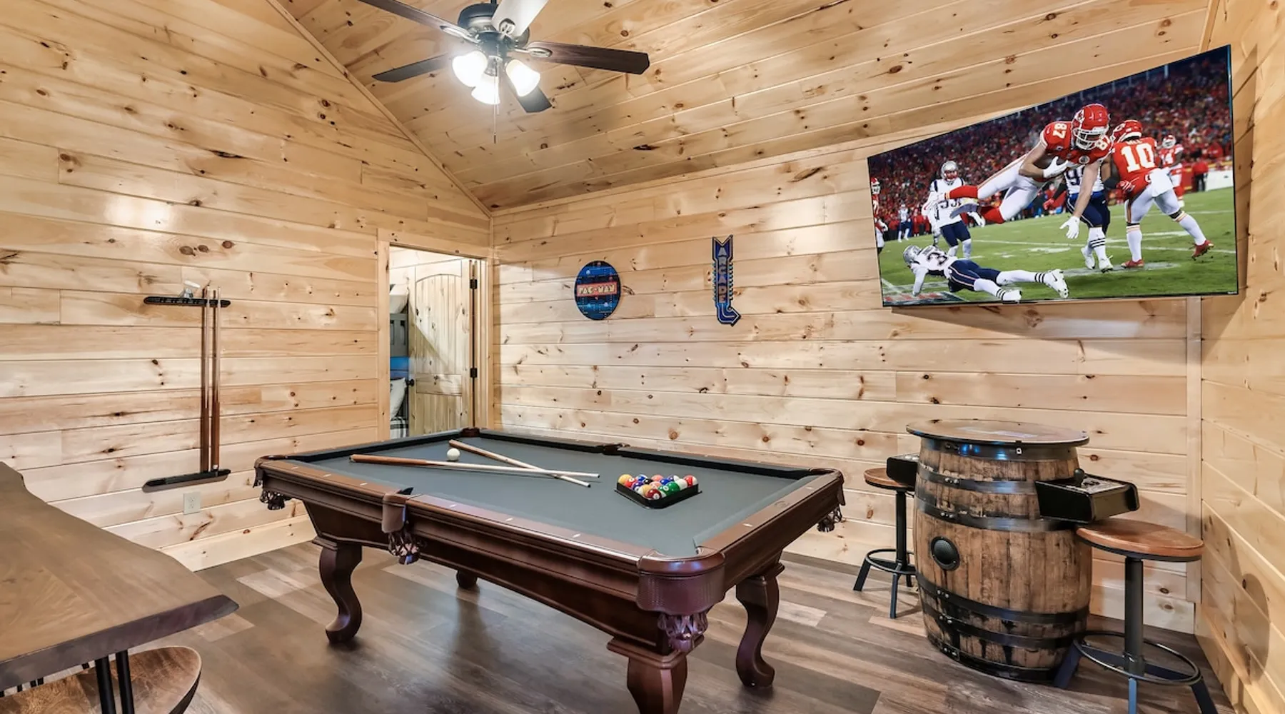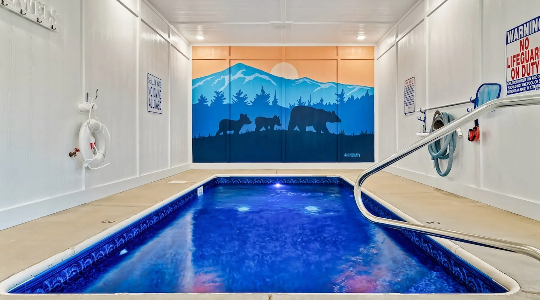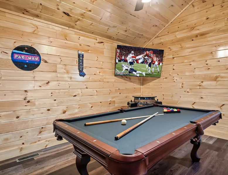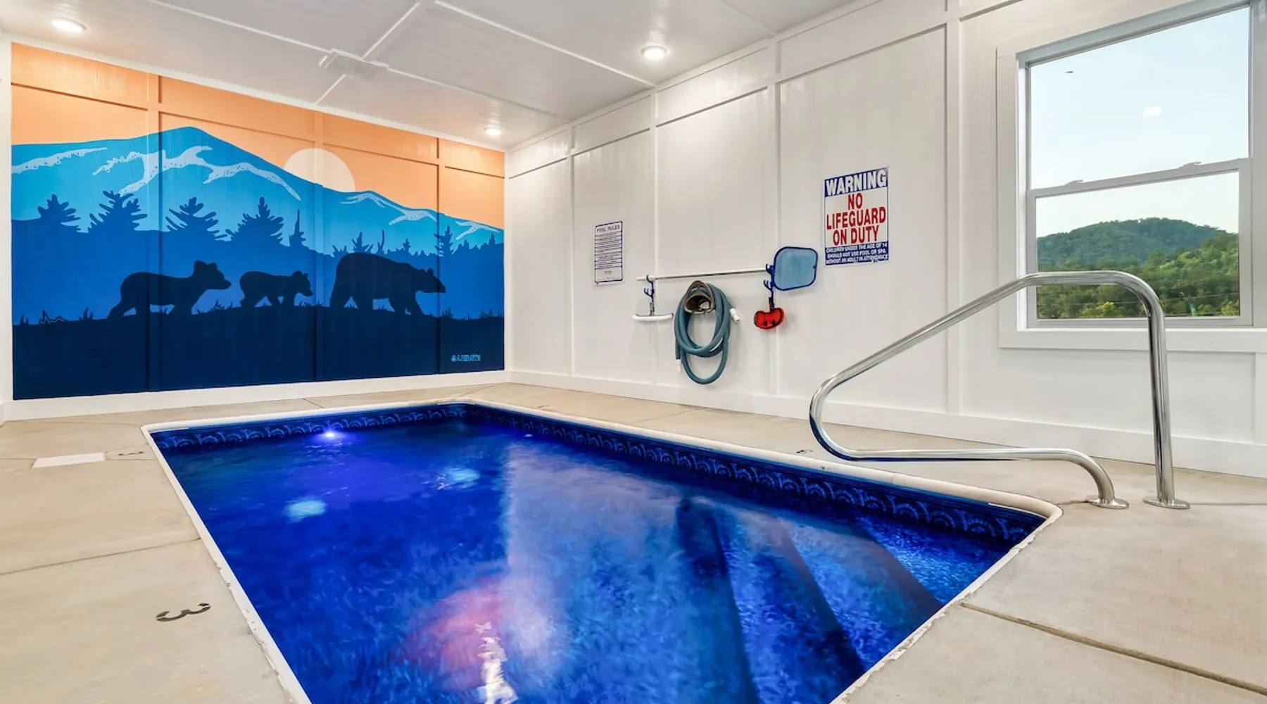 Twilight View by Thompson Retreats INDOOR HEATED SWIMMING POOL cabin that is ONE minute from the Pigeon Forge parkway and centrally located to all the attractions in Gatlinburg, Pigeon Forge, & the Smoky Mountains! This beautiful new 2 level cabin sleeps up to 12 people with four en- suite bedrooms. This cabin is the perfect base to explore the Smokies! It's close to local attractions and offers several of its own - indoor pool, pool table and multi-cade, outdoor grill, and streaming smart TVs. The space Escape to the heart of the Smoky Mountains and experience the ultimate in relaxation and entertainment at our stunning Indoor Heated Swimming Pool Cabin. This exceptional two-level cabin is perfectly situated right off the Parkway, offering unrivaled convenience and easy access to all the captivating attractions of Gatlinburg, Pigeon Forge, and the breathtaking Great Smoky Mountains. Accommodating up to 12 guests, this beautiful cabin boasts four spacious en-suite bedrooms, ensuring privacy and comfort for everyone in your group. The modern amenities and tasteful decor make it a cozy home away from home, promising an unforgettable retreat in the midst of nature's wonders. The highlight of this cabin is undoubtedly its indoor heated swimming pool. Whether it's a summer getaway or a winter escape, you can enjoy a soothing swim in the crystal-clear waters year-round. Picture yourself lounging poolside, surrounded by the warm ambiance of this private aquatic haven. For those seeking entertainment, the cabin offers a variety of options. Challenge your friends and family to a friendly game of pool on our pool table, or relive the golden age of arcade gaming with our multi-cade machine, providing hours of nostalgia and fun. Craving the great outdoors? Go to the park for a hike or fire up the outdoor grill and savor a delicious barbecue meal while breathing in the fresh mountain air. The cabin's outdoor spaces are perfect for enjoying the natural beauty that surrounds you. When it's time to unwind indoors, you'll find modern comfort in our streaming smart TVs. Catch up on your favorite shows, watch a movie night with loved ones, or simply cozy up by the fireplace with a good book. This cabin isn't just a place to stay; it's your base camp for exploring the wonders of the Smoky Mountains. With its proximity to local attractions (see reviews!) and its own array of amenities, your days can be filled with adventure and your nights with relaxation. Whether you're seeking adventure, tranquility, or a bit of both, our Indoor Heated Swimming Pool Cabin offers the perfect blend of luxury, convenience, and entertainment. Book your stay today and embark on an unforgettable journey in the heart of the Smokies! ★ ~2400 Sq Ft ★ Indoor saltwater pool heated to 84 degrees! ★ Reliable Very Fast High Speed Internet (~350MB!) ★ Multicade Barrel Arcade! ★ Pool table ★ Parking that easily fits three to four cars (five if parked strategically or double parked) ★ Prime Smoky Mountains Location that is right off the Parkway. Private yet convenient ★ ONE minute to Parkway, 7 minutes to The Island, 12 minutes to Dollywood, 14 minutes to Gatlinburg Mountain Village and 15 minutes for the National Park ★ Streaming Roku Smart TV's. BYO password for streaming services such as Netflix, Amazon Prime, etc... ★ Washer/Dryer ★ Fully Equipped Kitchen ★ Enjoy the large deck with comfortable rockers, gas grill and hot tub ★ Close to restaurants, shopping and lots of entertainment ★ Sleeps 12 with three en-suite king bedrooms and an en-suite bunk room with two full over full bunks ★ Comfortable relaxing living room with electric fireplace ★ Private hot tub for 5 people ★ No pets allowed ★ Absolutely No Smoking Guest access You will get a door code before check-in. No need to meet anyone for keys. You get the whole house to yourself. Other things to note ★ OCUPANCY 12 Person Max. All guests must be 25+ (children with parents are allowed) ★ ENTRY: The front door is equipped with an electronic keypad. We will send you your passcode for your door lock. Check in after 4pm No late check-out or early check-in. If you arrive early or depart late, there will be a $100 charge per half-hour. ★ HEATED INDOOR POOL The saltwater pool is the highlight of the cabin! The 16' x 8' Indoor Pool is heated to 84 degrees year round. The pool depth is 3 feet deep. Use at your own risk and supervise children as there is no life guard. ★ INTERNET/STREAMING TV’S: High Speed Wireless Internet is included in your stay throughout the cabin. The living room has a 65 inch large flat screen Roku smart TV, great for family movies or ballgames. The loft game room also has a 65 inch streaming Roku smart TVs. Streaming Roku Smart TV's. BYO password for streaming services such as Netflix, Amazon Prime, etc... ★ BEDROOMS There are 3 king master bedrooms with en-suite bathrooms which accommodate up to 6 adults comfortably. The top level also has an ensuite bedroom with 2 full over full bunk beds that can sleep 4 adults comfortably or up to 8 kids comfortably. ★ BATHROOMS 4 bathrooms: 3 with a walk-in showers and 1 with a shower/bathtub combo. ★ KITCHEN A dining table with 2 chairs and 2 benches in the kitchen can fit 8 people. There is also a table behind the sofa that can fit three additional people and a similar table in the loft for three people. The open dining area and a fully equipped kitchen provide for wonderful space for family gatherings. Appliances, pots, pans, cups, plates, utensils, drip/pod Keurig coffee maker. ★ DECK Large deck on the main level with six rockers and three side tables, gas grill and 5-6 person hot tub. ★ LAUNDRY Washer and dryer, ironing board and iron. ★ AMENITIES Our cleaning service provides initial start-up supplies including toilet paper, paper towels, dishwasher detergent, trash bags, shampoo and bar soap. Depending on the length of your stay, you may need to purchase some of the