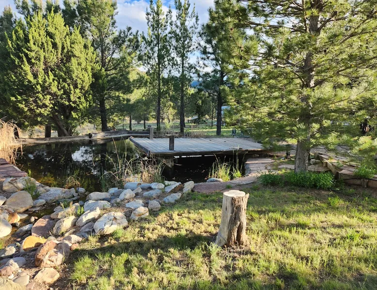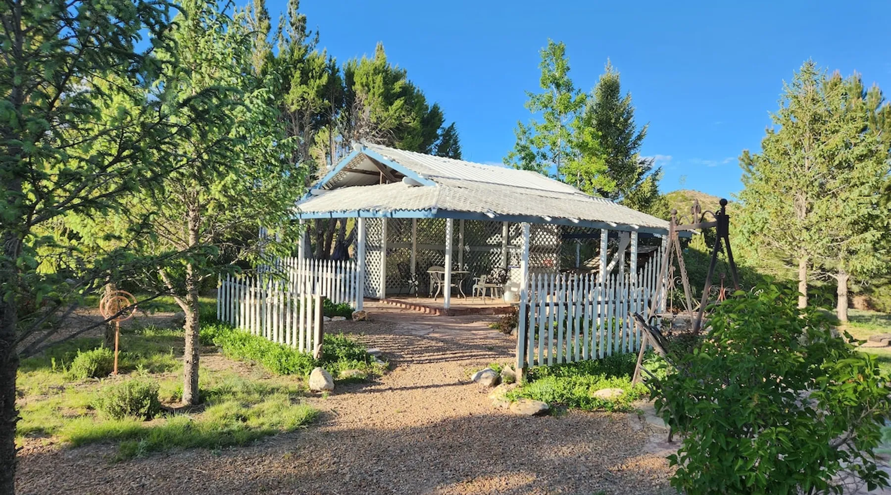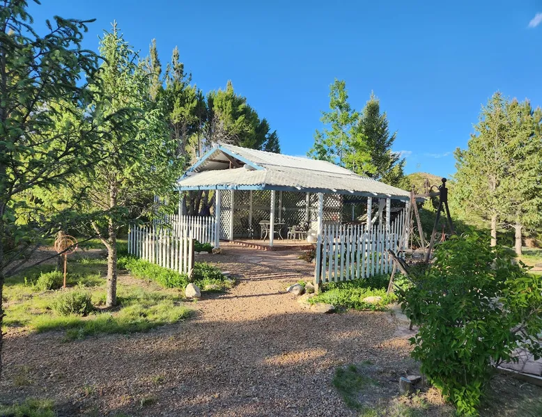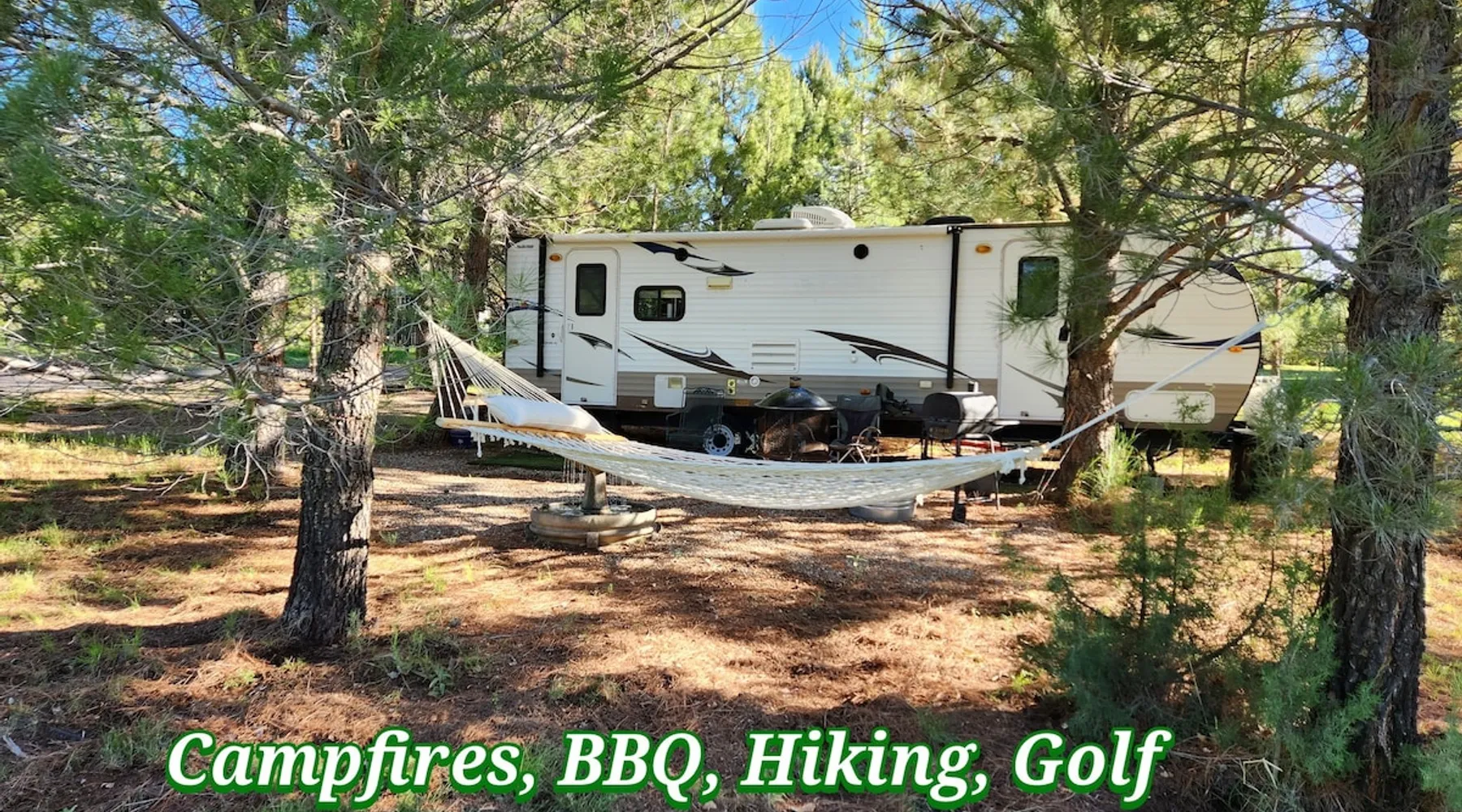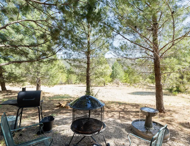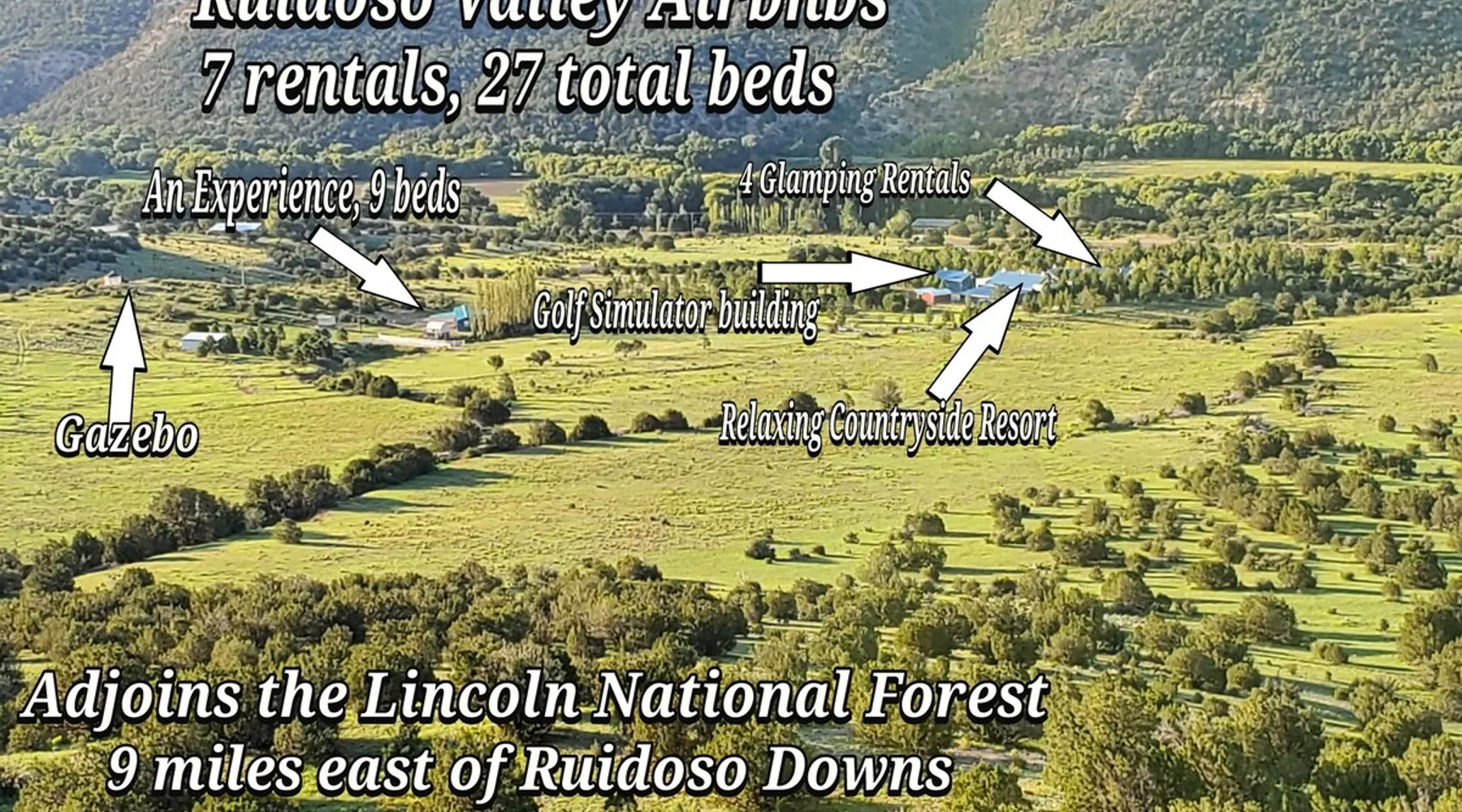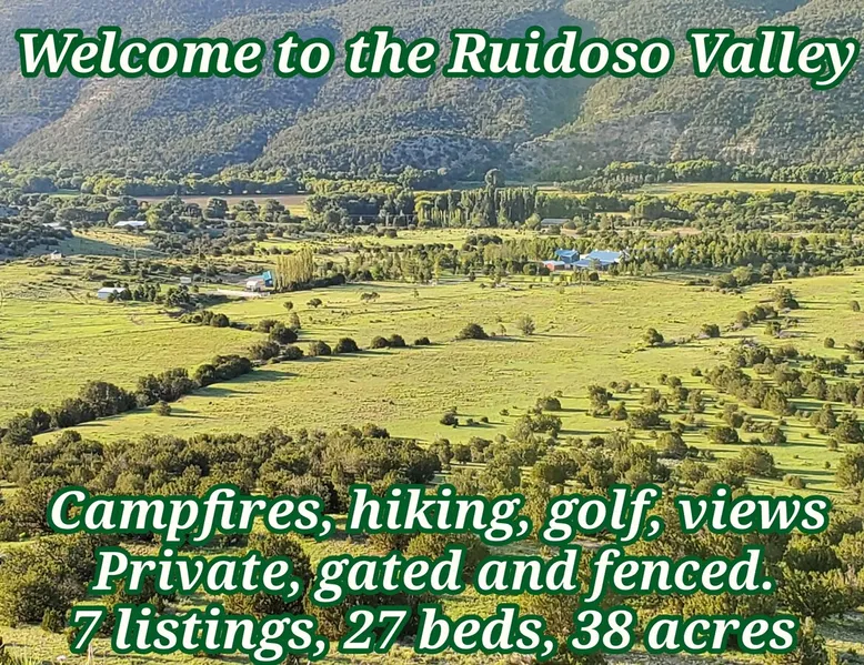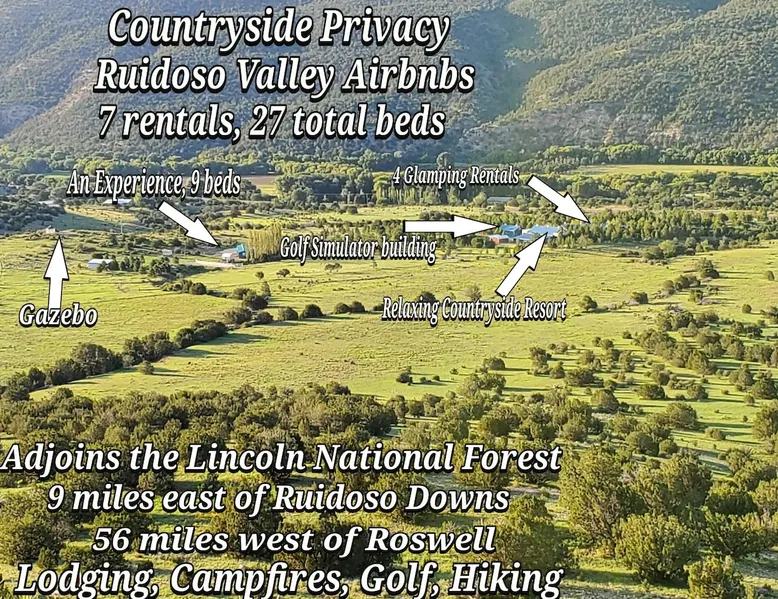 Glamping in rural Ruidoso. Campfires, Hiking, 420 friendly outdoors. This is a 32' travel trailer. Updated queen mattress, small twin bed and a regular twin size bed. BBQ grill, campfires, and beautiful landscaping. Walking trails and access to the Lincoln National Forest for hiking. Reviewed guests only are considered for booking. Please read the entire listing and the listing house rules before requesting a stay. The space This is a 32' travel trailer with a private bedroom that has a RV queen bed with an upgraded mattress that is very comfortable. There is a small twin couch sofa, and the dining table makes into a twin bed. There is a bathroom with a shower, no tub. The kitchen has an oven, 3 stove top burners, a microwave, coffee percolator(Folgers coffee provided), and both paper dinnerware and porcelain, as well as utensils, pots and pans. There is a small RV fridge and freezer. Cooking oil, salt and pepper are provided. There is a charcoal grill at the rental, and propane flat grill and BBQ grill 200' away at the cabana. There is a campfire pit at the rental, always contact the host before doing a campfire to make sure of the status of burn bans. The water is potable and very good and comes from a 150' deep water well. There is a ROKU tv, Starlink internet, and Yahtzee, cards, checkers, and chess board games provided. There are outdoor chairs and a hammock provided. The rental has refrigerated AC, and electric heating. There is also a fan provided, and a background noise console. This rental is located 9 miles east of Ruidoso Downs at Glencoe on US70. The 38 acres is elk fenced(7' tall) and is gated with Ring surveillance at gates, parking areas, and all outdoor areas. The parking area is large enough for 2 vehicles and if you have a trailer there is a large parking area available on the property. There is a 18 hole pasture golf course and walking trails everywhere. The property adjoins the Lincoln National Forest and access is permitted for mountain bikes and hiking only. Bikes may be used in the forest or inside of the property fences. Absolutely no ATVs or motorcycles are permitted on the property or in the forest. You may bring such vehicles, but they are not to be started or used on this property. Forest access roads are everywhere, and near. The rental is provided for guests to get away from the city and enjoy the rural Ruidoso Valley countryside. This is not a rental for going back forth to town to gamble and party. There are pasture dogs that run the property that are very friendly and if they bother simply hand motion them to leave amd scold them "go away". If you have a fright of dogs, please do not book this as they roam freely to protect the property from critters that will kill our chickens. Please do not feed the dogs or let them in the rental. Also, do not let children chase the dogs or the chickens. If you want to interact with the tame chickens, let the host know. If the chickens are chased, they will stop laying eggs for a few weeks from stress. If you have a fear or allergy to chickens or dogs, do not request to book. A note: If you attempt to sneak in a pet of any type, the dogs will find them and alert the host which will result in an cancelation of the booking and loss of all fees as this is no pets allowed including service animals and emotional support pets, see house rules for details. The host lives on the property and is very active on the property. Please let the host know if you are bringing more guests in than booked. Any persons entering the property are considered guests whether they stay or not. This is not a party destination. The house rules cover this, too. The racetrack is 11 miles west, the Inn of the Mountain God's is 16 miles. Downtown Ruidoso is 15 miles on a four lane highway(US70). Please read the listing house rules now if you have not yet as you agree to them when you book. The host wants an enjoyable stay for you, and the other guests as well as there are 7 rentals and the host on this property. The host bought the lower property in 1999 and planted 3000 pine and shade trees that have now grown into a forest. The property only had a 1000 sq/ft home built on the property when bought. A shop with a upstairs residence was added, a golf simulator building was added, and a greenhouse/spa building was added. The upper property was bought in 2005 and there was just a mobile home there which is now the Hippie HiltInn. I started Airbnb rentals in 2020 with the upstairs rental and the Hippie HiltInn. Four travel trailer glamping rentals were added in 2022 to 2023, and the golf simulator building was added as an overflow rental in 2021. The pasture golf course was started in 2000, and many of the trees were planted to landscape the fun short game course. The cabana was built in 2001, the gazebo was built in 2007. The property is 38 acres and is fenced 7' with 2 entrance gates with entry/exit alarms and 24 hour video surveillance. There are an additional 30 Ring surveillance cams on all parking areas, roads, and outdoor areas. These were out in before Airbnb for watching our dogs when we traveled, and for security. There are no surveillance cams in the rentals as per Airbnb and state laws. The cabana and gazebo areas are under surveillance as well as all outdoor areas including the golf course. I want everyone to enjoy their stay, and I return I expect guests to respect my property and rules. There is quite a list of rules I have added from experience, as I learned quickly just saying please respect the property does not work well with a minority of guests. I have went to reviewed guests only to alleviate the partying crowd as before that was changed, the damage and filth to my rentals was out of control. Ruidoso is a party town, my rentals are not provided for such. We are rural countryside and want guests that just want to relax and enjoy being away from the city. Drinking alcohol is okay, being drunk, loud or unruly will result in cancellation 