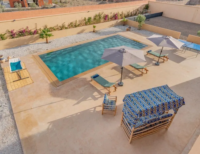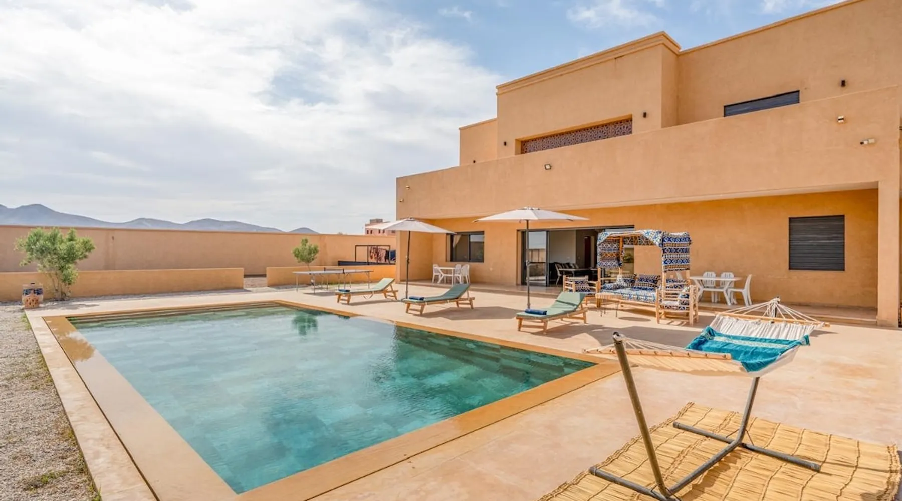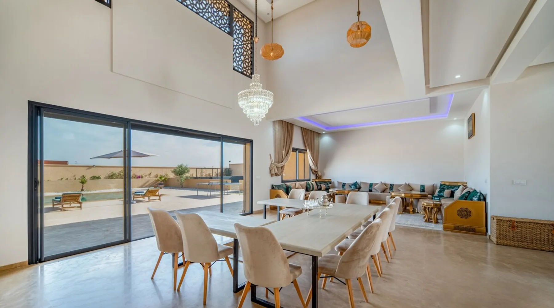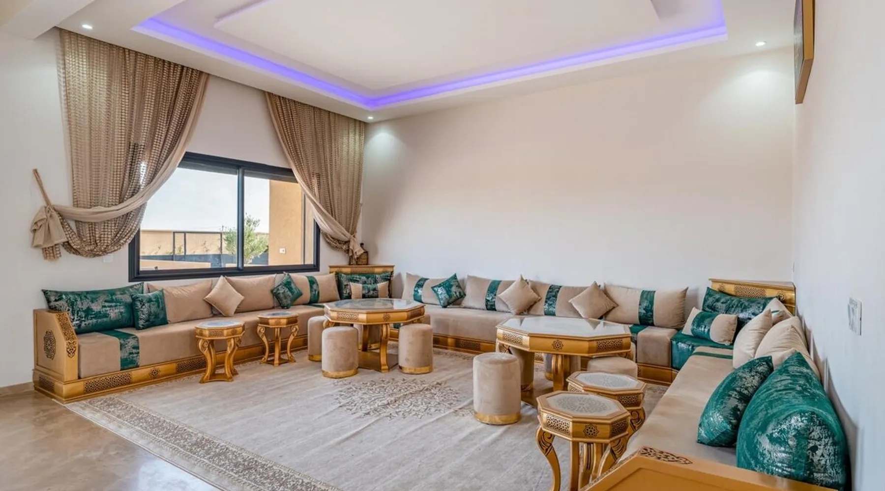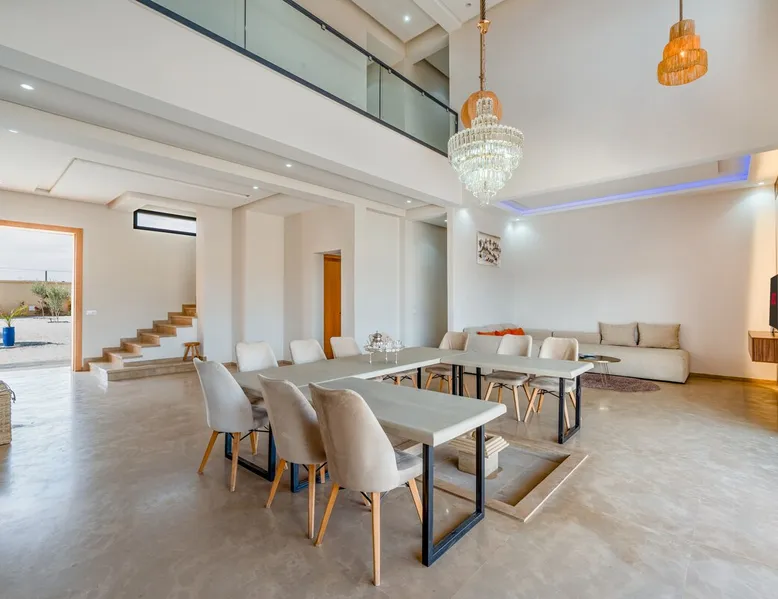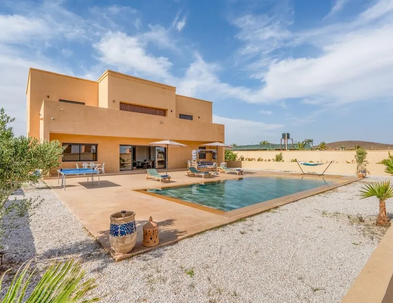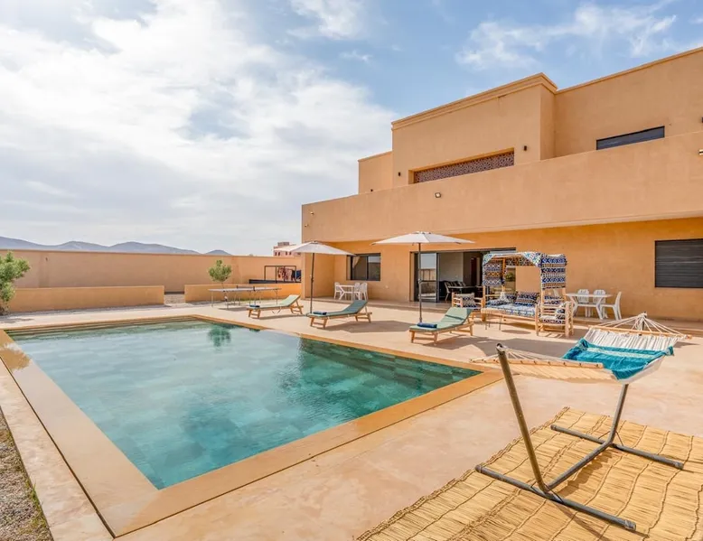 Luxury villa with infinity pool and football field, with views of the Atlas Mountains, 5 master suites with private bathrooms, including one on the garden level and its traditional Hammam will have everything to seduce you. Private transfer possible with a supplement. A €500 security deposit is required upon arrival to cover any damage. It will be fully refunded after verification of the accommodation. The space Luxury luxury villa with 180 degree views of the Atlas Mountains, infinity pool, two living rooms, patio, indoor fountains, a Royal suite, four Princières suites, traditional Hammam, fully equipped kitchen. Guest access Entire Villa Other things to note 400m2 villa with mountain views, infinity pool and it's 5 master suites.