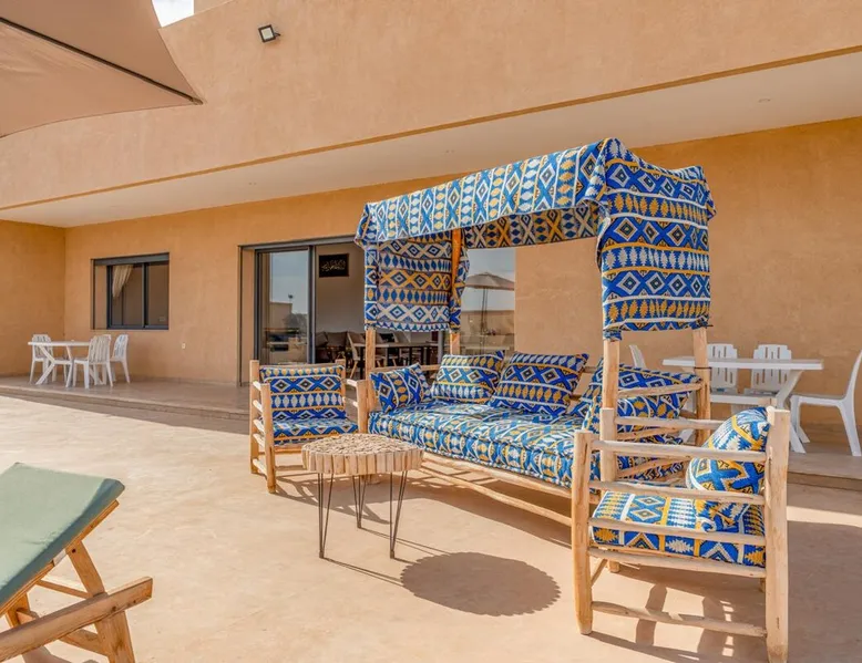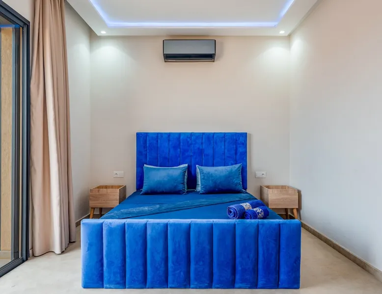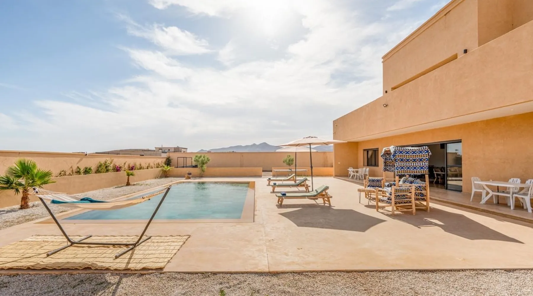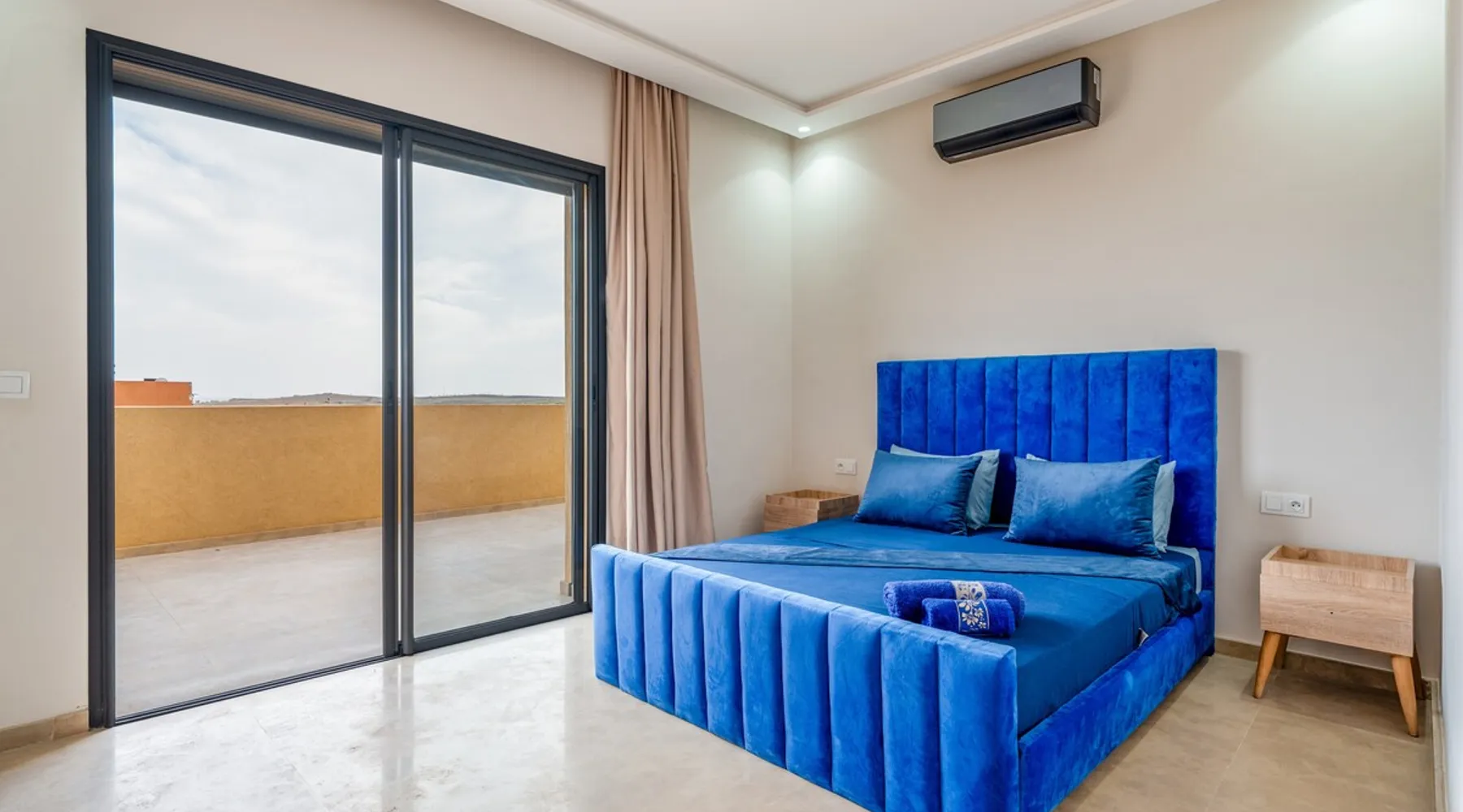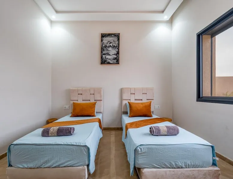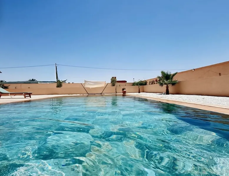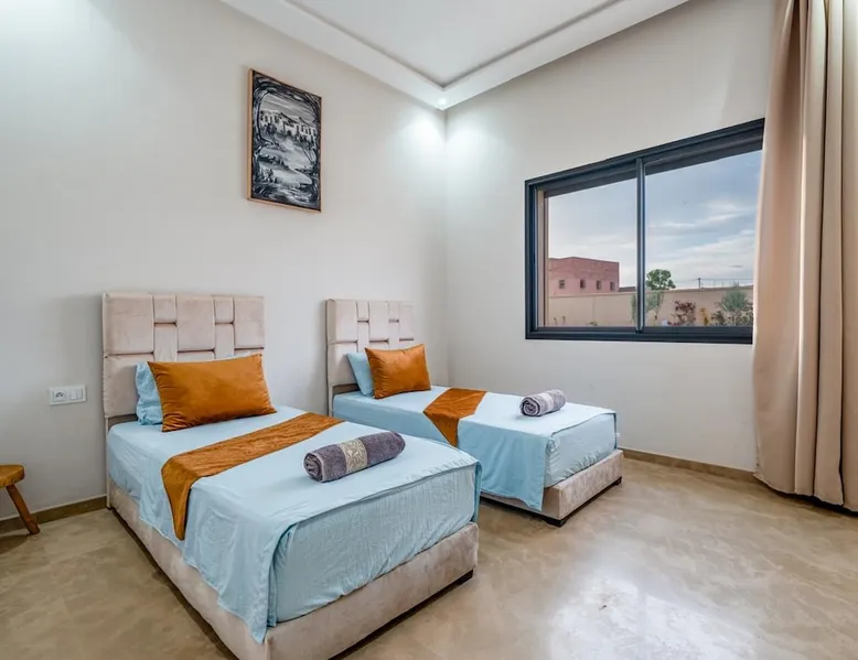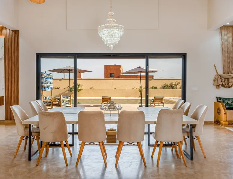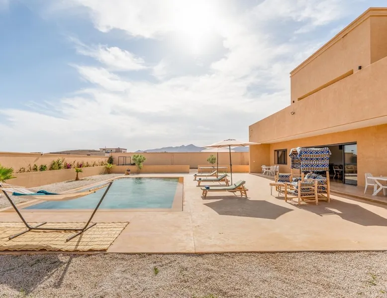 Luxury villa with infinity pool and football field, with views of the Atlas Mountains, 5 master suites with private bathrooms, including one on the garden level and its traditional Hammam will have everything to seduce you. Private transfer possible with a supplement. A €500 security deposit is required upon arrival to cover any damage. It will be fully refunded after verification of the accommodation. The space Luxury luxury villa with 180 degree views of the Atlas Mountains, infinity pool, two living rooms, patio, indoor fountains, a Royal suite, four Princières suites, traditional Hammam, fully equipped kitchen. Guest access Entire Villa Other things to note 400m2 villa with mountain views, infinity pool and it's 5 master suites.