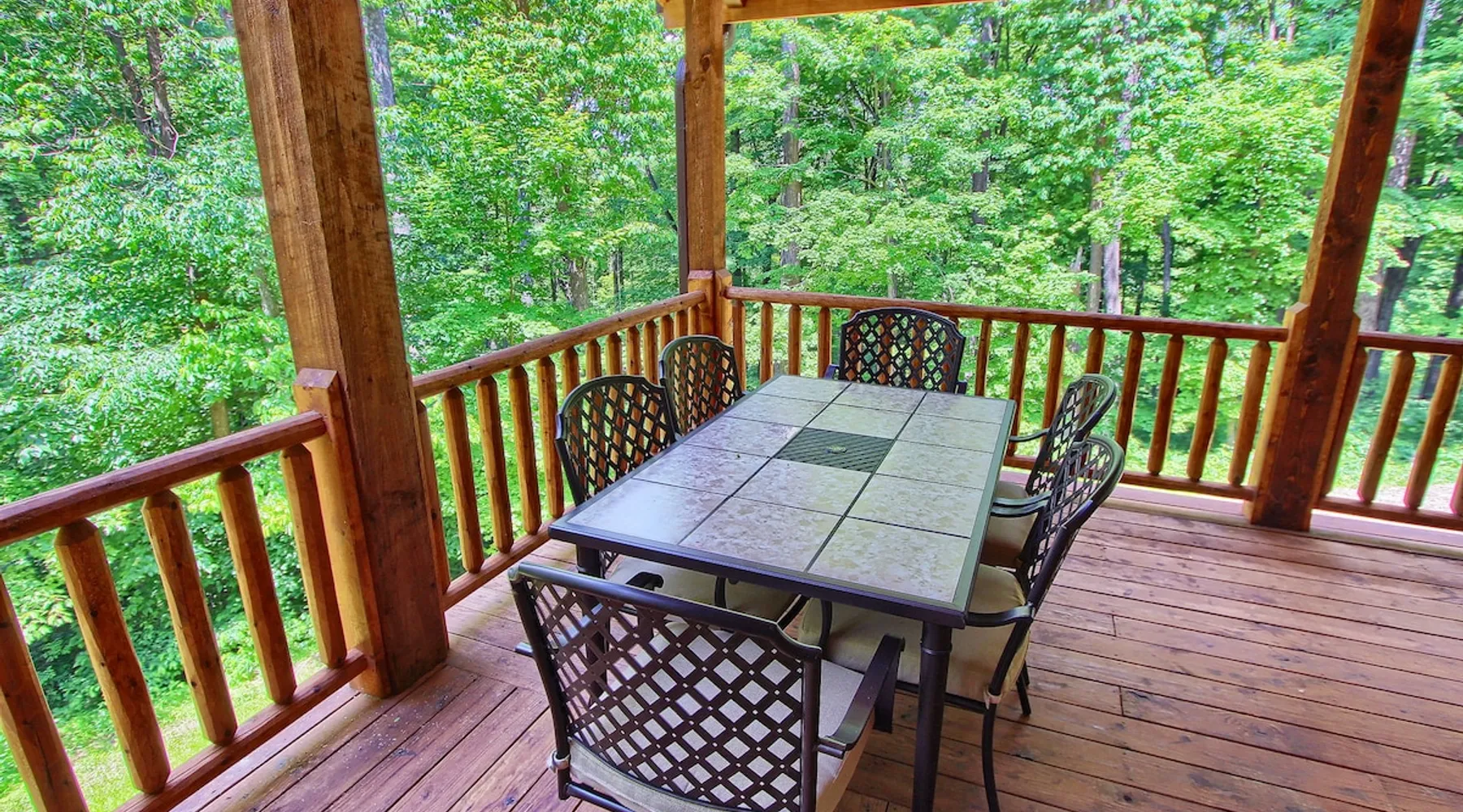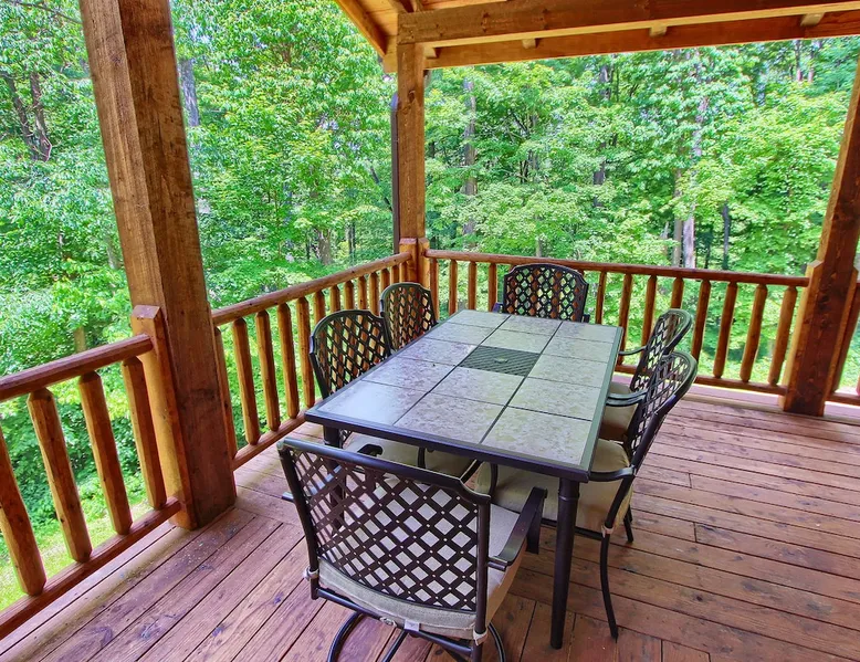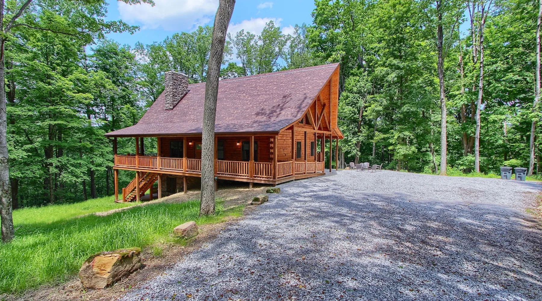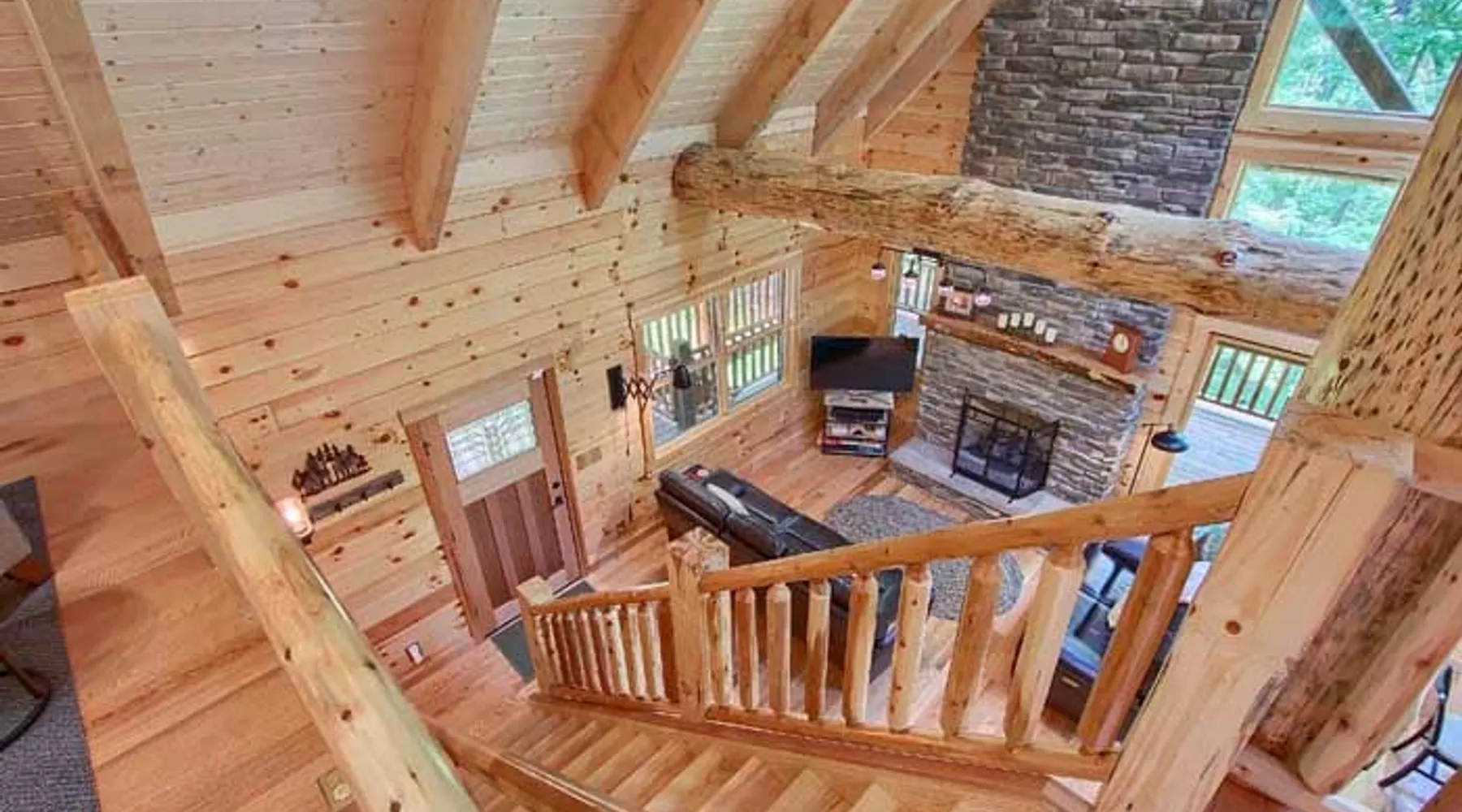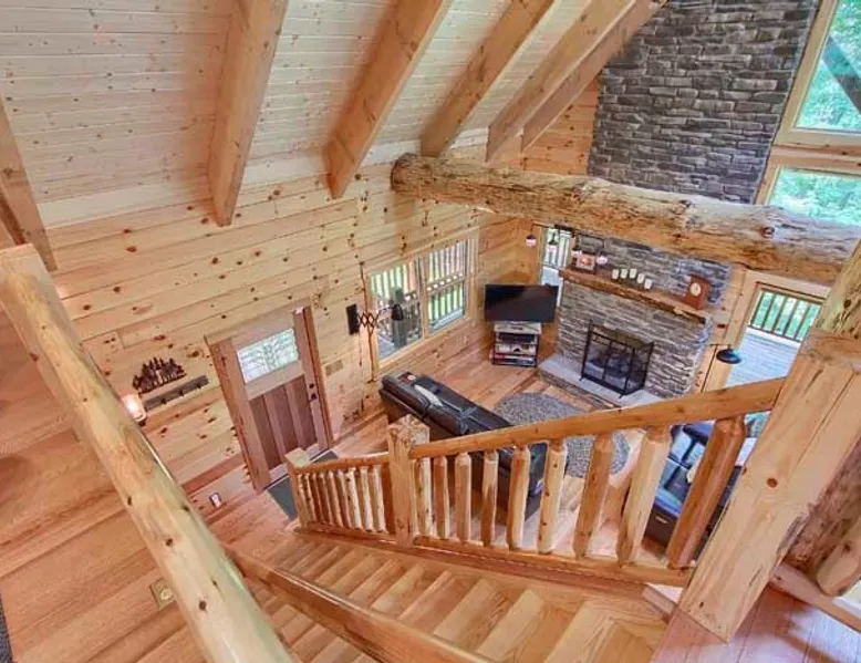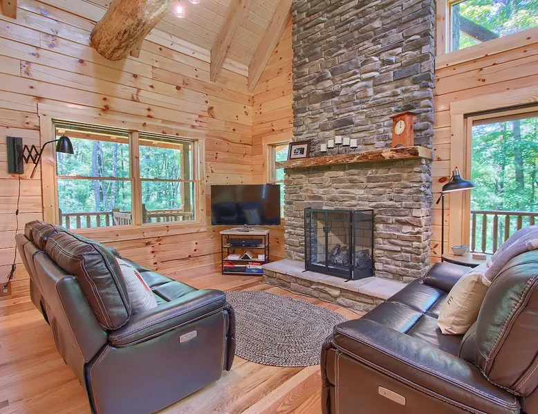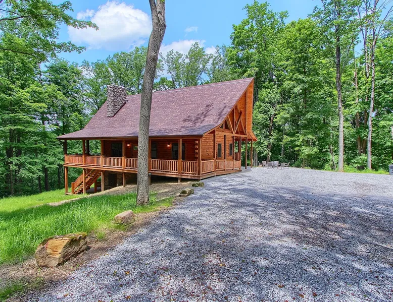 Enjoy your Hocking Hills vacation at this beautifully appointed custom built lodge. Spacious accommodations with wooded views situated on a gated 10 acre property in the Heart of the Hocking Hills. Spend cozy nights in the front of the outdoor fireplace or roast s'mores in the large outdoor fire pit. Easy access to the property with exterior ramp entrance and walk in tile surround shower in the first floor master. The space 4 private bedrooms each with a Queen size bed. The loft bedroom offers a trundle bed with two single beds. Fully equipped and well stocked kitchen to prepare your meal with gas range. Master bedroom is en-suite. Enjoy the gas log indoor and outdoor fireplaces. Finished lower level with additional great room and flat screen TV. Private hot tub with outdoor seating and large outdoor fire pit area. Washer and dryer access. Guest access Private entire log home rental. Sleeps up to 10 guests comfortably.