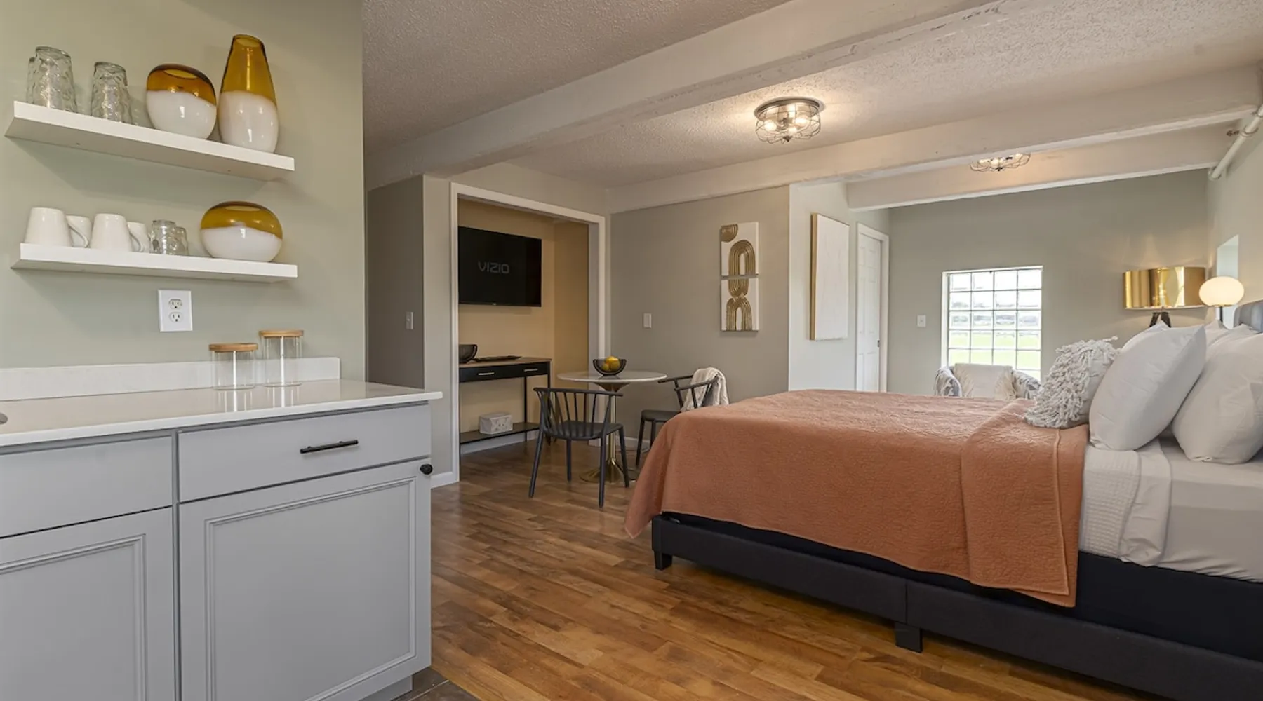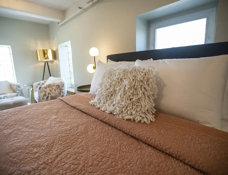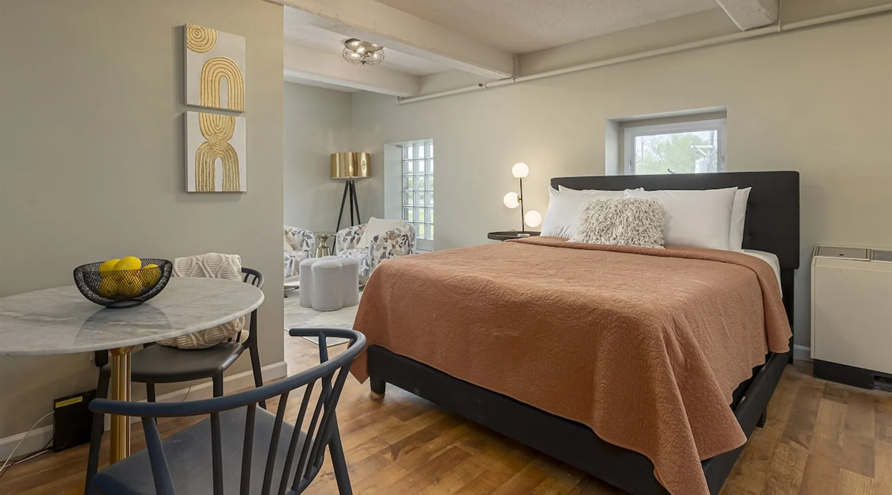 Wall Street Suites is a new micro suite fashioned from what was once the city's water department. Large water pipes and old meters decorate the halls of this newly remodeled attraction. Just a hop, skip and jump from East Campus (Neely, Mae Smith & Schneider Halls). The space THE SUITE INCLUDES: Fully furnished Queen bed Smart TV for streaming Fully furnished kitchen with apartment sized refrigerator, stove, microwave, spices, cookware and complimentary coffee Newly renovated bathroom with shower LOBBY AREA INCLUDES: Office space for laptop Multiple seating arrangements for guests Urban chic design that will have you making remodeling plans in your own place! MORE INFORMATION ABOUT THE BUILDING: Access at all times is through stairwell (please note this if bringing a pet) ABOUT THE AREA: Carbondale has so much to offer that we include our personal recommendations in our online welcome guide that is sent as soon as you book. Centrally located to wineries, SIUC, Giant City State Park & Shawnee National Forest. Hiking- Too many spots to mention! From the Nature Trail at Giant City State Park to picnicking at The Spillway on Kincaid Lake Wine tours- use Shawnee Shuttle and hit our favorite wineries listed in our Welcome Guide Orchard picking- strawberry, blueberry, lavender, peach, apple and pumpkin orchards Visit the alpaca farm and purchase alpaca fur socks at Rolling Oak Alpaca Ranch Zipline through the trees at Shawnee Bluffs Canopy Tour Rent a couple of kayaks through SIUC rec center Try the new mountain biking trail at SIUC Touch of Nature- over 20 miles of paths and trails Go horseback riding at Giant City Stables Guest access Guests have access to the building through their own personal door code through the side door. Other things to note A rental agreement is required with ID verification within 48 hours of booking. Access to the property is only provided after the renter's agreement is signed. Check-in is after 3 PM. Check-out is before 10 AM. Pet Policy: Pets must be reported prior to arrival. $50/pet; per stay. Max 2; dogs only. Inventory: We provide a "starter package" of inventory for our cabin: 3 rolls of T.P. and 1 full roll of paper towels. Suite is located on 3rd floor. Access by stairs ONLY. (Please take note if you are bringing a pet)