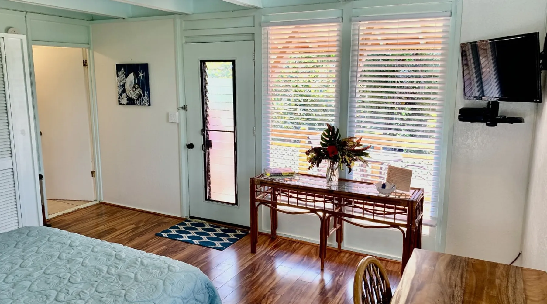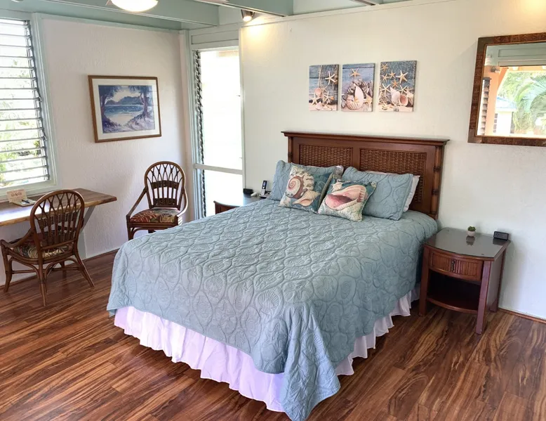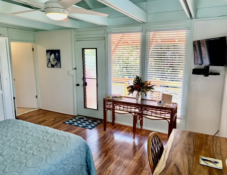 The Seashell is a second floor Bedroom Studio with private bathroom. It features a balcony lanai with table, chairs and partial ocean view. - Queen Bed - Wi-Fi - TV - Ceiling Fan plus extra floor fan for comfort - Portable A/C unit in the bedroom - Refrigerator/ Freezer, Coffee Maker - Off Street Parking for 1 Car The space The Seashell is a private second-floor studio apartment with a bedroom, bathroom, closet, and semi-private patio/lanai with a table and chairs to relax outside. The unit has a ceiling fan, floor fans, dimmable lighting, a queen bed, flat-screen TV, and a refrigerator/freezer. Baby Beach SurfSong Beach House is a uniquely designed property with 4 private separate units. Each unit is self-contained with a bedroom, full bathroom, private entrance & dedicated parking spot. A shared laundry with a modern front-load washer and dryer. From your front door, walk Southeast for just 1 minute to the post marking the access to Baby Beach and the Pacific Ocean. Enjoy the beauty and pleasure of walking on the sandy shore, wading in the shallow water, and relaxing in the sun or the shade. Sunsets and mornings are especially beautiful. When you return to SurfSong, rinse the sand off with our warm water outdoor shower just inside the board fence. In the evening, the sound of the surf will lull you to a restful sleep, preparing you for a new day of pleasure and exploration. A 4-burner Gas Grill and outside dining area are provided to all guests of Surfsong for use in the shared backyard. Please note the Orchid does not have a stove/oven/microwave due to Kaua'i regulations. A coffee maker, toaster, and some dishes and utensils are provided in the unit. Book one or more of the 4 private units available at SandandSeaVillas: #1 The Orchid, #2 The Seashell, #3 The Hawai'iana, and #4 The Flamingo. Guest access - One off-street parking spot - Private Entry - Private Lanai - Shared backyard with BBQ - Shared Laundry room Other things to note This rental is located in the tsunami evacuation zone - instructions in case of evacuation are posted inside the unit. TVNC #4265 Registration Details 260060100000, TA-028-456-7552-01