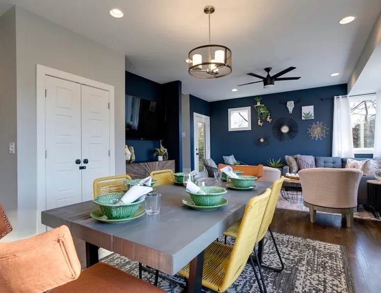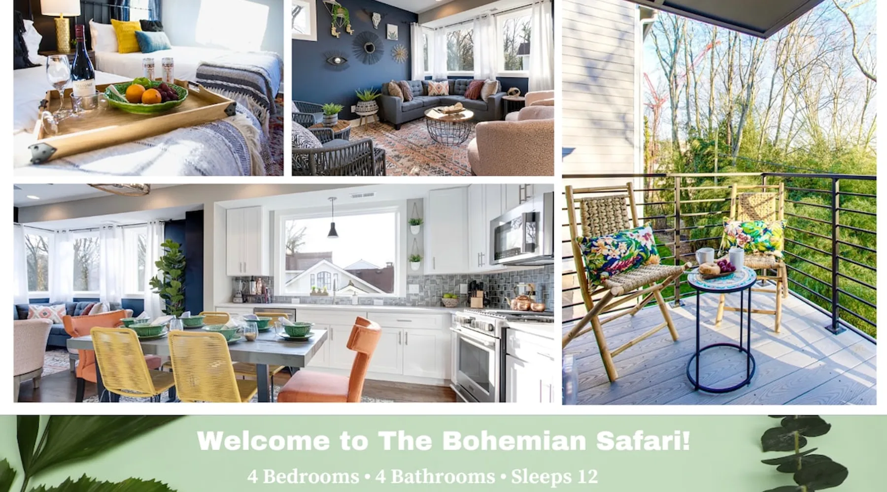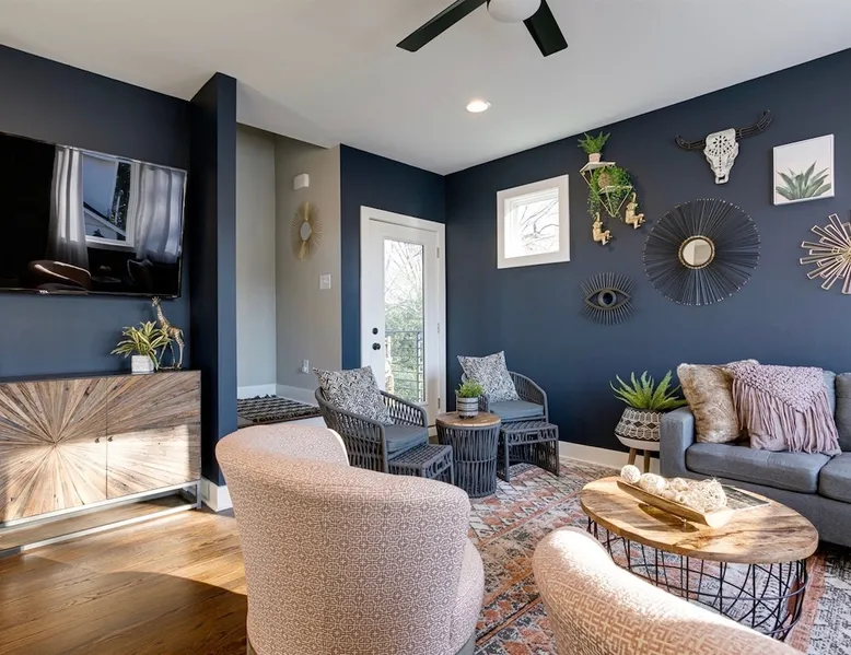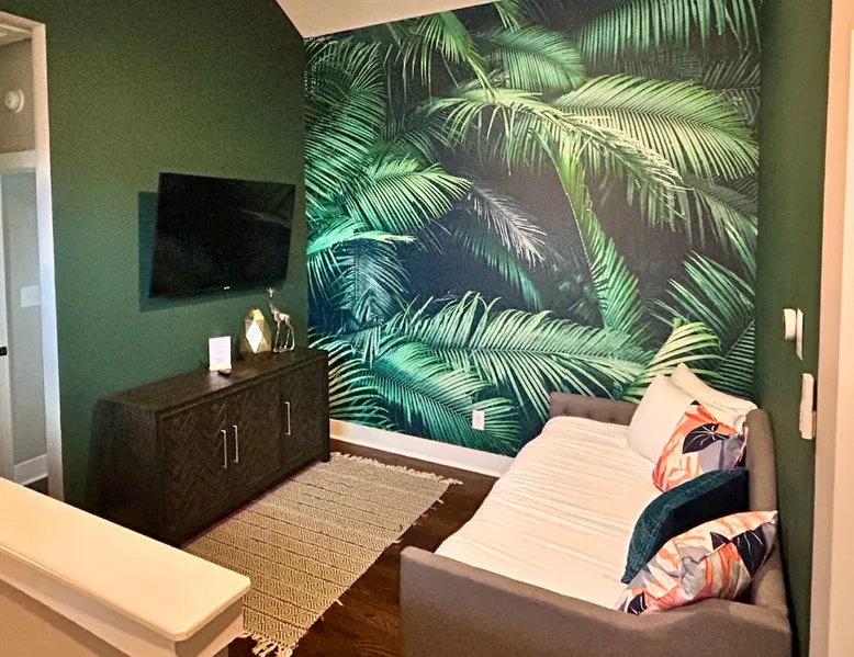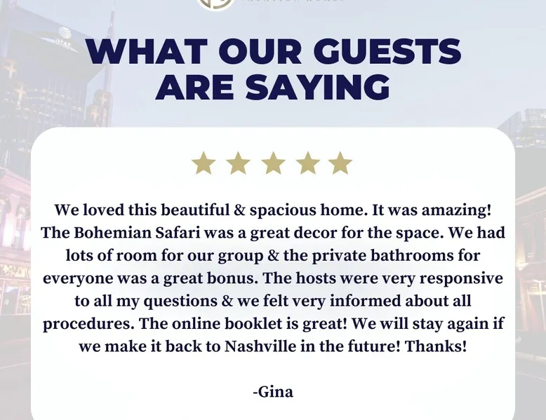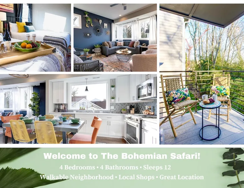 Welcome to your Nashville retreat - where boho charm meets easy comfort near The Gulch & Broadway. Gather with friends or family and enjoy skyline views, spacious living, and thoughtful touches throughout. - Sleeps 12 | 4 bedrooms | 7 beds | 4 baths - Private patio w/ outdoor dining & skyline view - Fully equipped kitchen & large lounge w/ 65” TV - Family-ready w/ baby gear & safety features - Free 2-car carport + street parking - Dedicated workspace & high-speed Wi-Fi The space Morning light filters through wide windows as you sip coffee on the patio, the Nashville skyline glowing softly in the distance. Evenings invite slow meals outdoors, where soft lights and easy laughter carry across the table. Just beyond, the hum of The Gulch and Broadway beckons, blending the city’s rhythm with the home’s relaxed bohemian charm. Sleeping arrangements This home comfortably accommodates up to 12 guests across 4 bedrooms and a flex space. Each bedroom includes its own private ensuite bath, offering both comfort and privacy. The flex space features a daybed that converts into two twin beds, ideal for families or friends traveling together. Soft cotton linens, room-darkening shades, and extra blankets create a restful setting for every guest. Kitchen & dining The fully equipped kitchen features stainless steel appliances, a gas stove, and all the essentials for home-cooked meals. Mornings begin with freshly brewed coffee, and evenings bring everyone together around the large dining table. Whether you’re preparing a shared breakfast or toasting a Nashville adventure, the space is designed for easy connection. Living areas Tall ceilings and an open layout invite conversation and relaxation. The lounge includes a spacious seating area for movie nights on the 65-inch TV or quiet moments with a book. A sound system adds warmth to gatherings, and thoughtful touches throughout ensure families feel at home, including a pack ’n play, high chair, baby bath, and built-in safety features. Outdoor living Step onto the private patio to take in the skyline views or enjoy dinner in the open air. The backyard offers green space to unwind, giving you a quiet retreat within the heart of the city. Work & connectivity A dedicated workspace provides privacy for remote work, supported by high-speed Wi-Fi throughout the home. Whether checking in with the office or planning your next outing, you’ll stay comfortably connected. Practical comforts The home includes in-unit laundry, free parking for two cars in a covered carport plus street parking, and everyday essentials like towels, toiletries, and an iron. Central air conditioning, ceiling fans, and heating maintain year-round comfort. Neighborhood Situated near The Gulch and Broadway, the home offers walkable access to local favorites like Hattie B’s, Zanies, and 8th & Roast. You’re close to the city’s vibrant music and dining scene, yet tucked into a peaceful spot where you can unwind after a day of exploring Nashville. Guest access Enjoy complete privacy with full access to all rooms and amenities. Park effortlessly in the carport or driveway and enter seamlessly with keyless entry. Stay connected with high-speed WiFi and make yourself at home. Just minutes from Nashville’s top restaurants, grocery stores, and iconic attractions, our retreat offers the perfect blend of comfort and convenience for an unforgettable stay. Other things to note 🎯 Travel Insurance - Protect your trip with Airbnb’s travel insurance! Opt for coverage at checkout and review the plan to ensure it suits your needs. After booking, you’ll receive an email with your policy and a link to easily manage your coverage. 🎯 Be Neighborly - We’re thrilled to host you! Please respect our home and neighbors to help maintain the cozy, welcoming environment we’ve created. 🎯 Local Discounts - Unlock exclusive local savings on attractions, coffee spots, and tours to experience Nashville like a local. 🎯 Family Friendly - Traveling with kids? We’ve got you covered with amenities like a pack N play, high chair, and games to make your stay stress-free. 🎯 Pet Policy - We love pets, but only service animals are allowed. Emotional support pets aren’t recognized under ADA guidelines.