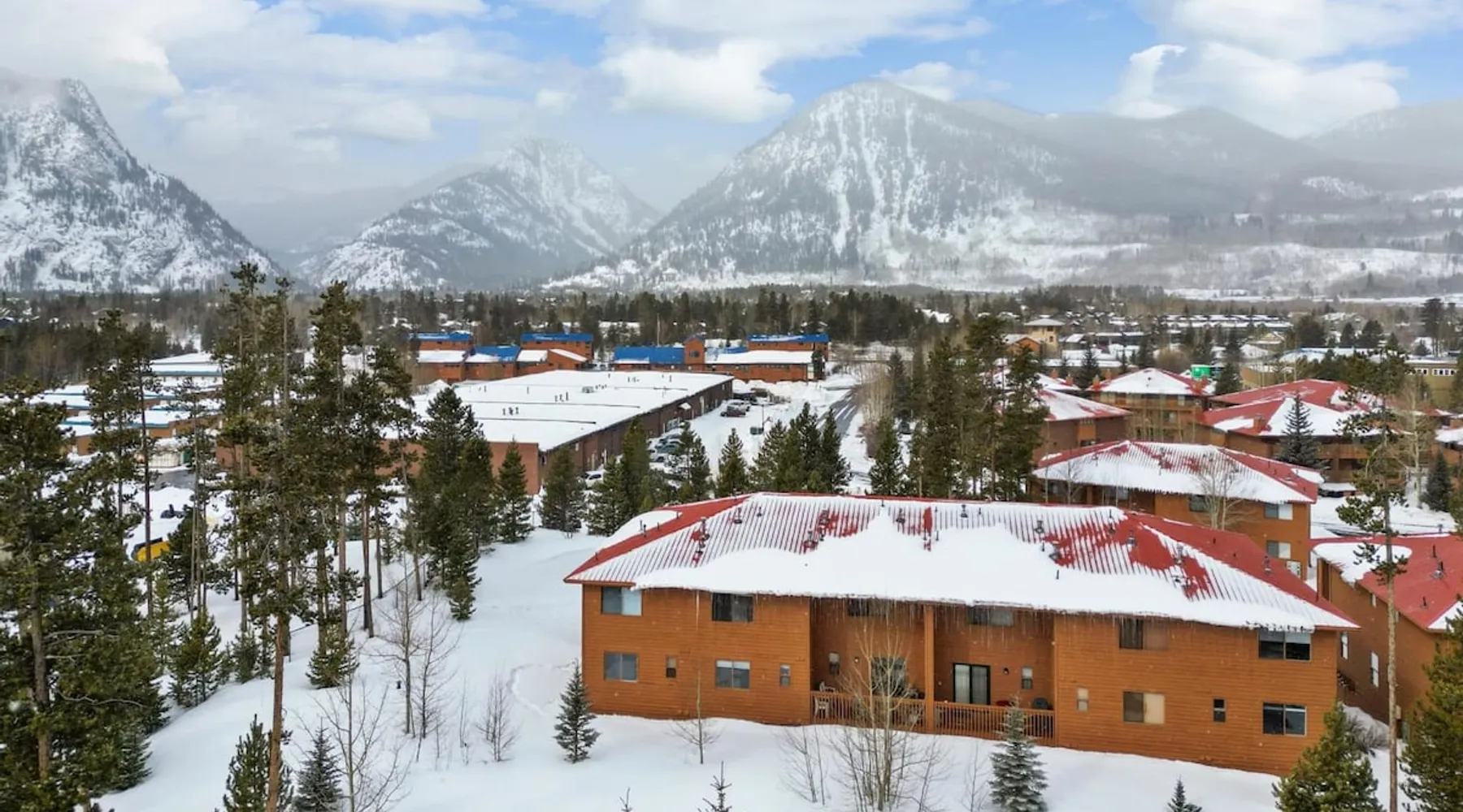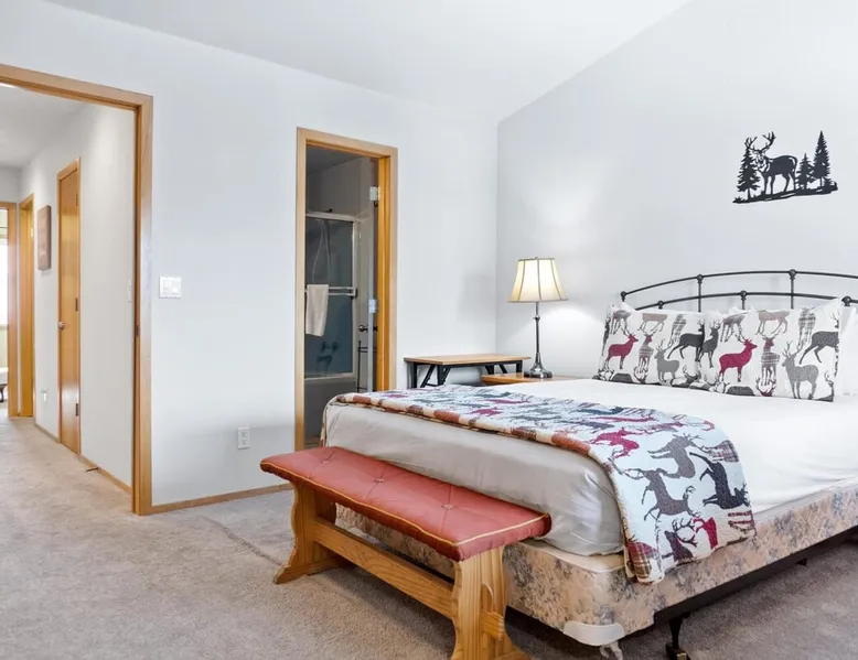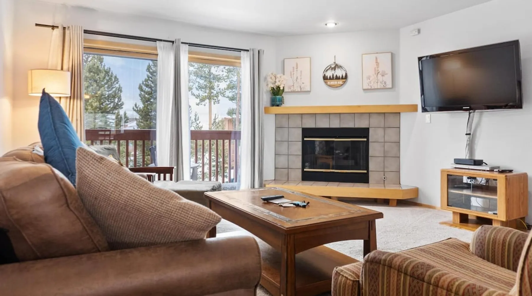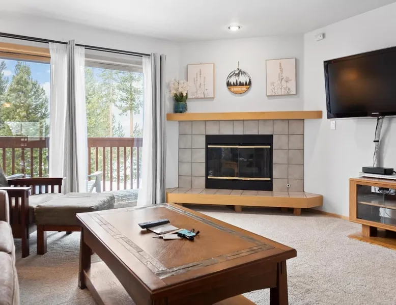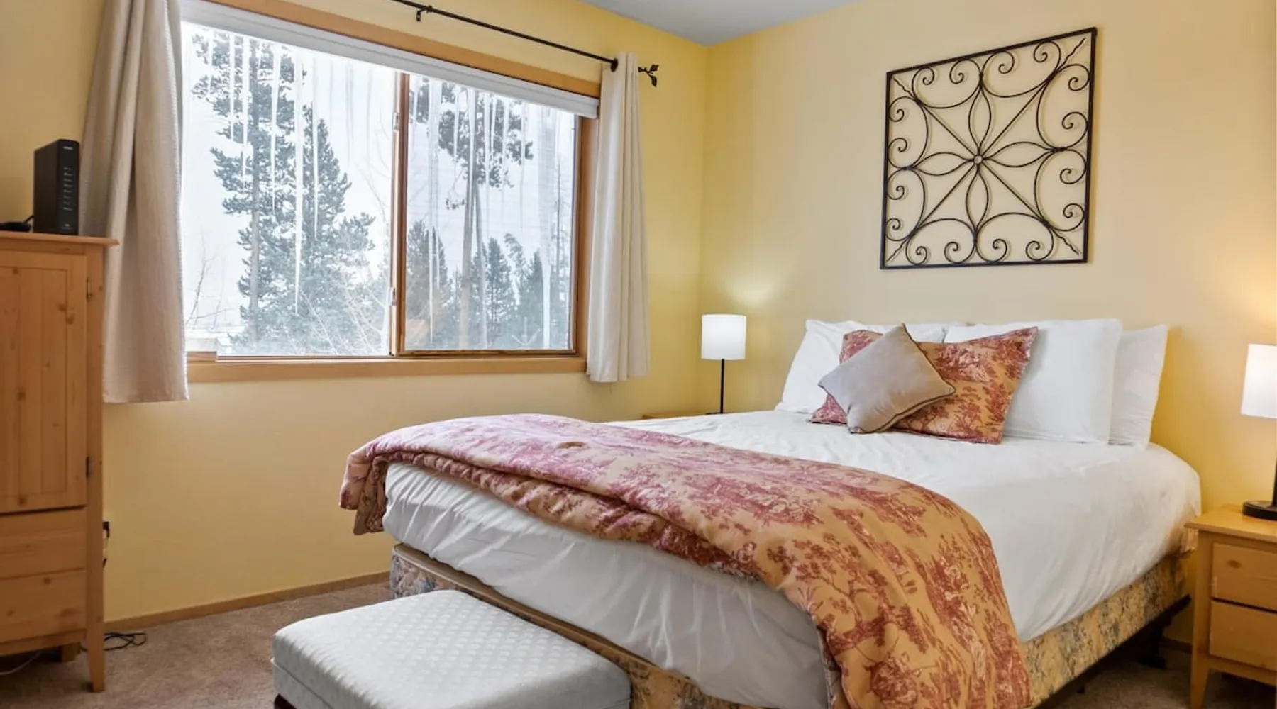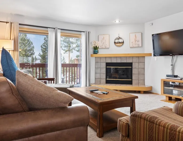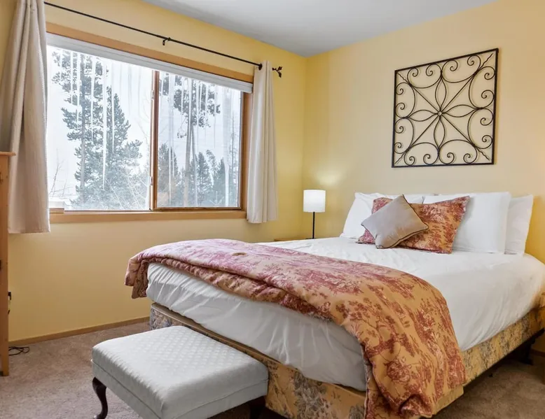 Year-round fun awaits at this cozy 2-bedroom condo in the charming mountain town of Frisco! Endless adventures are minutes away from this home with several parks, trailheads, and some of the best ski resorts just a short drive away! Return to your home away from home where you can relax in the spacious living area around the gas fireplace and enjoy the beautiful mountain views out on the private balcony. Or recharge in the shared pool and hot tub, perfect for sore muscles! The space As you step inside your peaceful mountain retreat you will come to the entryway you will find a bench to sit on while you unlace your hiking or snow boots and several coat hooks to store your winter parka. Once you have unloaded your outdoor gear head up the stairs where you will find the spacious living area. When you arrive on the second floor you will first come to a half bathroom with a stacked washer/dryer directly in front of the stairs. As you walk further into the space you will come to the charming light-filled open living room/kitchen/dining area with views on either side overlooking the surrounding trees. Head into the living room where you will find soft, carpeted floors, comfortable furniture, and a gas fireplace providing an inviting and cozy common area for relaxing. The living room is outfitted with two reading chairs and a cozy couch that doubles as a pull-out king bed. For added comfort, you will find a coffee table, a small side table and lamp, and a 42” TV with a DVD player perfect for movie nights. From the living room, you can step through the patio doors and out into the private balcony where you can take in the fresh mountain air and beautiful views of the surrounding trees and snowcapped mountains. Out on the patio, you will find two patio chairs and a propane BBQ so you can sit back and relax while you prepare dinner on the grill. Connecting the living room and kitchen is the dining area where you will find a large table with seating for six. From this space, you can enjoy the views from over the private balcony, or from the large window in the kitchen. There is no seat with a bad view from this table! On the other side of the dining room, you will find the well-laid-out kitchen. This light-filled space is flooded with natural light from the large window providing some tranquil views while you prepare your meal. The fully-equipped kitchen includes everything from a coffee maker to a crockpot making it convenient to put together your favorite comfort foods after a day of exploring. When you are ready to settle in for the night you will find two bedrooms and two bathrooms on the third floor of the condo. As you arrive on the landing you will find the guest bedroom to your left. This bright and cheery room has all you need for a peaceful night of rest with a comfortable full-size bed, a 20” TV, and a large window overlooking the surrounding trees and snow-capped mountains. Guests will have plenty of space to store their personal belongings with the large closet, dresser, and two nightstands. On the opposite end of the hallway, you will find the spacious master bedroom which provides a great separation of space between the two bedrooms. The master bedroom is equipped with a queen-size bed, two bedside tables with lamps, a large closet, a dresser, and a 32” TV. This room also features a desk and chair underneath the large window so you can get some remote work done while enjoying the beautiful views. The master bedroom has an attached bathroom where you will find a single-sink vanity with under-the-sink storage space and a shower/bathtub making it convenient to wash up before settling in for the night. A second bathroom is located between the two bedrooms and features a single-sink vanity, a mounted towel rack, and a tiled bathtub/shower combo. Guests in this home are also welcome to use the shared amenities such as the hot tub, pool, and fitness center. Permit # STR-010587 Guest access Guests will have access to the entire condo and two parking spaces in the shared parking lot across from the unit. Guests also have access to the shared amenities which include a hot tub, pool, and fitness center. Other things to note Please note that like most homes in the area, this home does not have A/C. Guests will not be provided access to the garage. 4-wheel drive or 2-wheel drive tires with snow chains may be necessary for safe travel to this property, even if it hasn’t snowed in a few days. Please note, the indoor pool and fitness center are available daily with set hours.