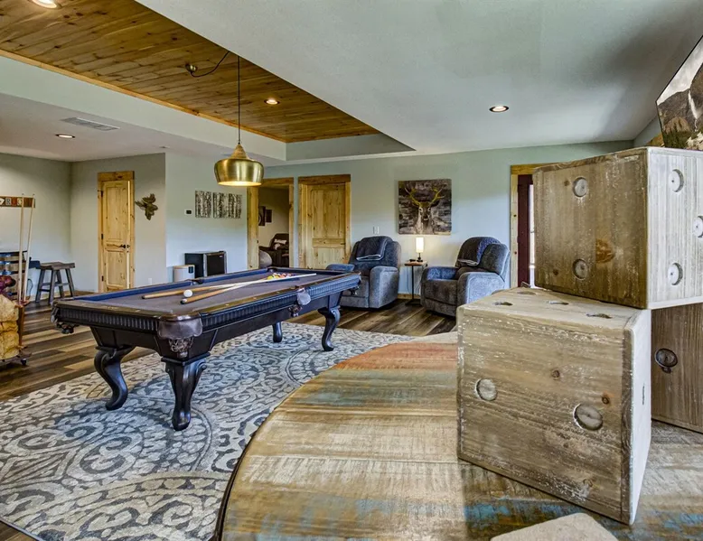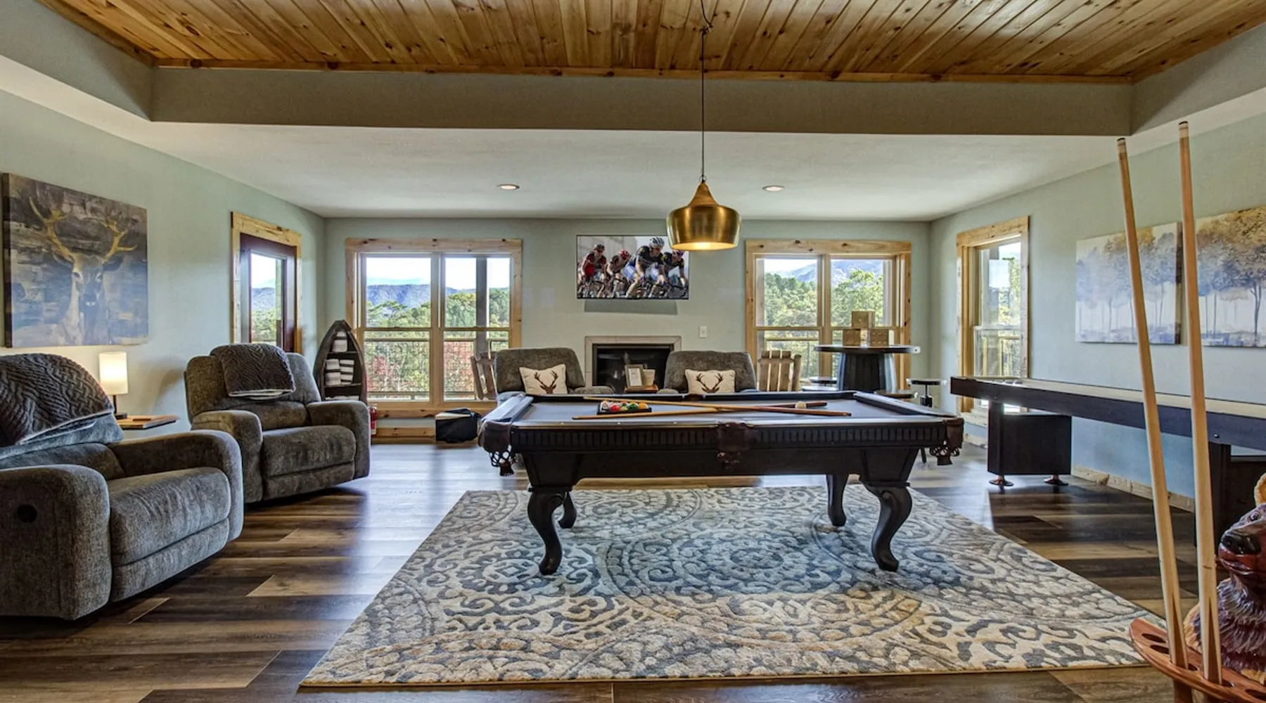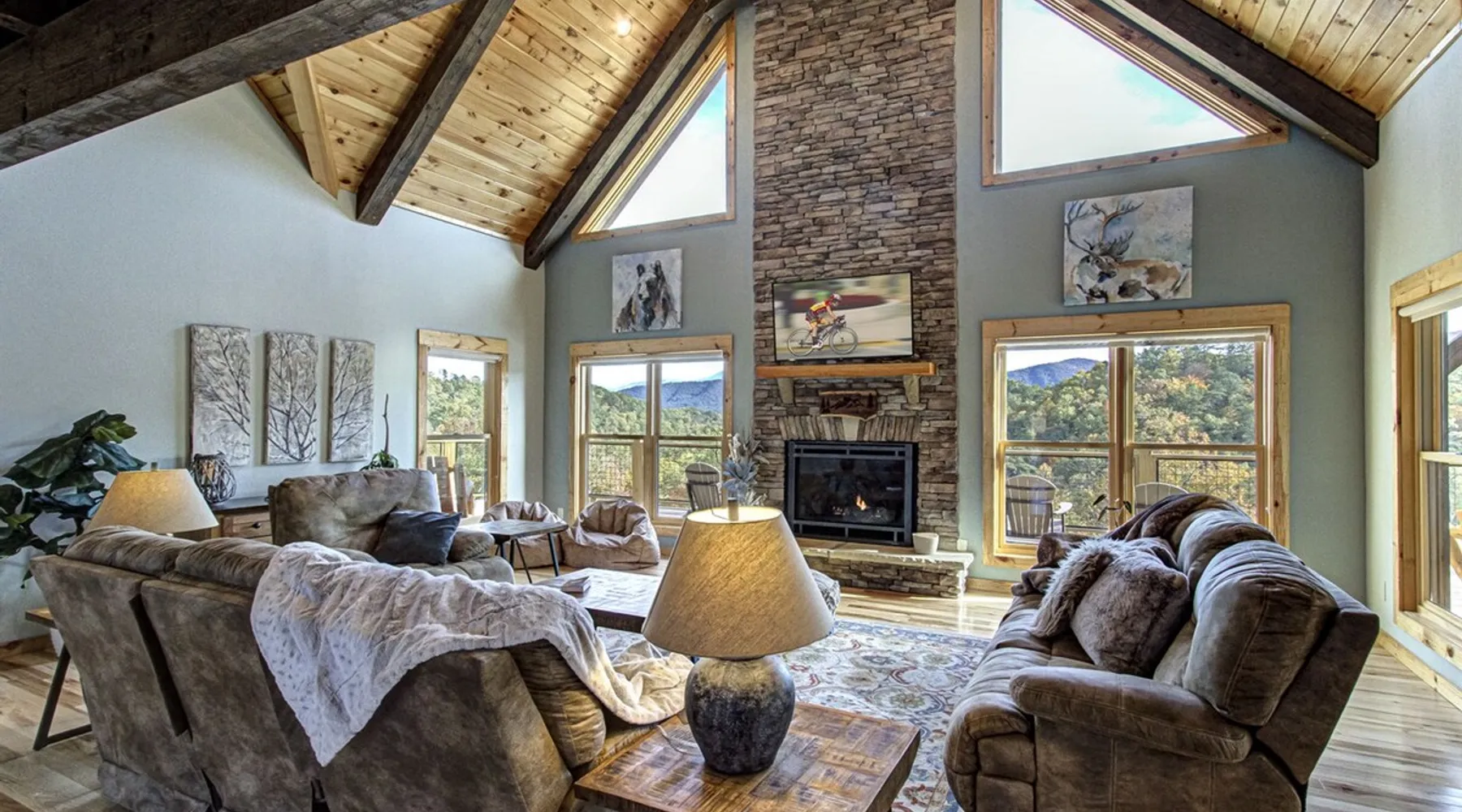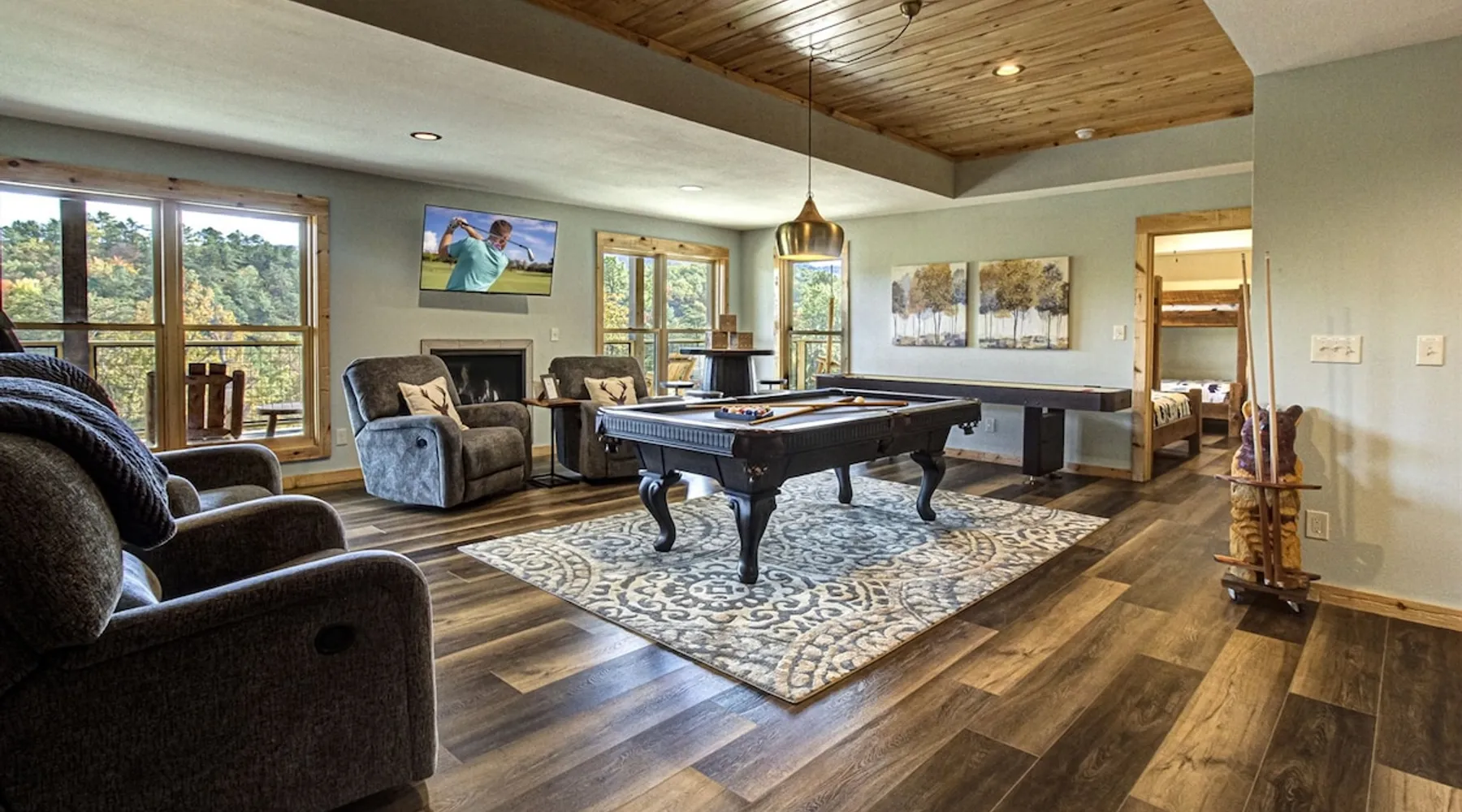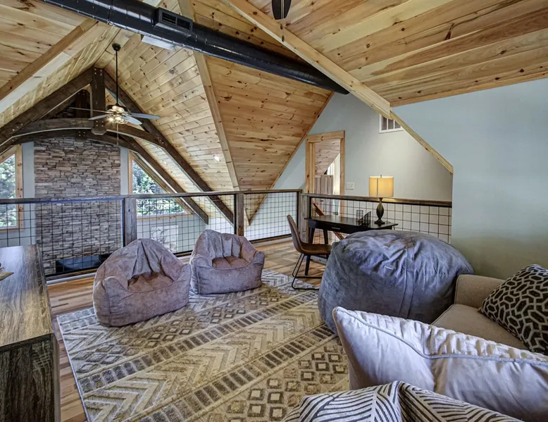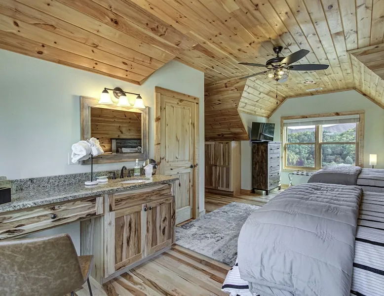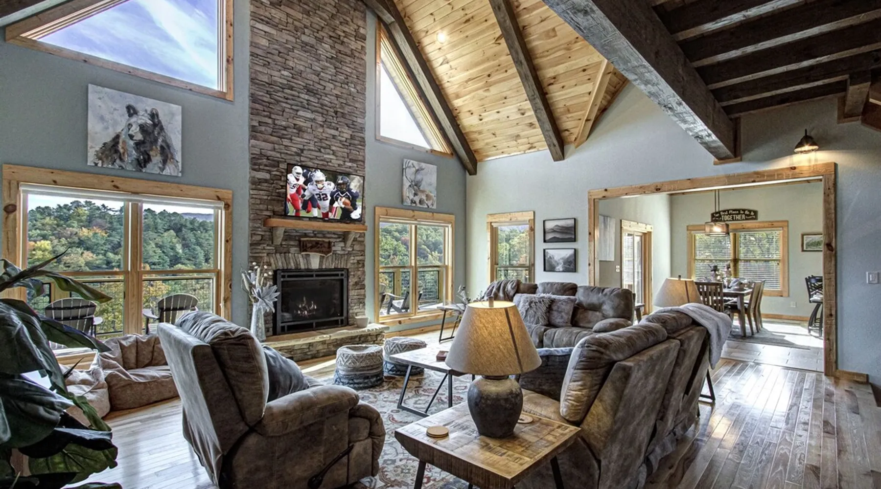 Luxury 5BR family cabin with stunning Smoky Mountain views! Located in the Thunder Mountain community near Pigeon Forge and Dollywood, this spacious retreat features a gourmet kitchen, game room, hot tub, fire pit, and over 2,000 sq. ft. of decks. Enjoy Starlink WiFi, Smart TVs, and easy access—no steep roads. Perfect for families and groups seeking comfort, fun, and unforgettable mountain views. The space 🌙 The Space Welcome to Moonlight Mountain Ridge, your luxury family retreat in the heart of the Smoky Mountains! This stunning 5-bedroom, 5.5-bath cabin combines upscale comfort with breathtaking panoramic views of Mount LeConte and the surrounding mountain range. Nestled in the prestigious Thunder Mountain community, the cabin offers easy access and no steep roads, making it ideal for families and groups seeking relaxation, adventure, and connection. 🏡 Spacious Luxury Cabin Designed for Families Step inside and you’ll be greeted by soaring ceilings, a wall of windows framing the Smoky Mountains, and warm wood finishes that blend rustic charm with modern luxury. The open-concept great room features a stone fireplace, plush seating, and a large Smart TV — the perfect space to unwind after a day of exploring. Each of the five bedrooms offers high-quality bedding and mountain-facing windows, allowing guests to wake up to stunning views. Bedroom 1 (Main Level): King bed, direct deck access Bedroom 2 (Upper Level): King bed, mountain view Bedroom 3 (Upper Level): 2 Queen beds, mountain view Bedroom 4 (Lower Level): King bed, mountain view Bedroom 5 (Lower Level): Two twin-over-full bunk beds, mountain view In total, the cabin comfortably sleeps up to 16 guests, offering the ideal setup for multi-generational families, reunions, or small groups traveling together. 🌄 Incredible Views from Every Level One of the standout features of Moonlight Mountain Ridge is the unobstructed panoramic view of the Smokies. You’ll enjoy spectacular sunrises, fiery sunsets, and star-filled nights from nearly every room. The cabin’s open layout and expansive windows ensure you’re never far from the scenery — whether you’re cooking breakfast, relaxing in the great room, or playing in the game room. 🍽️ Gourmet Kitchen & Family Dining Cook like a chef in the fully equipped gourmet kitchen, featuring granite countertops, stainless-steel appliances, and all the cookware and utensils you could need. A spacious dining area seats your entire group and overlooks the mountains — perfect for family dinners, game nights, or celebrating special occasions together. 🎮 Game Room & Entertainment The lower level is all about fun and relaxation! Challenge friends and family to a game of pool, shuffleboard, or classic arcade favorites. Settle in for movie night in the theater area with a 65" Smart TV and comfortable recliner seating. The cabin is equipped with Starlink high-speed WiFi, Dish Network, and Smart TVs in every major space, so everyone can stream, work, or relax seamlessly. 🪵 Outdoor Living at Its Best Step outside to enjoy more than 2,000 square feet of outdoor space designed to take full advantage of the mountain setting. Main deck: Rocking chairs and a covered sitting area for morning coffee or evening sunsets Lower deck: Hot tub with unobstructed views and outdoor seating Fire pit area: Wood-burning fire pit surrounded by Adirondack chairs, ideal for roasting s’mores or stargazing Yard games: Cornhole and Giant Jenga available for outdoor fun Whether it’s sunrise coffee or a night under the stars, this outdoor space truly captures the magic of the Smokies. 🛒 Convenient Grocery & Meal Delivery Skip the hassle of shopping! Instacart delivers groceries from Kroger and Publix, while DoorDash brings local favorites right to your doorstep. Enjoy the privacy of a cabin stay with the convenience of on-demand service. 📍 Prime Location Near Top Attractions Moonlight Mountain Ridge offers the best of both worlds — peace and privacy, yet close to all the action: Pigeon Forge: 4.5 mi Dollywood: 8.3 mi Gatlinburg: 11 mi Townsend: 17 mi Enjoy world-class dining, live shows, shopping, and outdoor adventures — all within a short, scenic drive. You’ll also have quick access to The Island in Pigeon Forge, Anakeesta, and the Great Smoky Mountains National Park. 🛏️ Sleep in Comfort Every bed at Moonlight Mountain Ridge features upgraded plush mattresses and high-quality linens to ensure a restful night’s sleep. With five bedrooms and five and a half baths, everyone in your group has plenty of room and privacy. 💻 Smart Home & Connectivity The cabin is equipped with Starlink Internet for fast, reliable WiFi that supports streaming, video calls, and remote work. Each TV is a Smart TV, so guests can log into their favorite streaming services. 🔥 Thoughtful Touches & Family Comfort We’ve designed this cabin to make every guest feel right at home. You’ll find thoughtful extras like: Washer and dryer with detergent provided Iron and ironing board Hair dryers in every bathroom Starter supplies (toilet paper, paper towels, soaps, trash bags, coffee) Pack ’n Play and high chair available upon request 🧭 Explore the Area Whether you’re craving adventure or relaxation, you’ll find it nearby: Great Smoky Mountains National Park: Endless hiking trails, waterfalls, and scenic drives Dollywood: Family fun, rides, and live entertainment The Island in Pigeon Forge: Shopping, dining, and attractions for all ages Ober Mountain: Skiing, tubing, and alpine adventures Townsend & Foothills Parkway: Peaceful drives and hidden gems off the beaten path 🧺 Laundry & Supplies A full-size washer and dryer are available for guest use, along with laundry detergent and essentials. ✨ Why Guests Love Moonlight Mountain Ridge ✔ Panoramic mountain views from nearly every room ✔ Spacious decks, hot tub, and fire pit for outdoor enjoyment ✔ Game room & theater area for all-ages entertainme