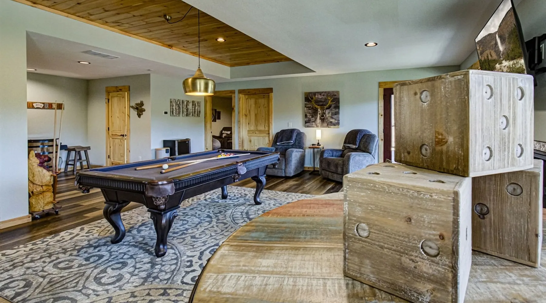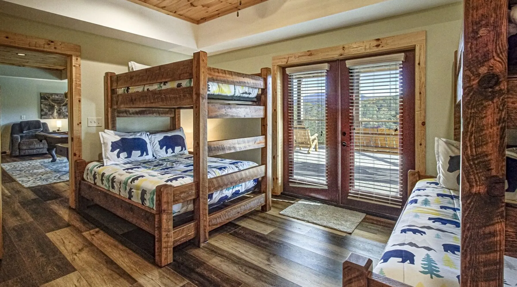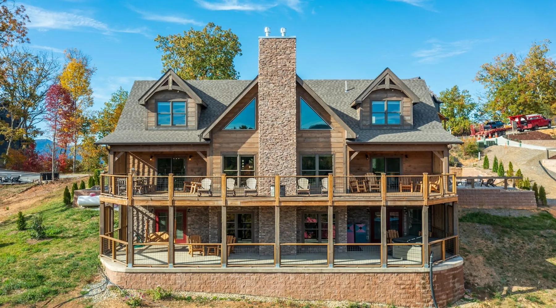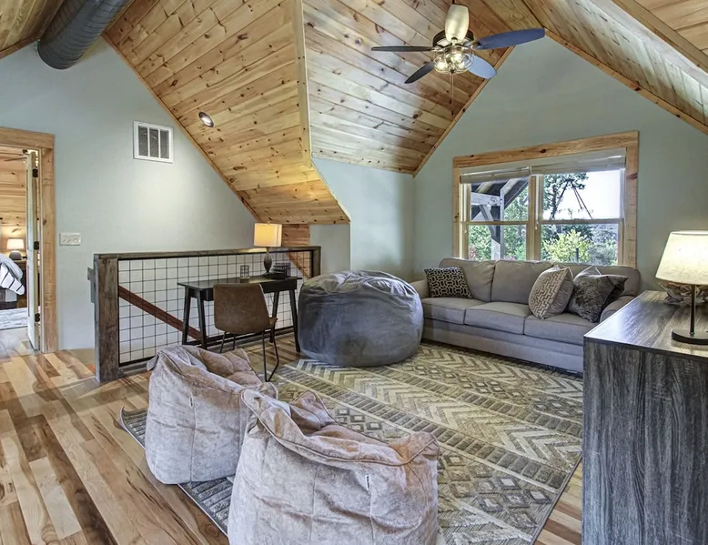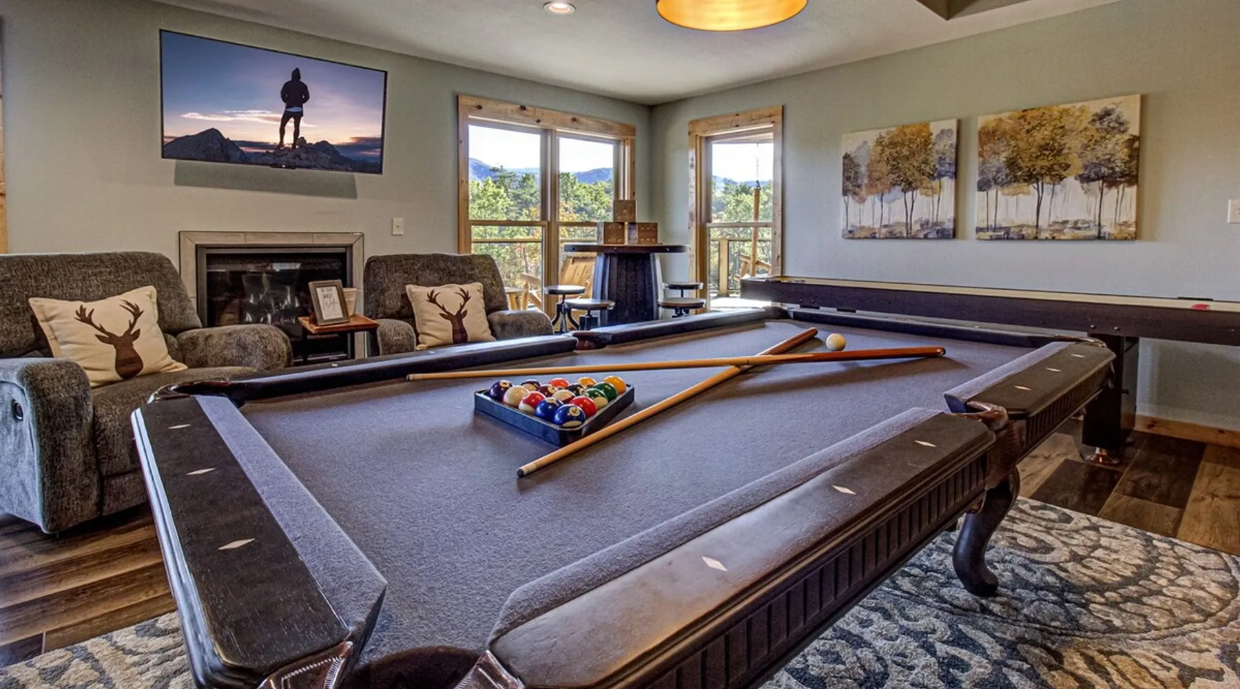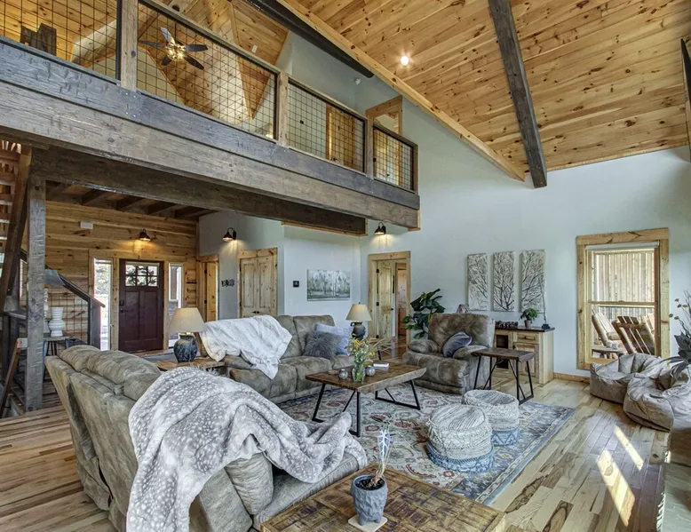 Luxury 5BR family cabin with stunning Smoky Mountain views! Located in the Thunder Mountain community near Pigeon Forge and Dollywood, this spacious retreat features a gourmet kitchen, game room, hot tub, fire pit, and over 2,000 sq. ft. of decks. Enjoy Starlink WiFi, Smart TVs, and easy access—no steep roads. Perfect for families and groups seeking comfort, fun, and unforgettable mountain views. The space 🌙 The Space Welcome to Moonlight Mountain Ridge, your luxury family retreat in the heart of the Smoky Mountains! This stunning 5-bedroom, 5.5-bath cabin combines upscale comfort with breathtaking panoramic views of Mount LeConte and the surrounding mountain range. Nestled in the prestigious Thunder Mountain community, the cabin offers easy access and no steep roads, making it ideal for families and groups seeking relaxation, adventure, and connection. 🏡 Spacious Luxury Cabin Designed for Families Step inside and you’ll be greeted by soaring ceilings, a wall of windows framing the Smoky Mountains, and warm wood finishes that blend rustic charm with modern luxury. The open-concept great room features a stone fireplace, plush seating, and a large Smart TV — the perfect space to unwind after a day of exploring. Each of the five bedrooms offers high-quality bedding and mountain-facing windows, allowing guests to wake up to stunning views. Bedroom 1 (Main Level): King bed, direct deck access Bedroom 2 (Upper Level): King bed, mountain view Bedroom 3 (Upper Level): 2 Queen beds, mountain view Bedroom 4 (Lower Level): King bed, mountain view Bedroom 5 (Lower Level): Two twin-over-full bunk beds, mountain view In total, the cabin comfortably sleeps up to 16 guests, offering the ideal setup for multi-generational families, reunions, or small groups traveling together. 🌄 Incredible Views from Every Level One of the standout features of Moonlight Mountain Ridge is the unobstructed panoramic view of the Smokies. You’ll enjoy spectacular sunrises, fiery sunsets, and star-filled nights from nearly every room. The cabin’s open layout and expansive windows ensure you’re never far from the scenery — whether you’re cooking breakfast, relaxing in the great room, or playing in the game room. 🍽️ Gourmet Kitchen & Family Dining Cook like a chef in the fully equipped gourmet kitchen, featuring granite countertops, stainless-steel appliances, and all the cookware and utensils you could need. A spacious dining area seats your entire group and overlooks the mountains — perfect for family dinners, game nights, or celebrating special occasions together. 🎮 Game Room & Entertainment The lower level is all about fun and relaxation! Challenge friends and family to a game of pool, shuffleboard, or classic arcade favorites. Settle in for movie night in the theater area with a 65" Smart TV and comfortable recliner seating. The cabin is equipped with Starlink high-speed WiFi, Dish Network, and Smart TVs in every major space, so everyone can stream, work, or relax seamlessly. 🪵 Outdoor Living at Its Best Step outside to enjoy more than 2,000 square feet of outdoor space designed to take full advantage of the mountain setting. Main deck: Rocking chairs and a covered sitting area for morning coffee or evening sunsets Lower deck: Hot tub with unobstructed views and outdoor seating Fire pit area: Wood-burning fire pit surrounded by Adirondack chairs, ideal for roasting s’mores or stargazing Yard games: Cornhole and Giant Jenga available for outdoor fun Whether it’s sunrise coffee or a night under the stars, this outdoor space truly captures the magic of the Smokies. 🛒 Convenient Grocery & Meal Delivery Skip the hassle of shopping! Instacart delivers groceries from Kroger and Publix, while DoorDash brings local favorites right to your doorstep. Enjoy the privacy of a cabin stay with the convenience of on-demand service. 📍 Prime Location Near Top Attractions Moonlight Mountain Ridge offers the best of both worlds — peace and privacy, yet close to all the action: Pigeon Forge: 4.5 mi Dollywood: 8.3 mi Gatlinburg: 11 mi Townsend: 17 mi Enjoy world-class dining, live shows, shopping, and outdoor adventures — all within a short, scenic drive. You’ll also have quick access to The Island in Pigeon Forge, Anakeesta, and the Great Smoky Mountains National Park. 🛏️ Sleep in Comfort Every bed at Moonlight Mountain Ridge features upgraded plush mattresses and high-quality linens to ensure a restful night’s sleep. With five bedrooms and five and a half baths, everyone in your group has plenty of room and privacy. 💻 Smart Home & Connectivity The cabin is equipped with Starlink Internet for fast, reliable WiFi that supports streaming, video calls, and remote work. Each TV is a Smart TV, so guests can log into their favorite streaming services. 🔥 Thoughtful Touches & Family Comfort We’ve designed this cabin to make every guest feel right at home. You’ll find thoughtful extras like: Washer and dryer with detergent provided Iron and ironing board Hair dryers in every bathroom Starter supplies (toilet paper, paper towels, soaps, trash bags, coffee) Pack ’n Play and high chair available upon request 🧭 Explore the Area Whether you’re craving adventure or relaxation, you’ll find it nearby: Great Smoky Mountains National Park: Endless hiking trails, waterfalls, and scenic drives Dollywood: Family fun, rides, and live entertainment The Island in Pigeon Forge: Shopping, dining, and attractions for all ages Ober Mountain: Skiing, tubing, and alpine adventures Townsend & Foothills Parkway: Peaceful drives and hidden gems off the beaten path 🧺 Laundry & Supplies A full-size washer and dryer are available for guest use, along with laundry detergent and essentials. ✨ Why Guests Love Moonlight Mountain Ridge ✔ Panoramic mountain views from nearly every room ✔ Spacious decks, hot tub, and fire pit for outdoor enjoyment ✔ Game room & theater area for all-ages entertainme
