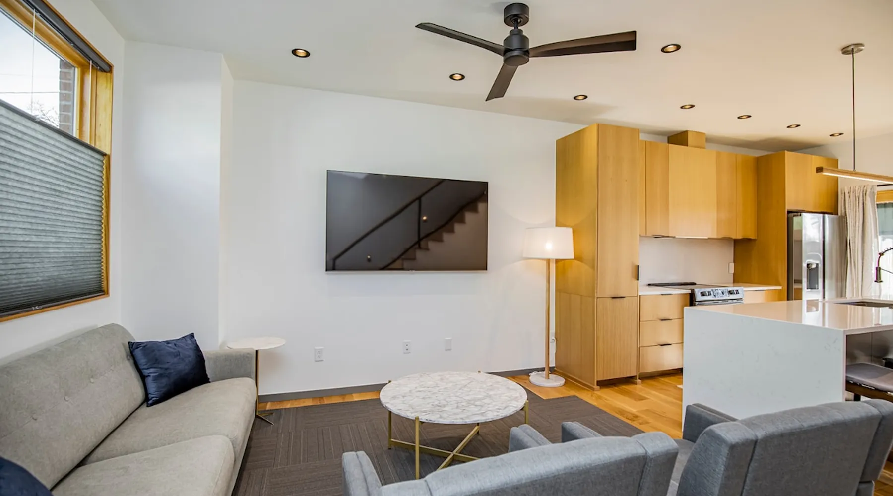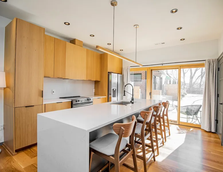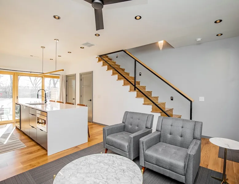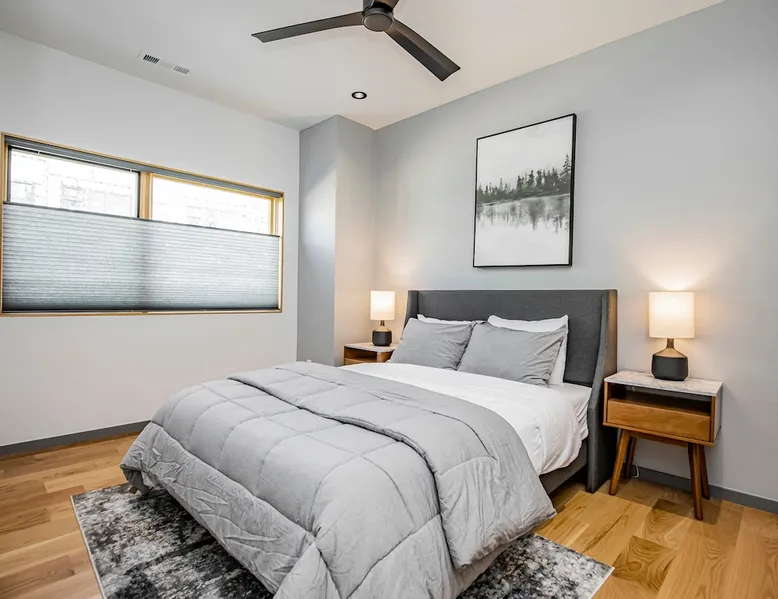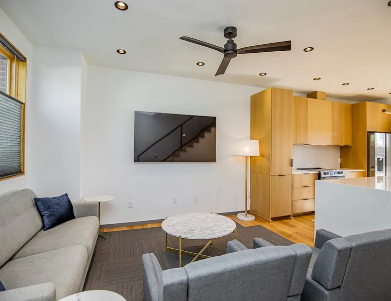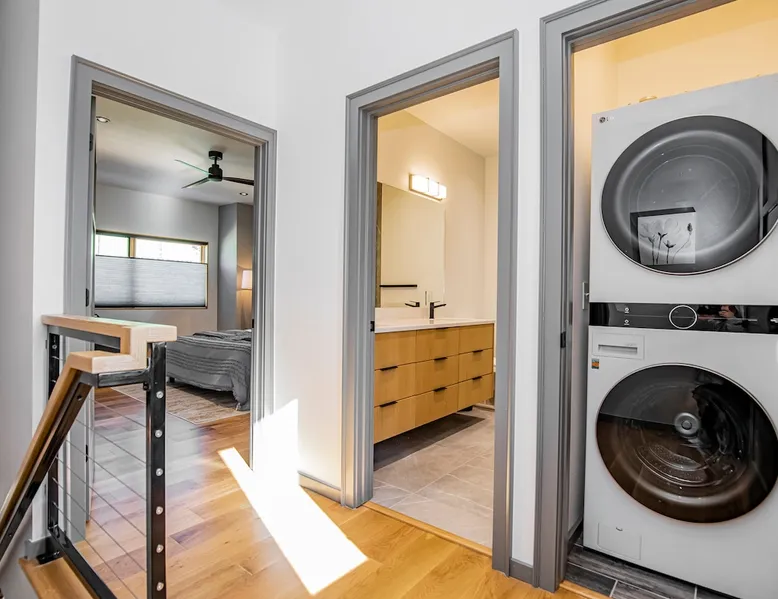 Enjoy a stylish experience at this centrally-located town home. 3 minute bike or car ride to Square, restaurants, shopping and main MTB trailhead or 6 minute walk to The Momentary. Self check-in - smart locks 2 bedroom | 2 bathroom 1 king bed and 1 queen bed Fully stocked kitchen with high-end appliances W & D WIFI 80 in. 4K TV/ living room 55 in. 4K TV/ master BR Private parking lot in rear Designated on street public parking on SE 7th Bike clean off area The space Freshly Constructed townhome located in the heart of Downtown Bentonville. Well equipped and crisp with modern finishes and comfortable furnishings. Plentiful Natural light throughout from tall windows and glass doors. Floor Level Patio access through sliding glass doors Open-format living, kitchen, dining area with modern finishes and high end appliances. -80” Flatscreen Smart TV in the living area. Dining for 4 at the kitchen quartz island Fully Stocked Kitchen includes: - refrigerator with ice maker - 4-burner glass top stove - microwave - dishwasher - Keurig coffee maker with complimentary coffee pods - ample plates, bowls, and saucers - mugs, water glasses, and wine glasses - pots and pans - knives and silverware - cutting board - corkscrew, can opener, and kitchen shears/scissors - oil, salt, and pepper Floor 2: Bedroom 1 is on the 2nd floor and has a Queen-size bed, closet and private bath in the hall. Second Floor bathroom is located in the hall and has a shower/tub combo. Floor 3: Bedroom 2 is on the 3rd floor and has a King-size bed, dresser, closet, a Smart TV, and private bath in the hall Third Floor bathroom is located in the hall and has a walk-in shower. Laundry closet with stacked, full-sized washer and dryer. OUTDOORS Private Patio with seating for 2 Bike stand and access to hose wash off area Curated landscaping and street view seating area in front Guest access Guests will have access to the entire pictured house, all appliances, any kitchen supplies, and all amenities PARKING First come, first served parking spaces in the following locations: -Seven (7) parking spaces in back parking lot -Four (4) on street parking spaces on SE 7th St -Four (4) street parking spaces on SE B St Other things to note ★ 6 minute walk to the Momentary Museum, and 7 minute walk to 8th St Market ★ 0.5 miles from Razorback Greenway - NWA's connected, paved, multi-use trail. ★ 3 minute bike ride or car drive to Downtown Bentonville Square, restaurants, shopping and main American Trail Head (0.8 miles). ★ 6 minute car drive or 10-12 minute bike ride to Crystal Bridges. ★ 2.9 miles to Coler Mountain Bike Preserve