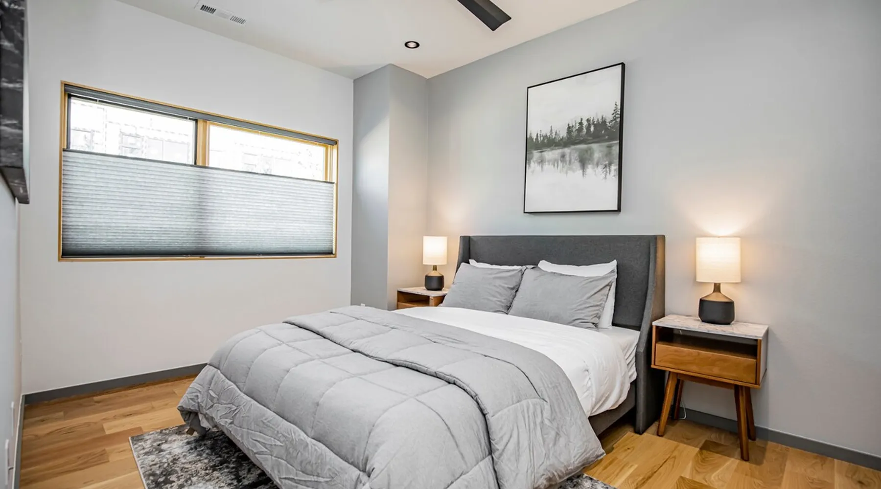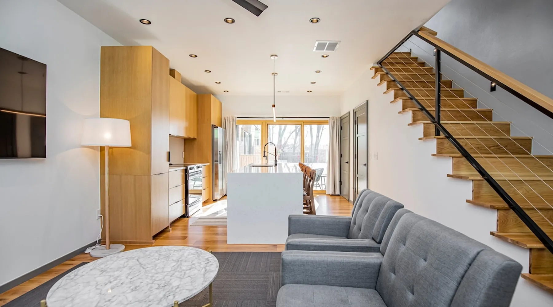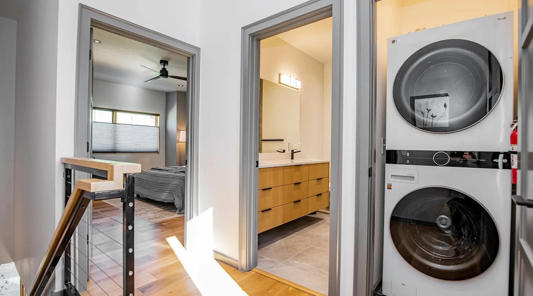 Enjoy a stylish experience at this centrally-located town home. 3 minute bike or car ride to Square, restaurants, shopping and main MTB trailhead or 6 minute walk to The Momentary. Self check-in - smart locks 2 bedroom | 2 bathroom 1 king bed and 1 queen bed Fully stocked kitchen with high-end appliances W & D WIFI 80 in. 4K TV/ living room 55 in. 4K TV/ master BR Private parking lot in rear Designated on street public parking on SE 7th Bike clean off area The space Freshly Constructed townhome located in the heart of Downtown Bentonville. Well equipped and crisp with modern finishes and comfortable furnishings. Plentiful Natural light throughout from tall windows and glass doors. Floor Level Patio access through sliding glass doors Open-format living, kitchen, dining area with modern finishes and high end appliances. -80” Flatscreen Smart TV in the living area. Dining for 4 at the kitchen quartz island Fully Stocked Kitchen includes: - refrigerator with ice maker - 4-burner glass top stove - microwave - dishwasher - Keurig coffee maker with complimentary coffee pods - ample plates, bowls, and saucers - mugs, water glasses, and wine glasses - pots and pans - knives and silverware - cutting board - corkscrew, can opener, and kitchen shears/scissors - oil, salt, and pepper Floor 2: Bedroom 1 is on the 2nd floor and has a Queen-size bed, closet and private bath in the hall. Second Floor bathroom is located in the hall and has a shower/tub combo. Floor 3: Bedroom 2 is on the 3rd floor and has a King-size bed, dresser, closet, a Smart TV, and private bath in the hall Third Floor bathroom is located in the hall and has a walk-in shower. Laundry closet with stacked, full-sized washer and dryer. OUTDOORS Private Patio with seating for 2 Bike stand and access to hose wash off area Curated landscaping and street view seating area in front Guest access Guests will have access to the entire pictured house, all appliances, any kitchen supplies, and all amenities PARKING First come, first served parking spaces in the following locations: -Seven (7) parking spaces in back parking lot -Four (4) on street parking spaces on SE 7th St -Four (4) street parking spaces on SE B St Other things to note ★ 6 minute walk to the Momentary Museum, and 7 minute walk to 8th St Market ★ 0.5 miles from Razorback Greenway - NWA's connected, paved, multi-use trail. ★ 3 minute bike ride or car drive to Downtown Bentonville Square, restaurants, shopping and main American Trail Head (0.8 miles). ★ 6 minute car drive or 10-12 minute bike ride to Crystal Bridges. ★ 2.9 miles to Coler Mountain Bike Preserve